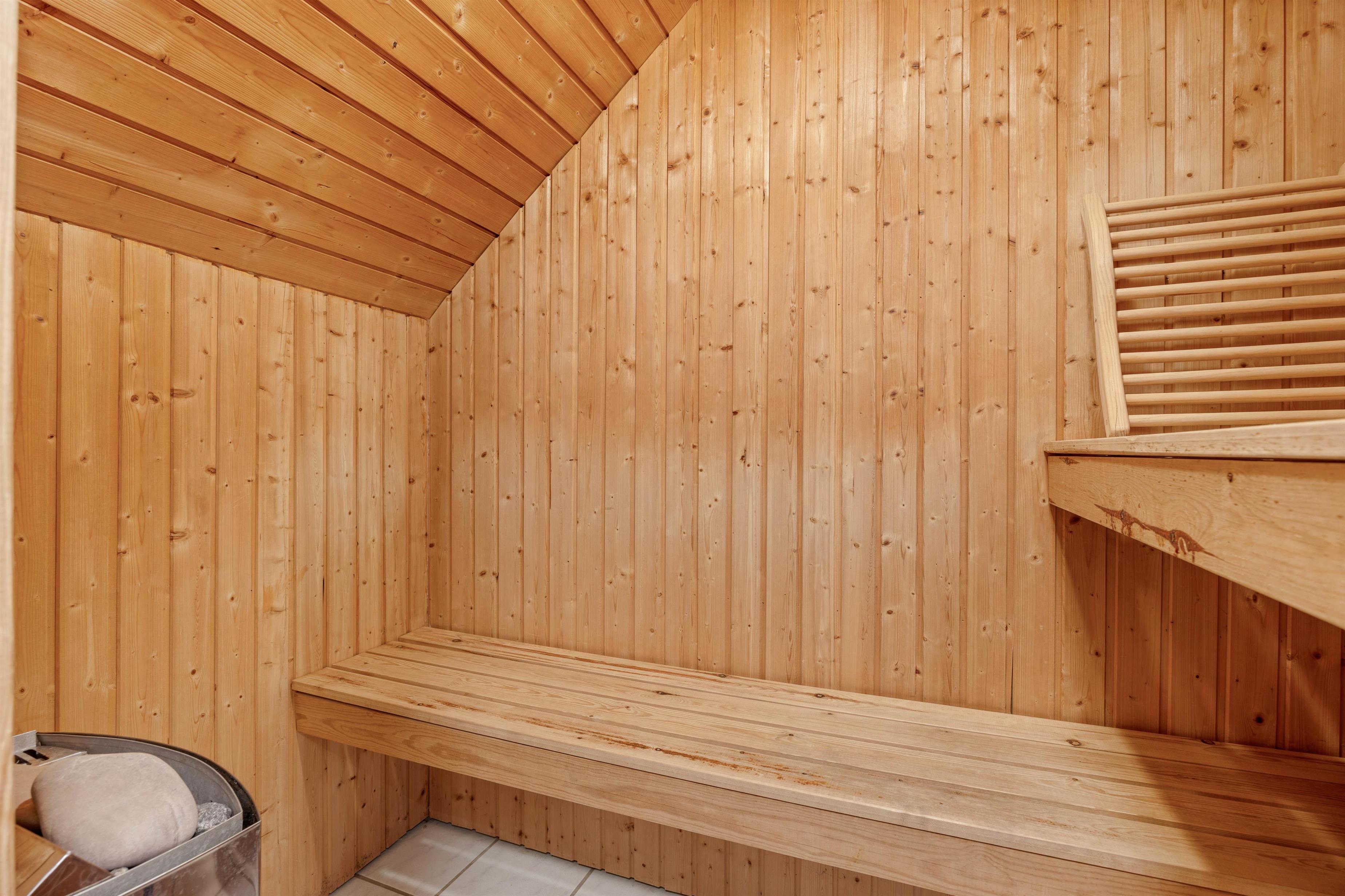 Poolen med modstrømsanlæg (og som er udstyret med energibesparende varmepumpe) vil helt sikkert bringe lykke hos børnene, der kan forlyste sig med vandsjov i timevis, mens de voksne nyder afslapningen i det store spabad eller i sommerhusets sauna, som sørger for at få kroppen helt ned i gear.