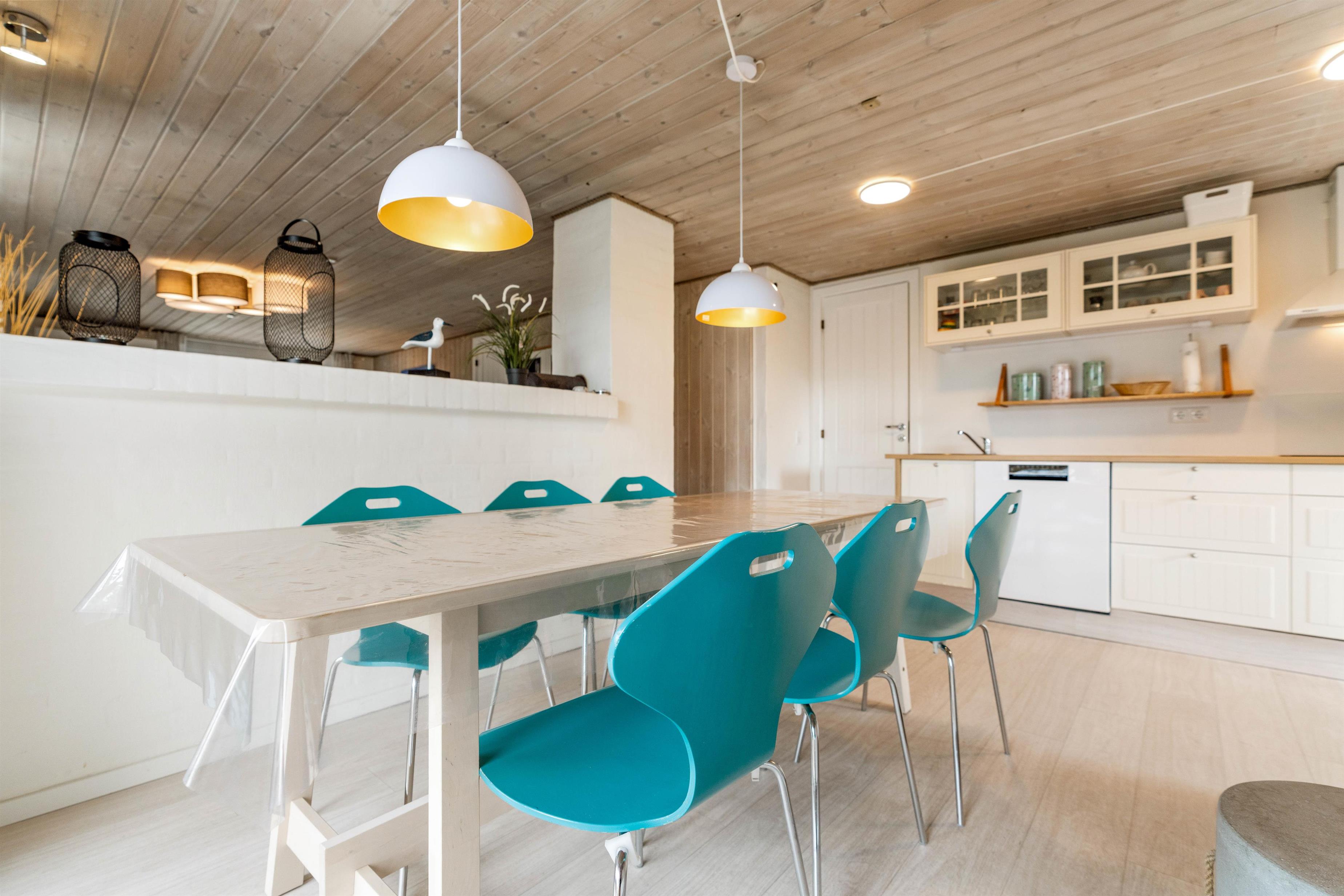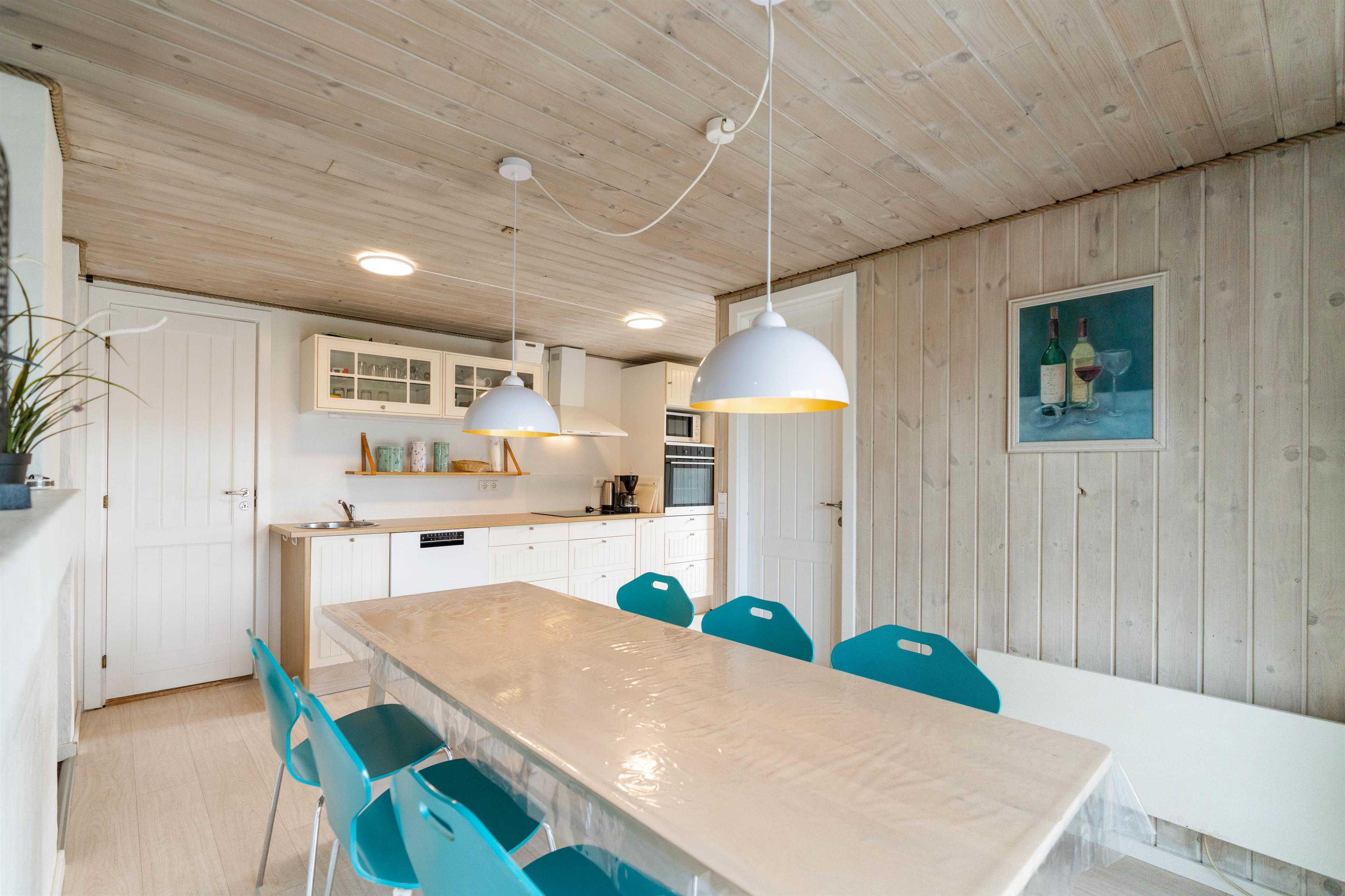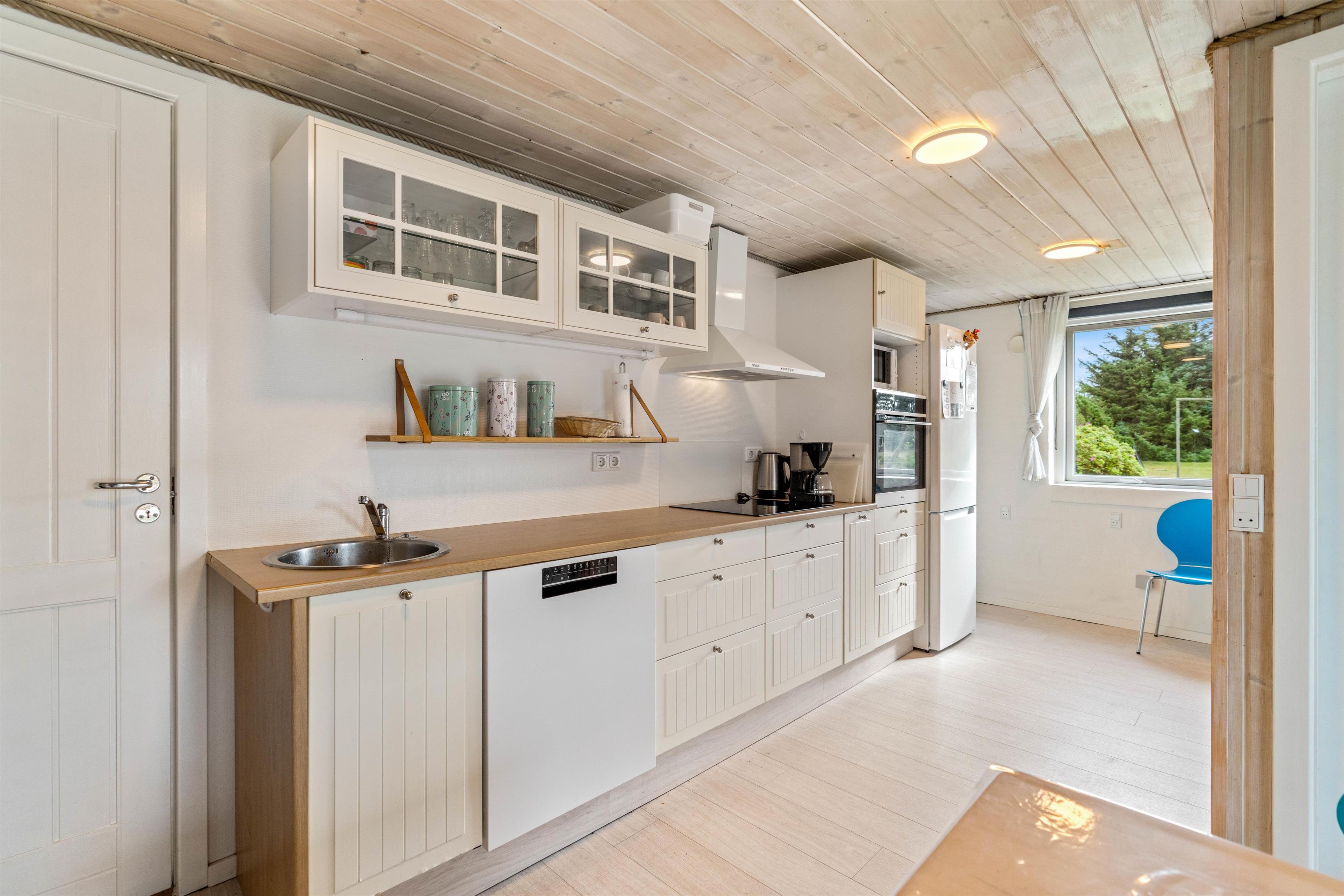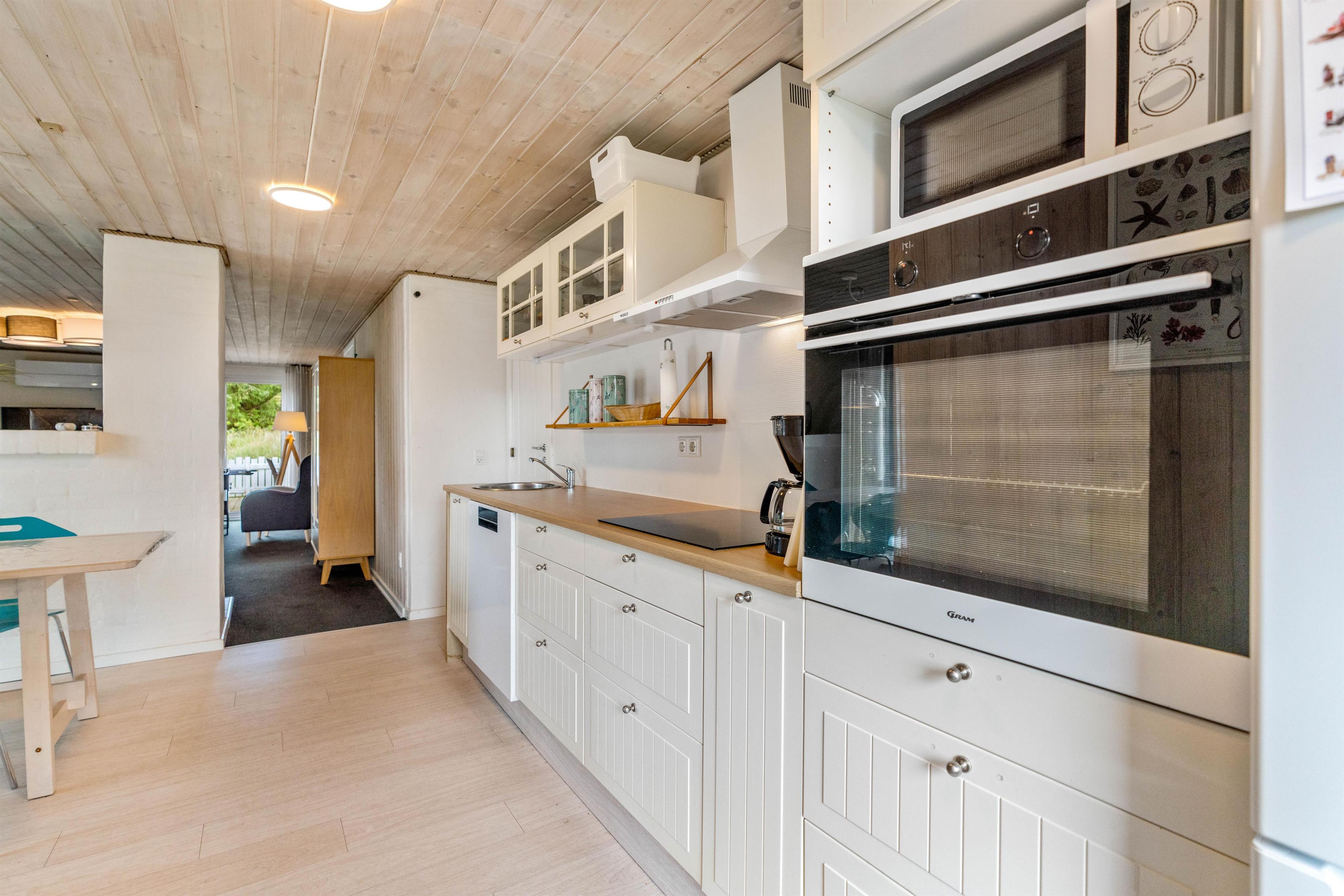 Det lyse køkken ligger i åben forbindelse til spisestuen og er udstyret med alt, hvad feriekokken skulle få brug for. Især opvaskemaskinen er et skønt plus! Så er der mere tid til afslapning i poolen, en omgang bordfodbold eller et spil på sommerhusets PlayStation 3.