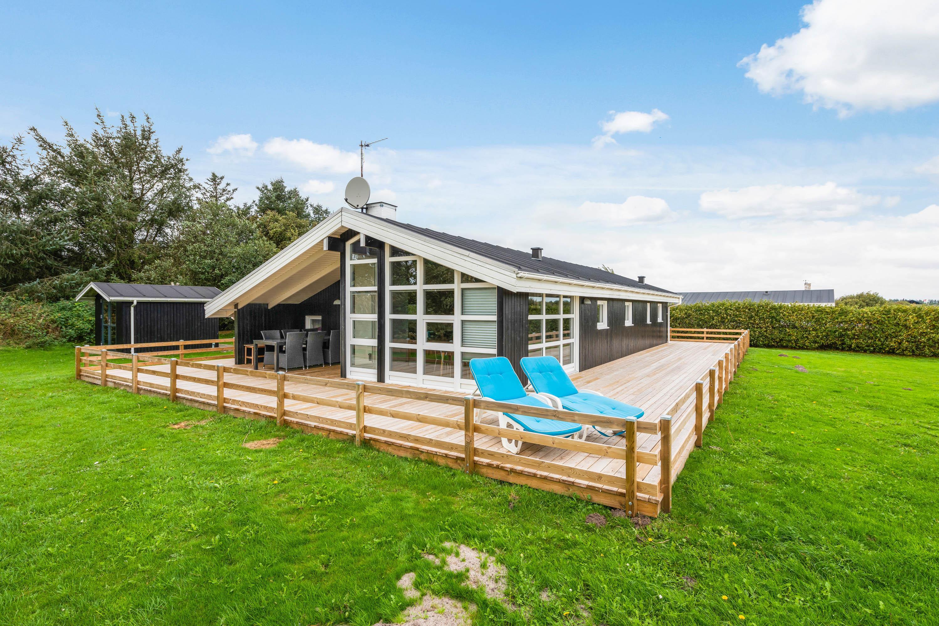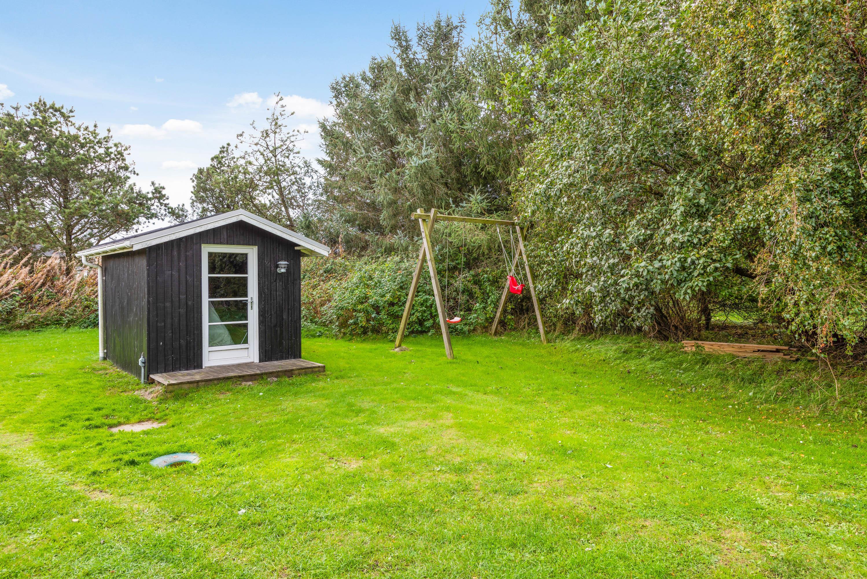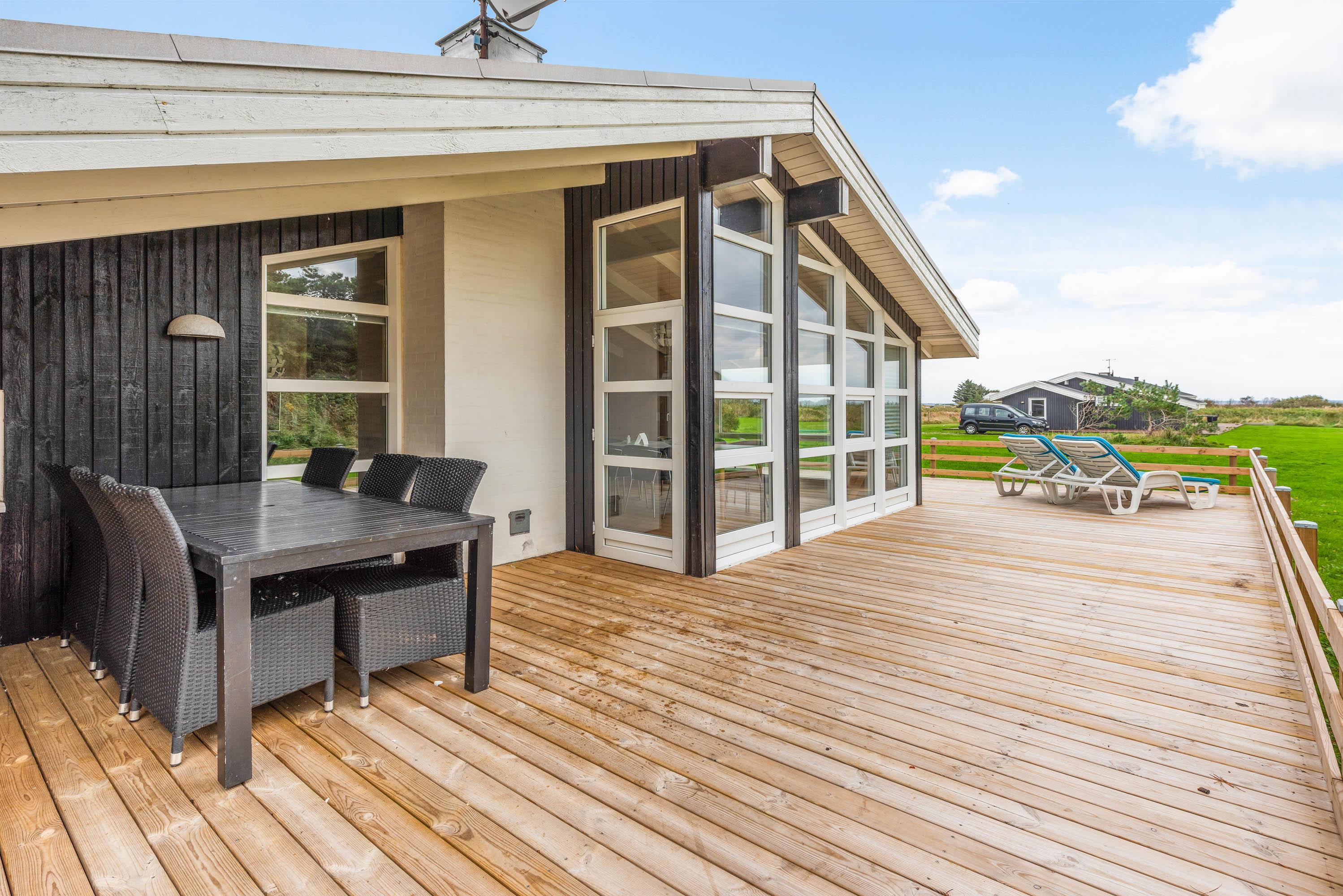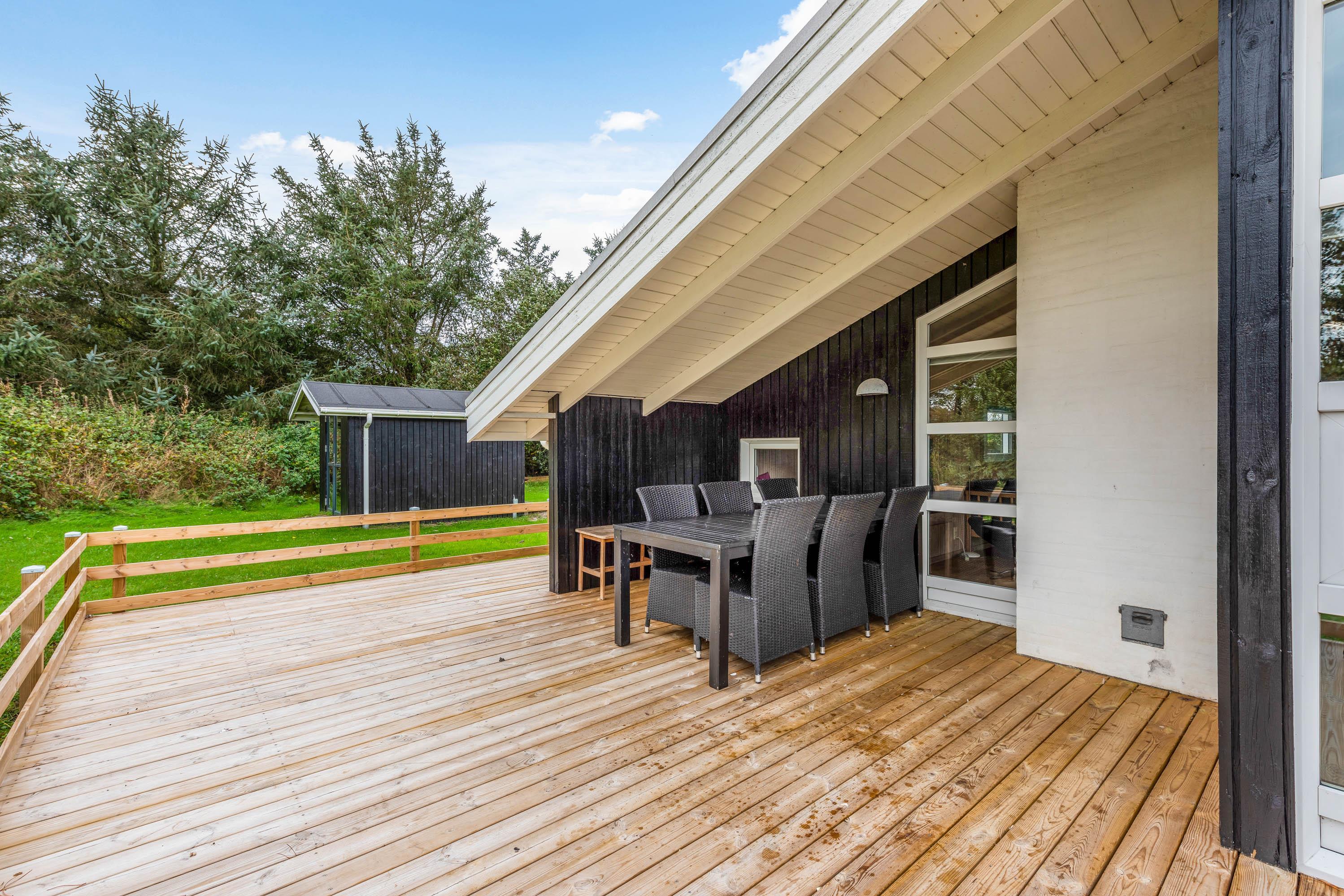Sommerhuset er omgivet af en store dejlig træterrasse med plads til hygge, alt imens du har mulighed for at se børn og hunde nyde leg på den store græs grund. For børnene er der en endvidere en gynge. Nyd ferie i en af liggestolene og tilbered evt. nogle af måltiderne på huset grill, der er rigelig med plads til den store familie.