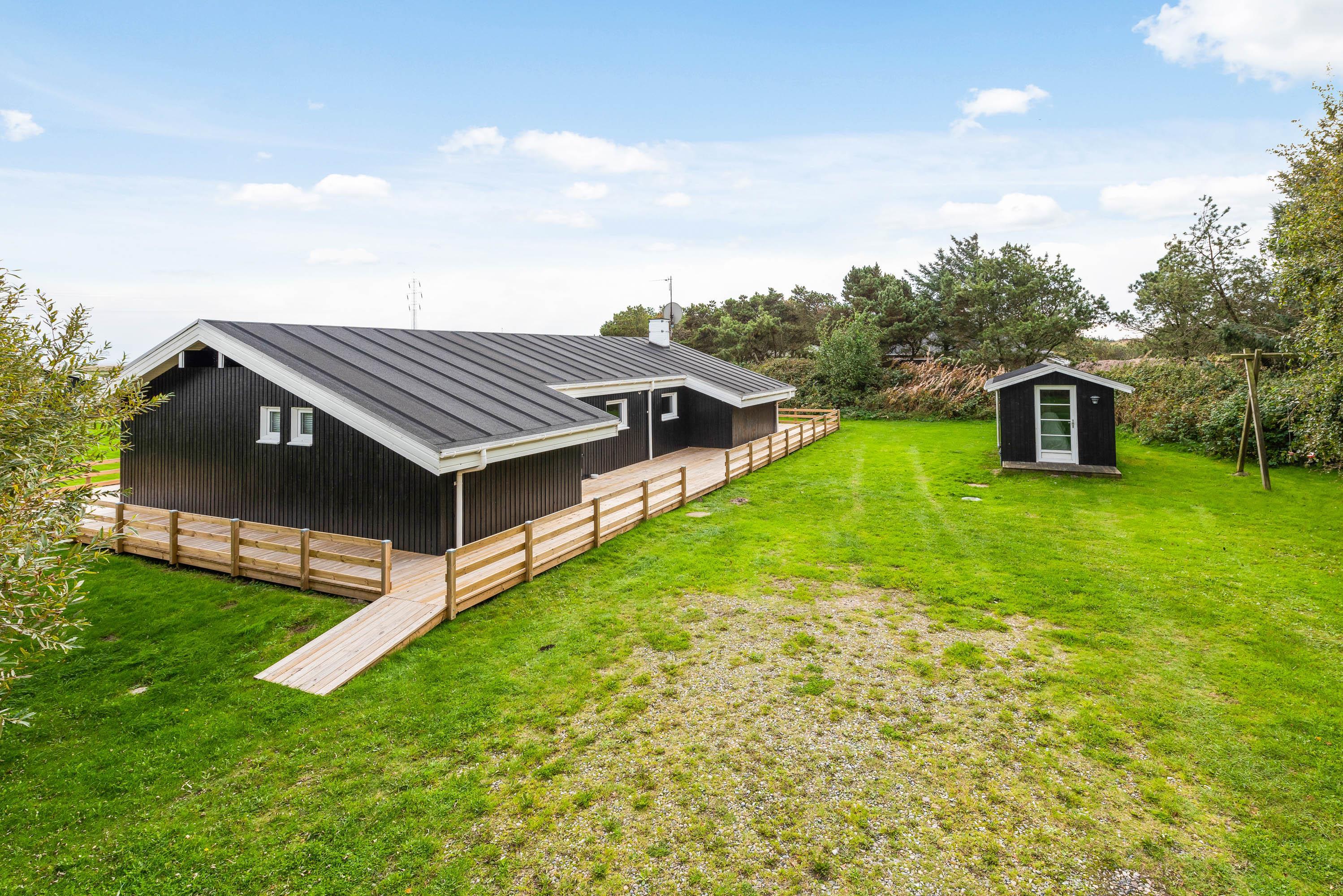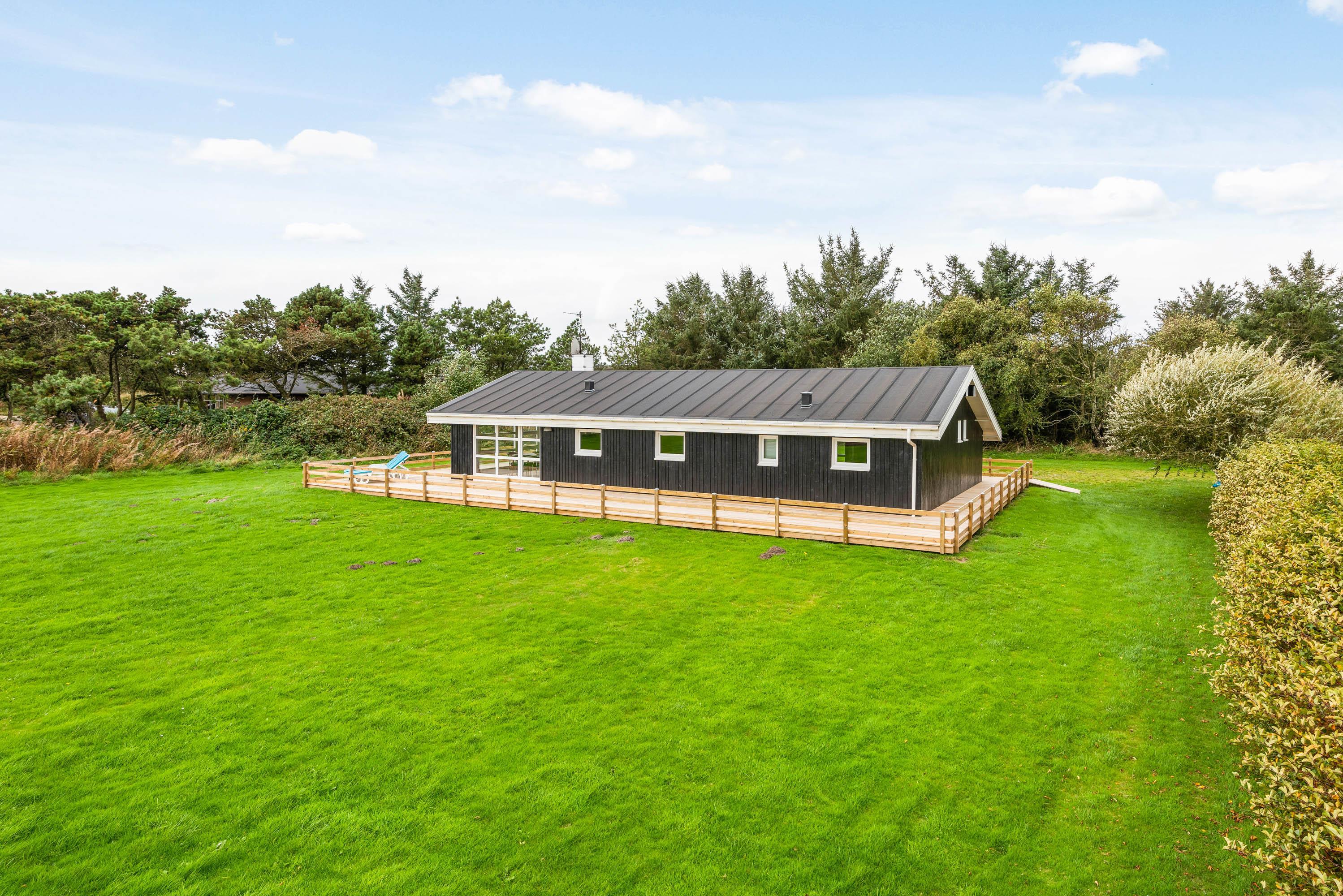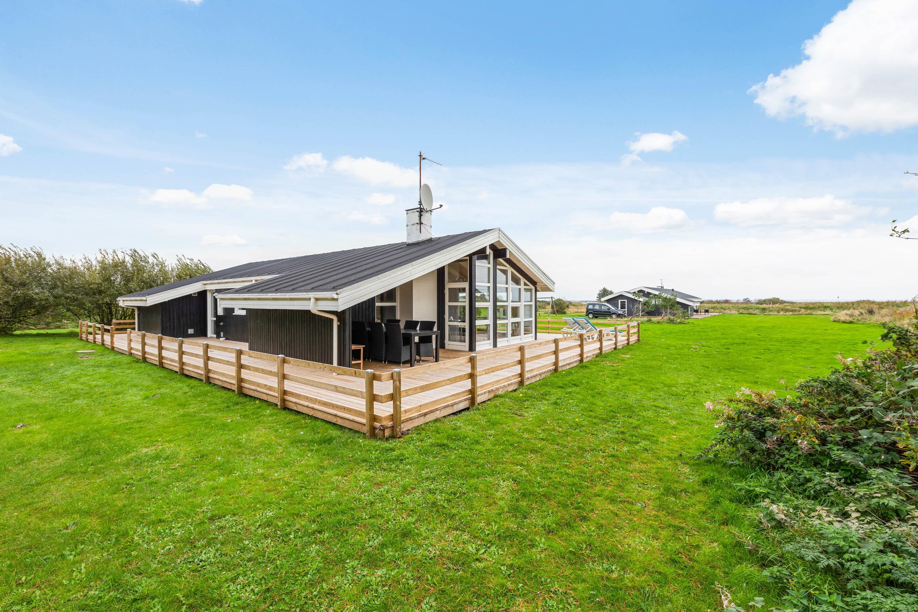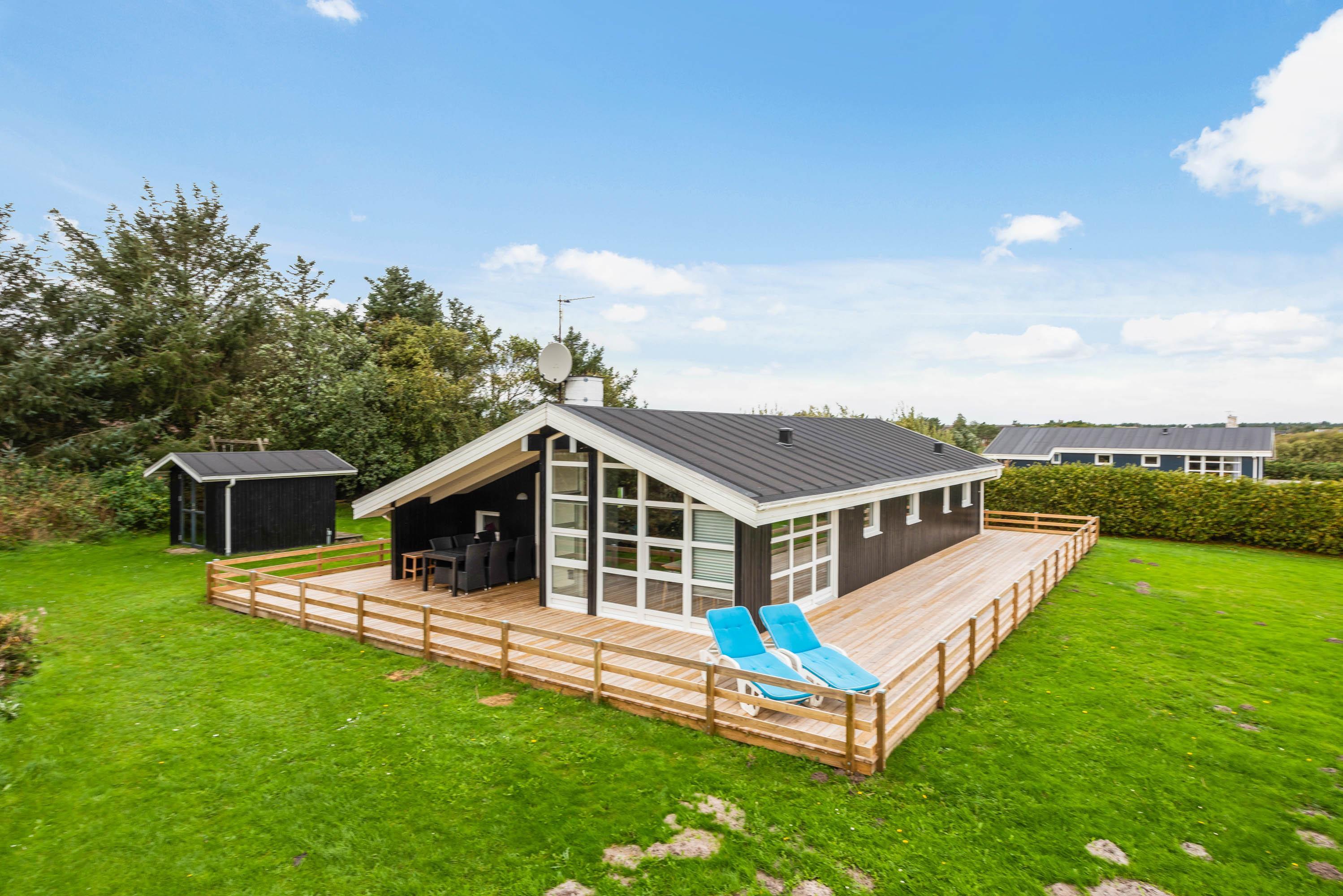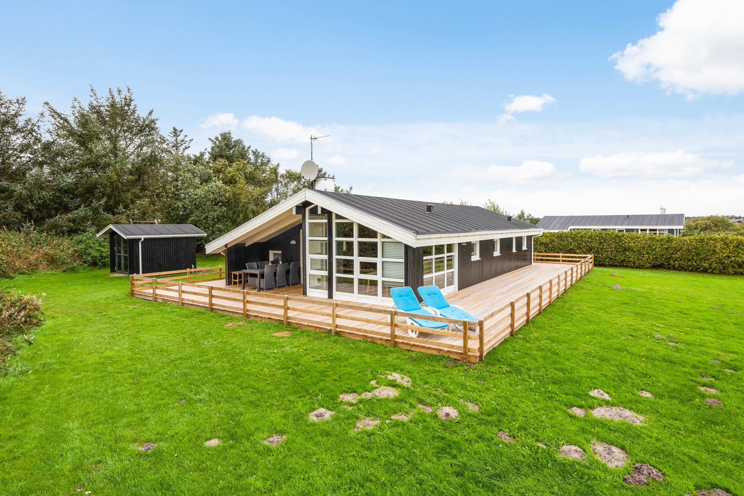 Sommerhuset er omgivet af en store dejlig træterrasse med plads til hygge, alt imens du har mulighed for at se børn og hunde nyde leg på den store græs grund. For børnene er der en endvidere en gynge. Nyd ferie i en af liggestolene og tilbered evt. nogle af måltiderne på huset grill, der er rigelig med plads til den store familie.