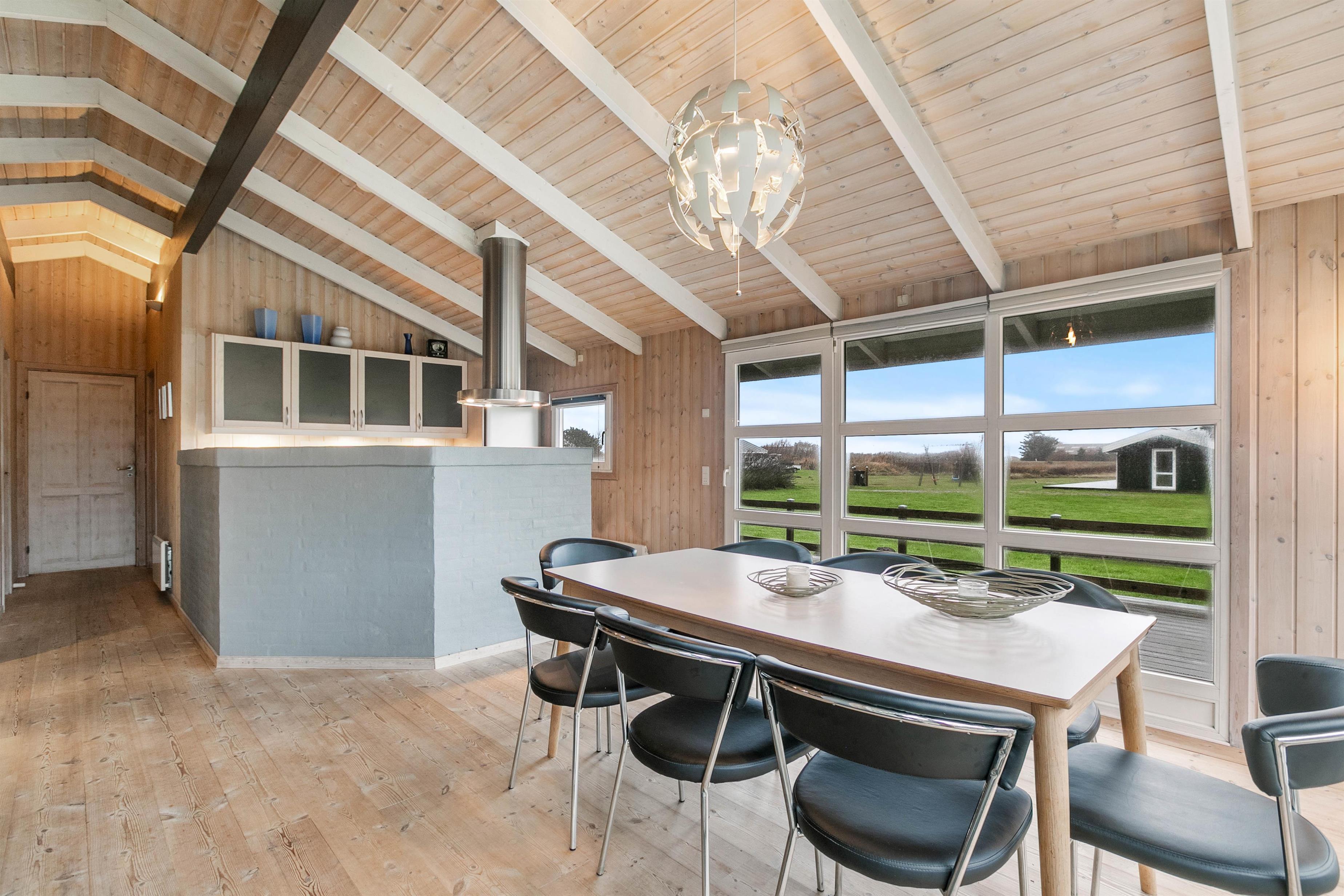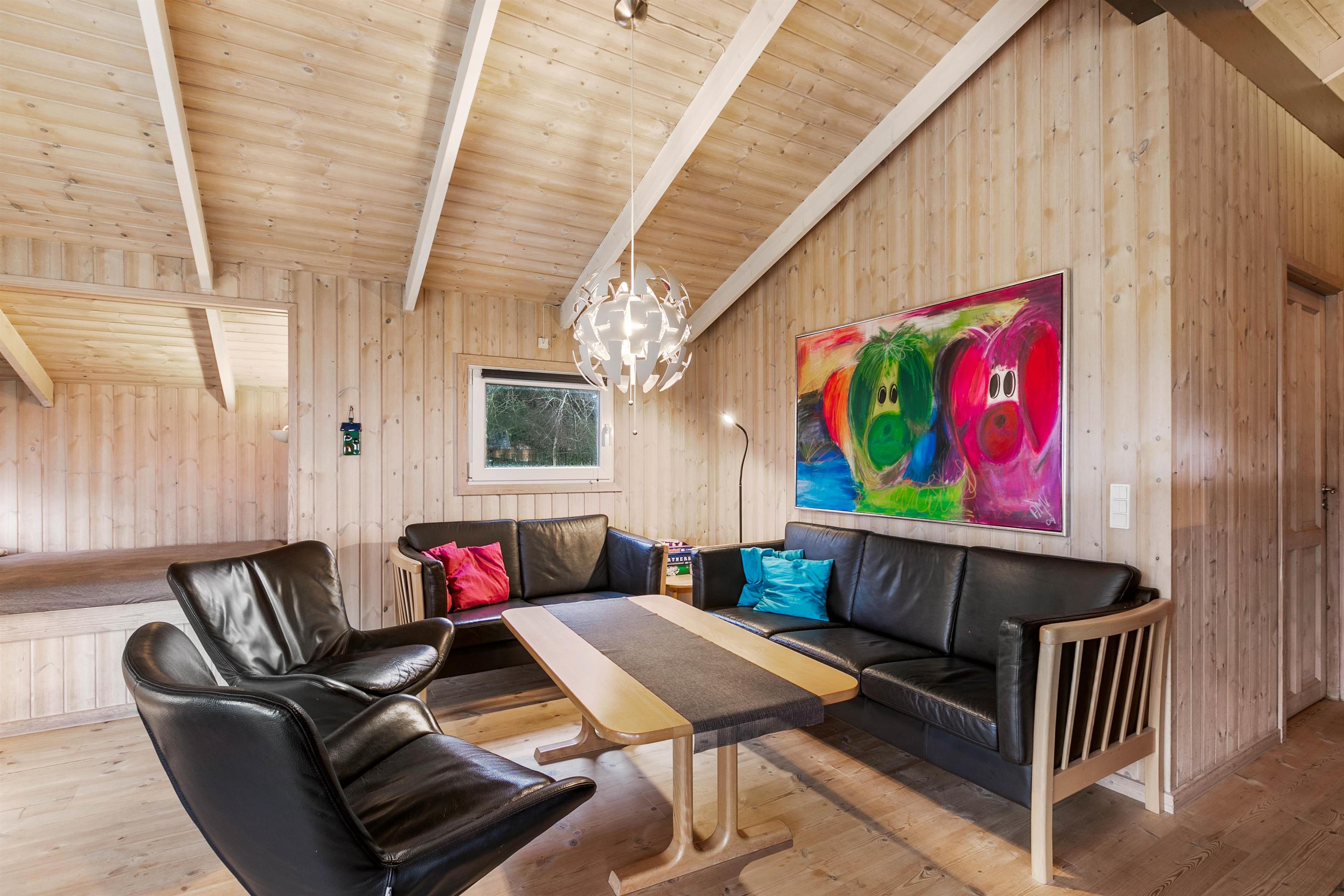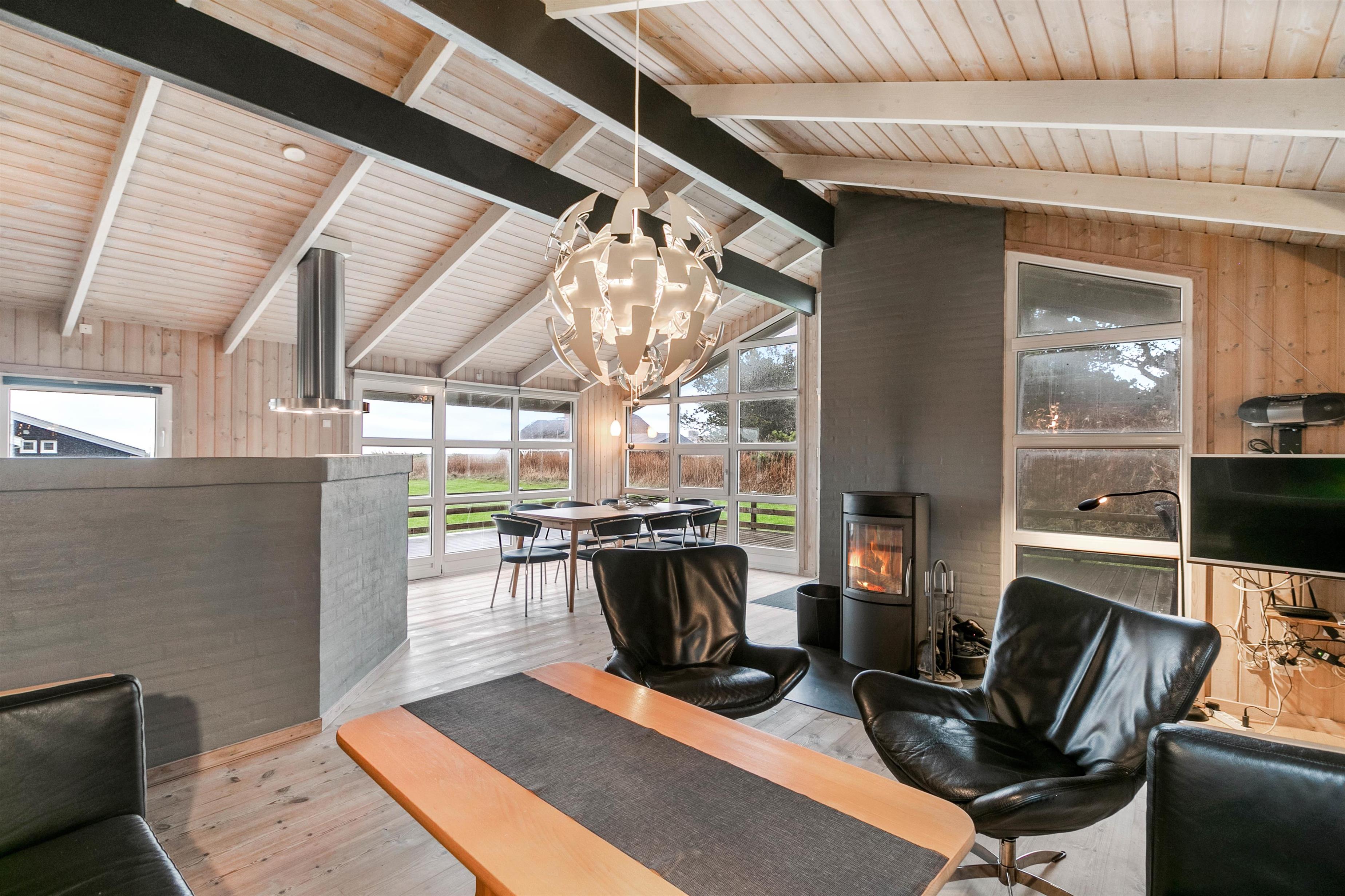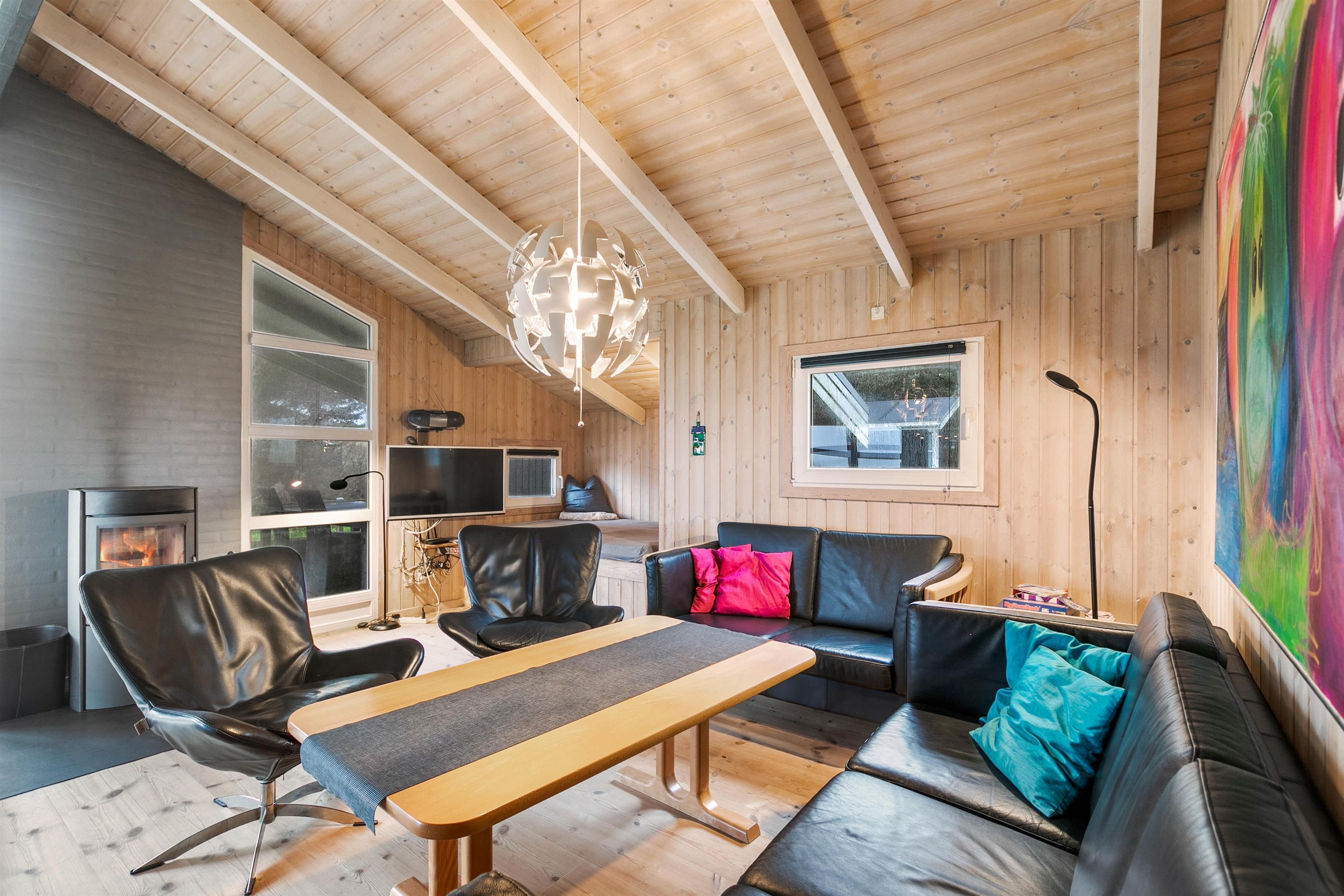 Sommerhuset er lyst og venligt indrettet, den varme træbeklædning sørger for en hyggelig atmosfære og i stuen er der en alkove til de hyggelige timer med ren afslapning med en god bog eller surfe på det gratis internet. I det store badeværelse med gulvvarme er der spabad og sauna, her kan du rigtig slappe af. I det praktiske køkken er udstyret i orden og her kan forberedelserne til feriens måltider udrettes, det kunne jo være de selv fangede fisk.