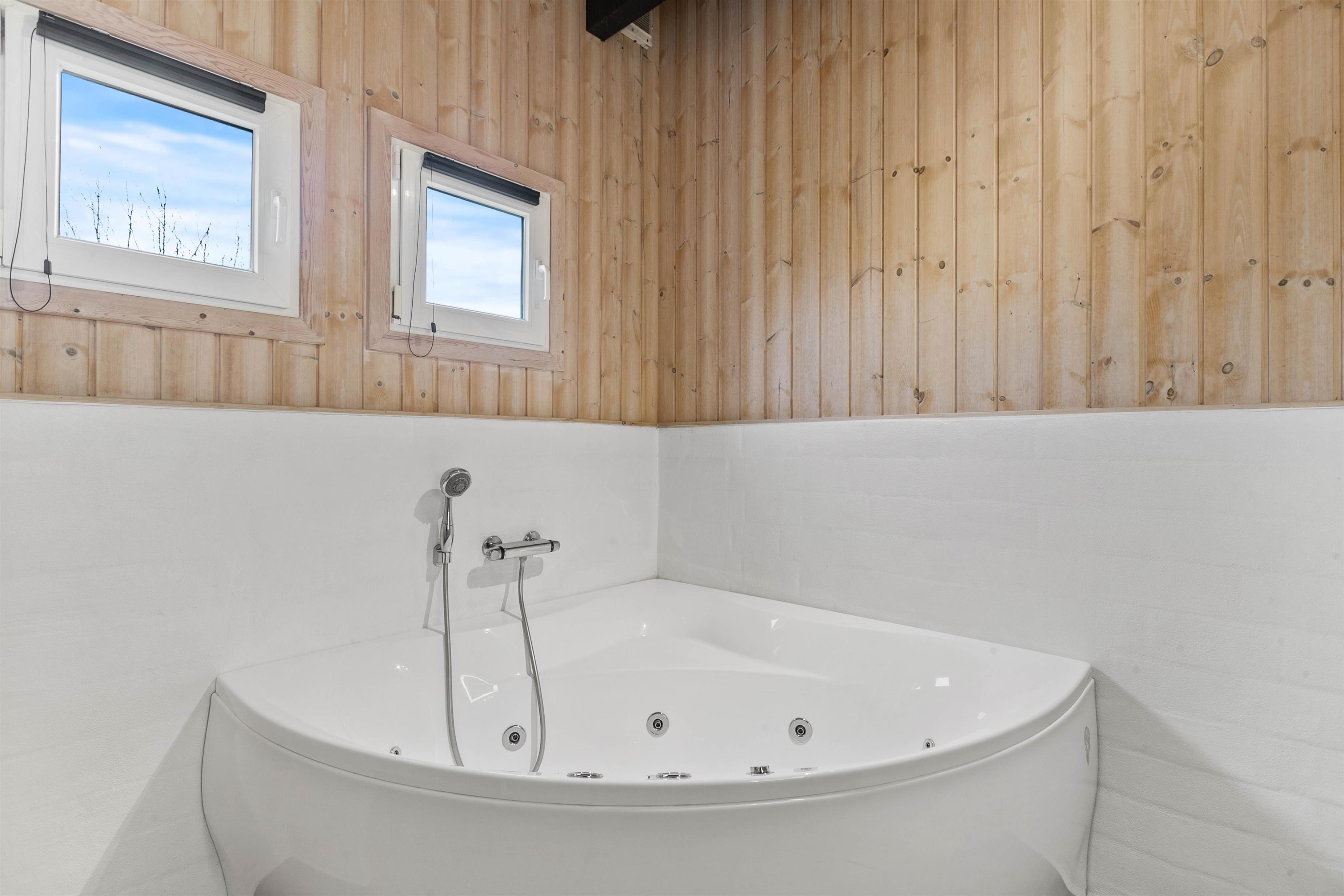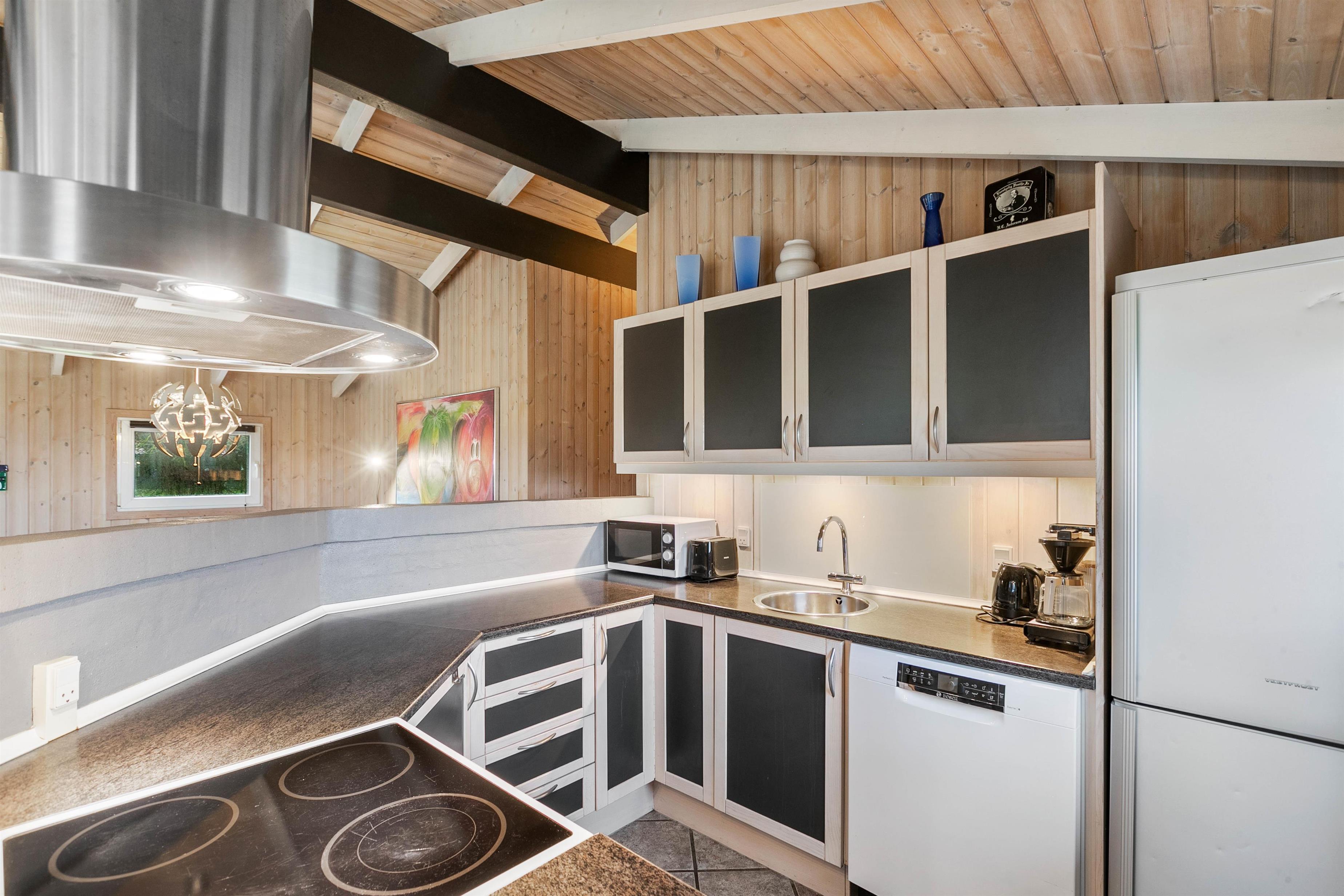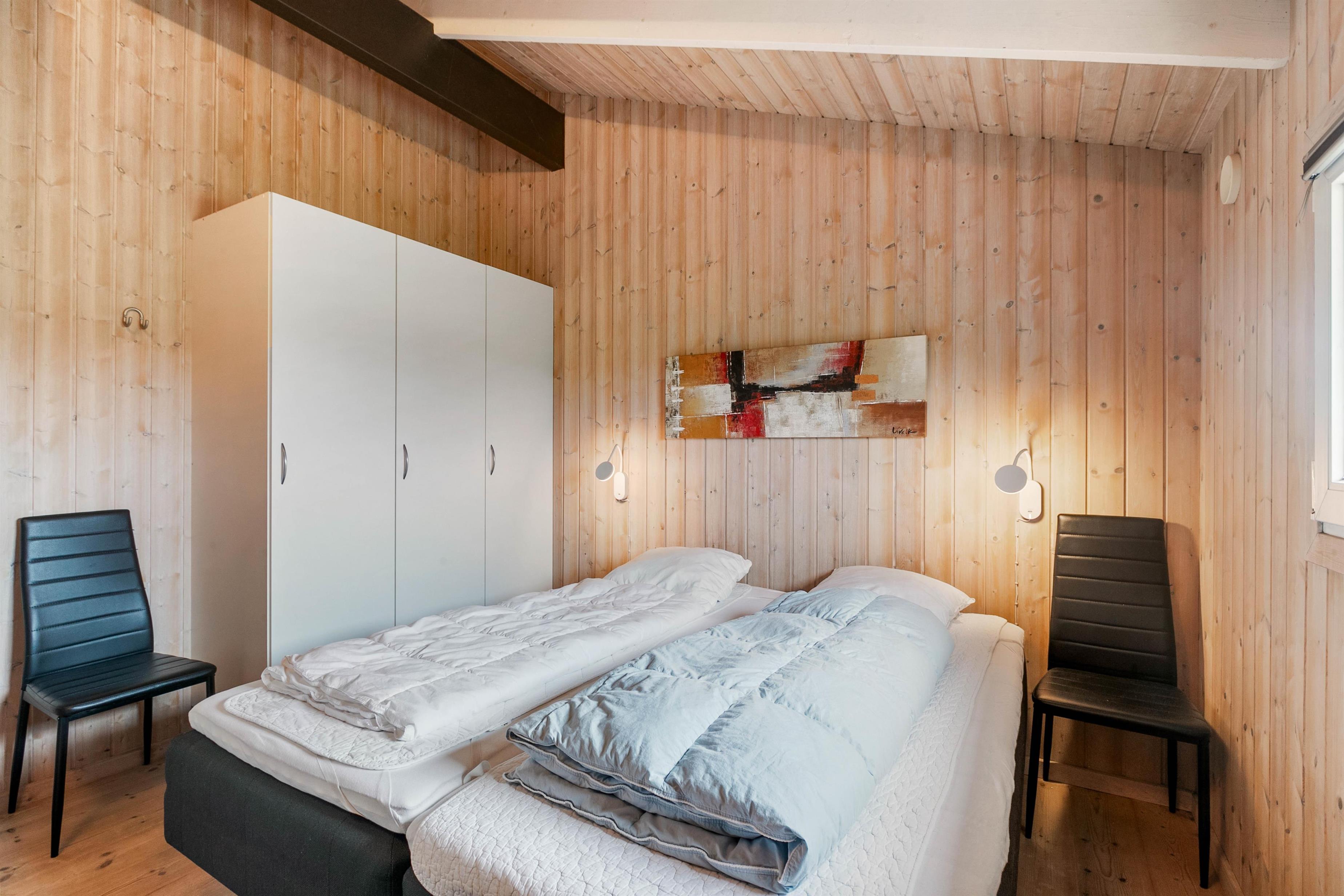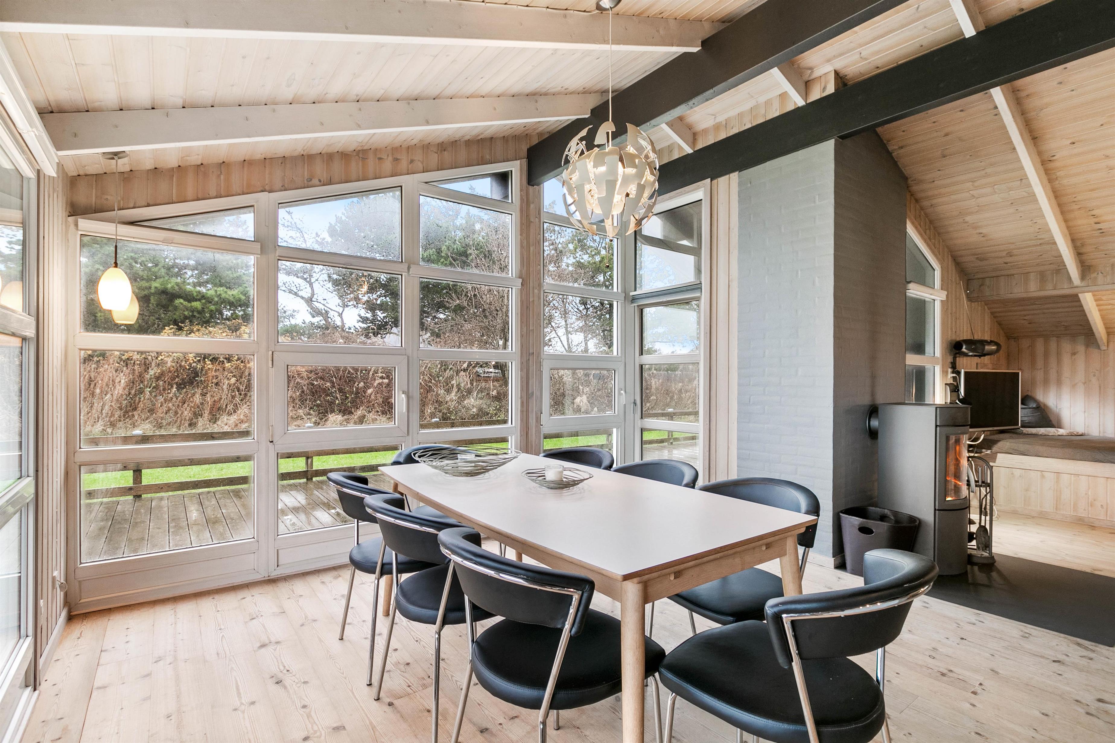 Sommerhuset er lyst og venligt indrettet, den varme træbeklædning sørger for en hyggelig atmosfære og i stuen er der en alkove til de hyggelige timer med ren afslapning med en god bog eller surfe på det gratis internet. I det store badeværelse med gulvvarme er der spabad og sauna, her kan du rigtig slappe af. I det praktiske køkken er udstyret i orden og her kan forberedelserne til feriens måltider udrettes, det kunne jo være de selv fangede fisk.