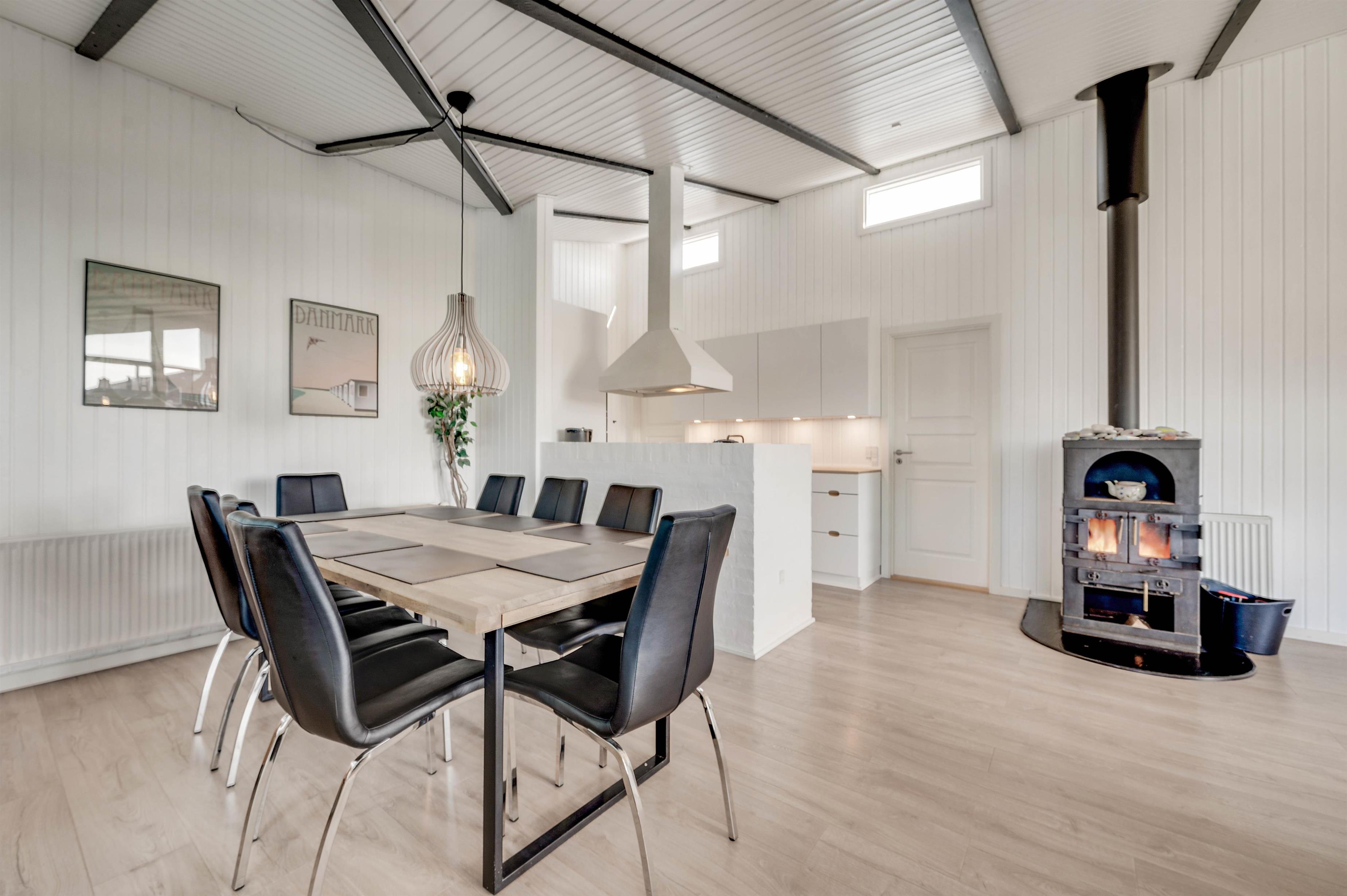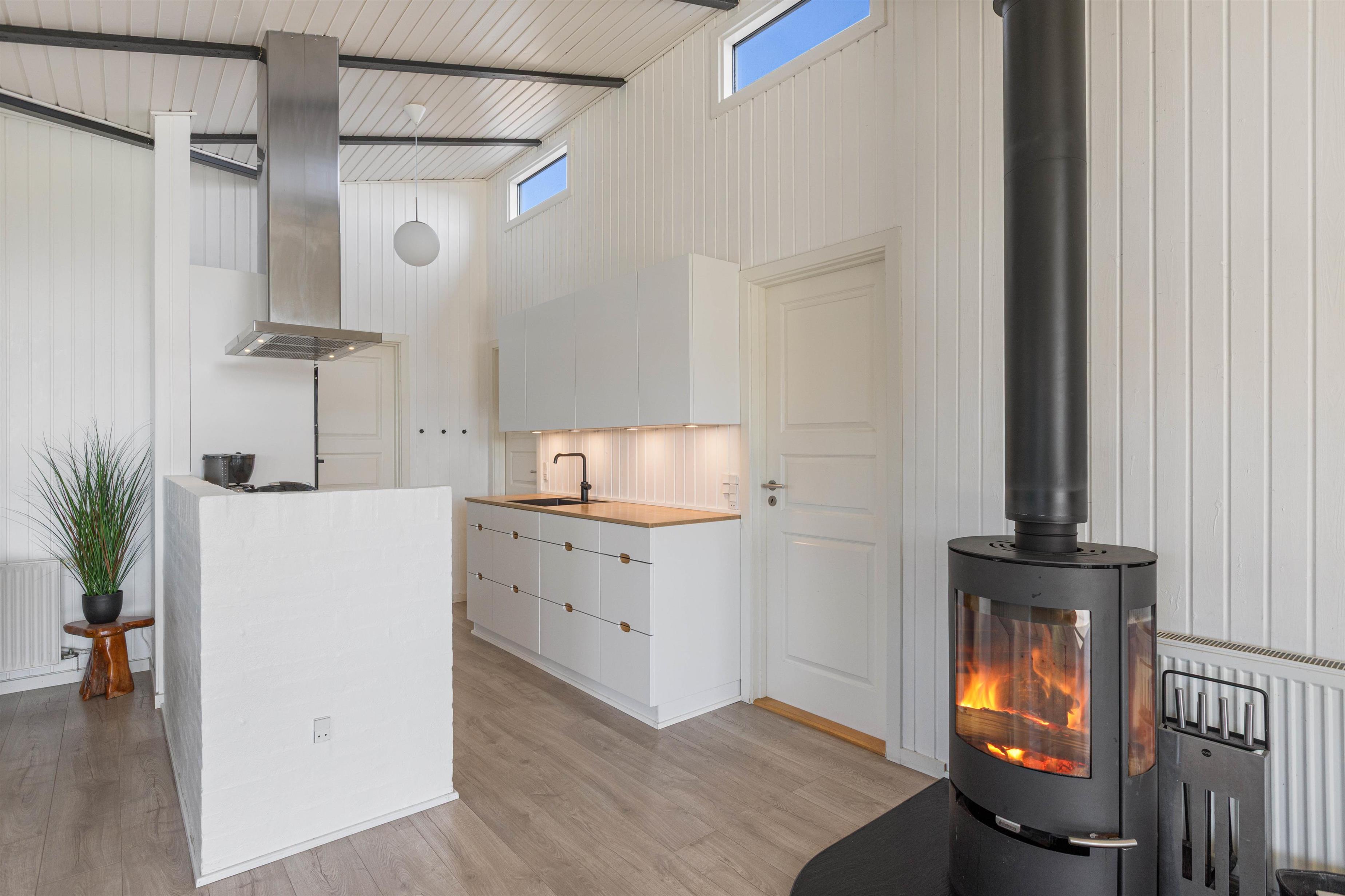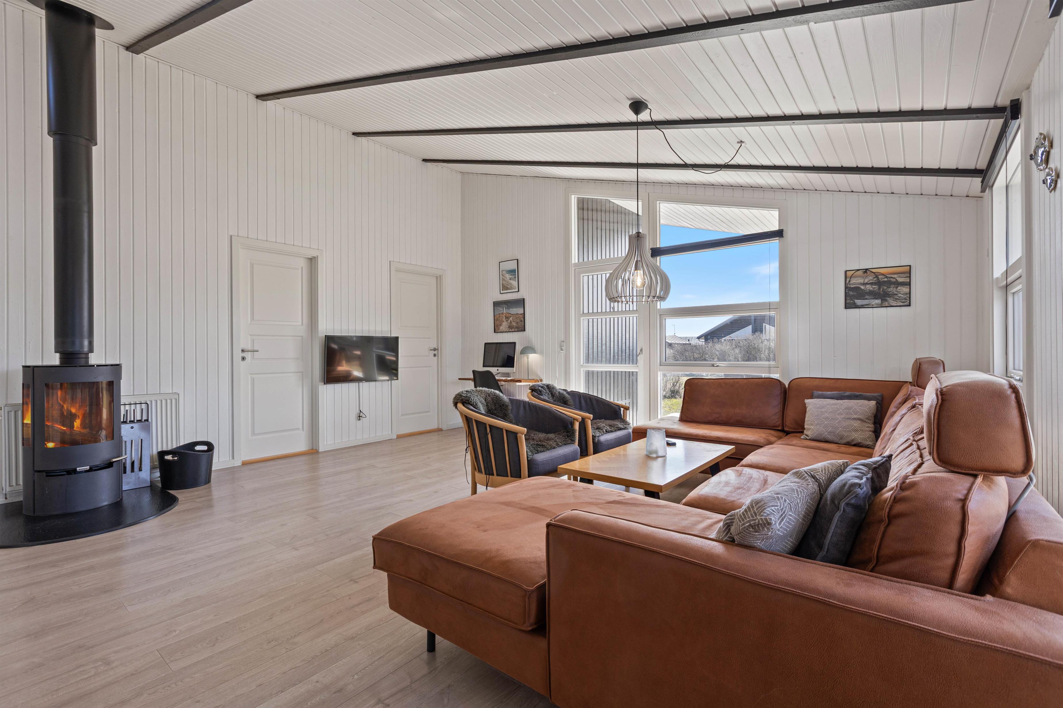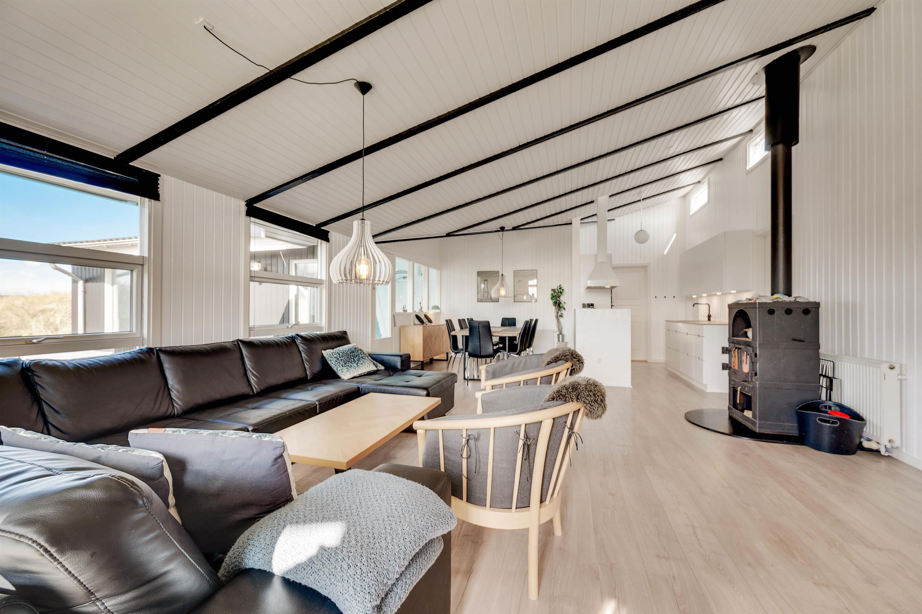 Feriehuset på Vestklitvej 4 egner sig perfekt til en dejlig familieferie i moderne omgivelser. Det store køkken ligger i direkte forbindelse med opholdsrummet, som består af stuen og spiseområdet. De høje lofter og store vinduer sørger for et dejligt lys i sommerhuset, og brændeovnen udsender året rundt en dejlig varme i opholdsrummet.