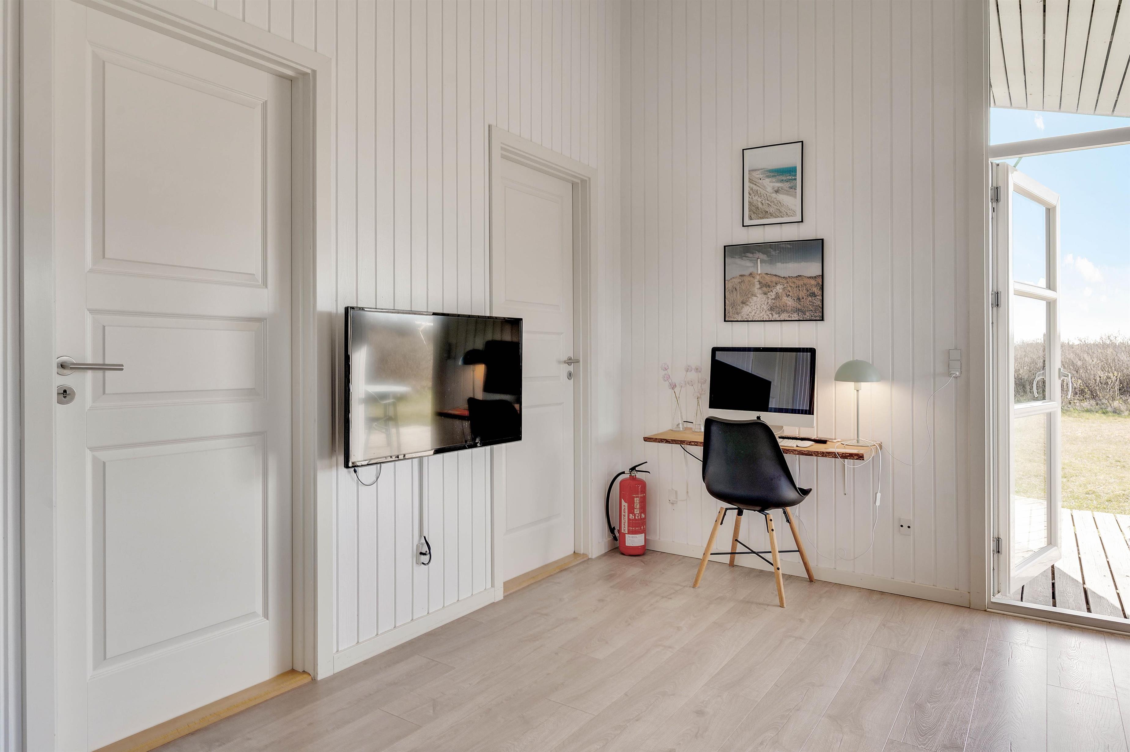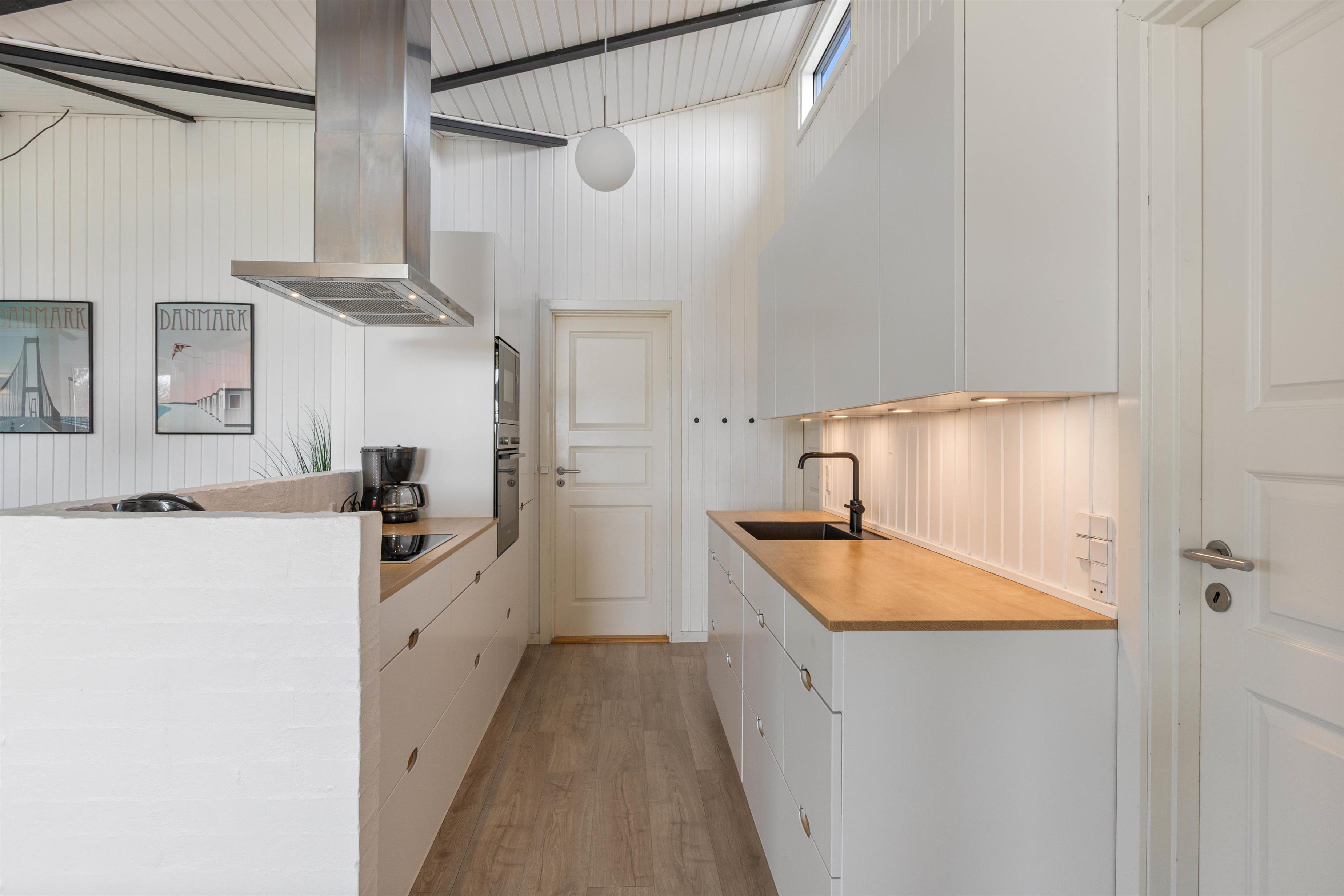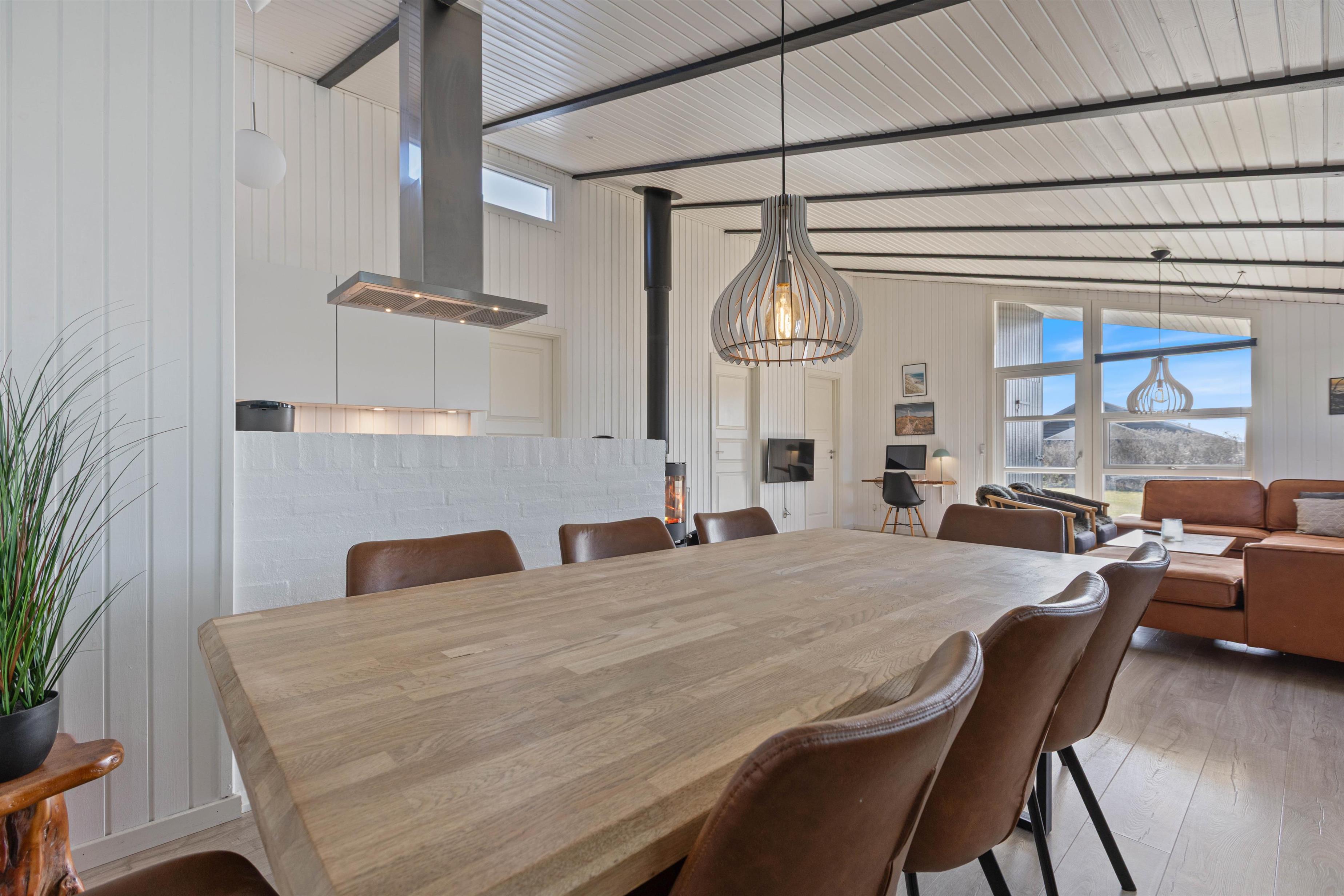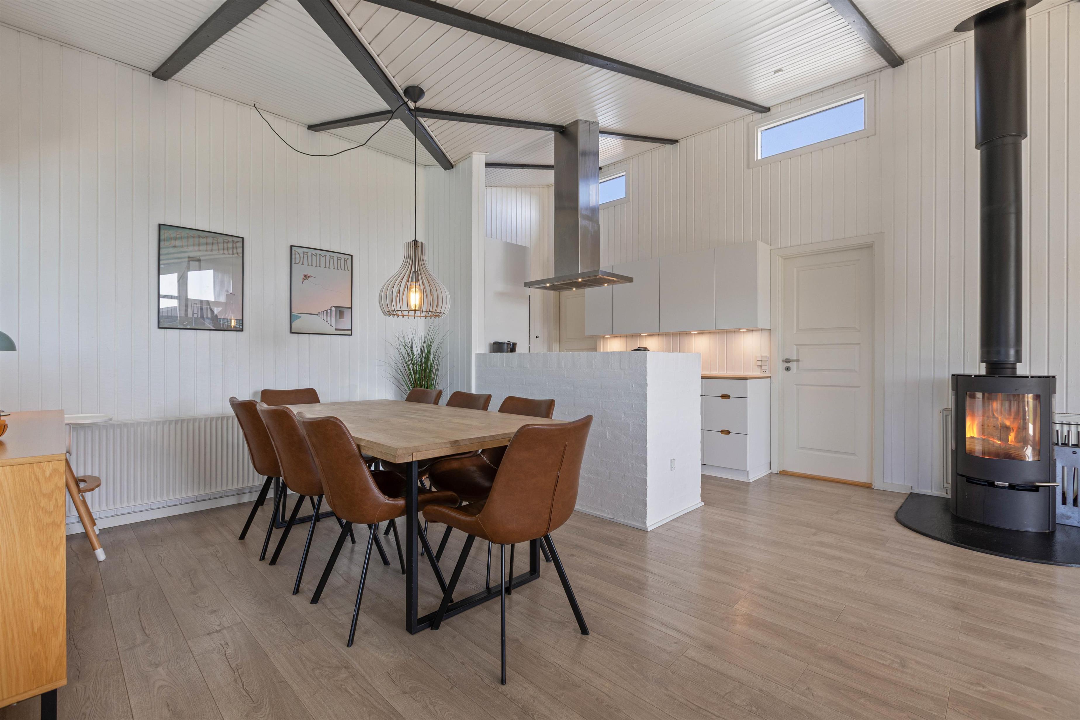 Feriehuset på Vestklitvej 4 egner sig perfekt til en dejlig familieferie i moderne omgivelser. Det store køkken ligger i direkte forbindelse med opholdsrummet, som består af stuen og spiseområdet. De høje lofter og store vinduer sørger for et dejligt lys i sommerhuset, og brændeovnen udsender året rundt en dejlig varme i opholdsrummet.