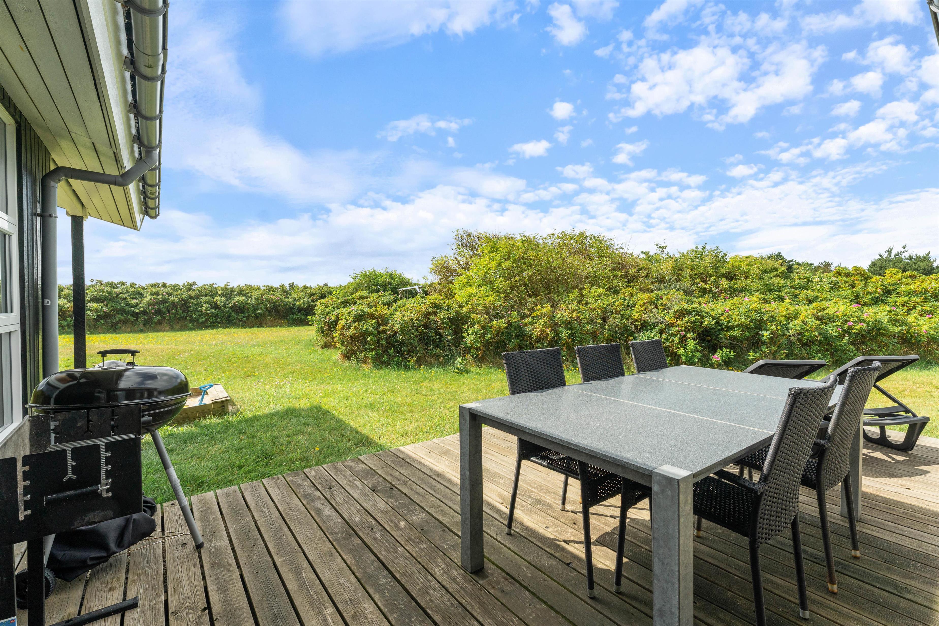 Den store sommerhusgrund med græsplæne og hybenbuske sætter nogle dejlige rammer for jeres ferie ved Vestkysten. Her er der masser af plads til, at børnene kan gå på opdagelse, få kilden i maven på gyngerne eller lege i sandkassen.