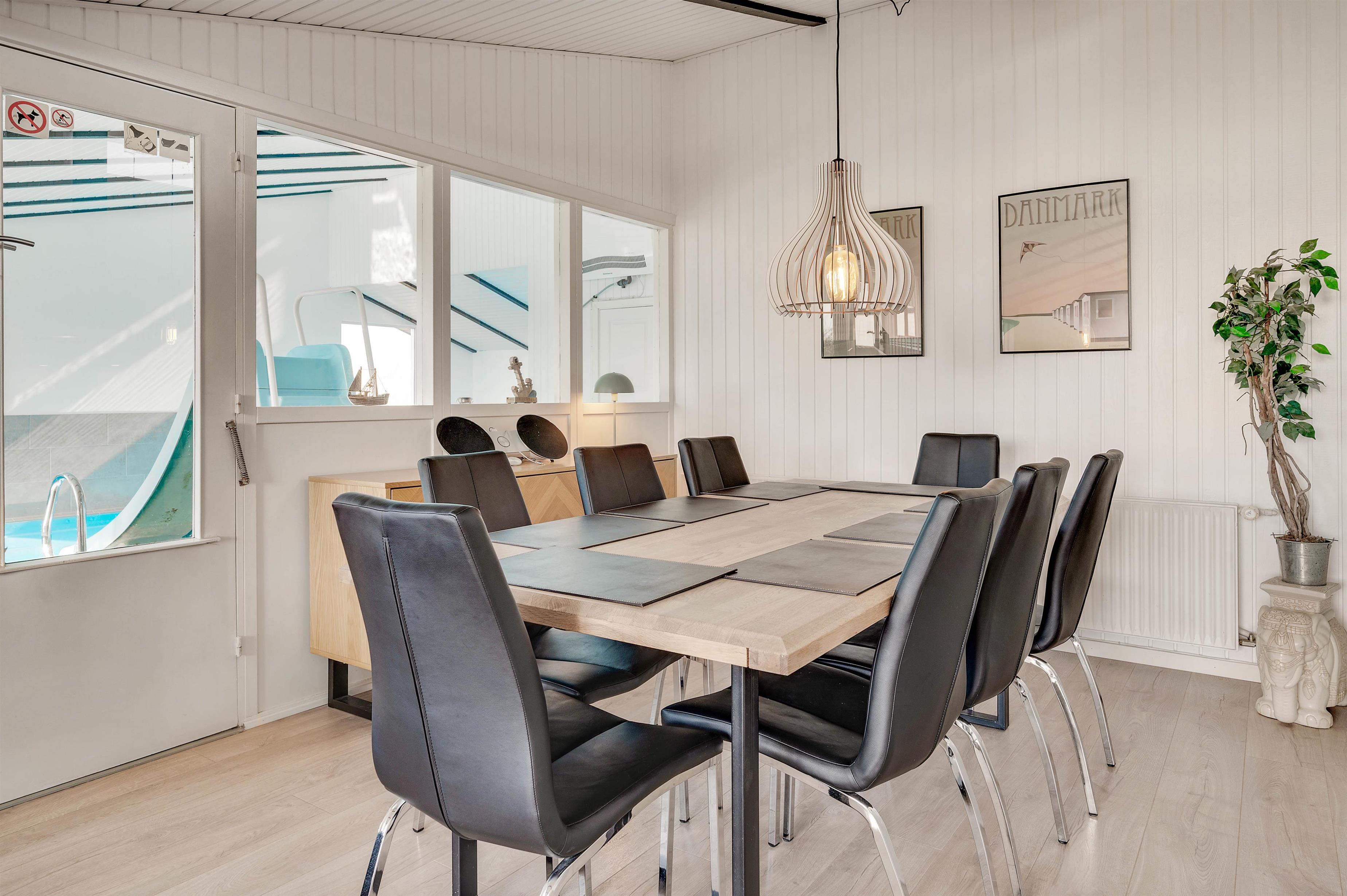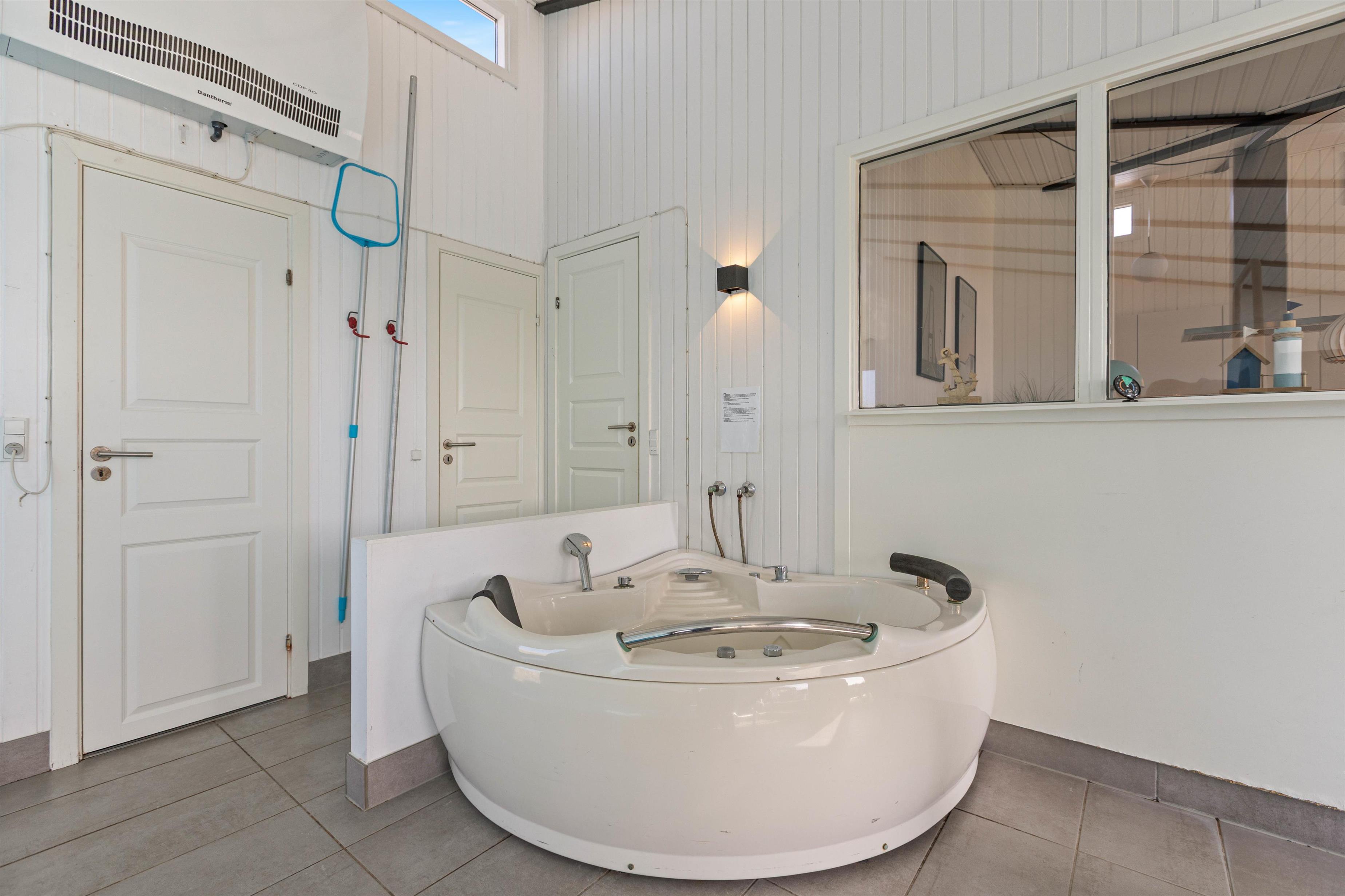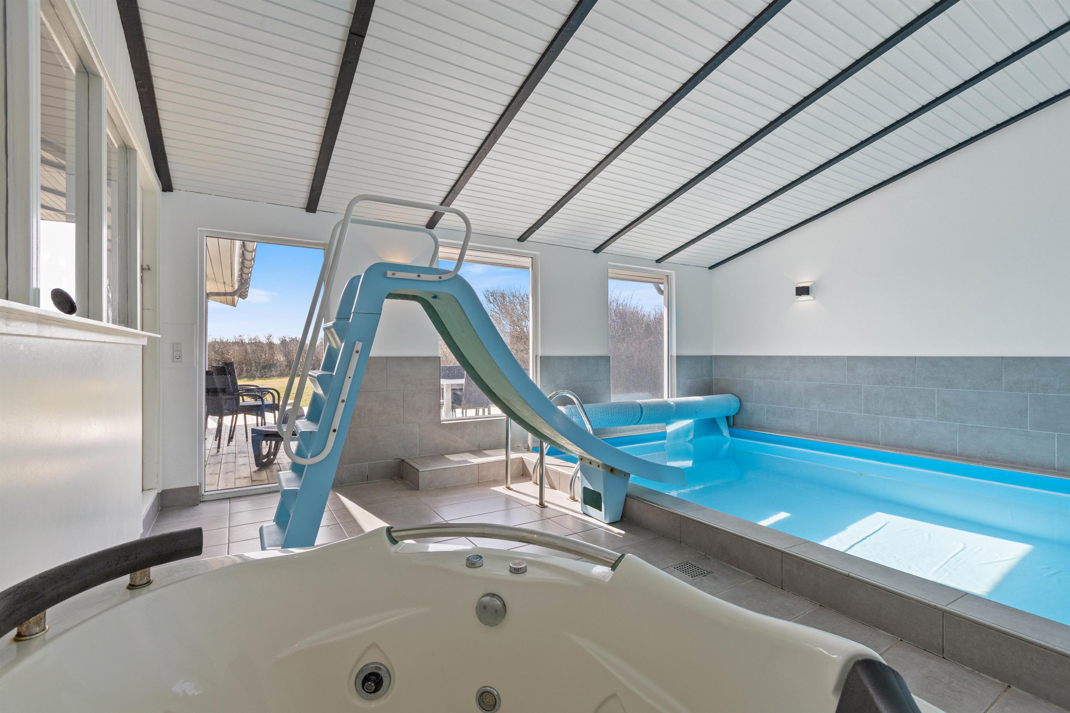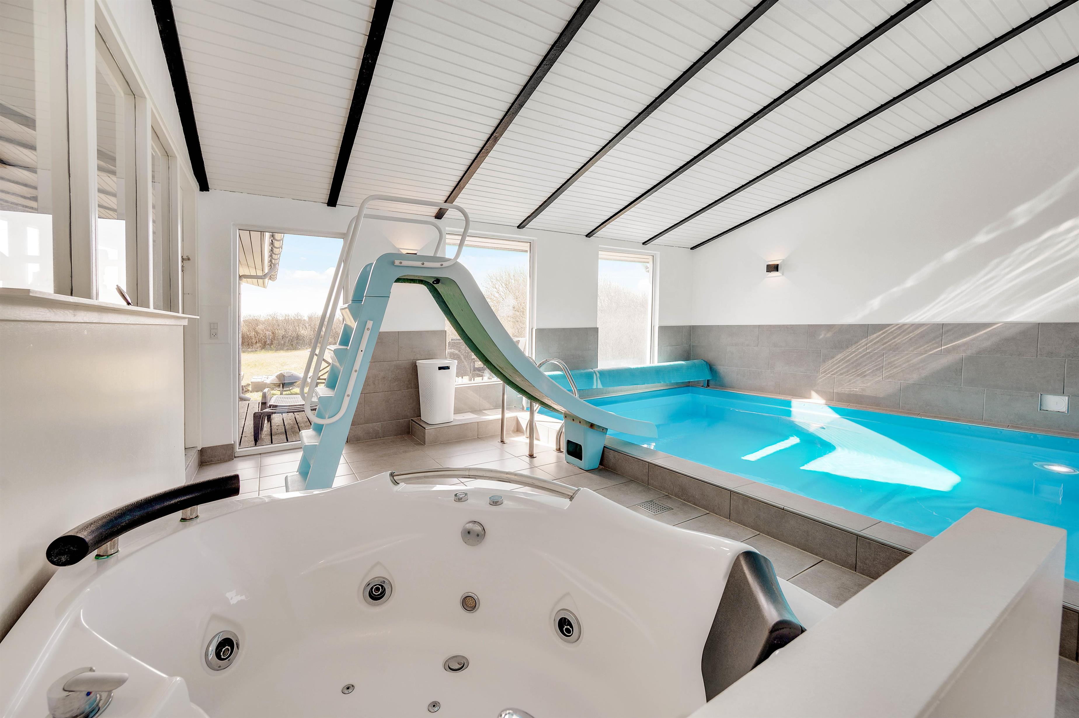 I dette poolhus er der både plads til leg og wellness: Swimmingpoolen står klar til at glæde både børn og voksne, der kan suse ned i vandet på rutsjebanen. For at lade kroppen slappe helt af kan I sætte jer til rette i spabadet eller saunaen, som indbyder til mange timers wellness. Imens I nyder ferien, ordner opvaskemaskinen, vaskemaskinen og tørretumbleren de praktiske gøremål.