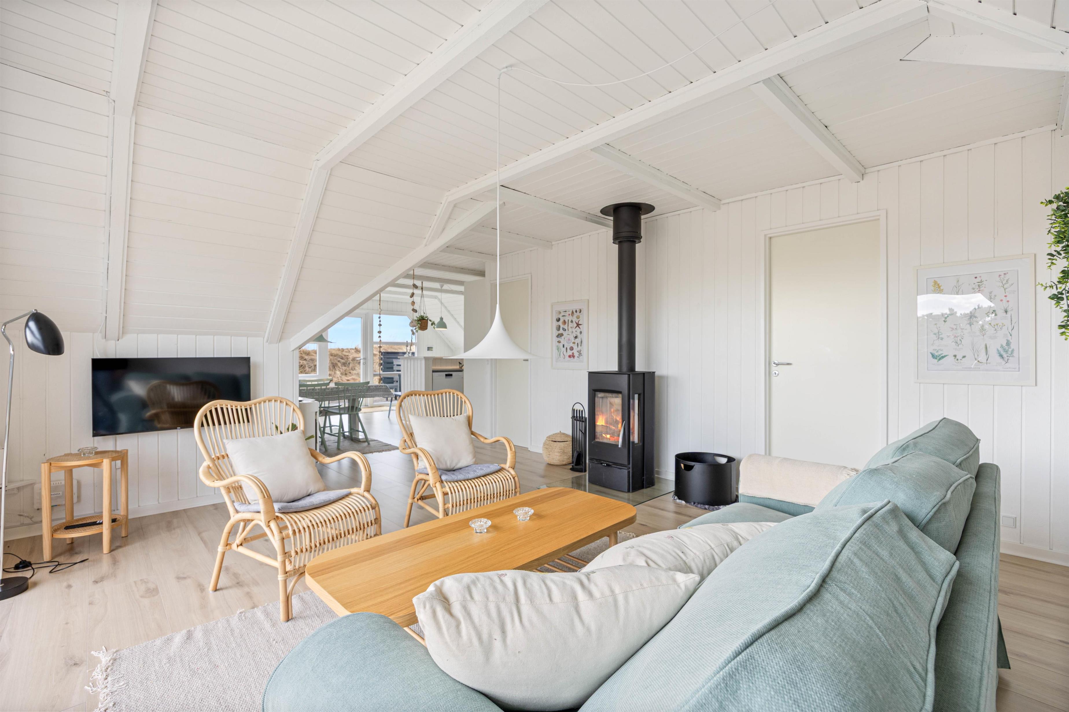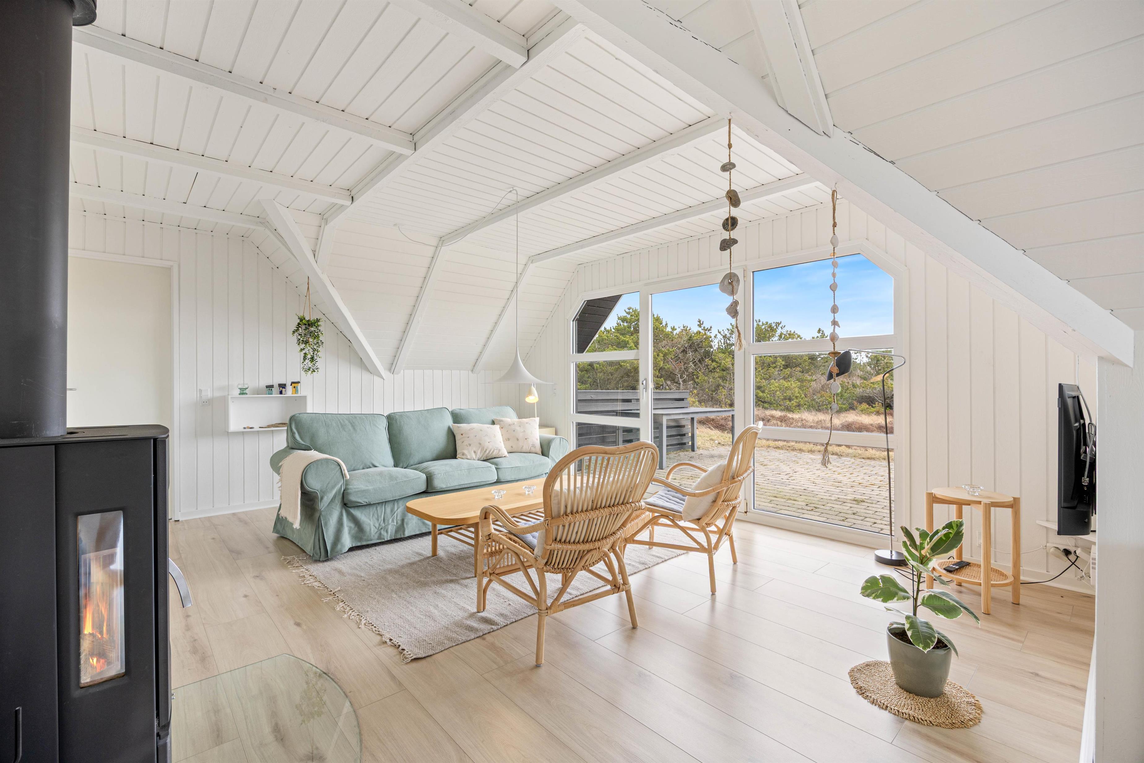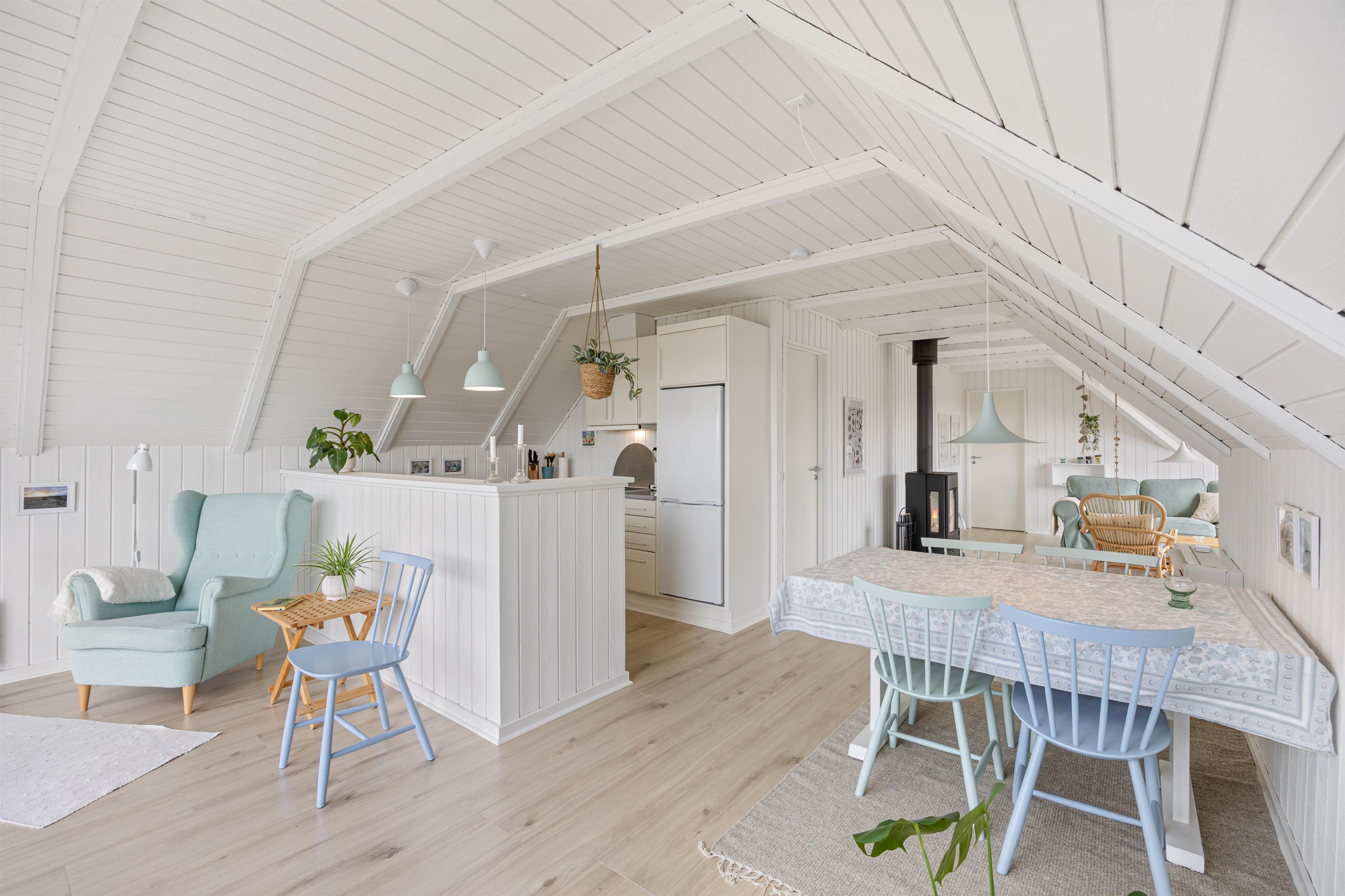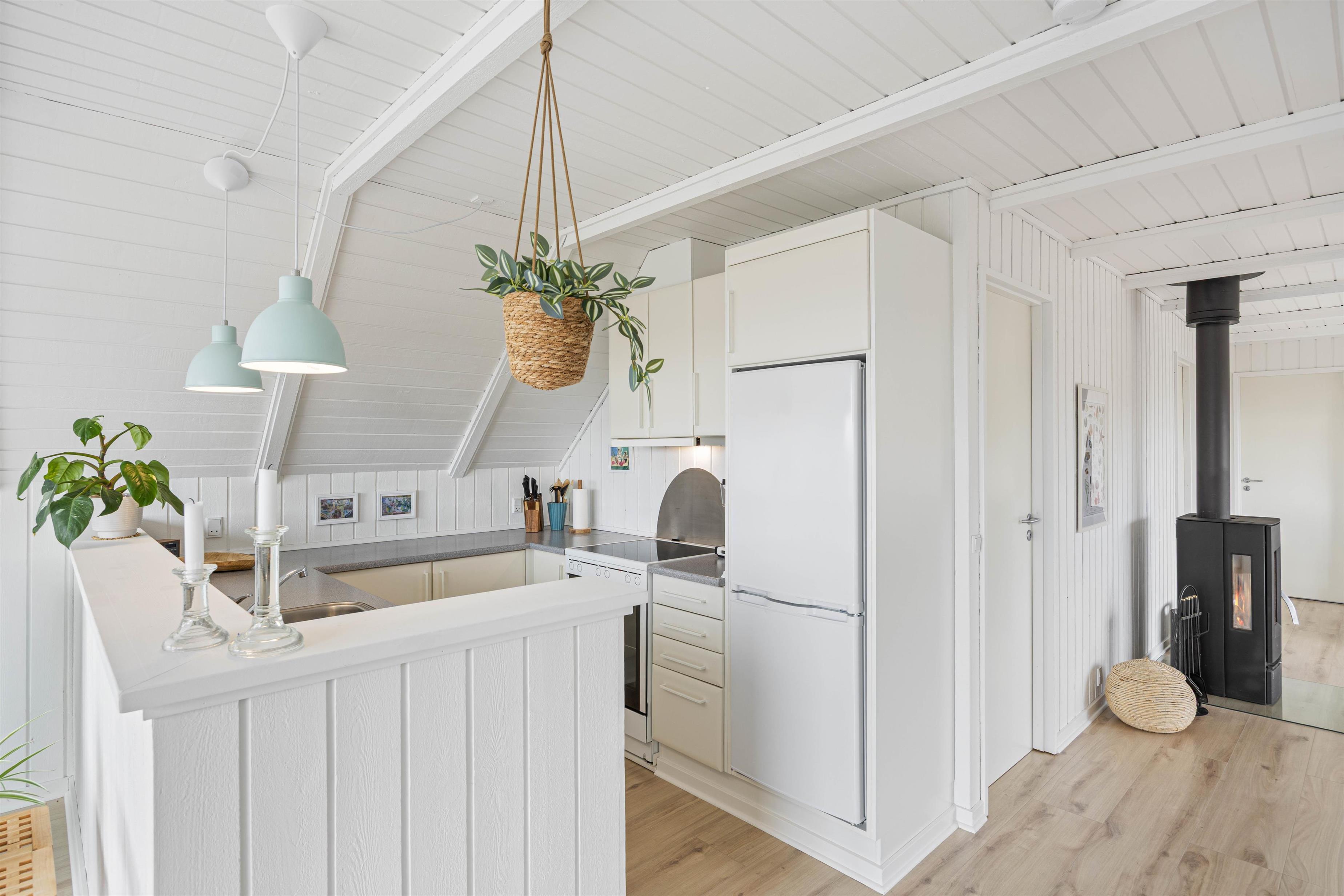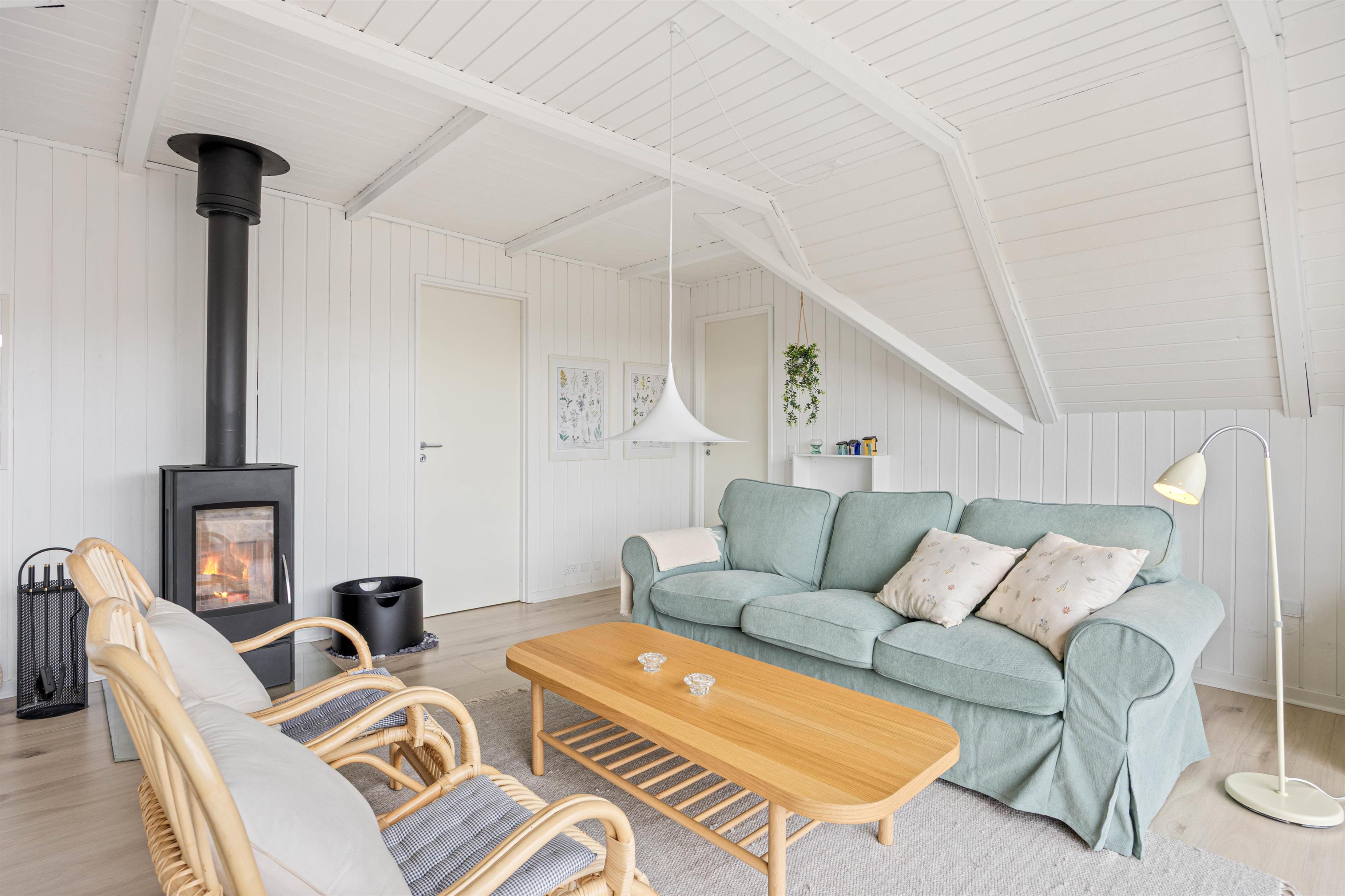Sommerhuset byder på en hyggelig atmosfære med lyse vægge, brændeovn og store vinduespartier, der lader lyset strømme ind og giver en skøn fornemmelse af at være midt i naturen. Stuen er indrettet med komfortable møbler og en brændeovn, der spreder varme og hygge på kølige dage. Den åbne forbindelse til køkkenet gør det nemt at være sammen om madlavningen, og køkkenet er veludstyret med blandt andet opvaskemaskine.