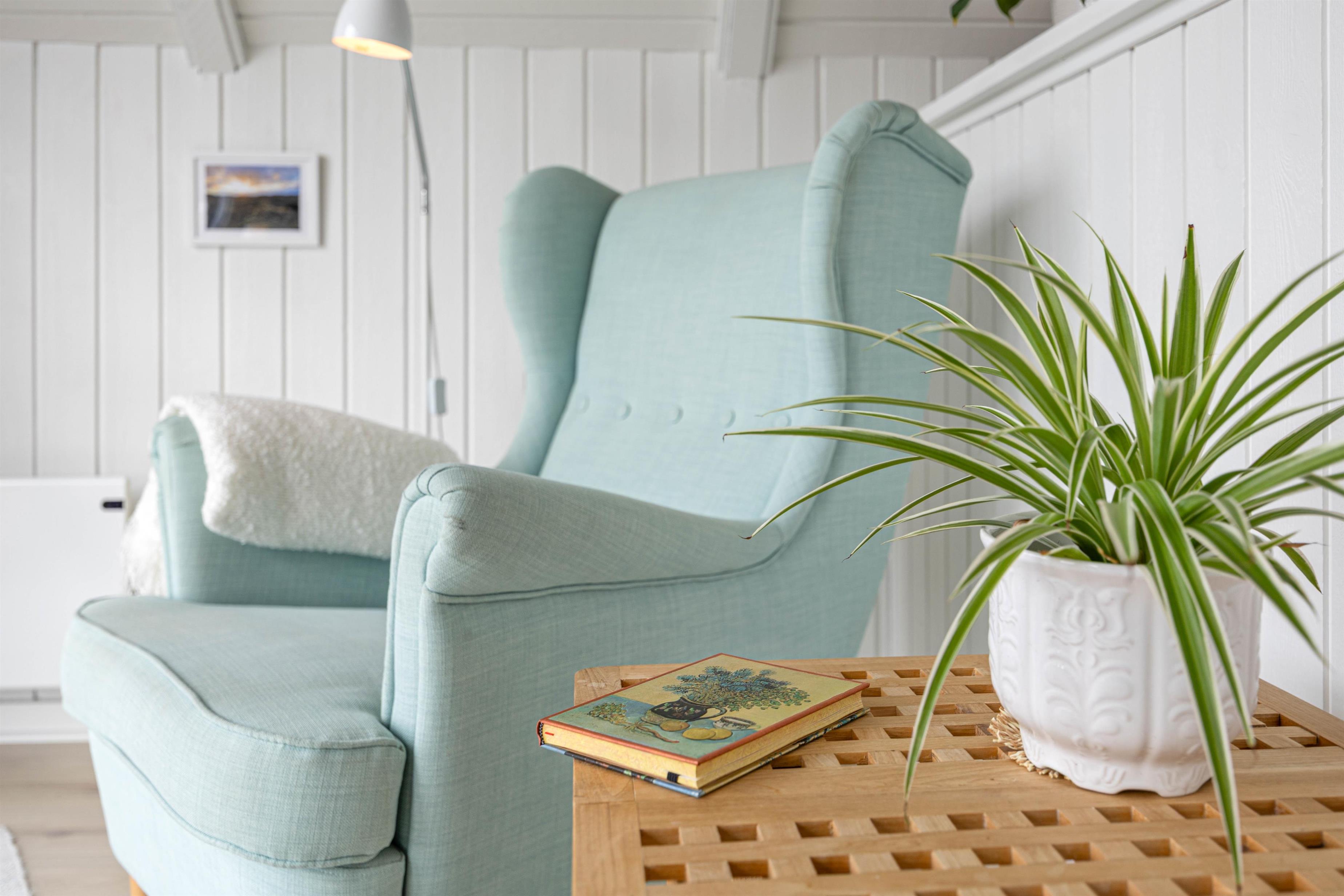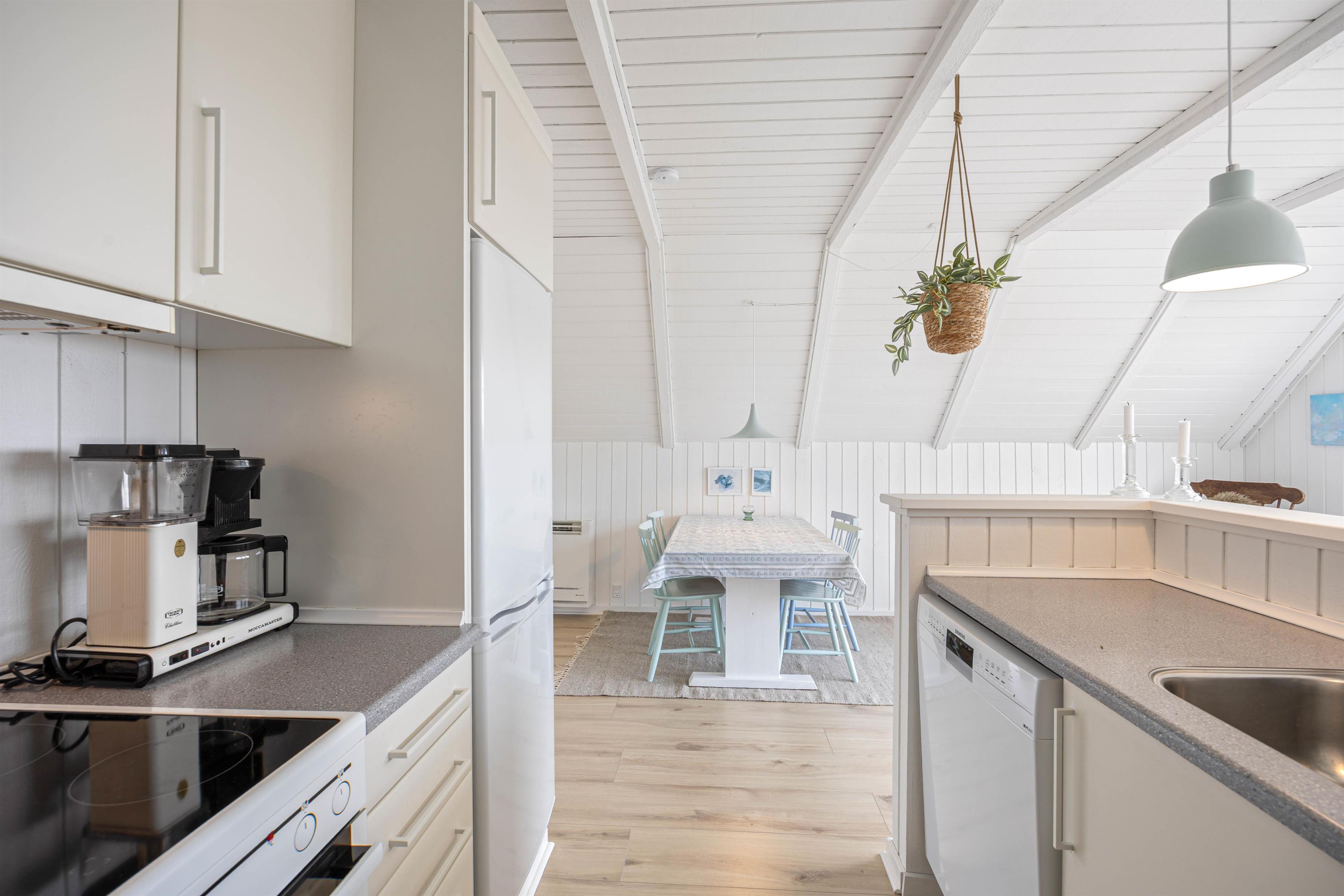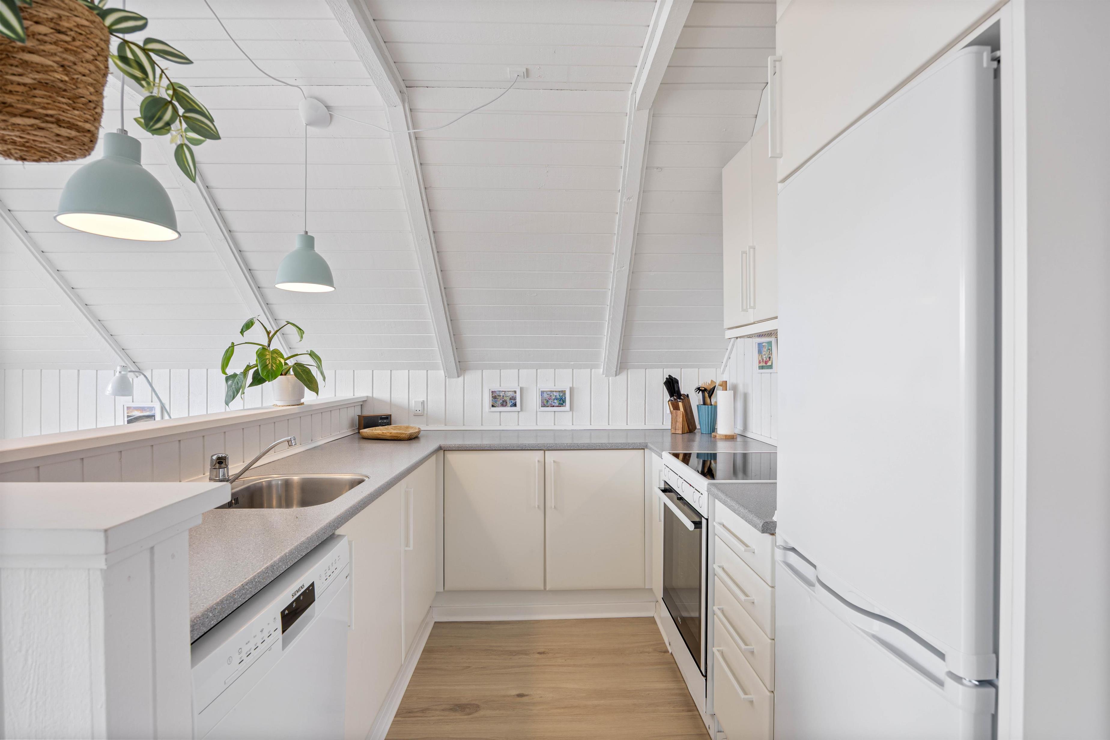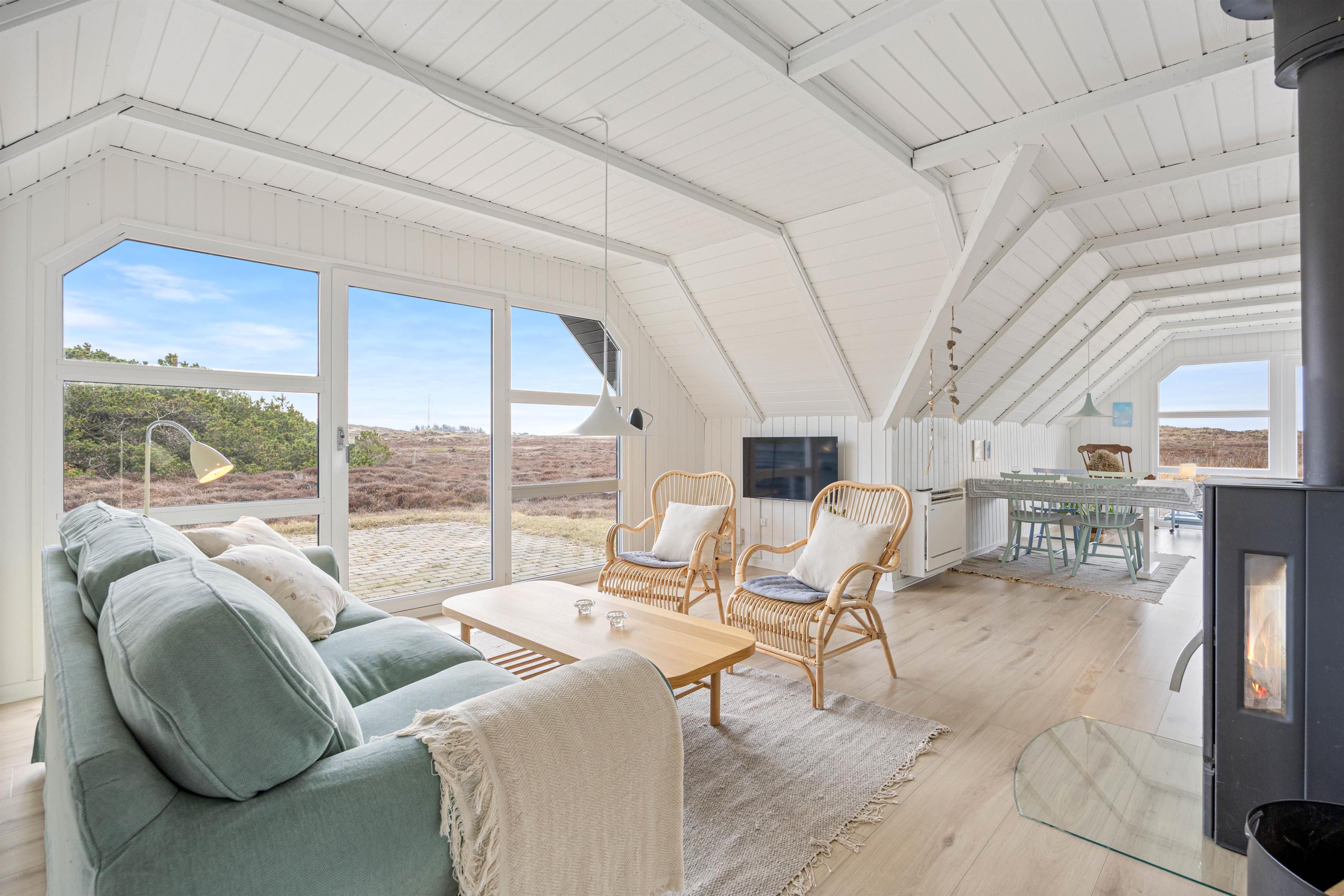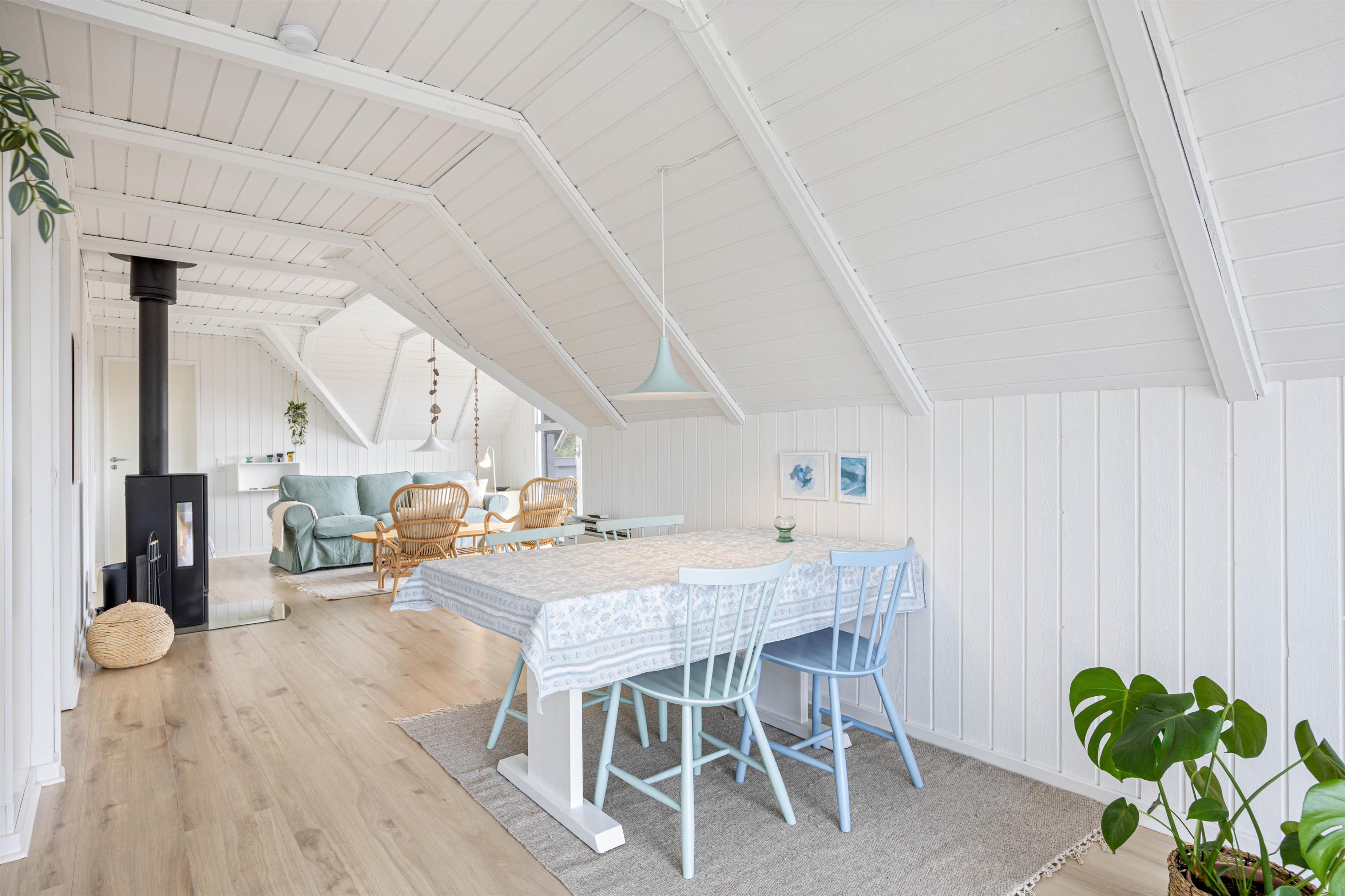 Sommerhuset byder på en hyggelig atmosfære med lyse vægge, brændeovn og store vinduespartier, der lader lyset strømme ind og giver en skøn fornemmelse af at være midt i naturen. Stuen er indrettet med komfortable møbler og en brændeovn, der spreder varme og hygge på kølige dage. Den åbne forbindelse til køkkenet gør det nemt at være sammen om madlavningen, og køkkenet er veludstyret med blandt andet opvaskemaskine.