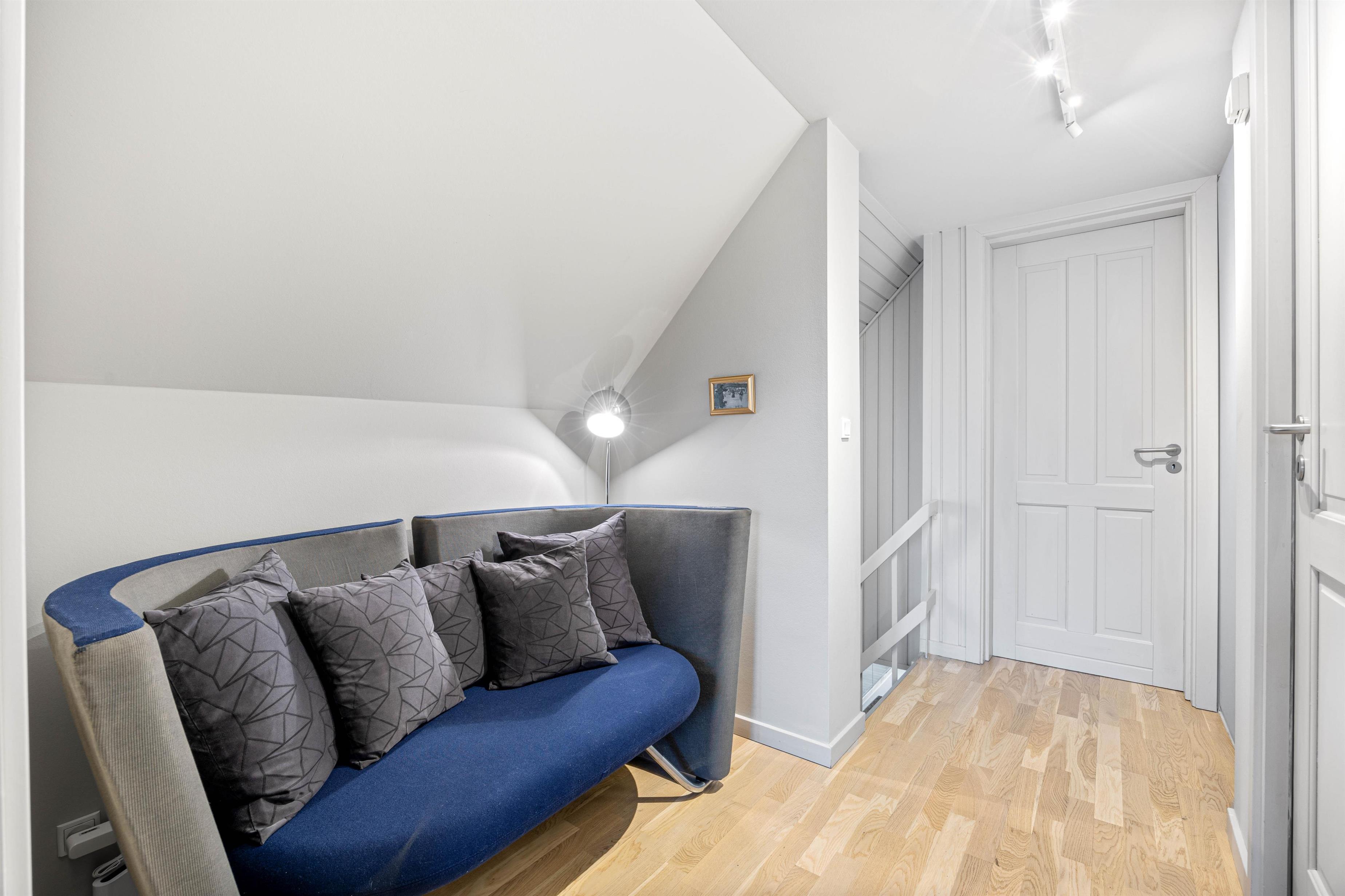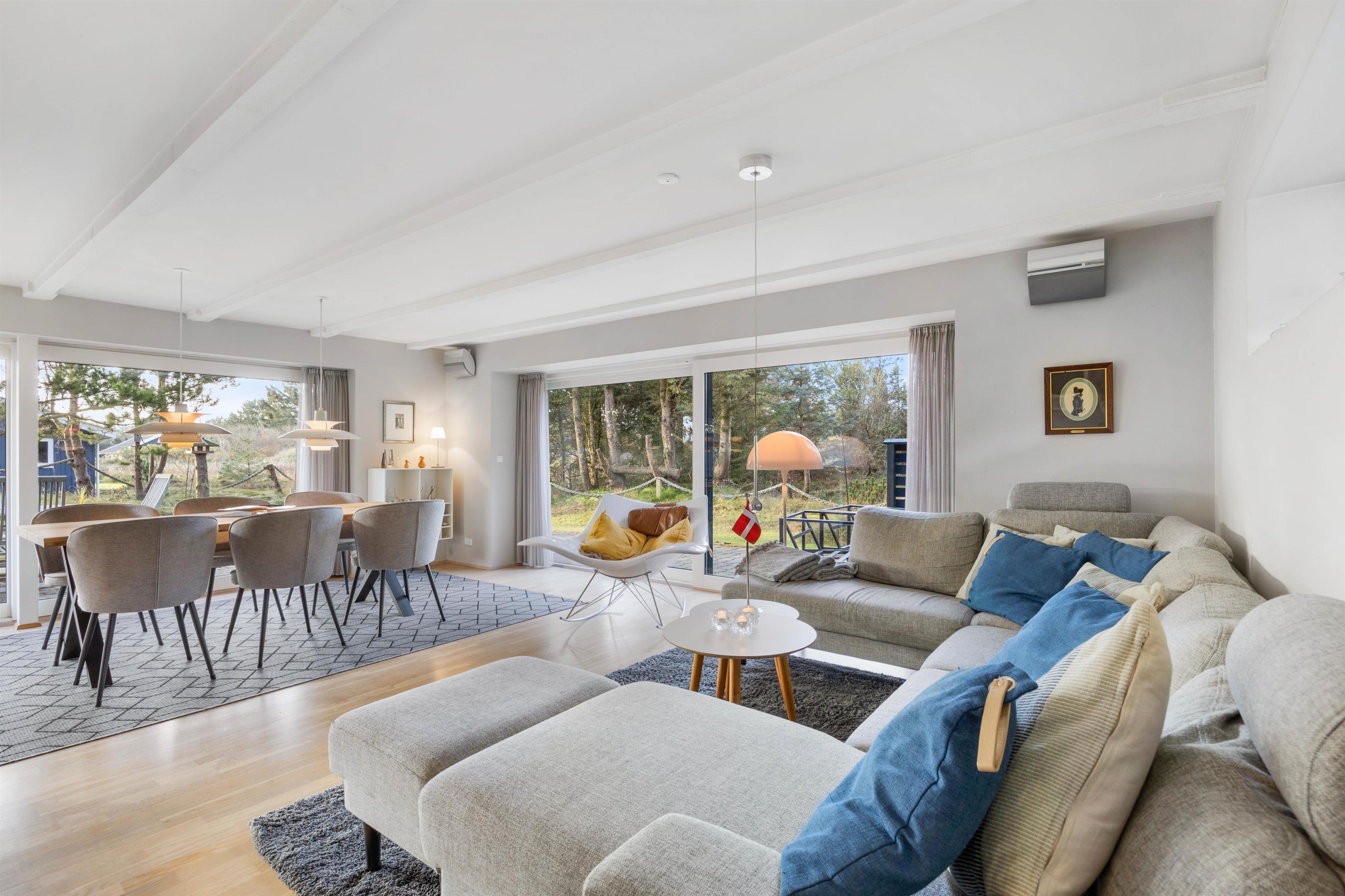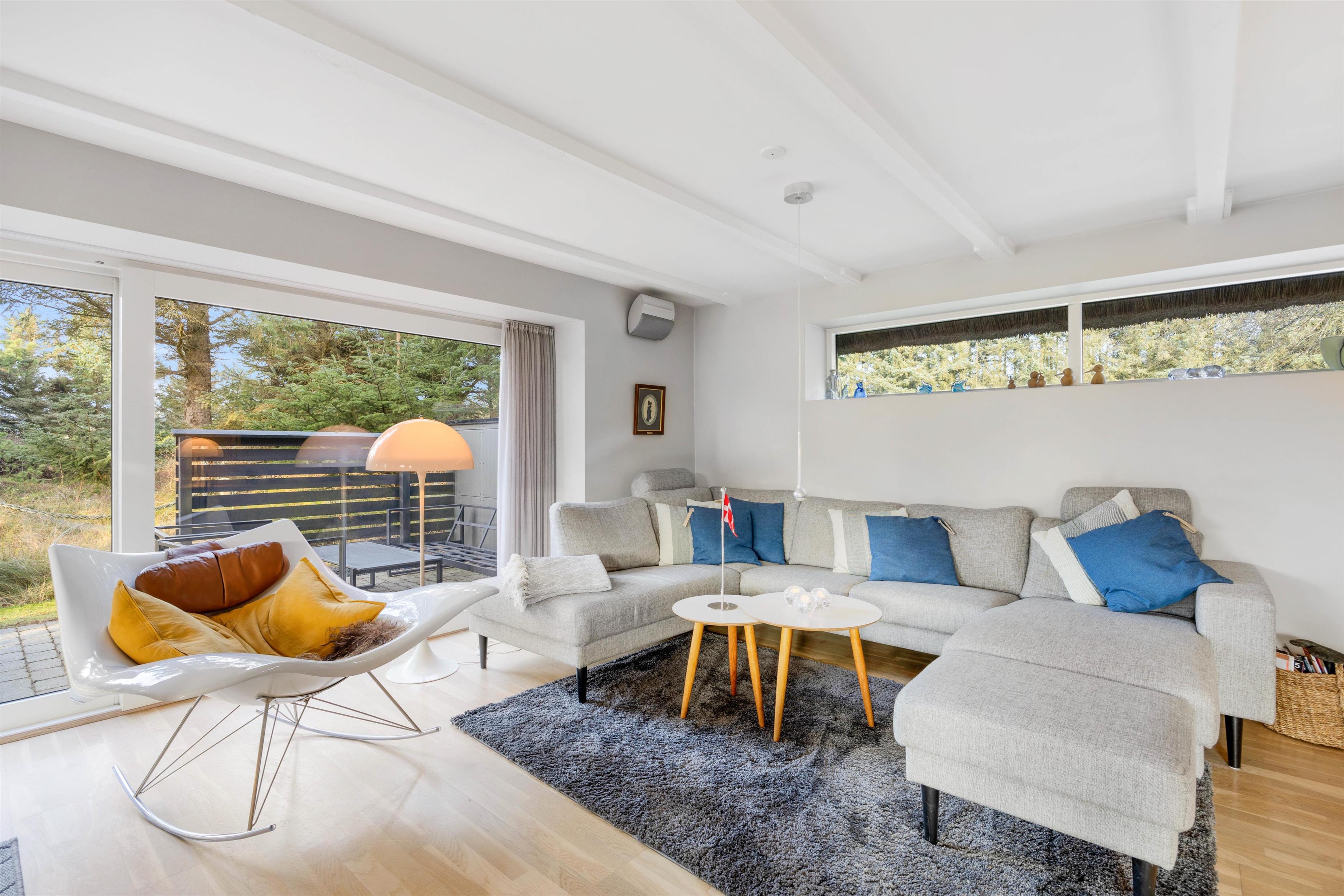 Indenfor byder sommerhuset på en moderne og stilfuld indretning med en rummelig stue med pejseindsats - perfekt til hyggelige aftener. De store vinduer giver et fantastisk lysindfald og en skøn udsigt til den omkringliggende natur.