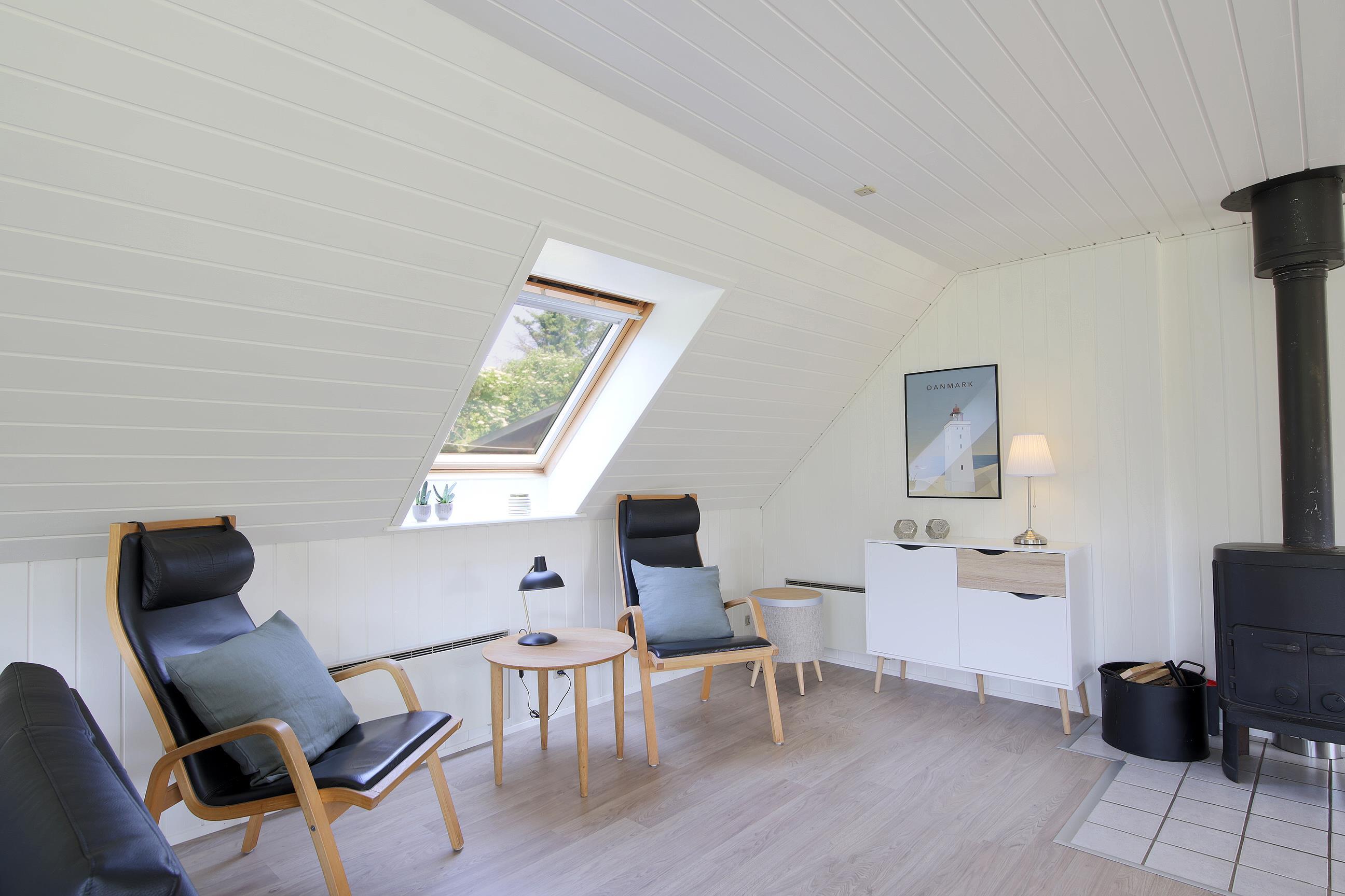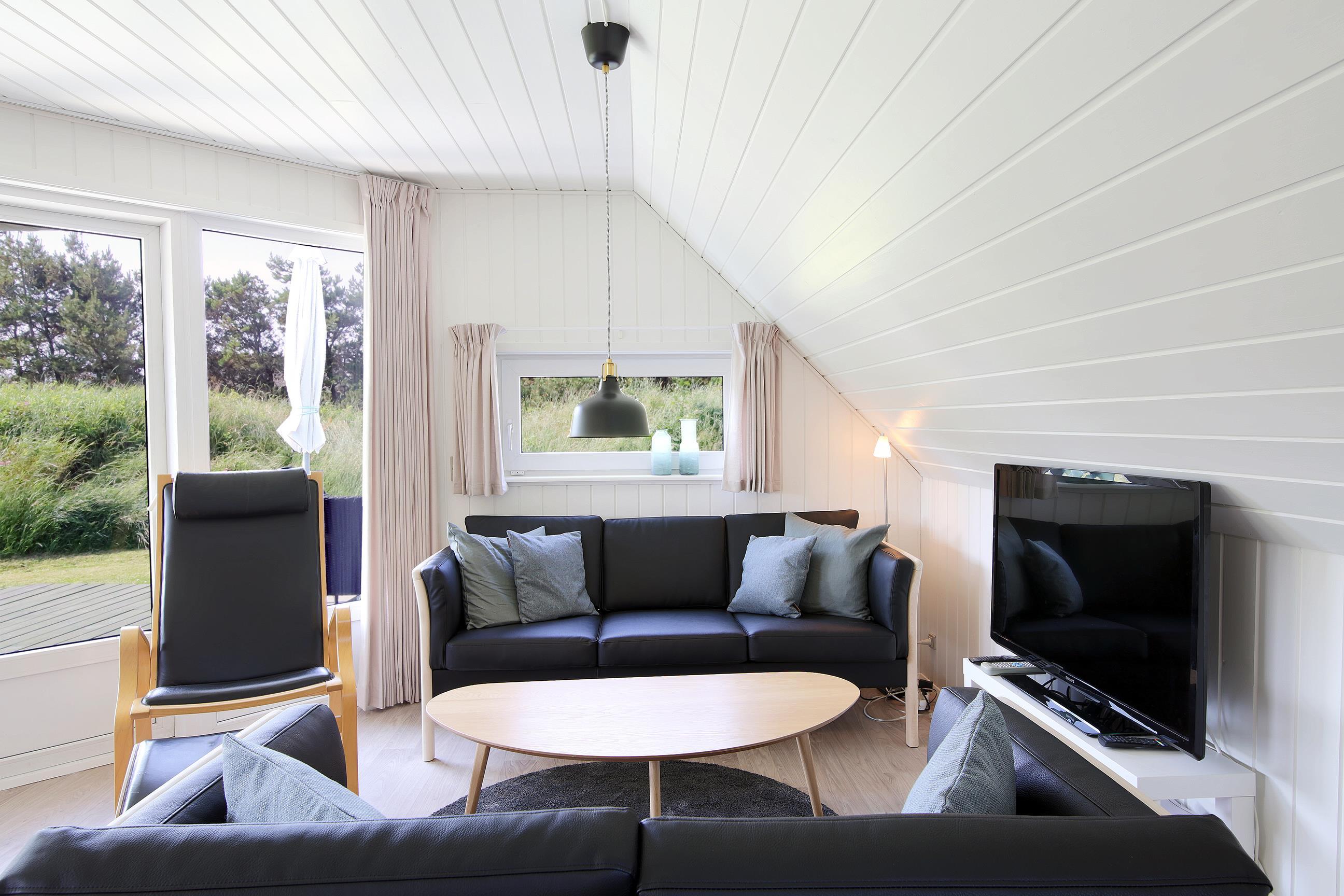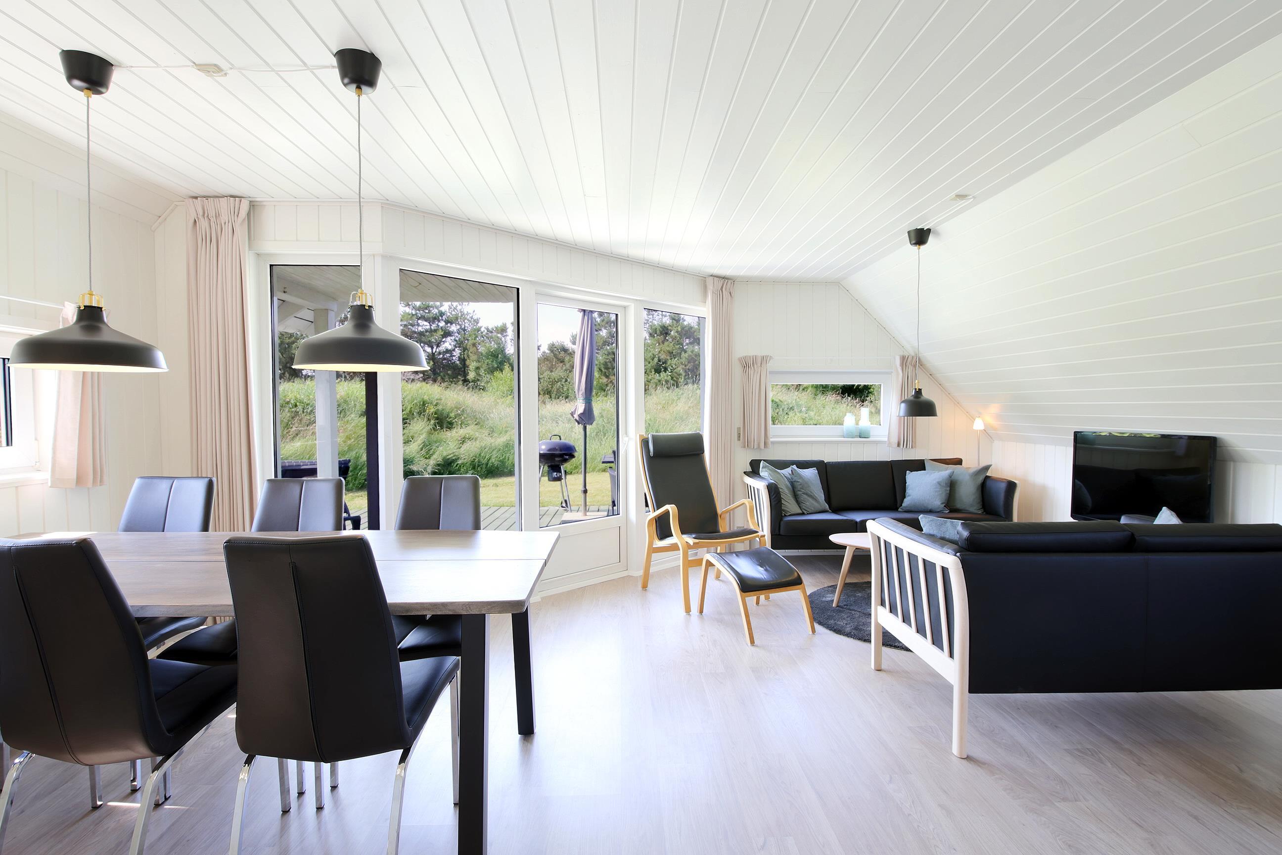 Så snart du træder indenfor i sommerhuset i Klegod, vil du blive mødt af en lækker og lys indretning, hvor smarte sorte møbler komplementerer de lyse panelbeklædte vægge. Det er sommerhusstemning i moderne forklædning. Samtidig inviterer de store vinduespartier i hele huset naturen og lyset helt indenfor.