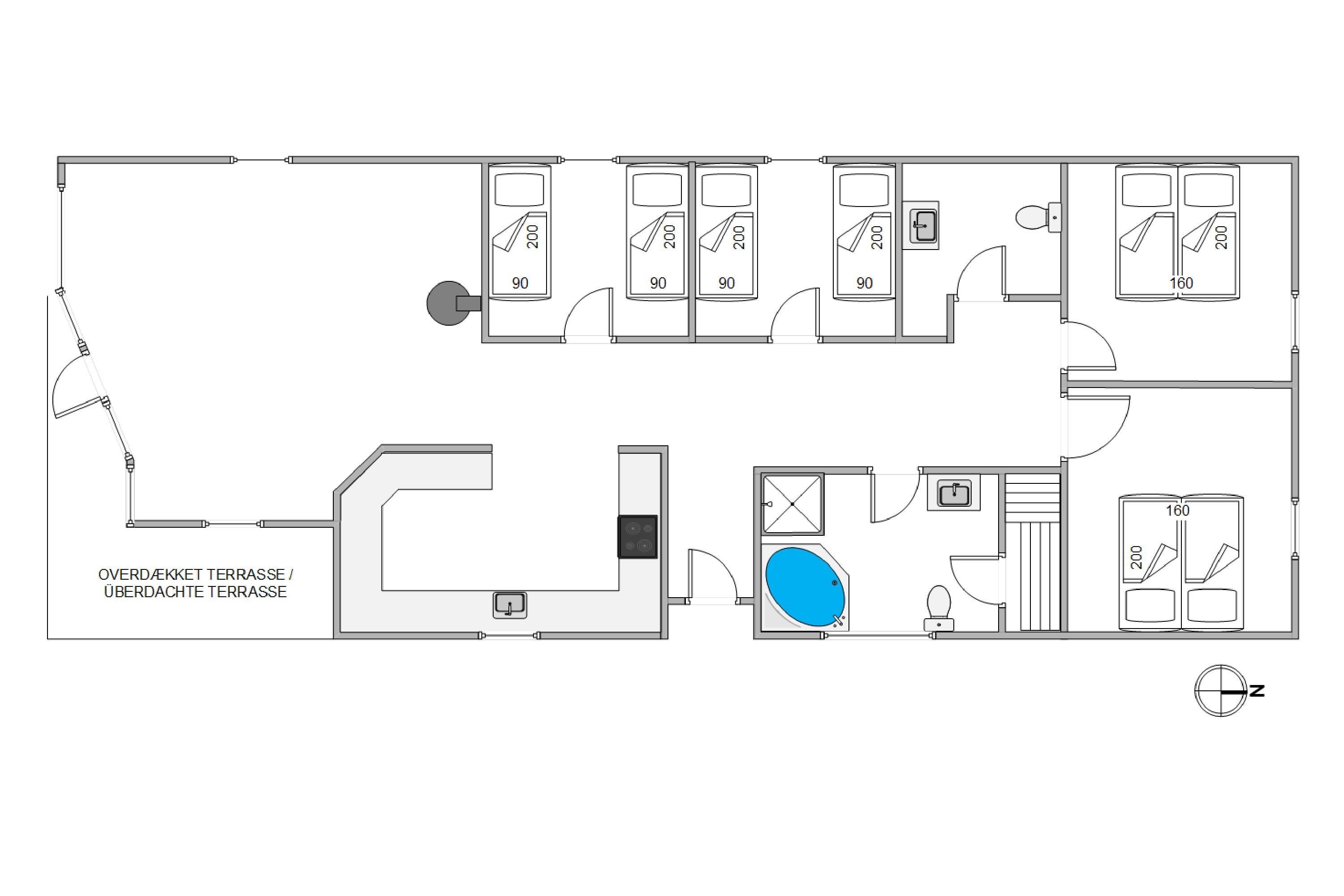 Huset er indrettet med 4 gode værelser og kan i alt huse 8 personer. Værelserne består af henholdsvis to værelser med dobbeltseng og to værelser med hver to enkeltsenge. Det er på alle måder de perfekte omgivelser, når hele familien skal på ferie.