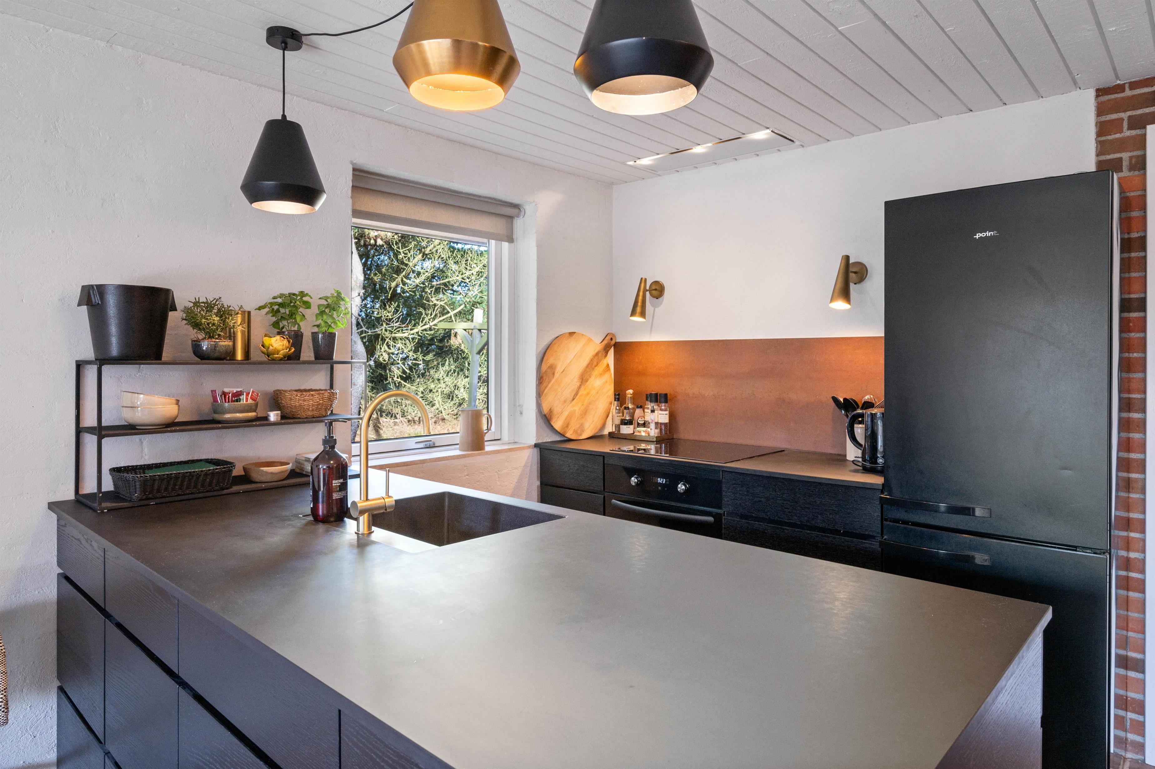I dette sommerhus kommer samværet virkelig i fokus, og rammerne er sat for et hav af skønne stunder med familien. Køkkenalrummet og stuen er samlet i ét hyggeligt fællesrum, hvor I kan samles om madlavningen eller på sofaen, mens brændeovnen knitrer i baggrunden. Gennem de store vinduespartier har I udsyn til den smukke natur, I bor midt i.
