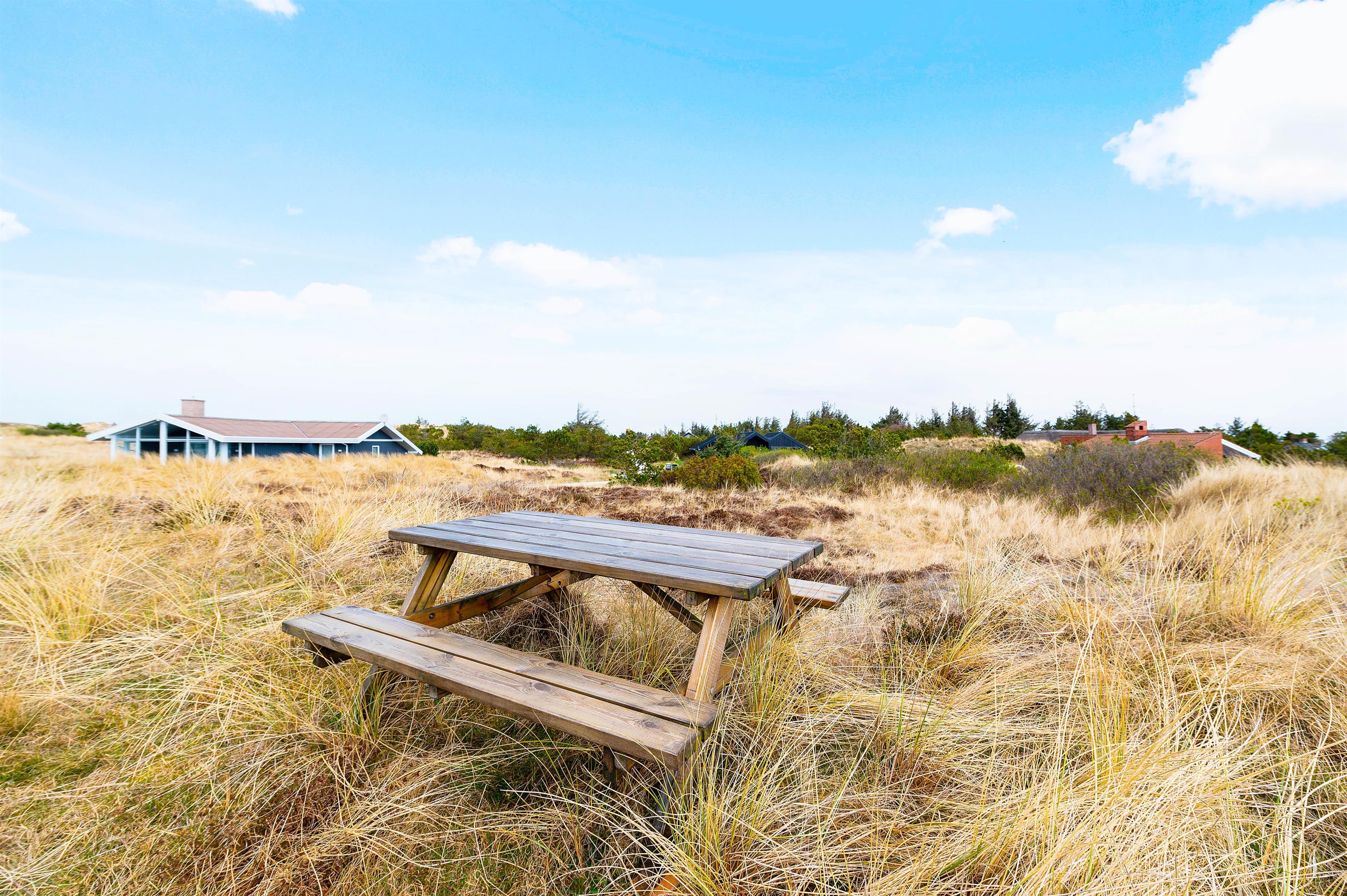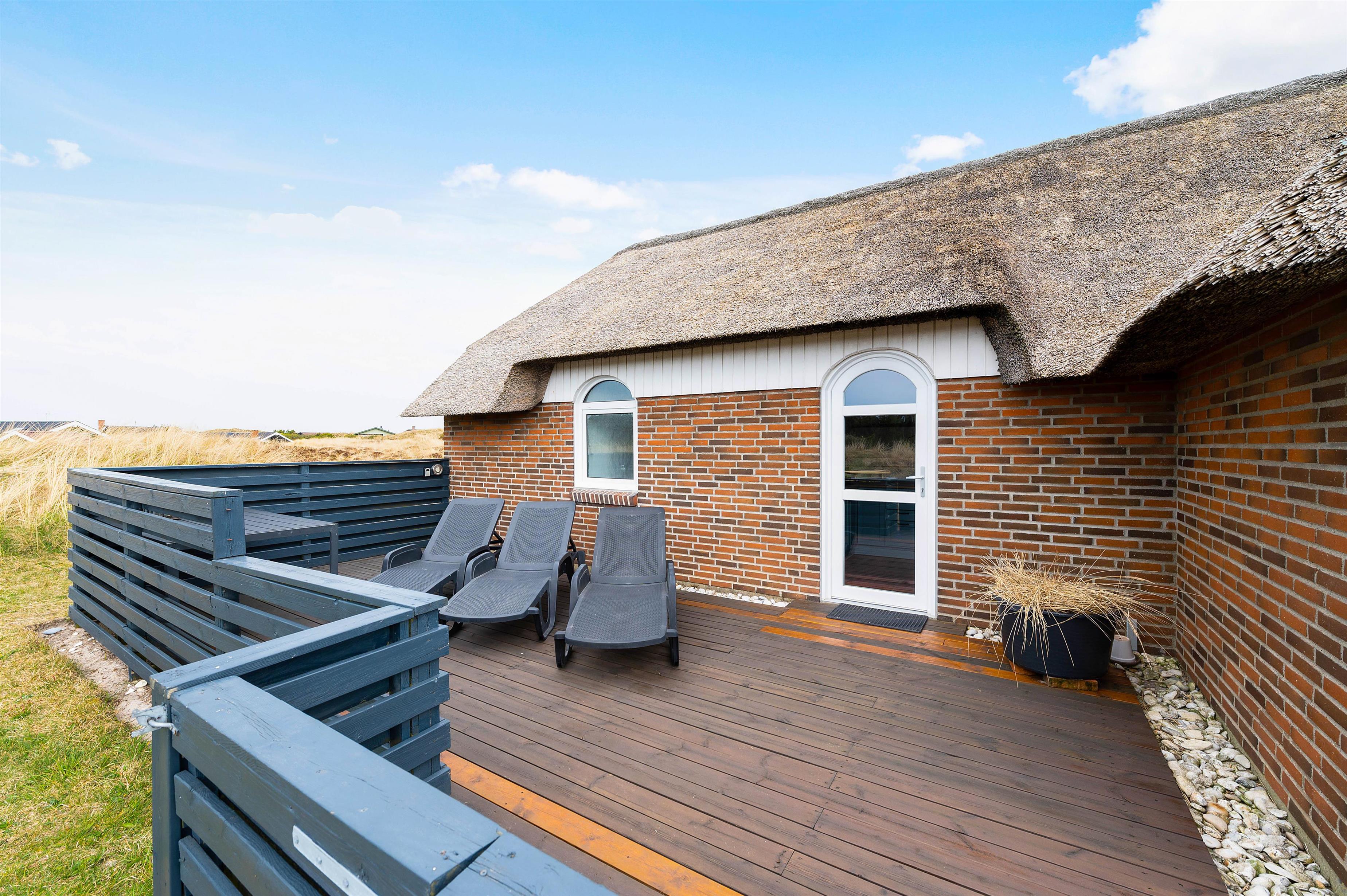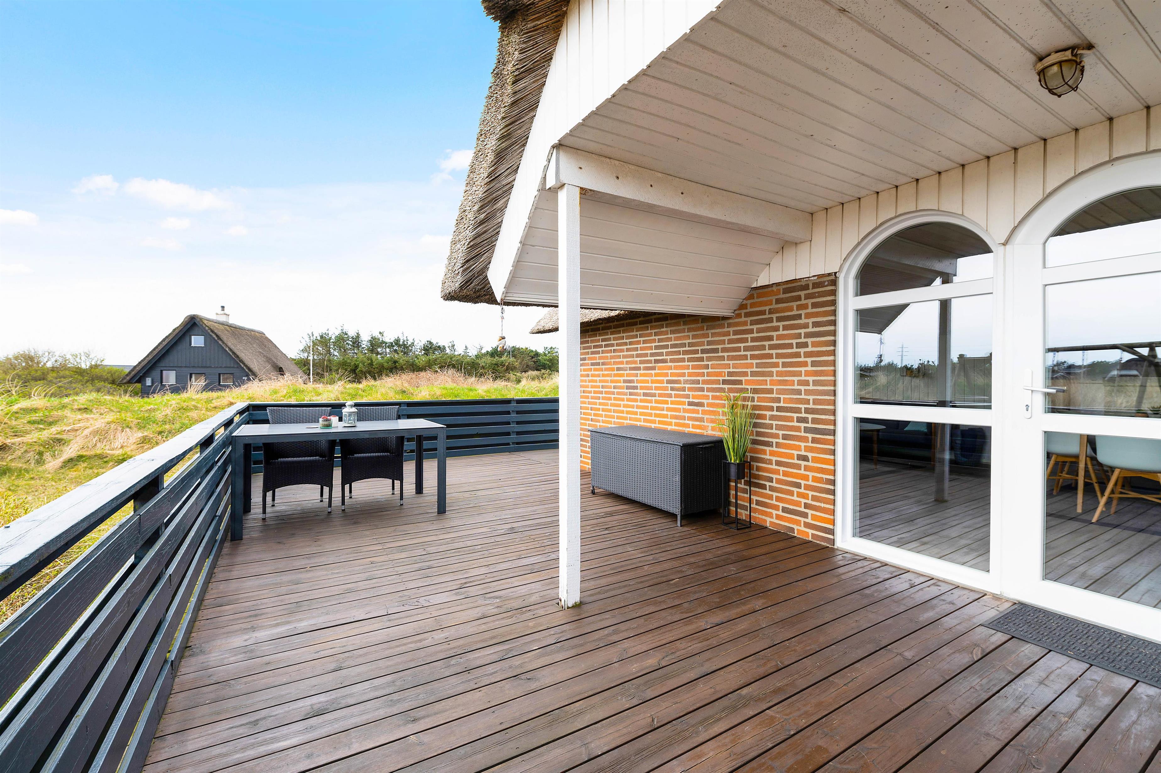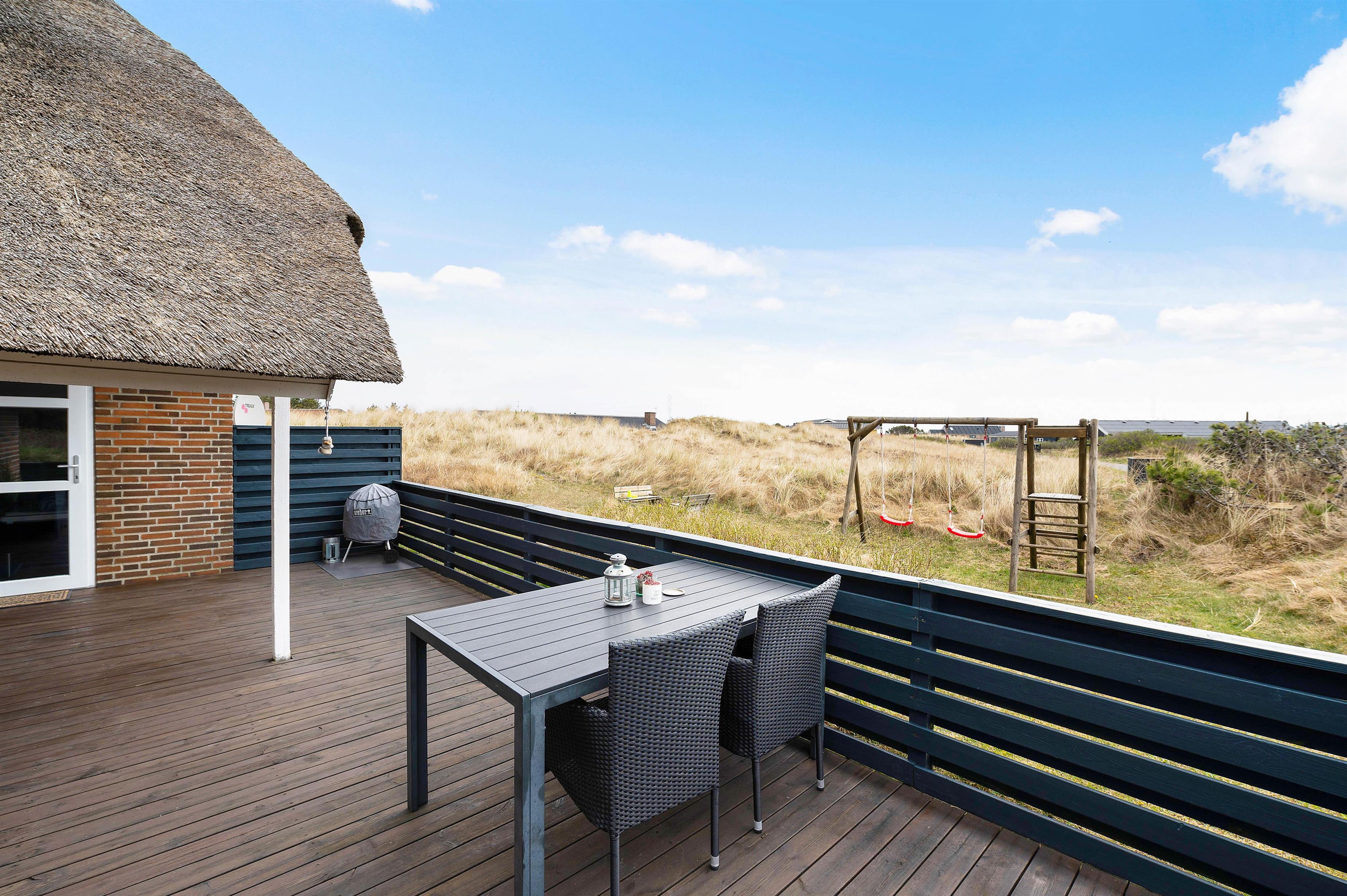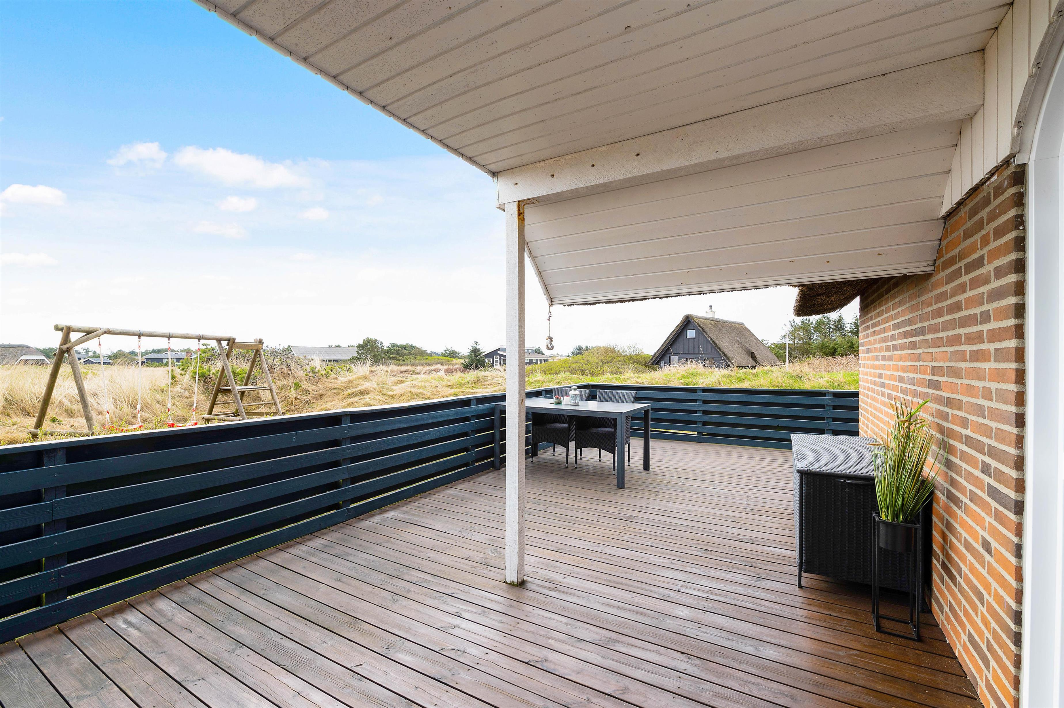 Imens børnene leger, kan de voksne slappe af på sommerhusets skønne store terrasse. Terrassen strækker sig næsten hele vejen rundt om feriehuset, så I altid har mulighed for at finde en solstråle. Derudover er terrassen delvist overdækket og lukket så I kan sidde i læ uden at være bange for, at hunden løber væk.
