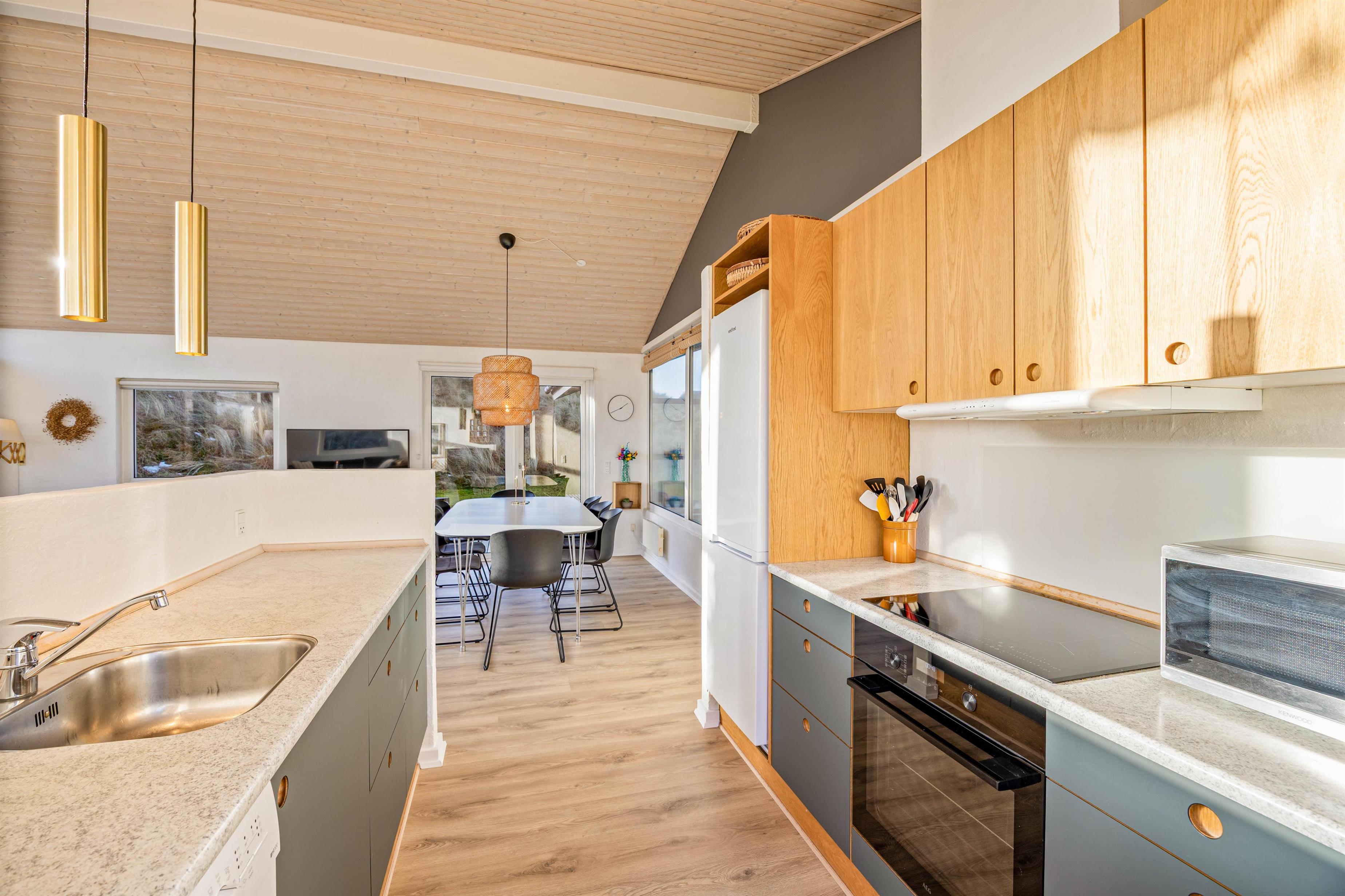 Indretningen i sommerhuset er hyggelig og lever fuldt op til den skandinaviske indretningsstil. Her er der fokus på flotte solide møbler i god kvalitet holdt i den smagfulde nordiske farvepalet af lyse, grå og sorte nuancer. Sommerhuset indeholder 4 gode værelser med hver 2 sengepladser samt 2 badeværelser. Der er derfor ingen grund til at frygte kø på badeværelset om morgenen. Køkkenet i huset er nyt fra 2022 og her er både opvaskemaskine, mikroovn samt køleskab med frostboks.