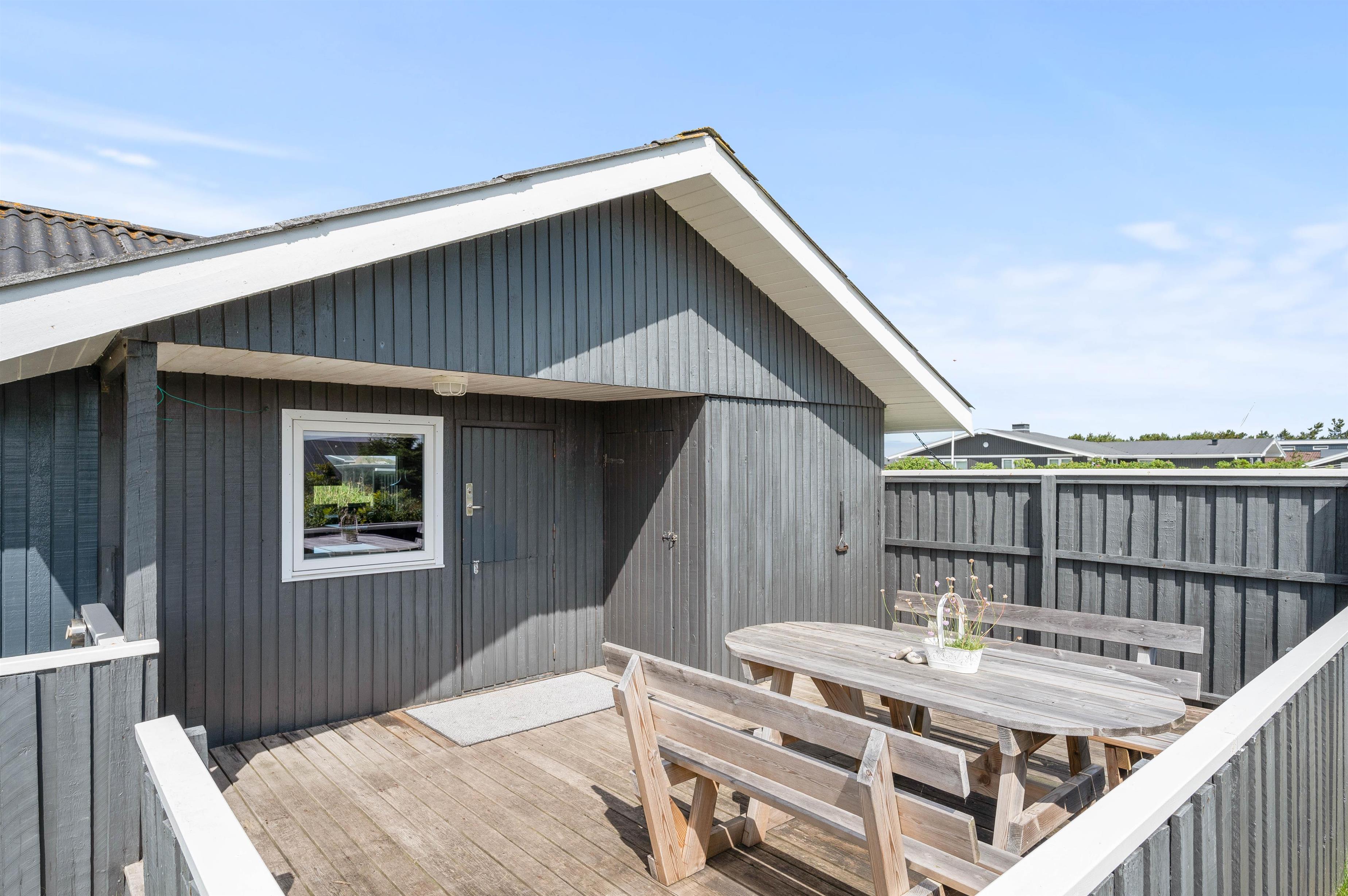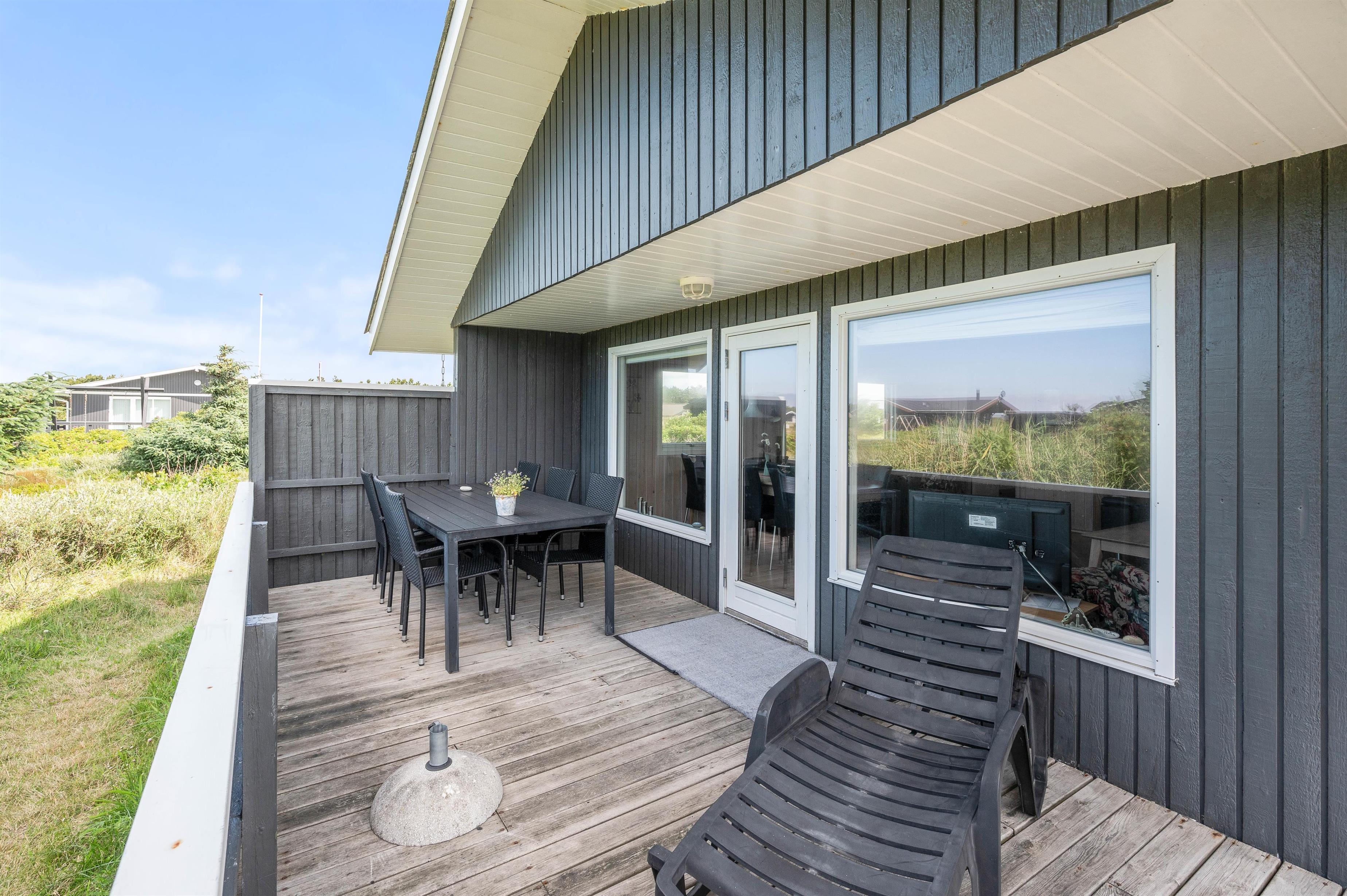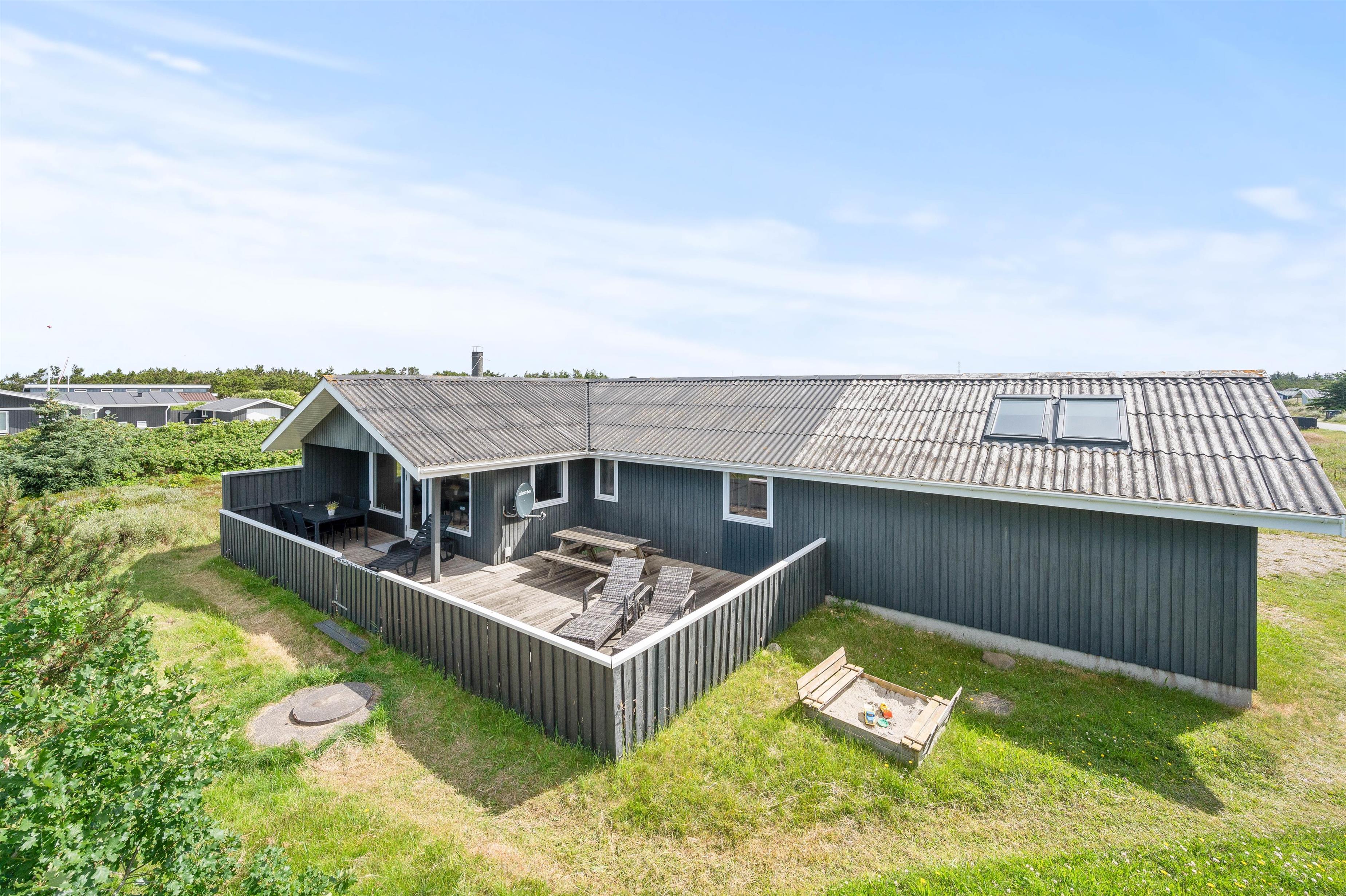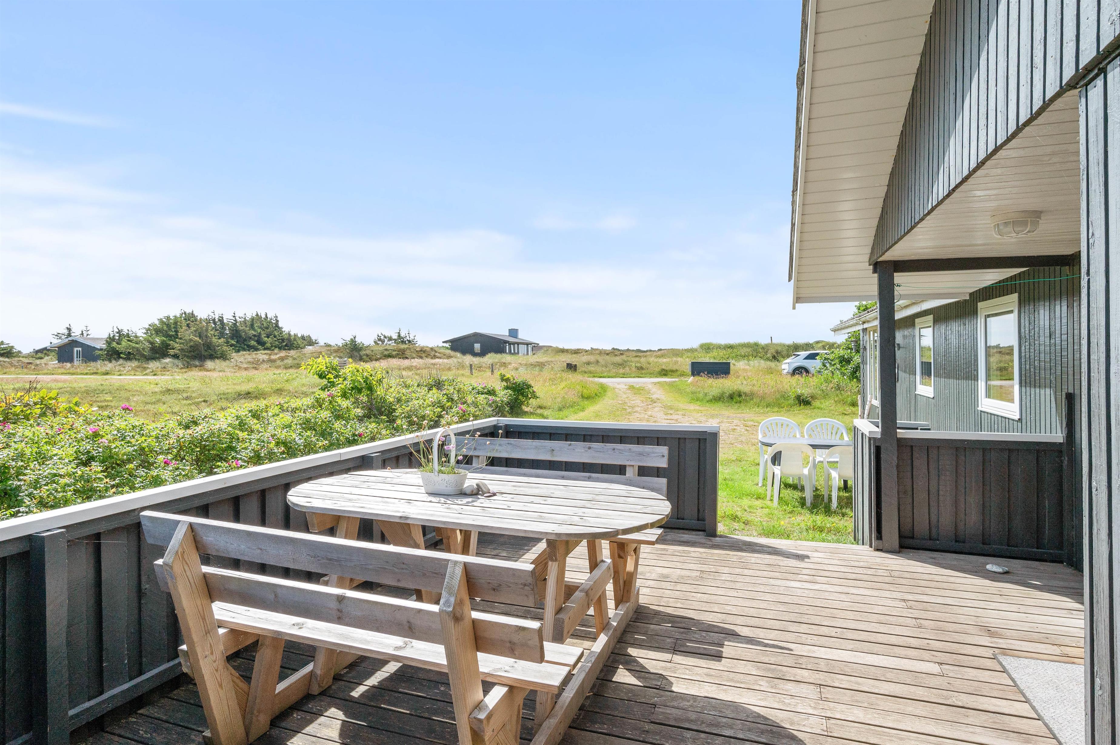 Alle familier med hund og mindre børn sætter stor pris på den ro det giver at holde ferie i et hus som dette, når der er en god lukket terrasse. Terrassen er også delvis afskærmet, så selv på dage med vind kan man sidde i nogenlunde læ. Der er et godt stisystem i området, hvilket er ideelt til trave- og cykelture. Turist og badebyen Søndervig ligger 5 km. mod nord. Her er atmosfæren rigtig ferieagtig, og der er gode restauranter og butikker.