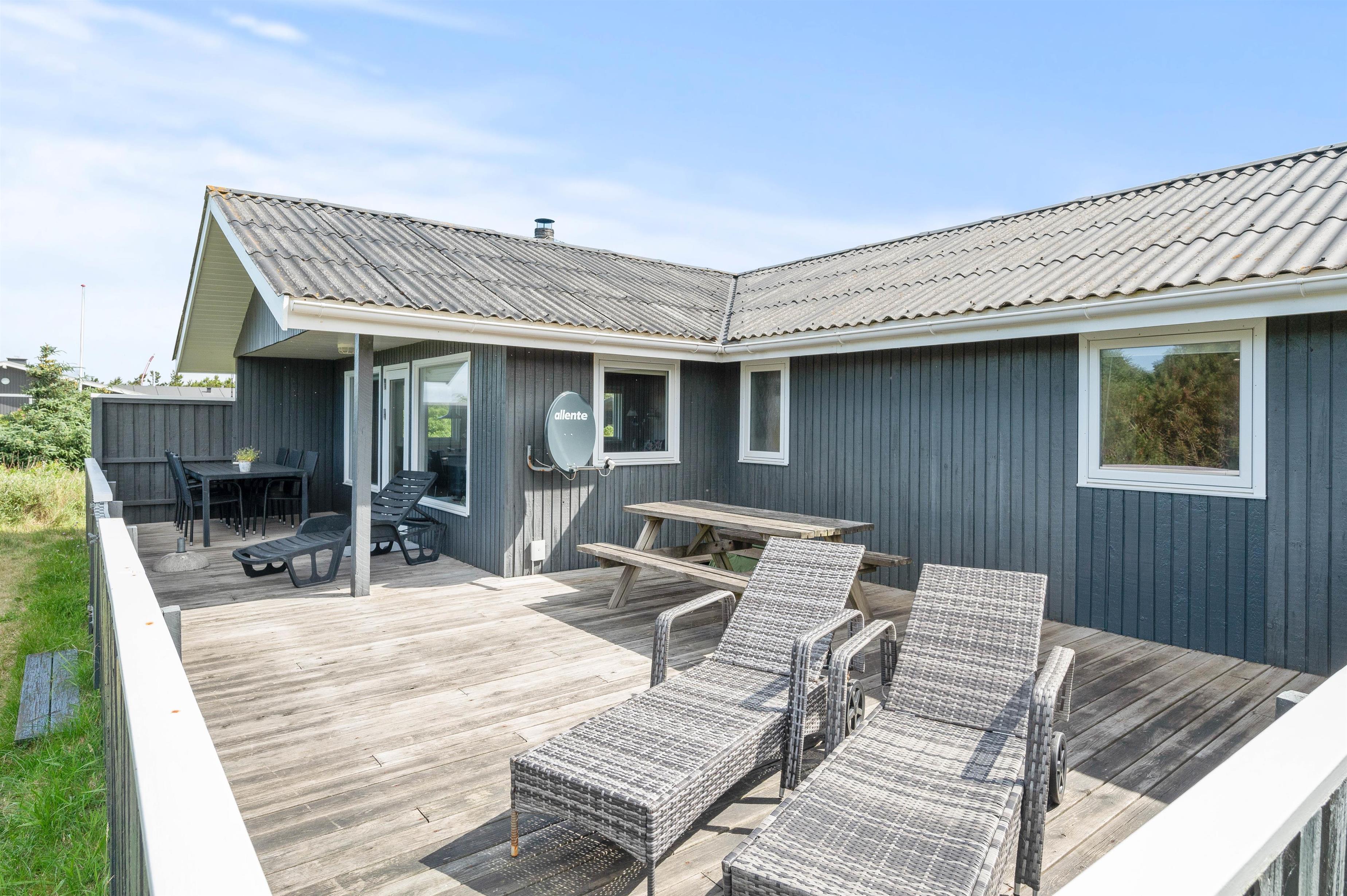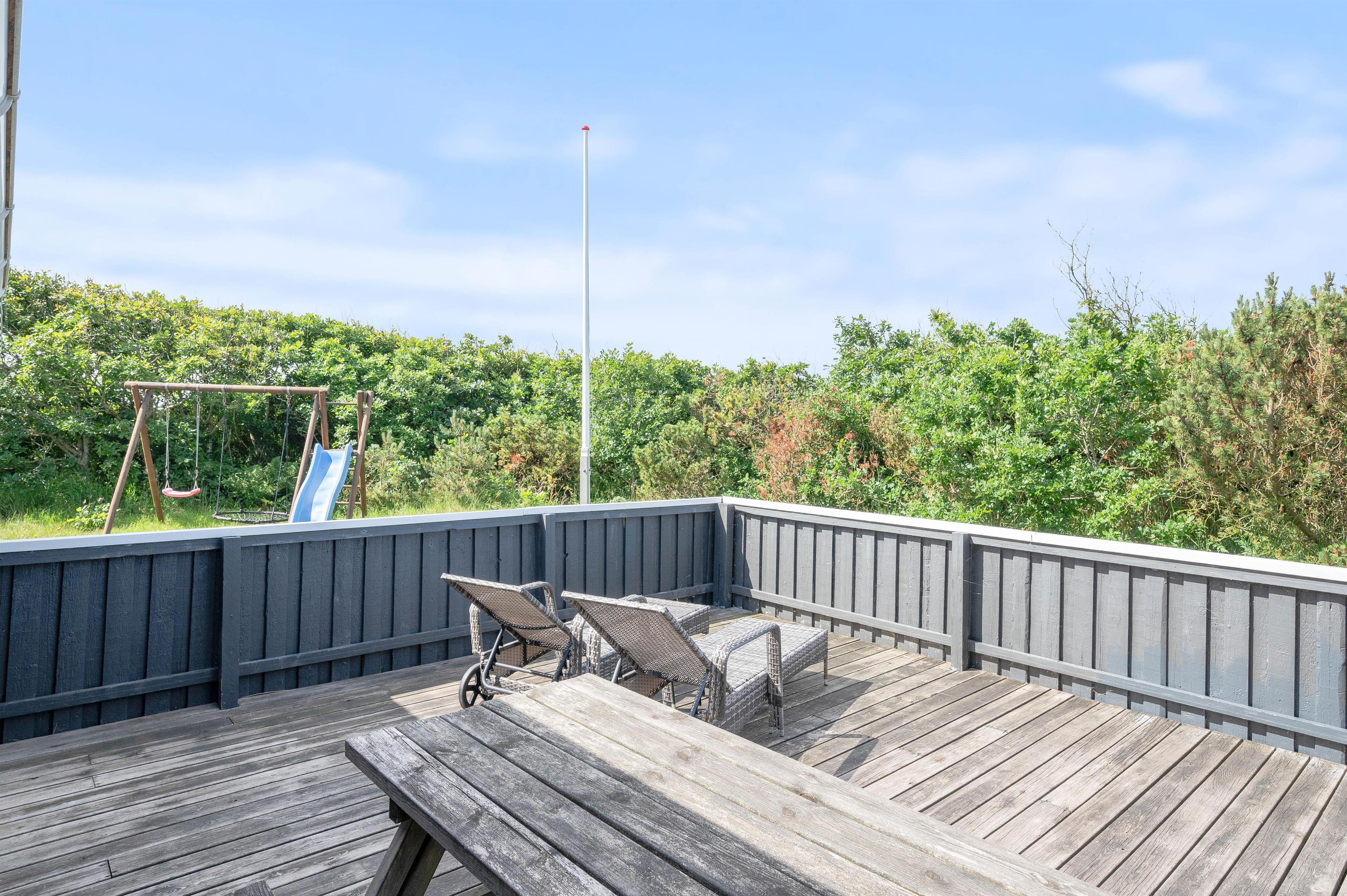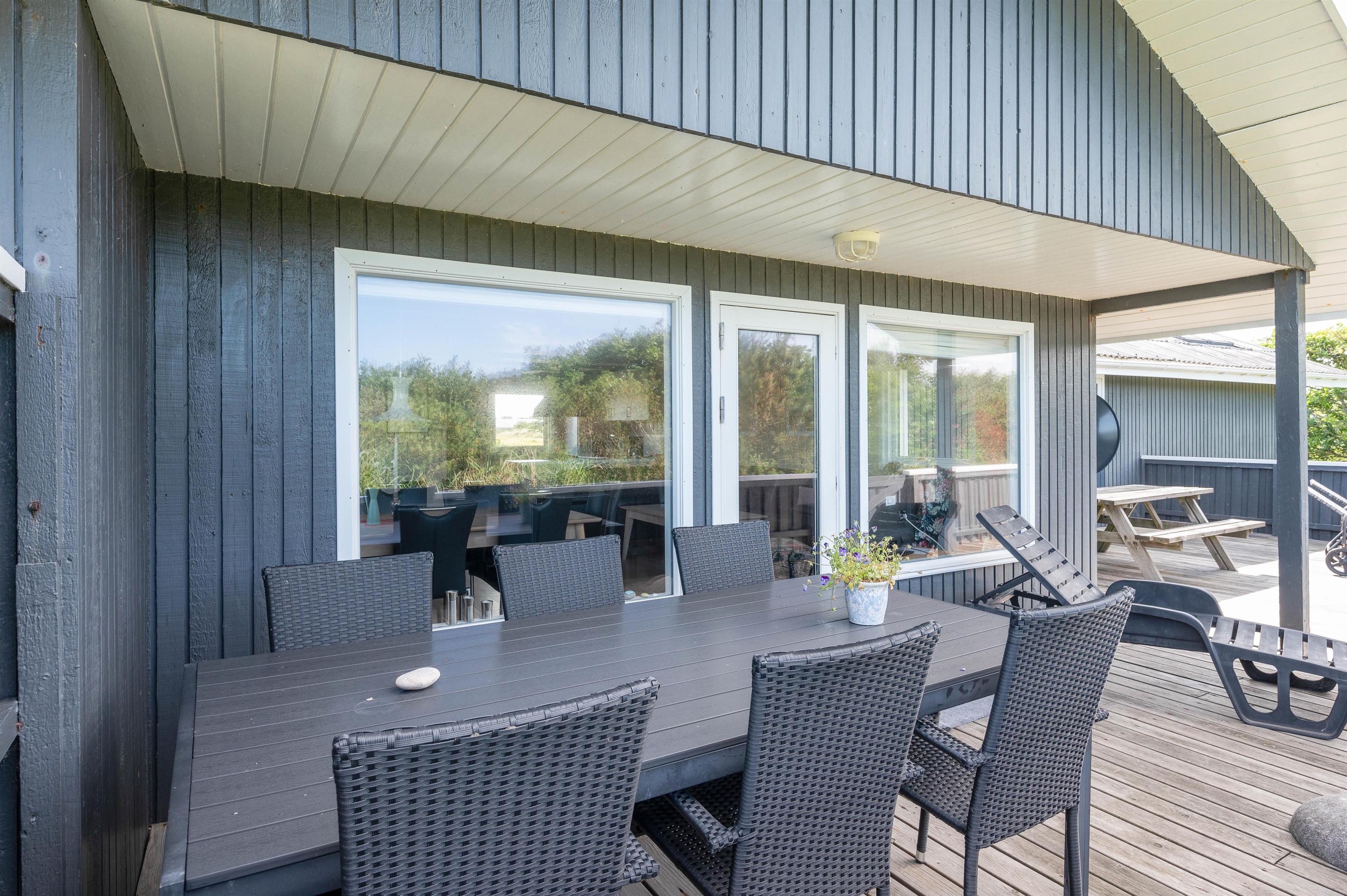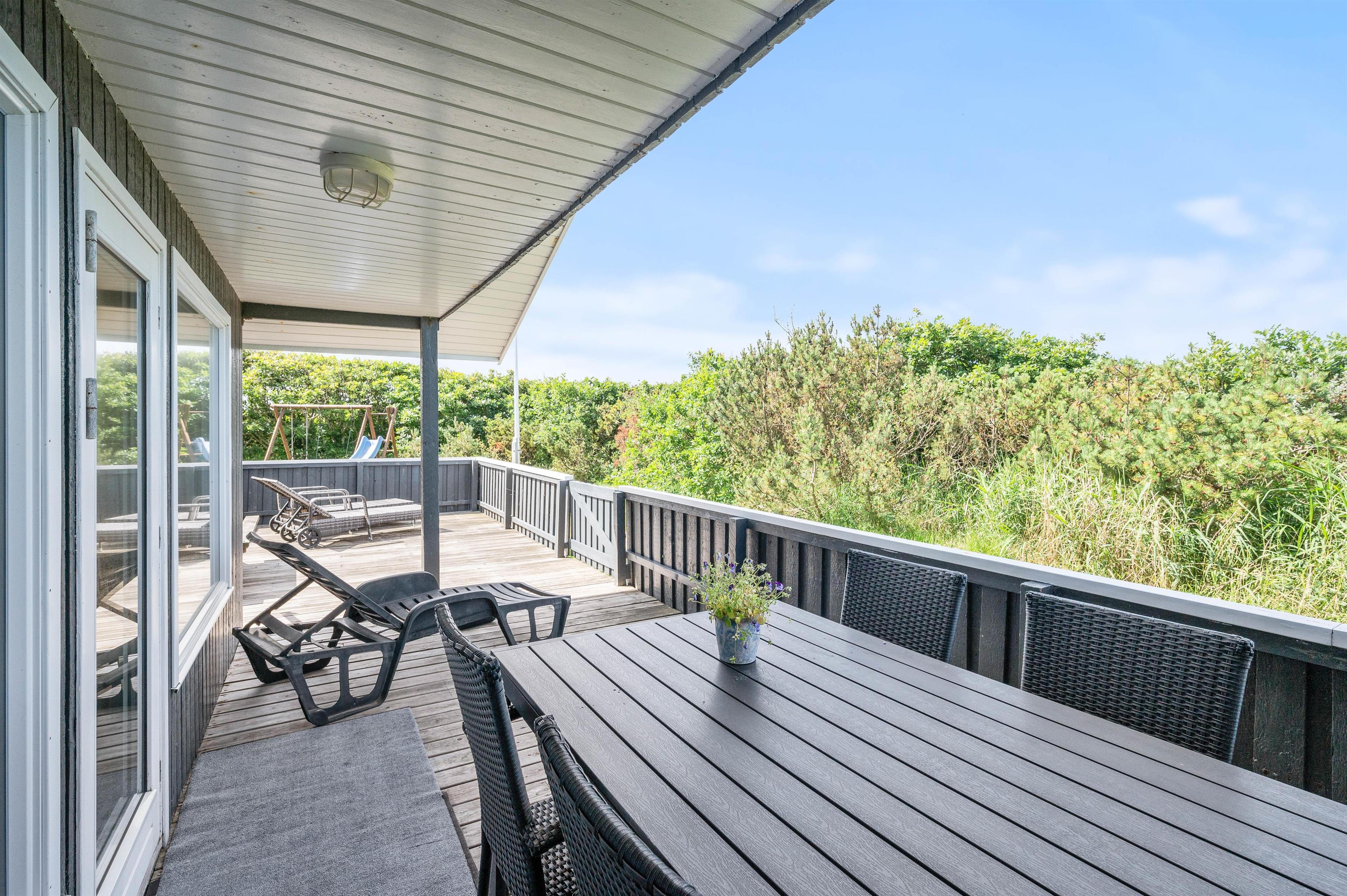 Alle familier med hund og mindre børn sætter stor pris på den ro det giver at holde ferie i et hus som dette, når der er en god lukket terrasse. Terrassen er også delvis afskærmet, så selv på dage med vind kan man sidde i nogenlunde læ. Der er et godt stisystem i området, hvilket er ideelt til trave- og cykelture. Turist og badebyen Søndervig ligger 5 km. mod nord. Her er atmosfæren rigtig ferieagtig, og der er gode restauranter og butikker.