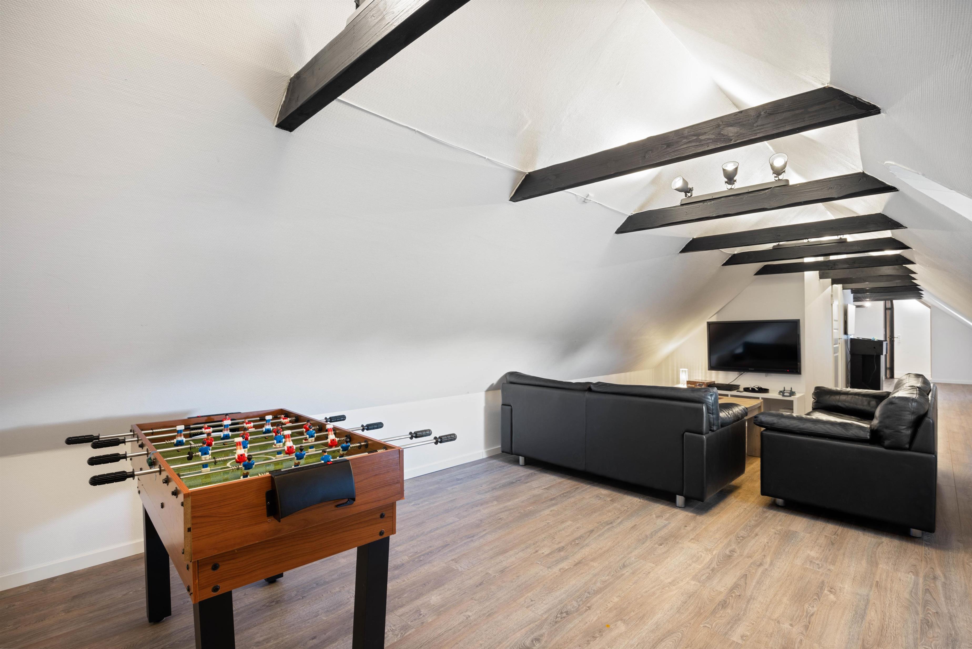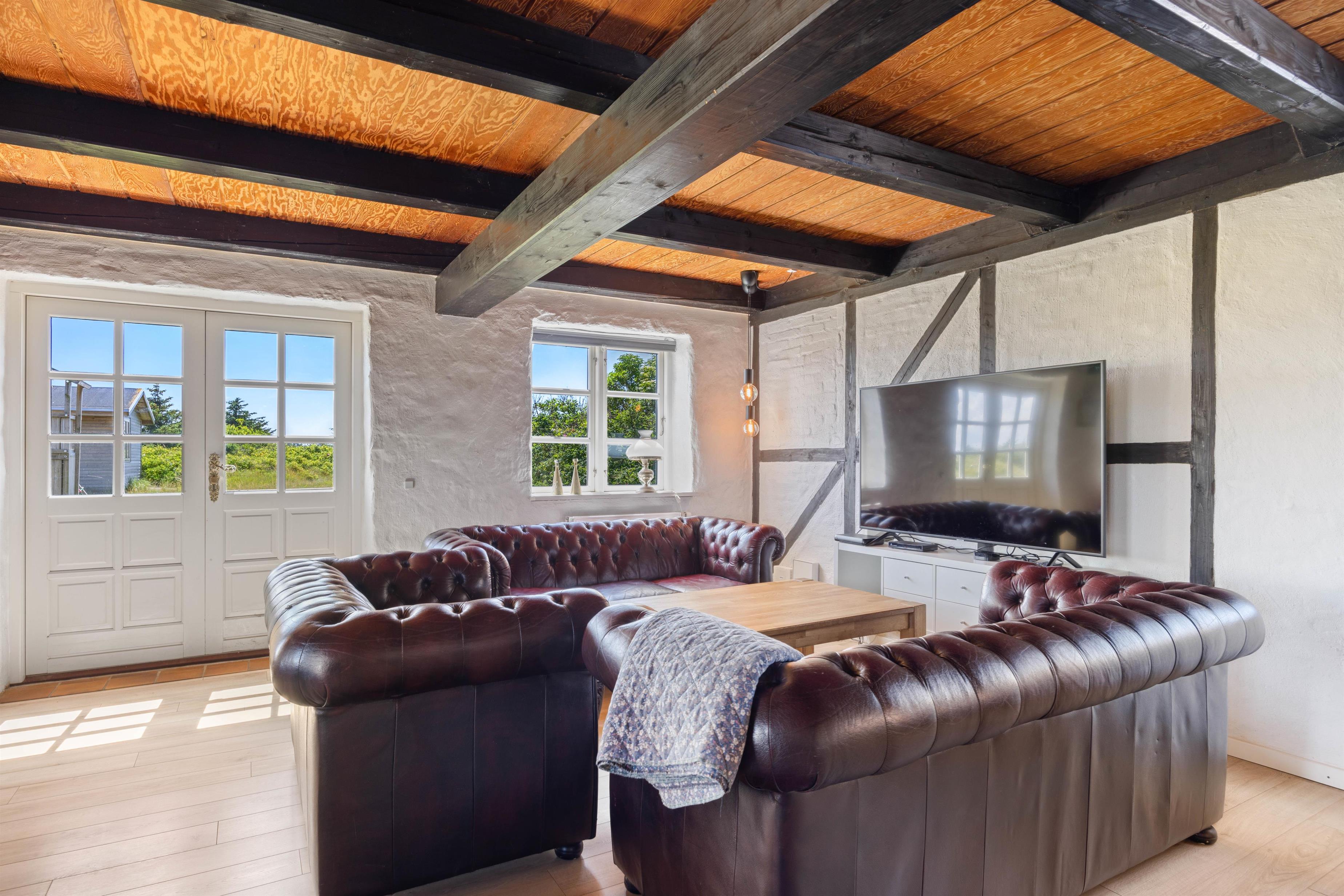 Indenfor er der lagt op til masser af hygge og samvær. Huset har både en brændeovn og en åben pejs, som skaber den helt rigtige stemning på de kølige aftener. Derudover er sommerhuset udstyret med en luft til luft varmepumpe, som sikrer en behagelig temperatur hele året rundt. Den store stue er indrettet med komfortable møbler og et stort tv, så I kan slappe af sammen efter en dag fyldt med aktiviteter.