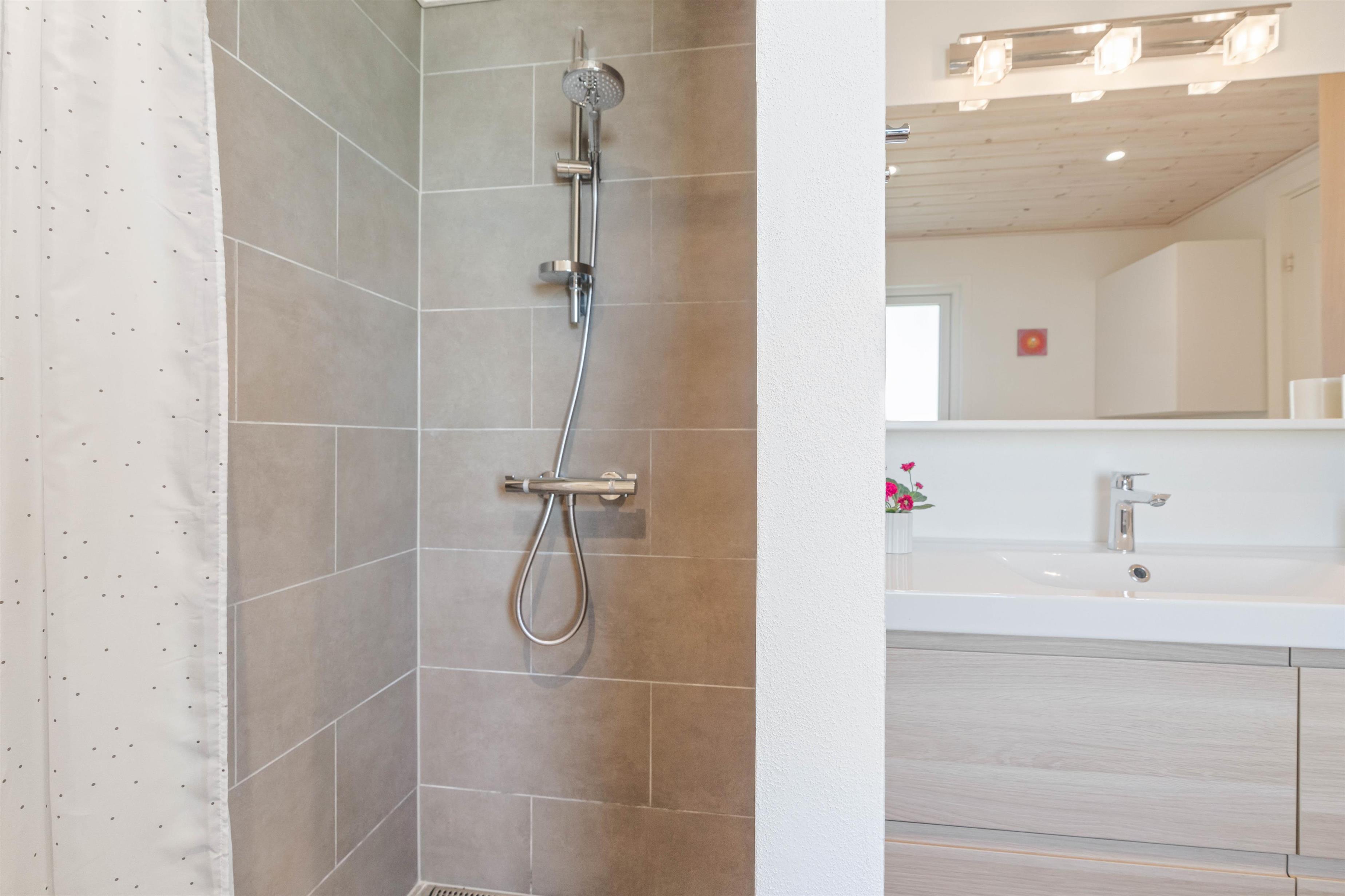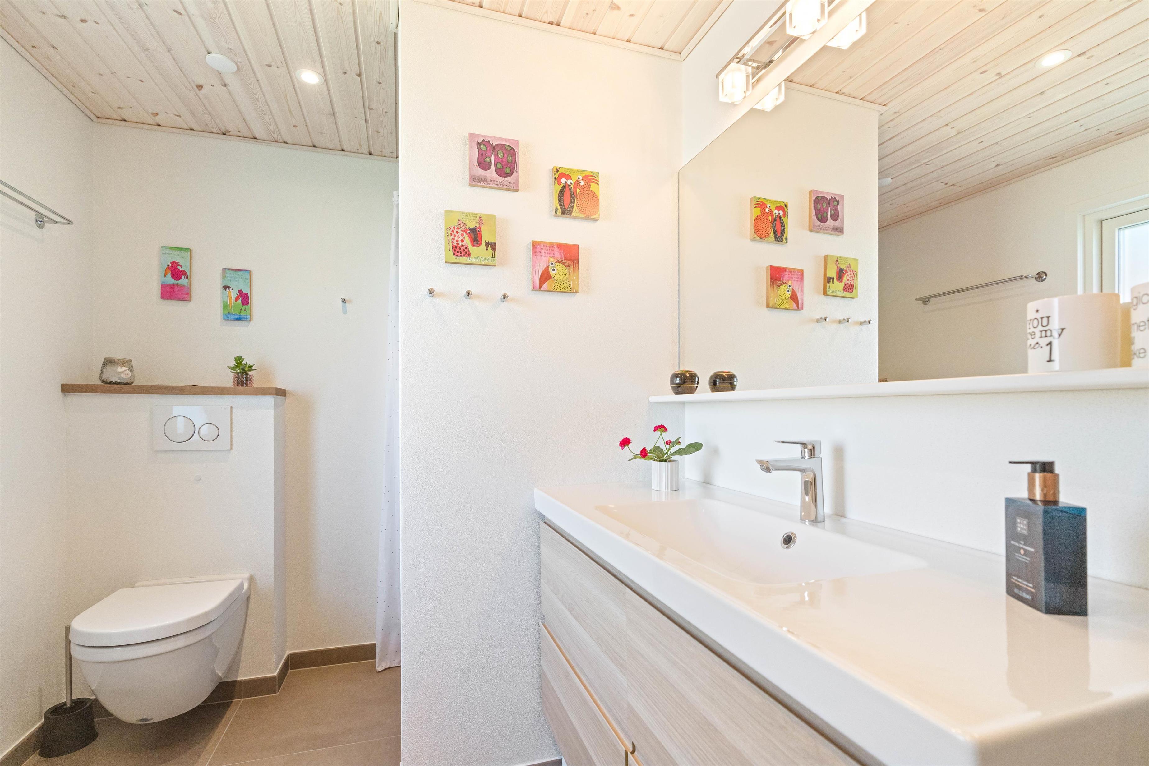 Jeres feriemorgener starter helt uden kø, da I både har et badeværelse og et gæstetoilet i sommerhuset. Desuden er der gulvvarme på badeværelset, så I ikke fryser tæerne fra morgenstunden.