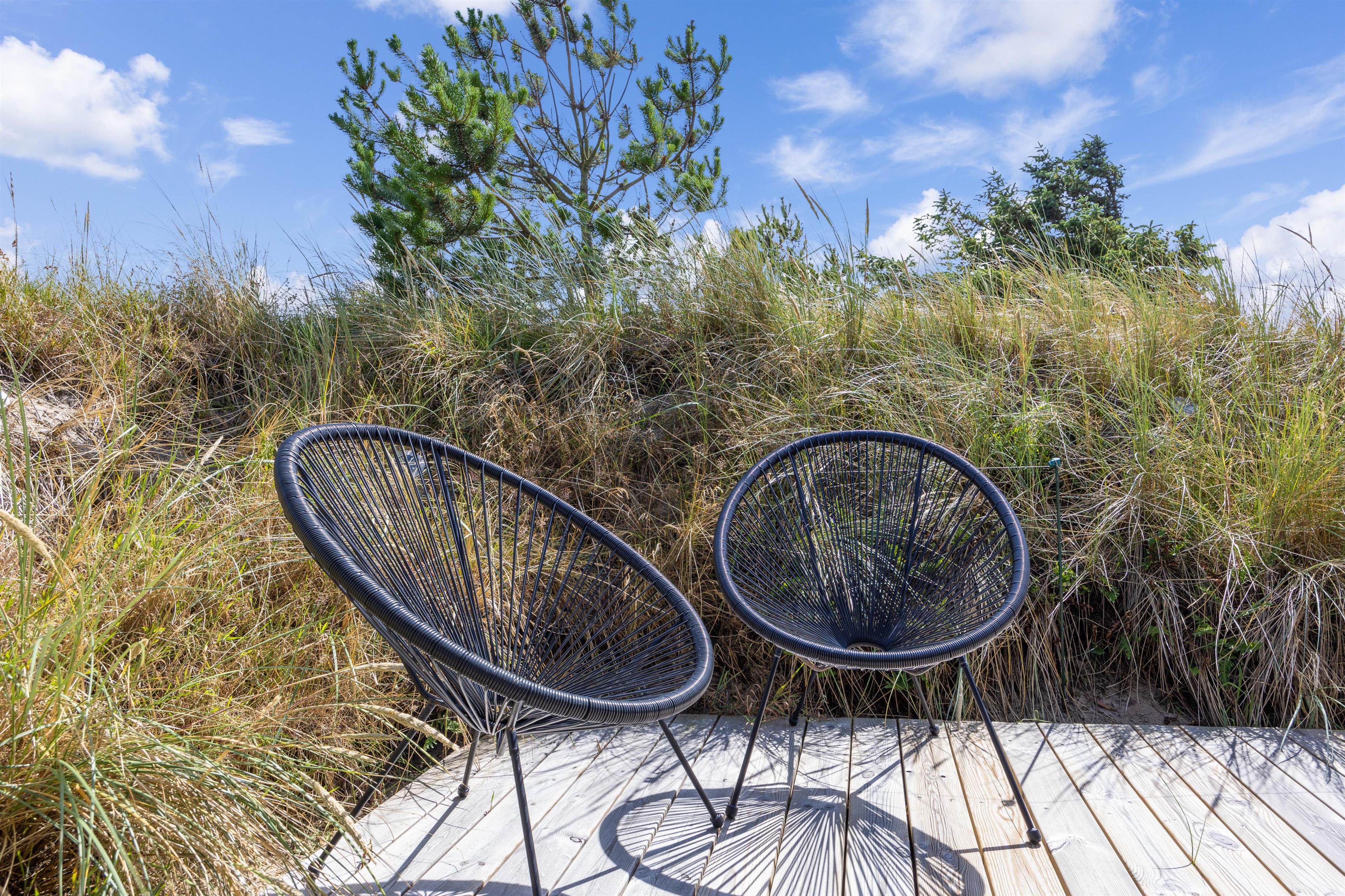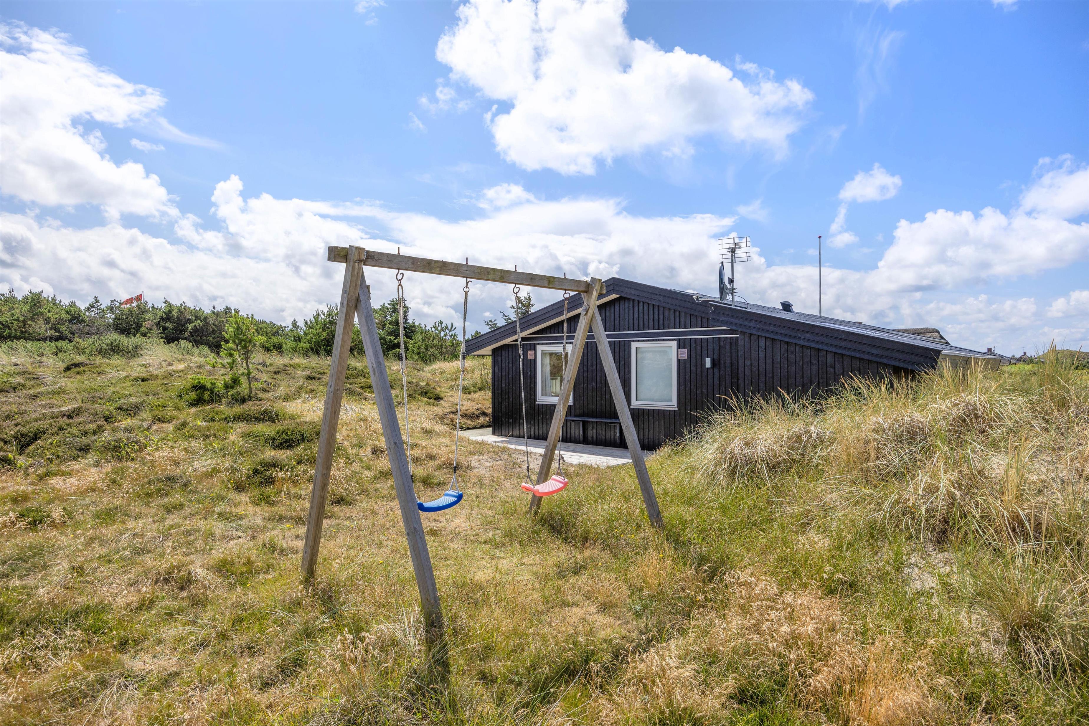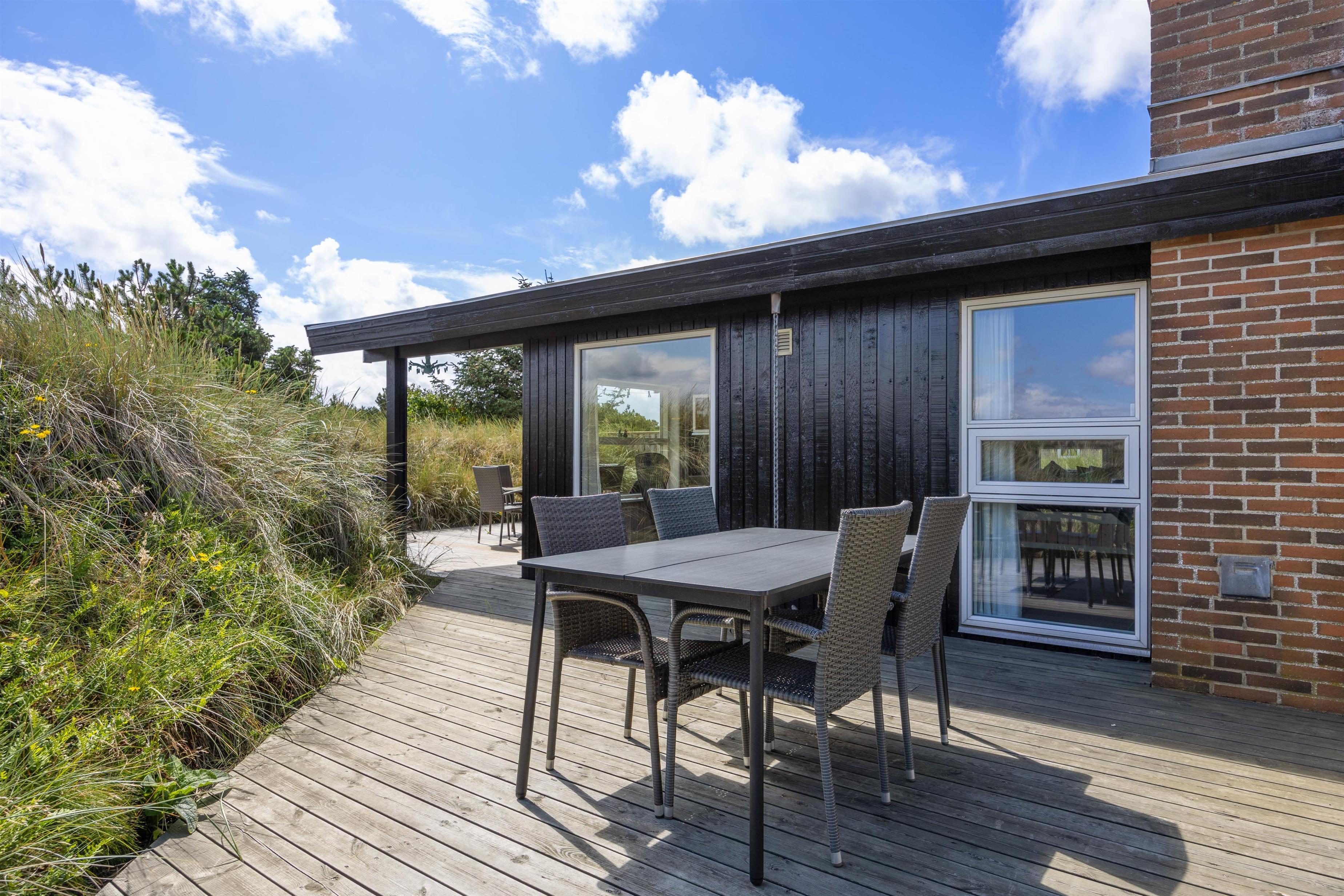 På sommerhusets udeområde venter jer en skøn terrasse, der er delvist overdækket og afskærmet. Her står der både havemøbler og liggestole til rådighed for jer, som I kan finde jer til rette i, mens børnene kan lege i sandkassen eller gynge på gyngestativet.