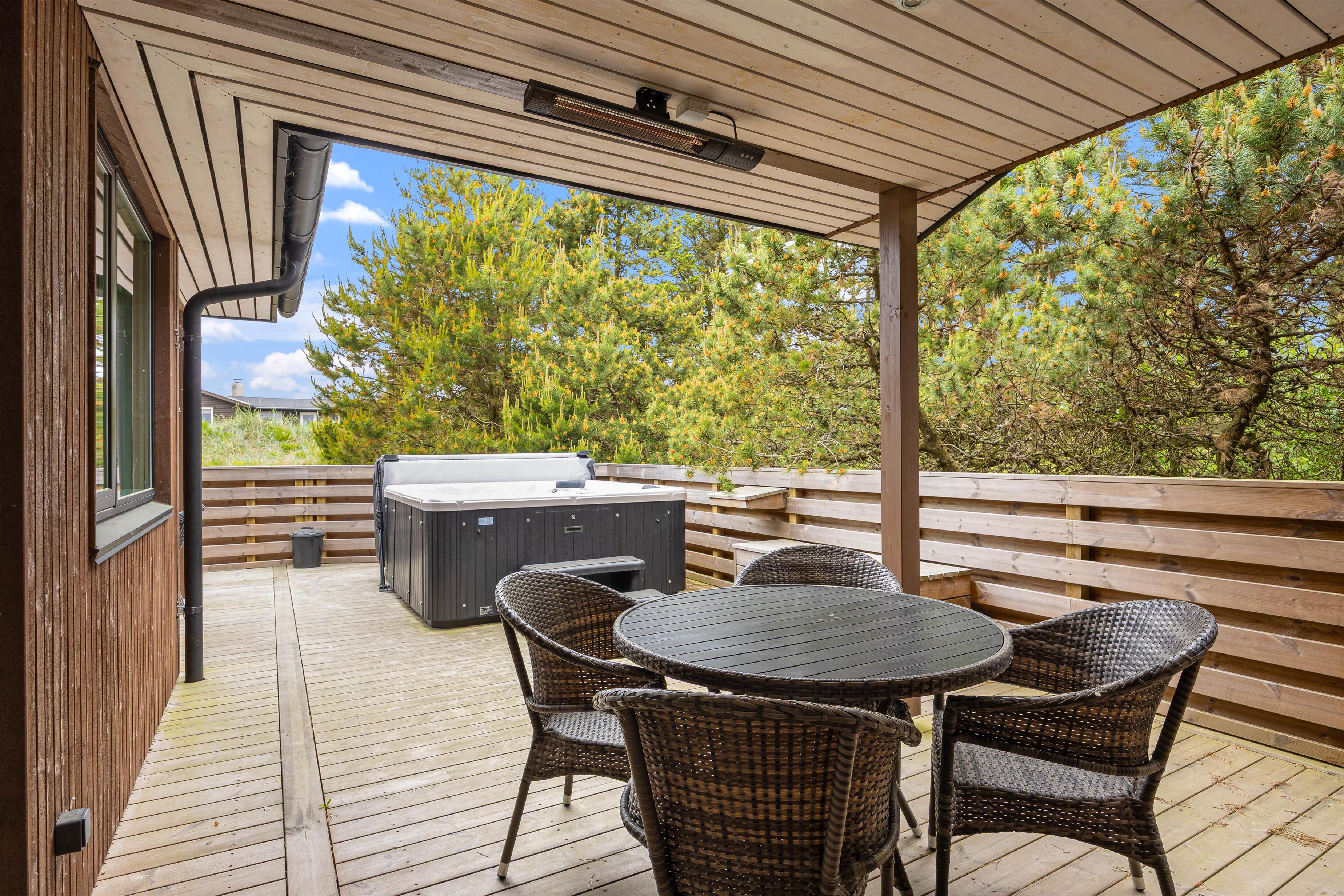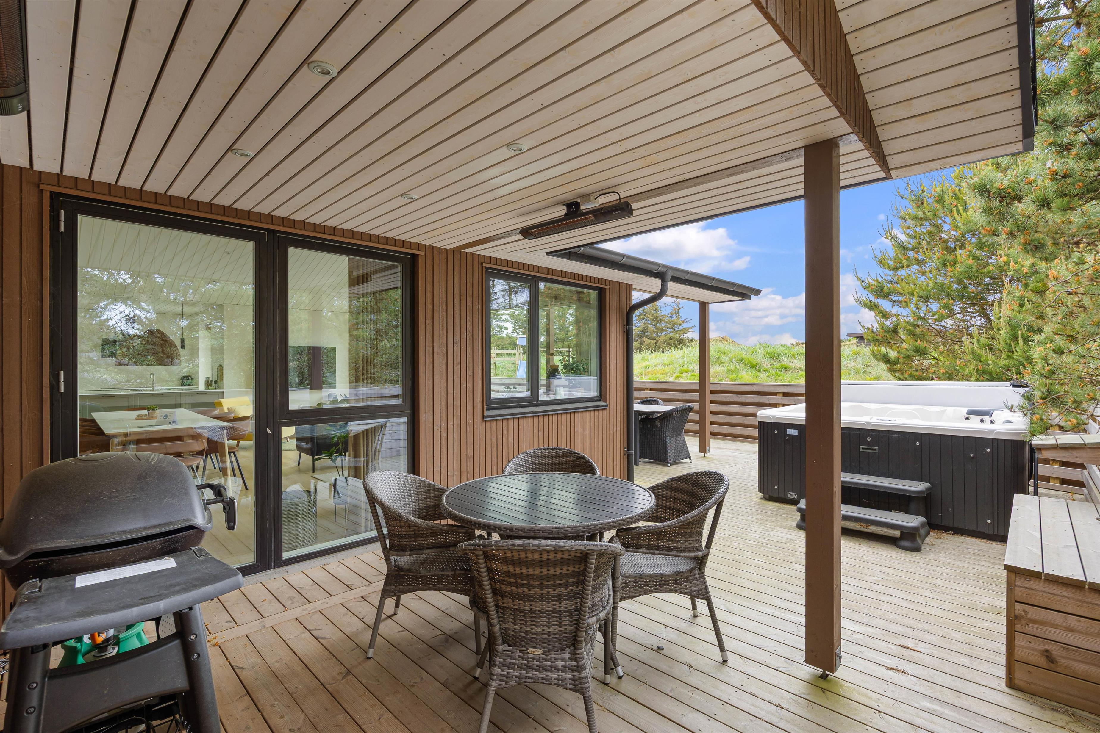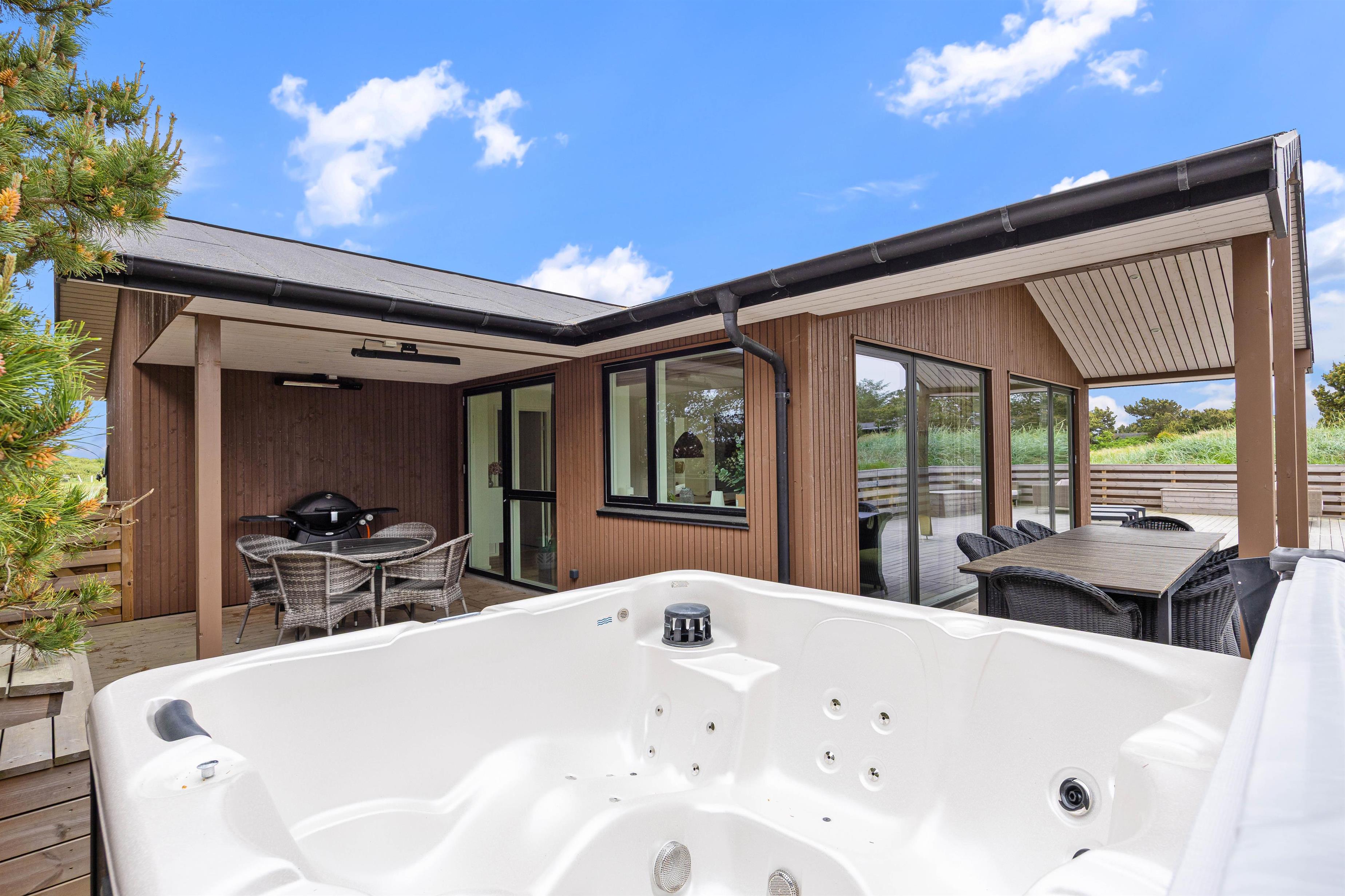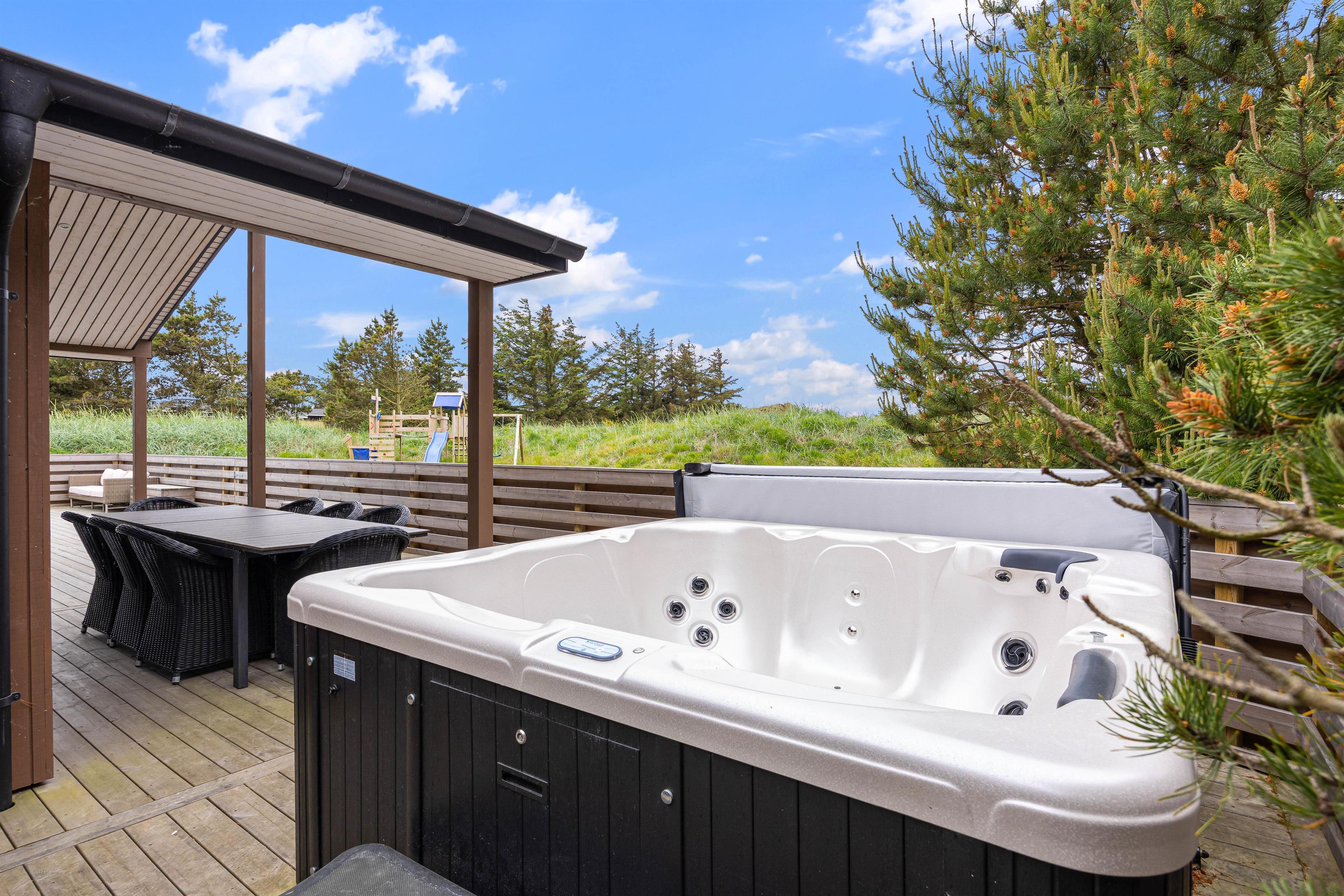 Sommerhuset er beliggende på en natur- og klitgrund. Her finder I et dejligt udendørs spabad på den lukkede terrasse, hvor I kan slappe af og nyde den friske luft sammen med et glas vin – det perfekte feriemiljø. På terrassen er der også en gasgrill, hvor aftensmaden kan tilberedes, mens I nyder den afslappede stemning i havemøblerne. For børnene er der en sandkasse og et gyngestativ til underholdning, mens aftensmaden bliver klar.