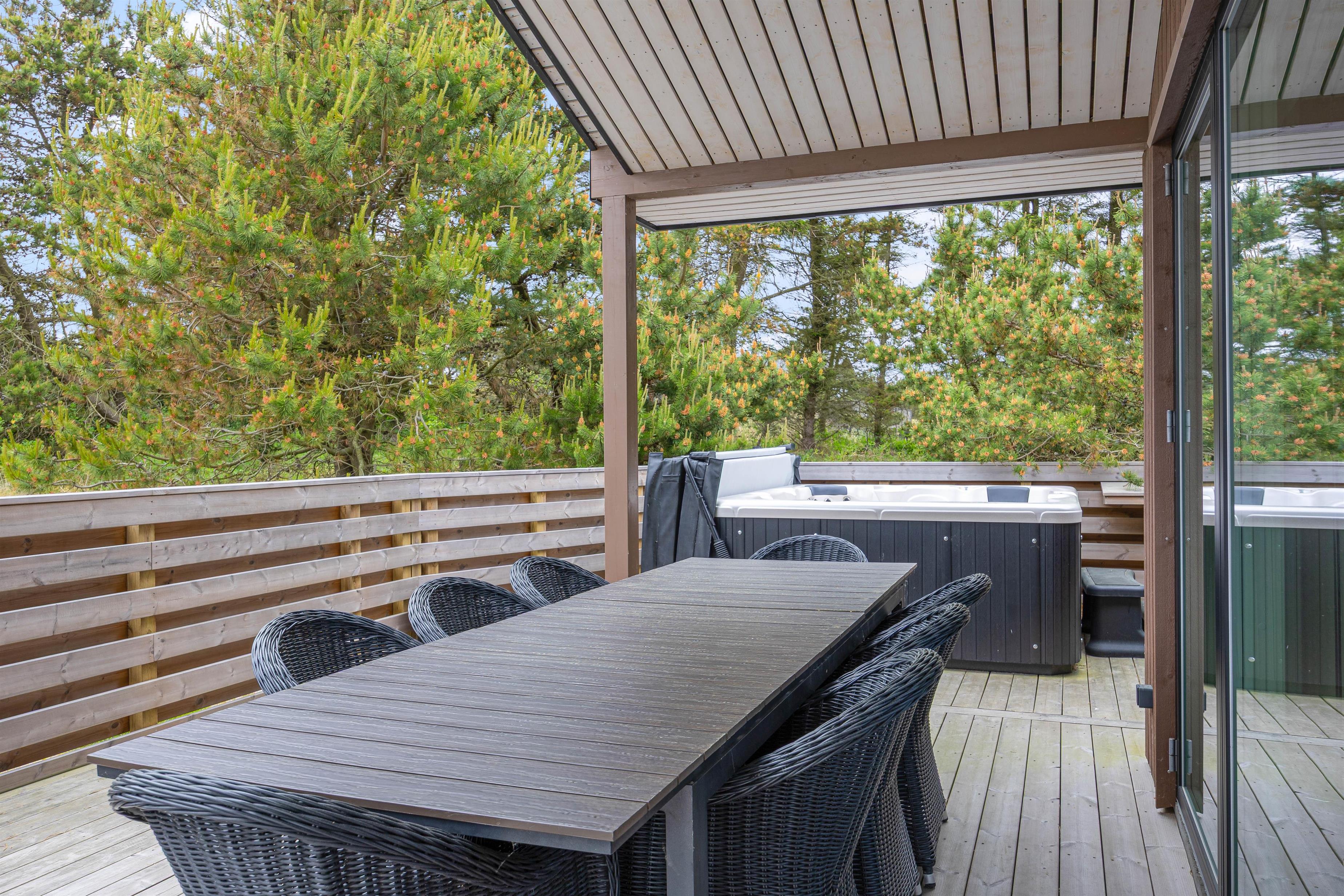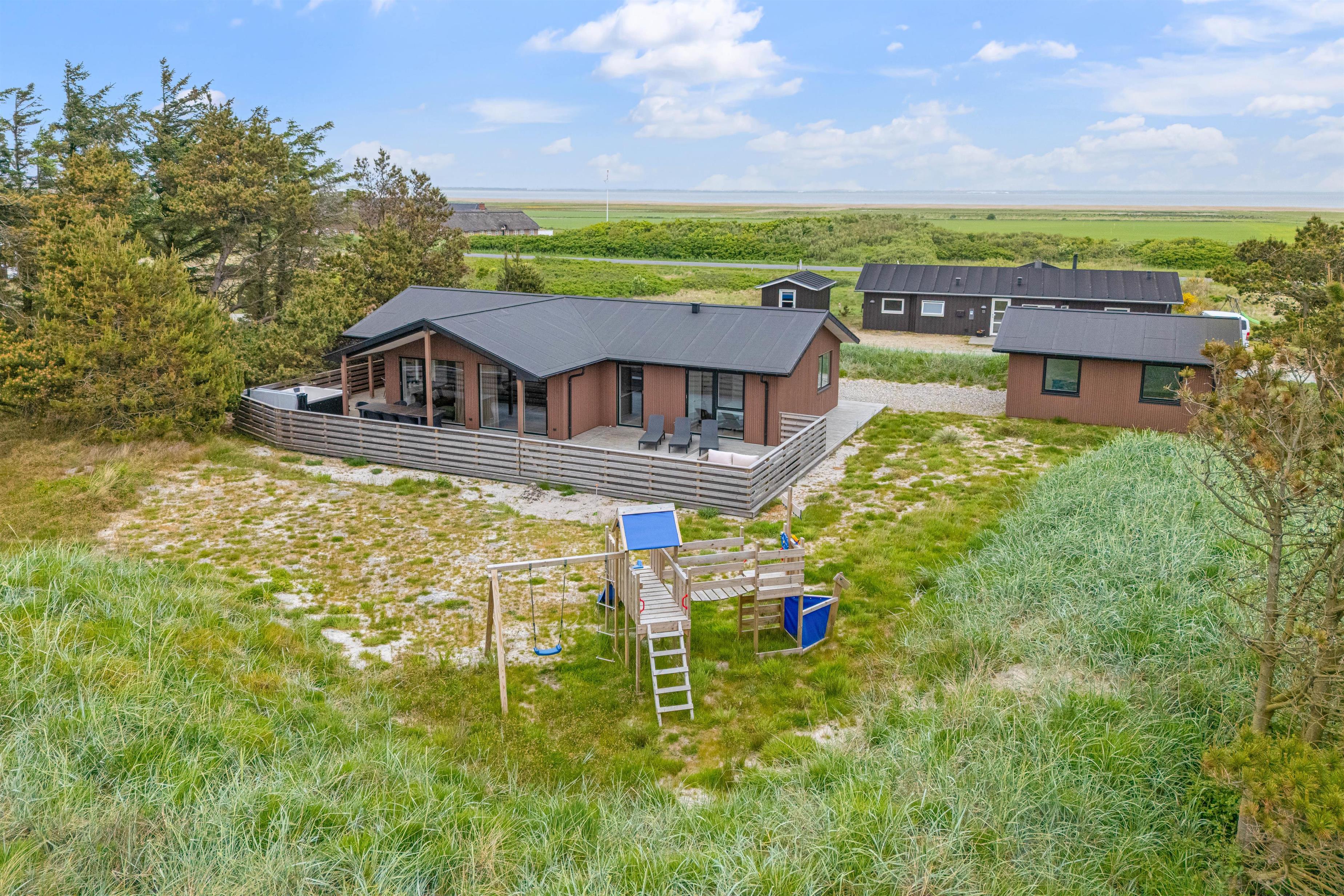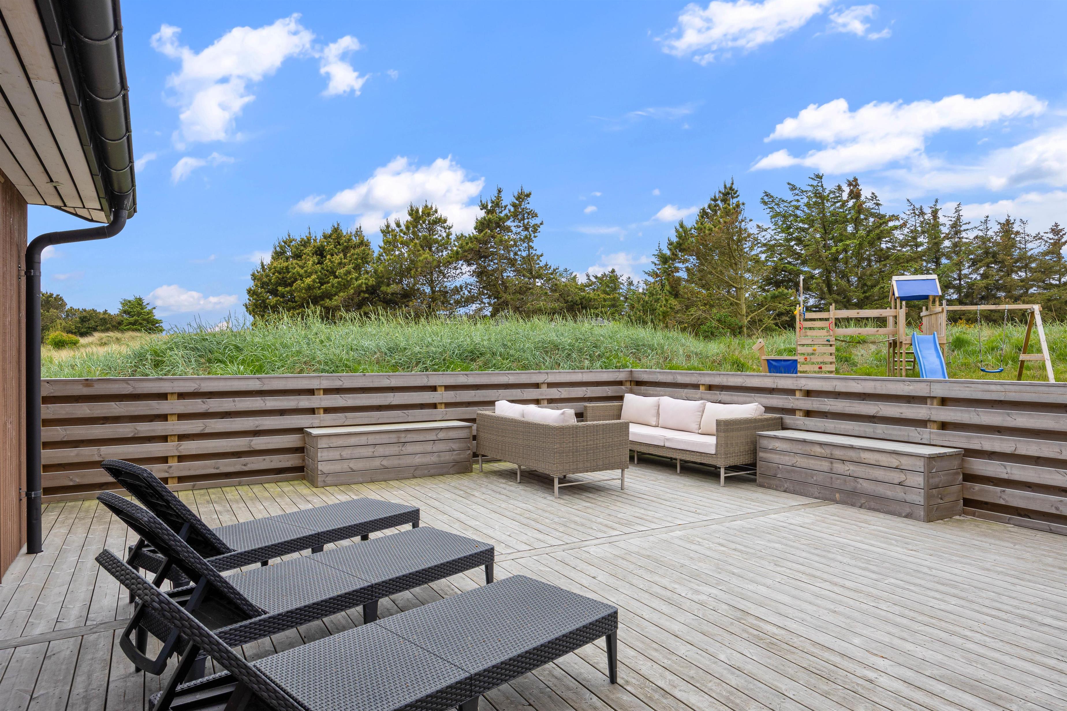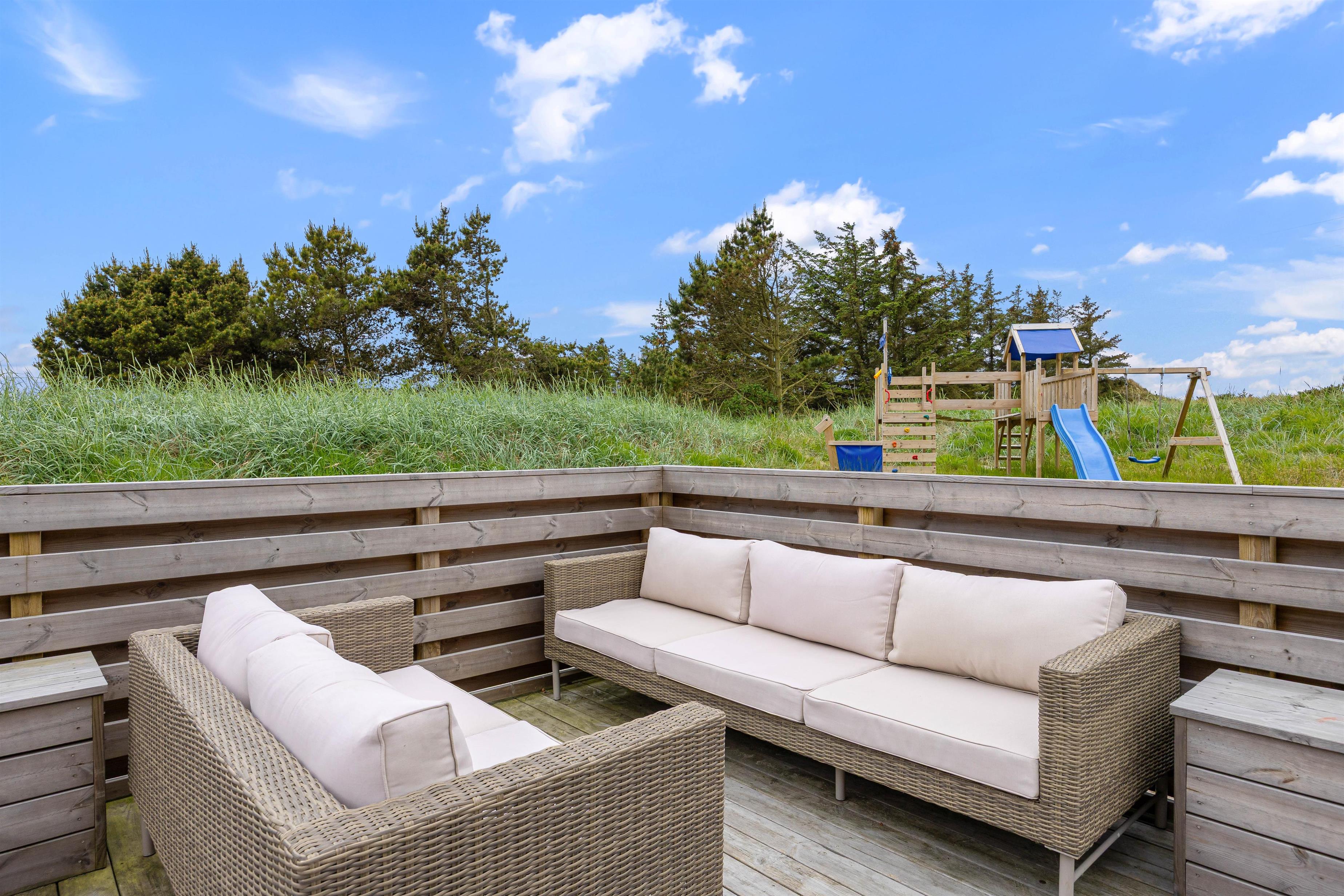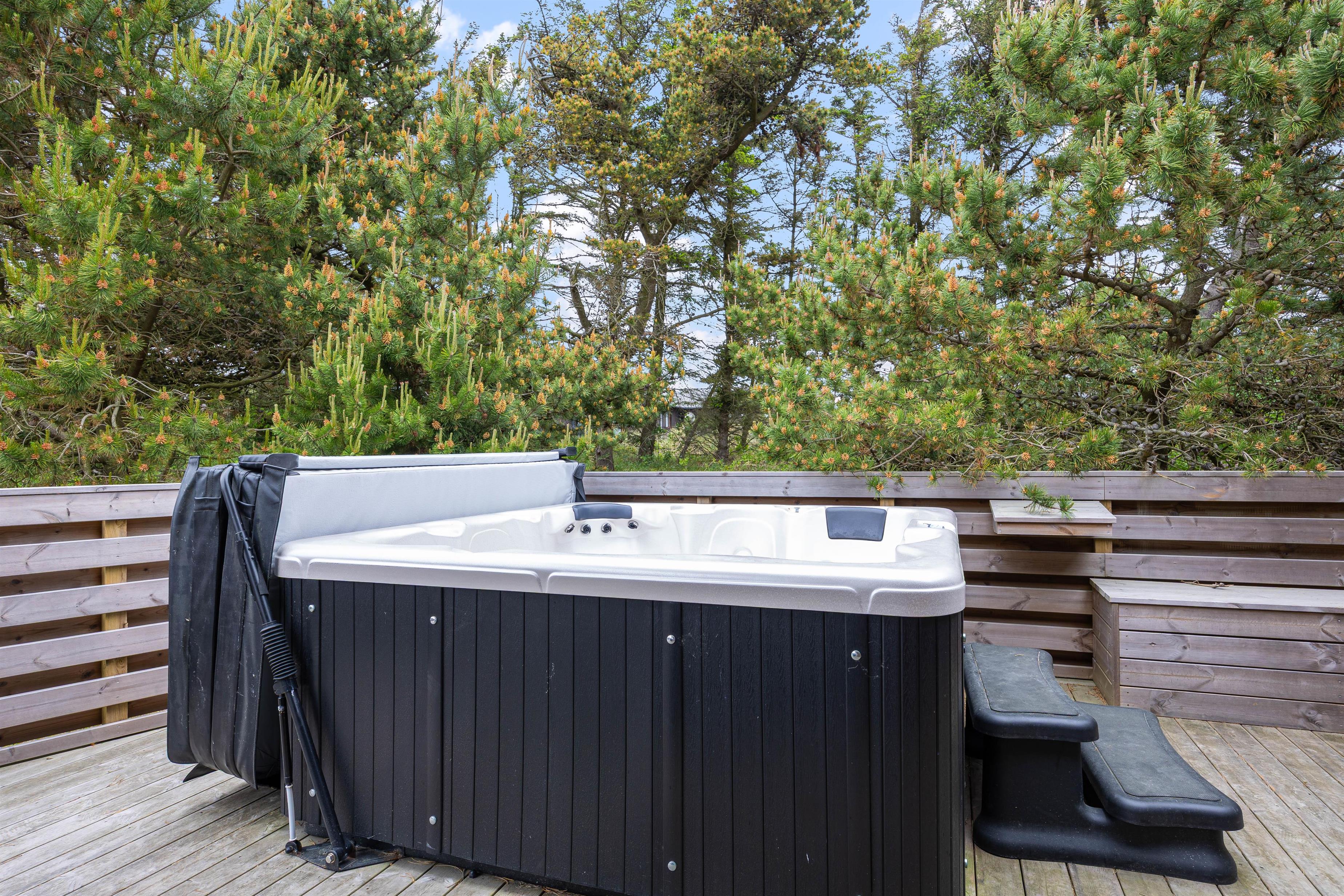 Sommerhuset er beliggende på en natur- og klitgrund. Her finder I et dejligt udendørs spabad på den lukkede terrasse, hvor I kan slappe af og nyde den friske luft sammen med et glas vin – det perfekte feriemiljø. På terrassen er der også en gasgrill, hvor aftensmaden kan tilberedes, mens I nyder den afslappede stemning i havemøblerne. For børnene er der en sandkasse og et gyngestativ til underholdning, mens aftensmaden bliver klar.