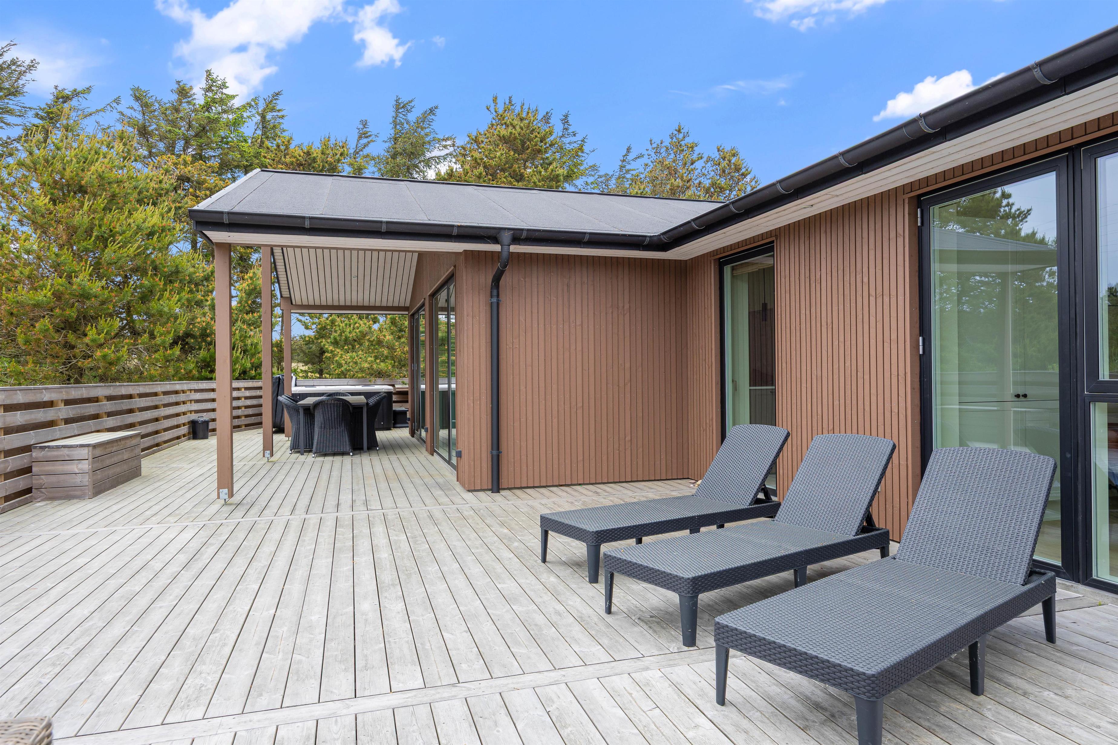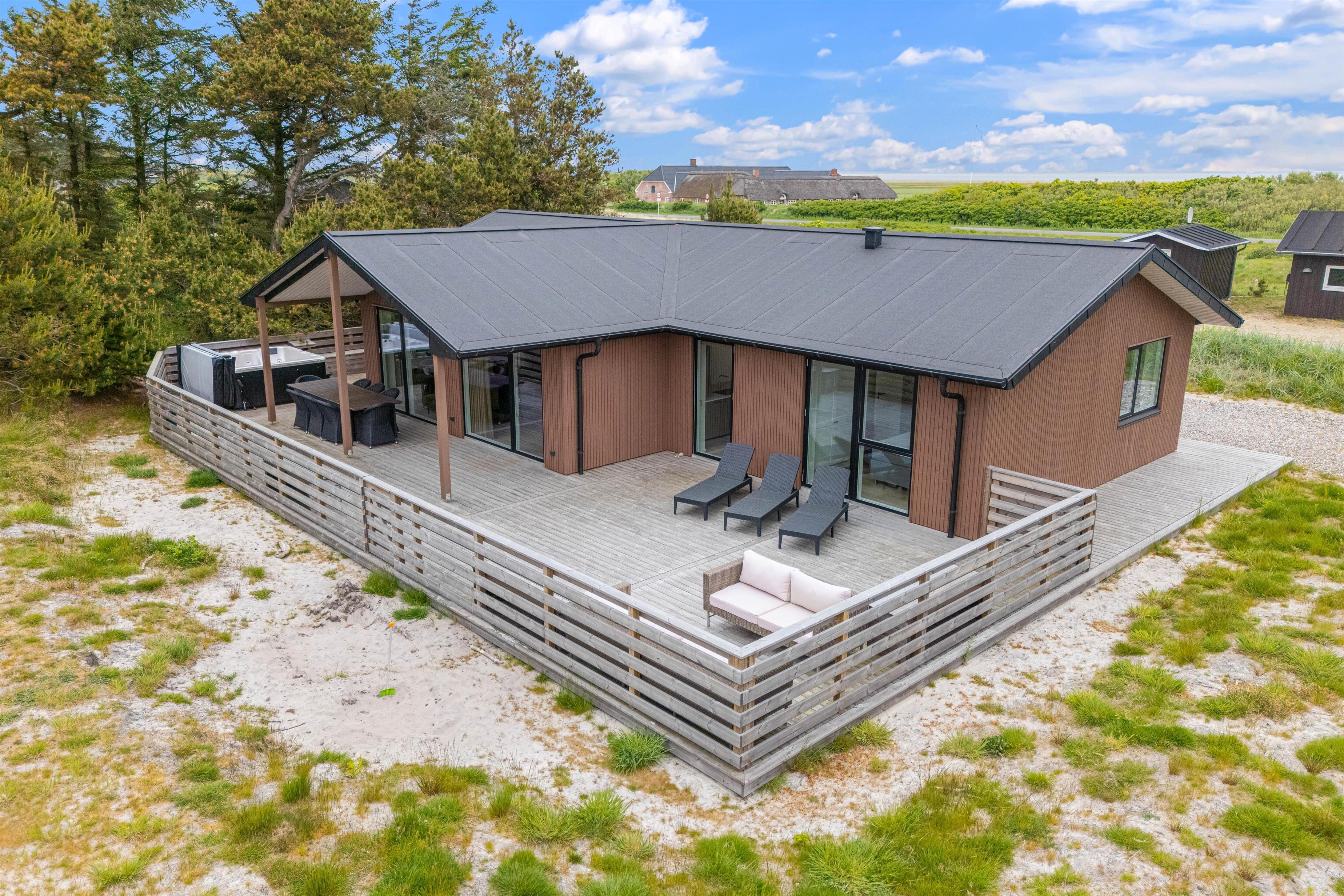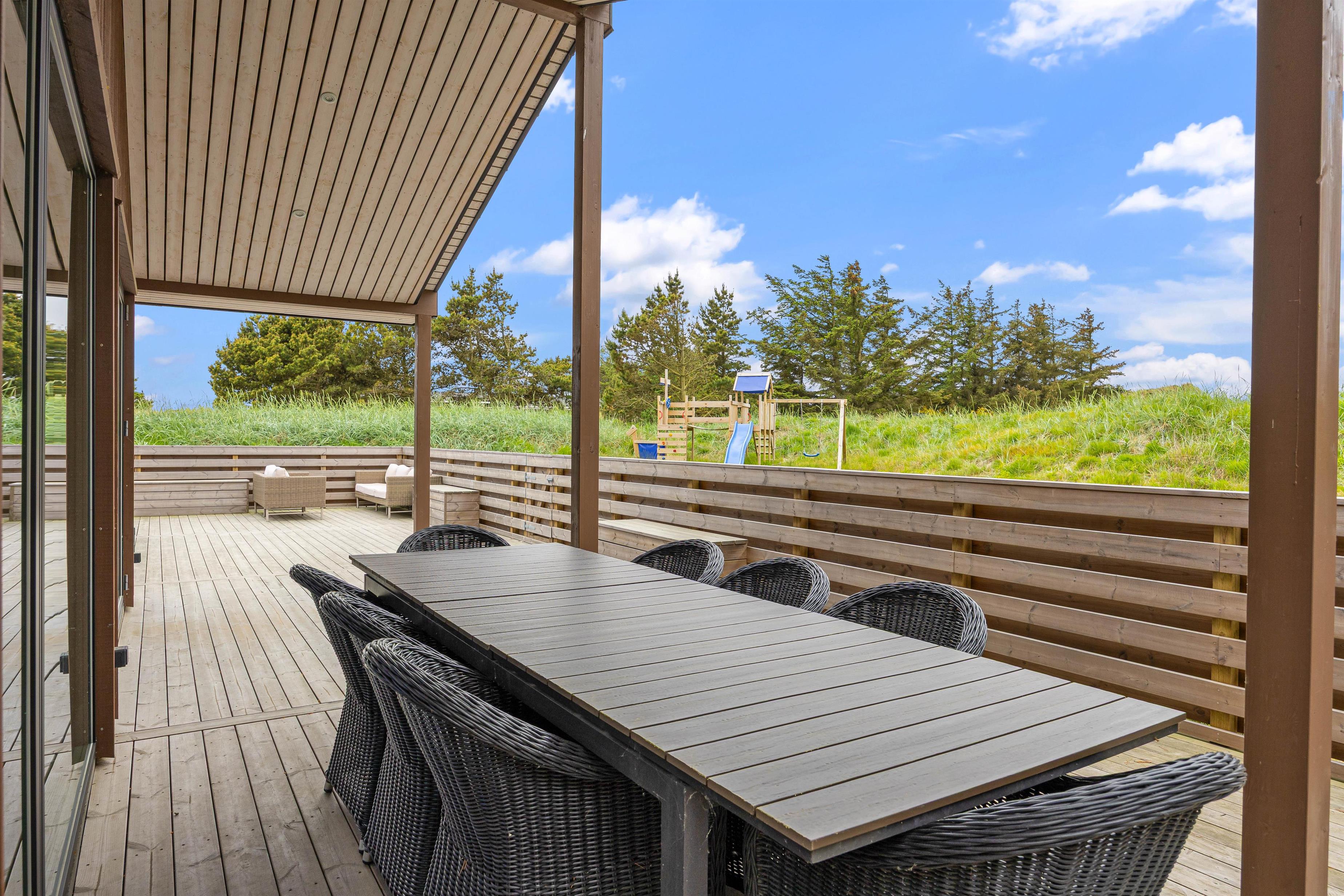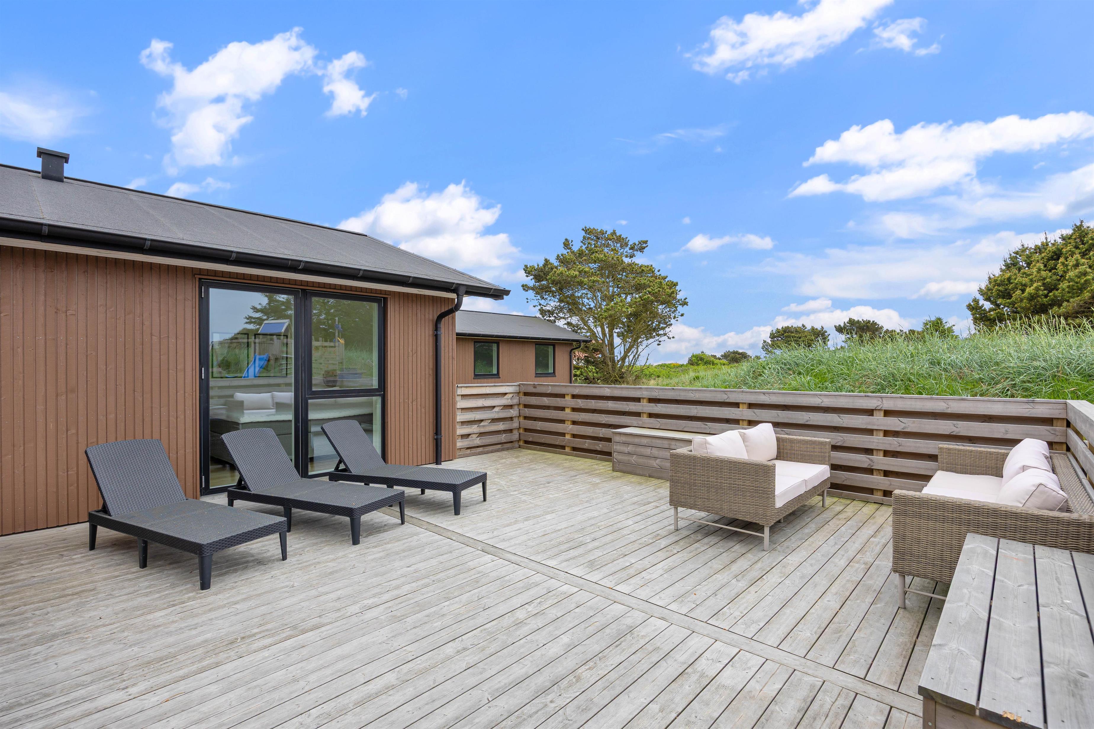 Sommerhuset er beliggende på en natur- og klitgrund. Her finder I et dejligt udendørs spabad på den lukkede terrasse, hvor I kan slappe af og nyde den friske luft sammen med et glas vin – det perfekte feriemiljø. På terrassen er der også en gasgrill, hvor aftensmaden kan tilberedes, mens I nyder den afslappede stemning i havemøblerne. For børnene er der en sandkasse og et gyngestativ til underholdning, mens aftensmaden bliver klar.