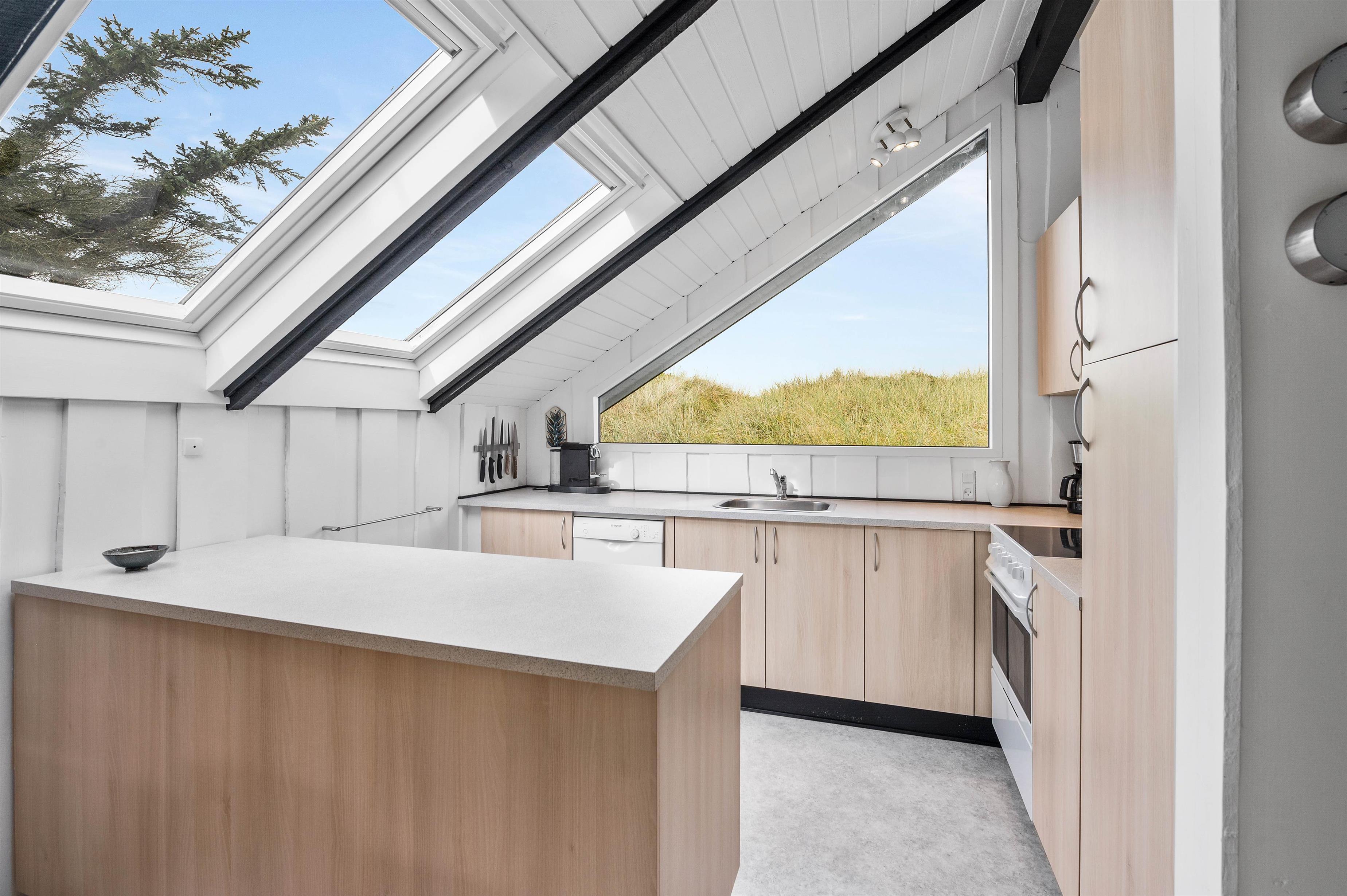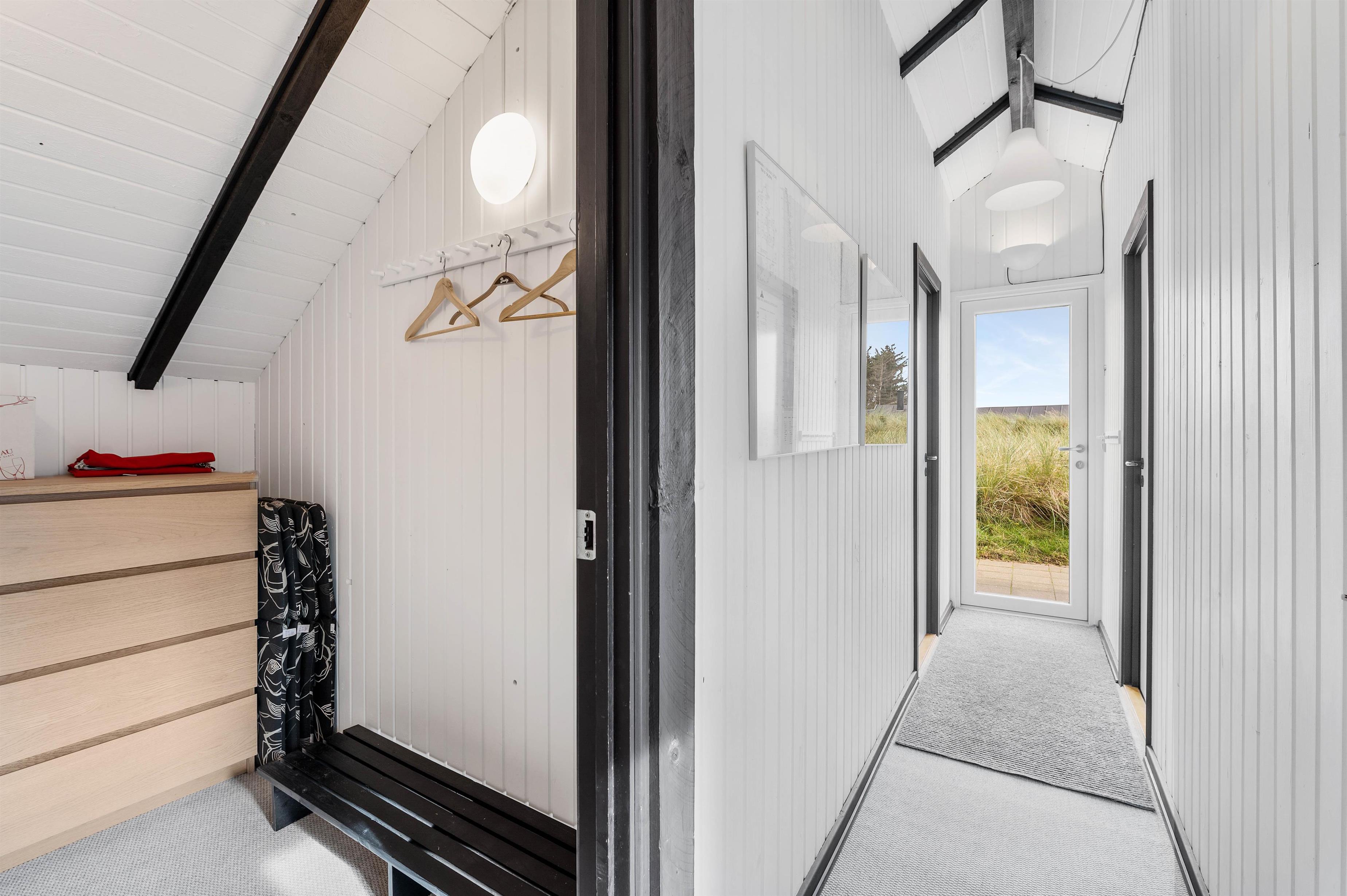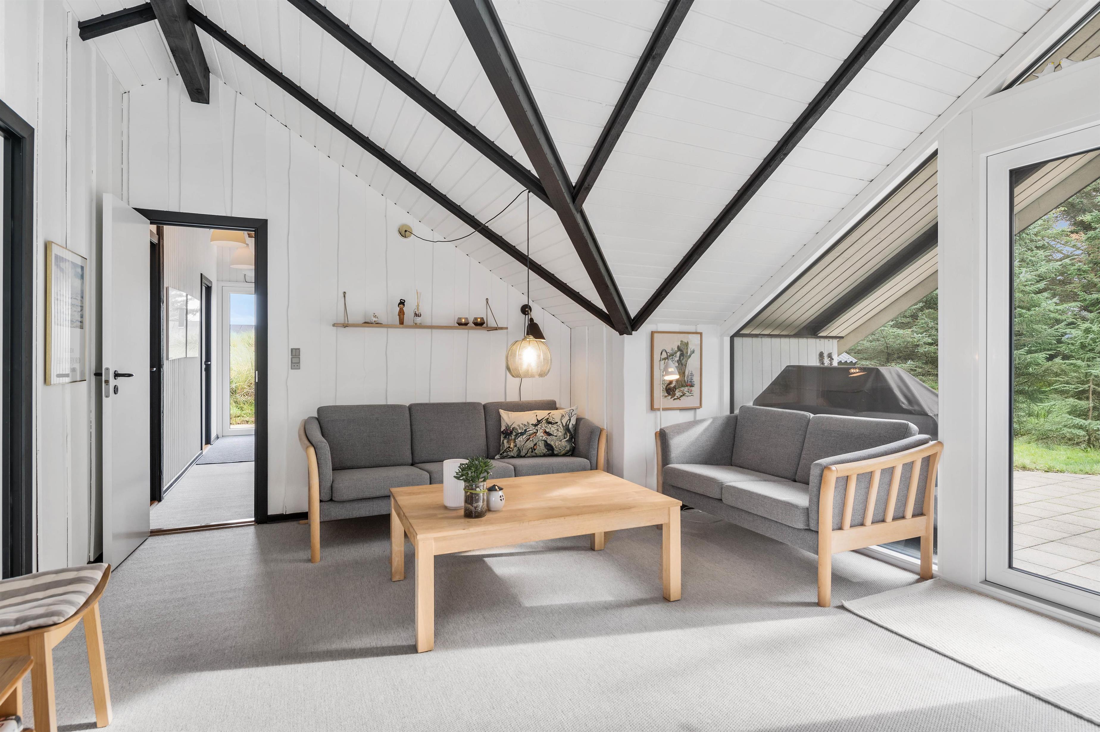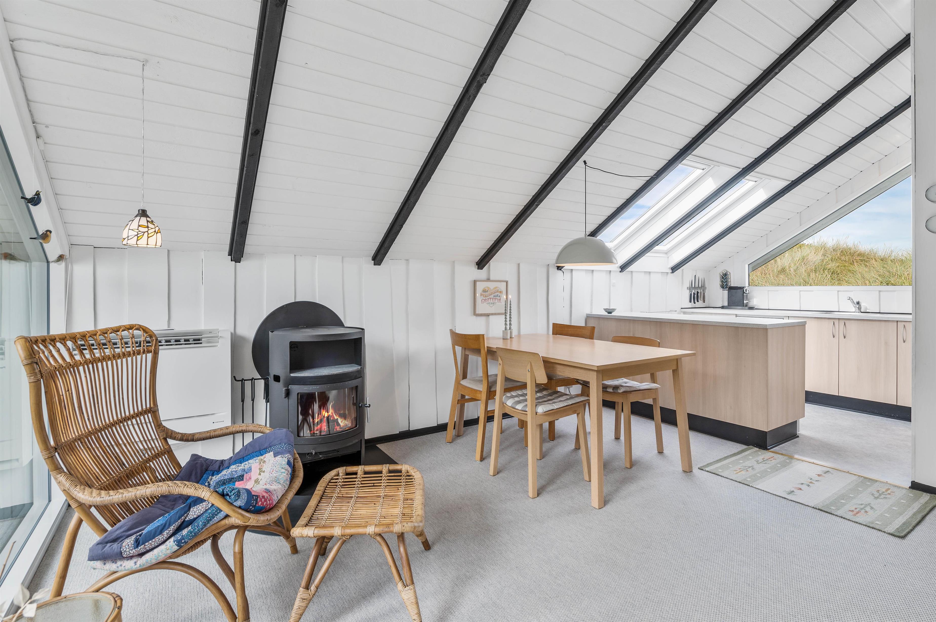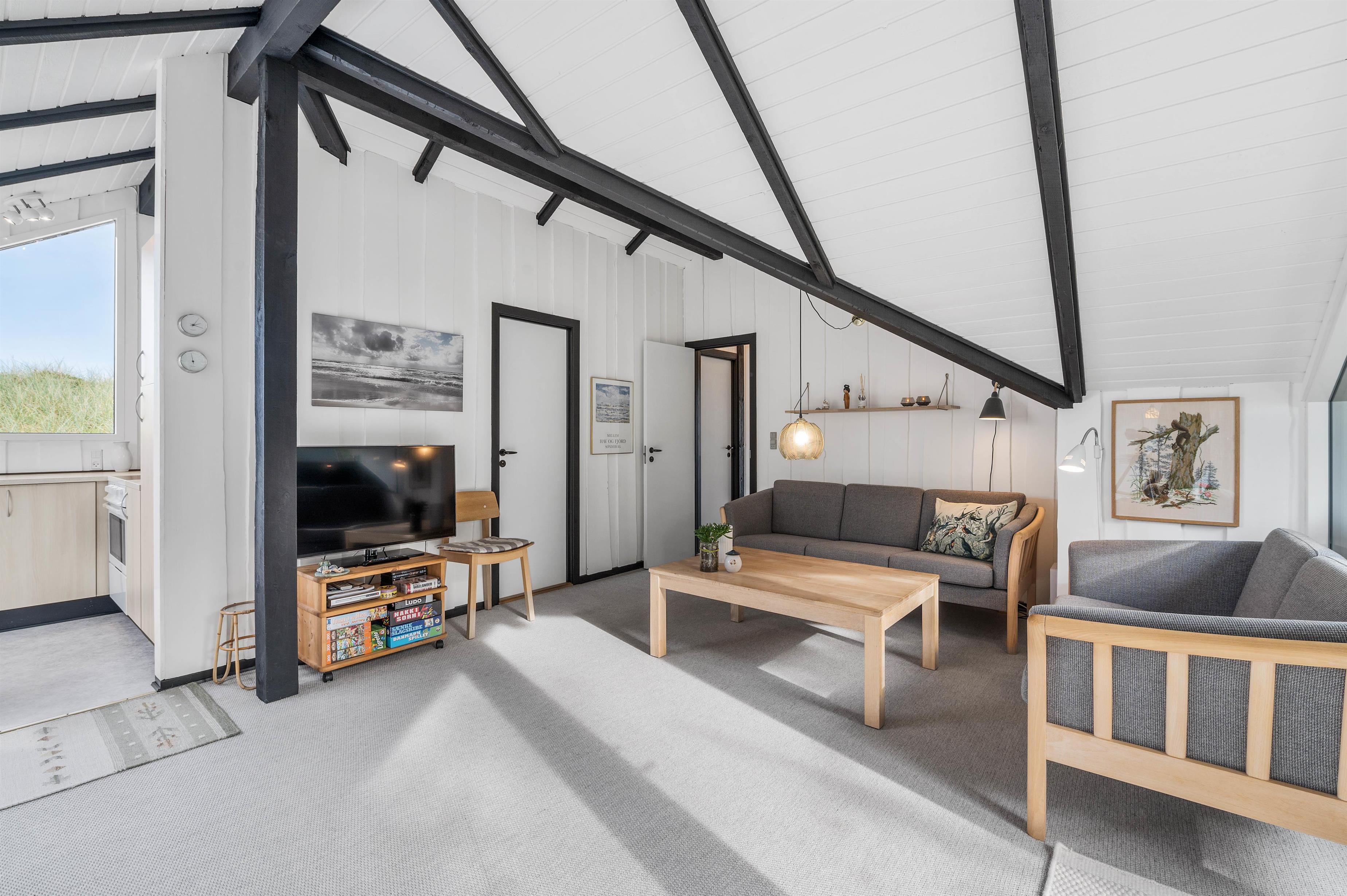 Sommerhuset på Fladsbjergvej 30 er indrettet med hvide træpaneler der går op til sorte bjælker i kip og danner et integreret hele, hvor køkken og stue går ud i et. Sommerhuset har en lys og venlig indretning og her vil I hurtigt føle jer godt tilrette.
