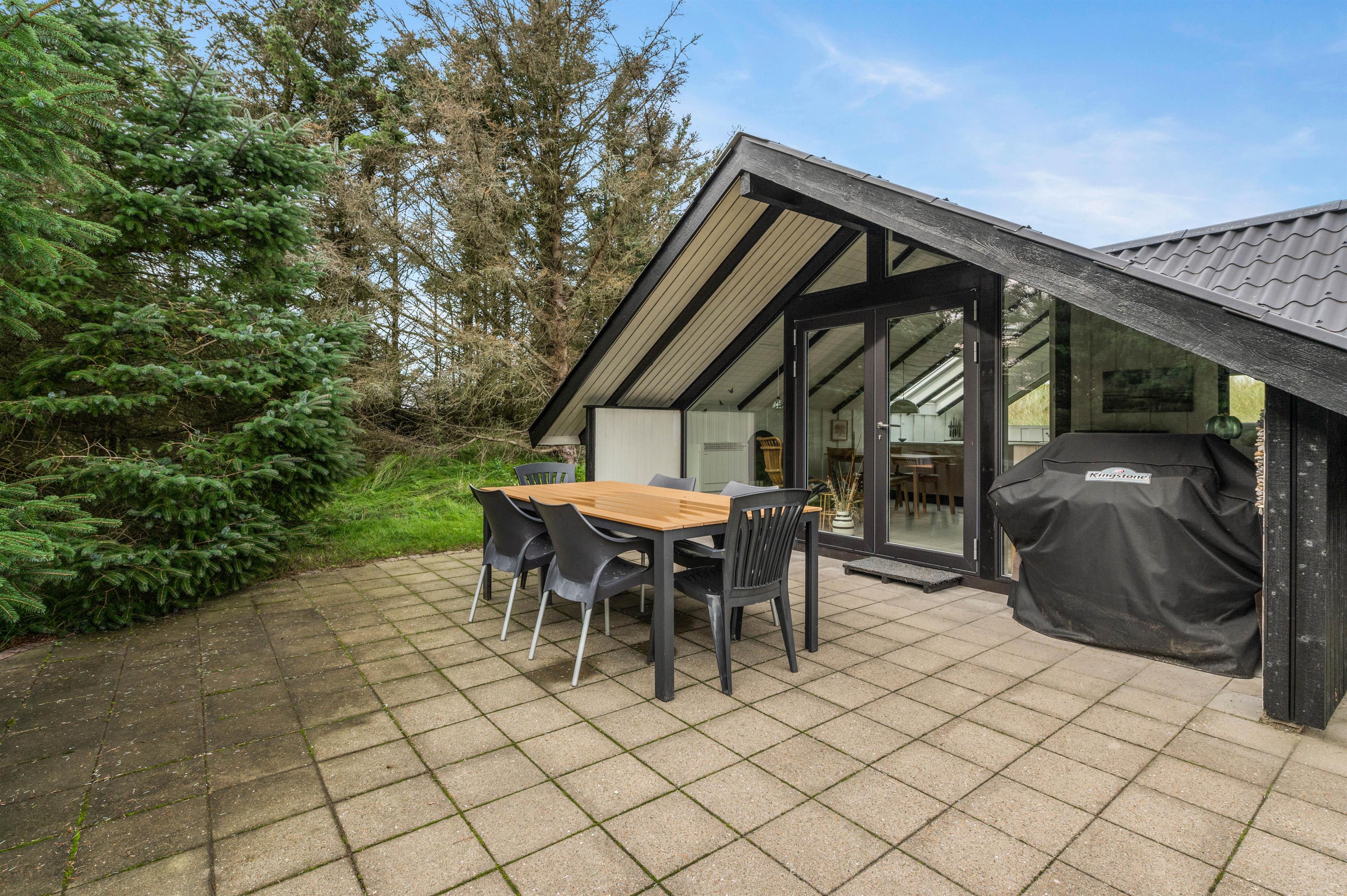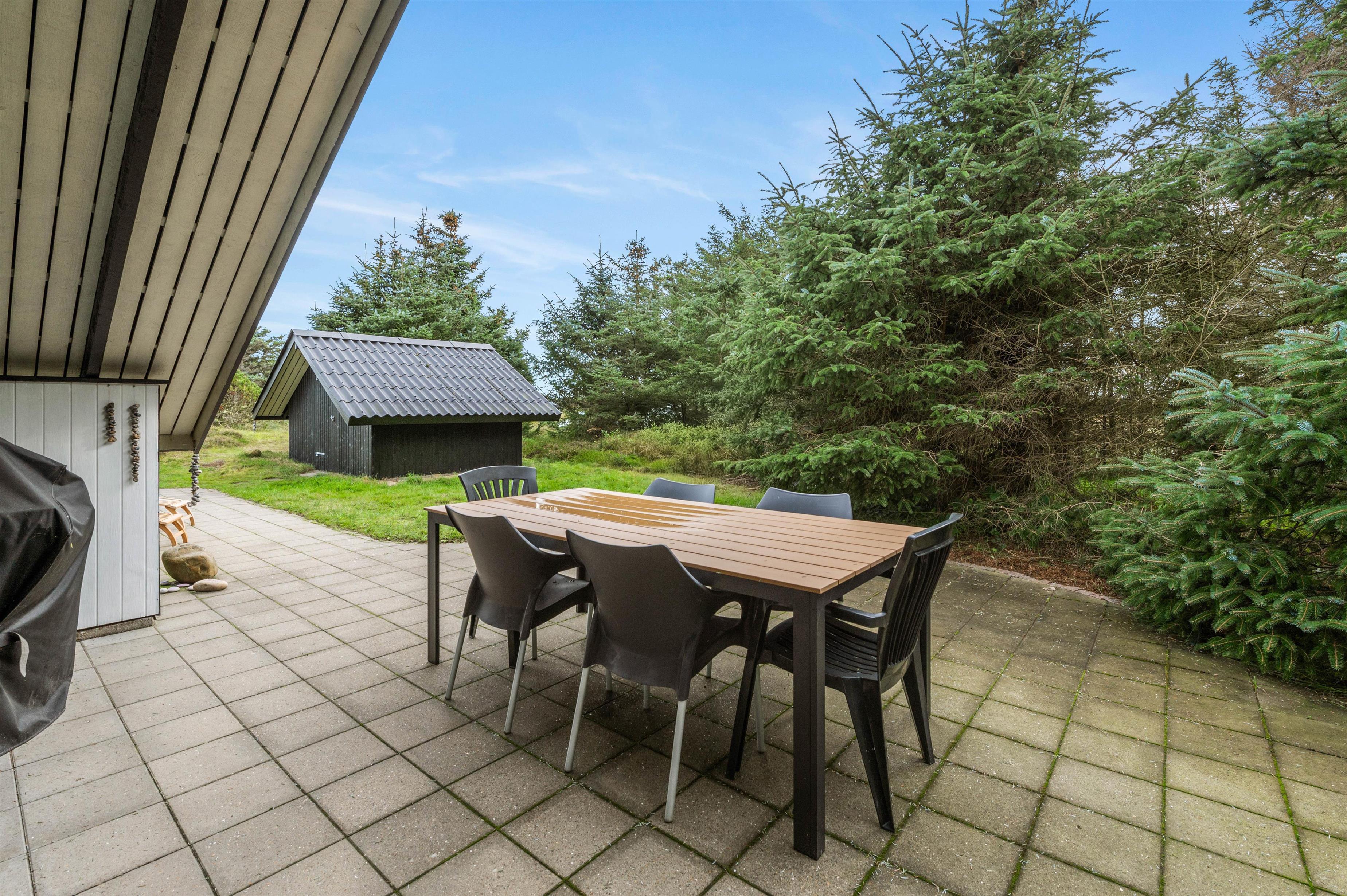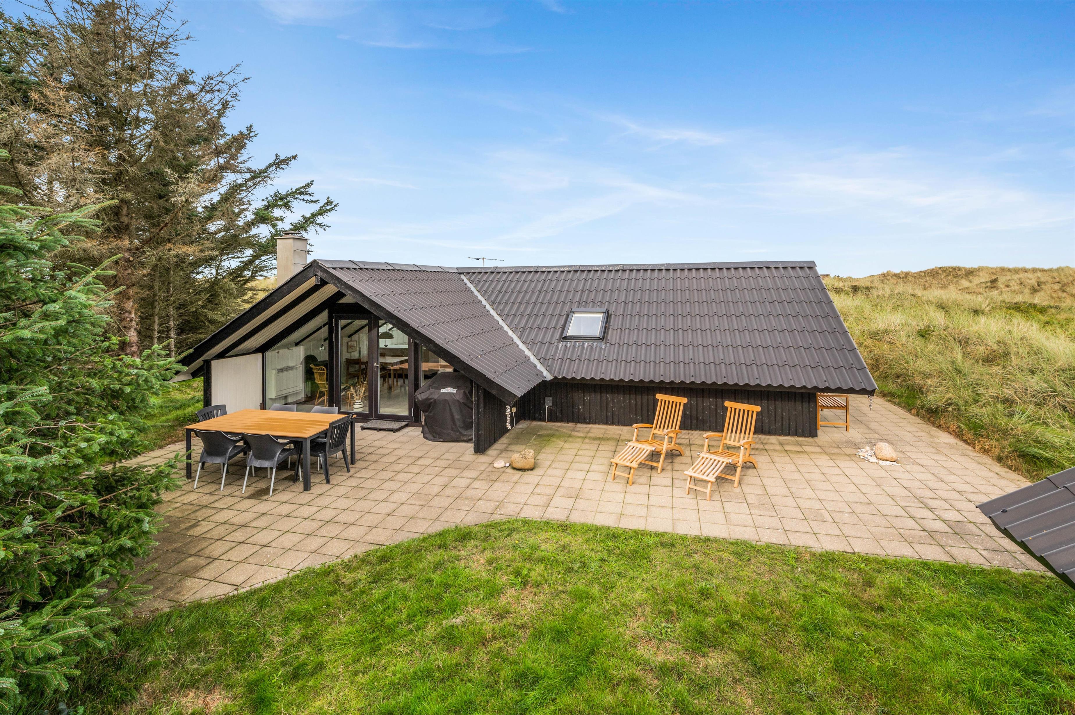 Der er en stor terrasse rundt langs feriehuset med havemøbler og grill til fri afbenyttelse. Her kan I sidde og hygge jer i solen med en kølig drink eller nyde en dejlig middag, mens I ser solen går ned over den jyske hede.