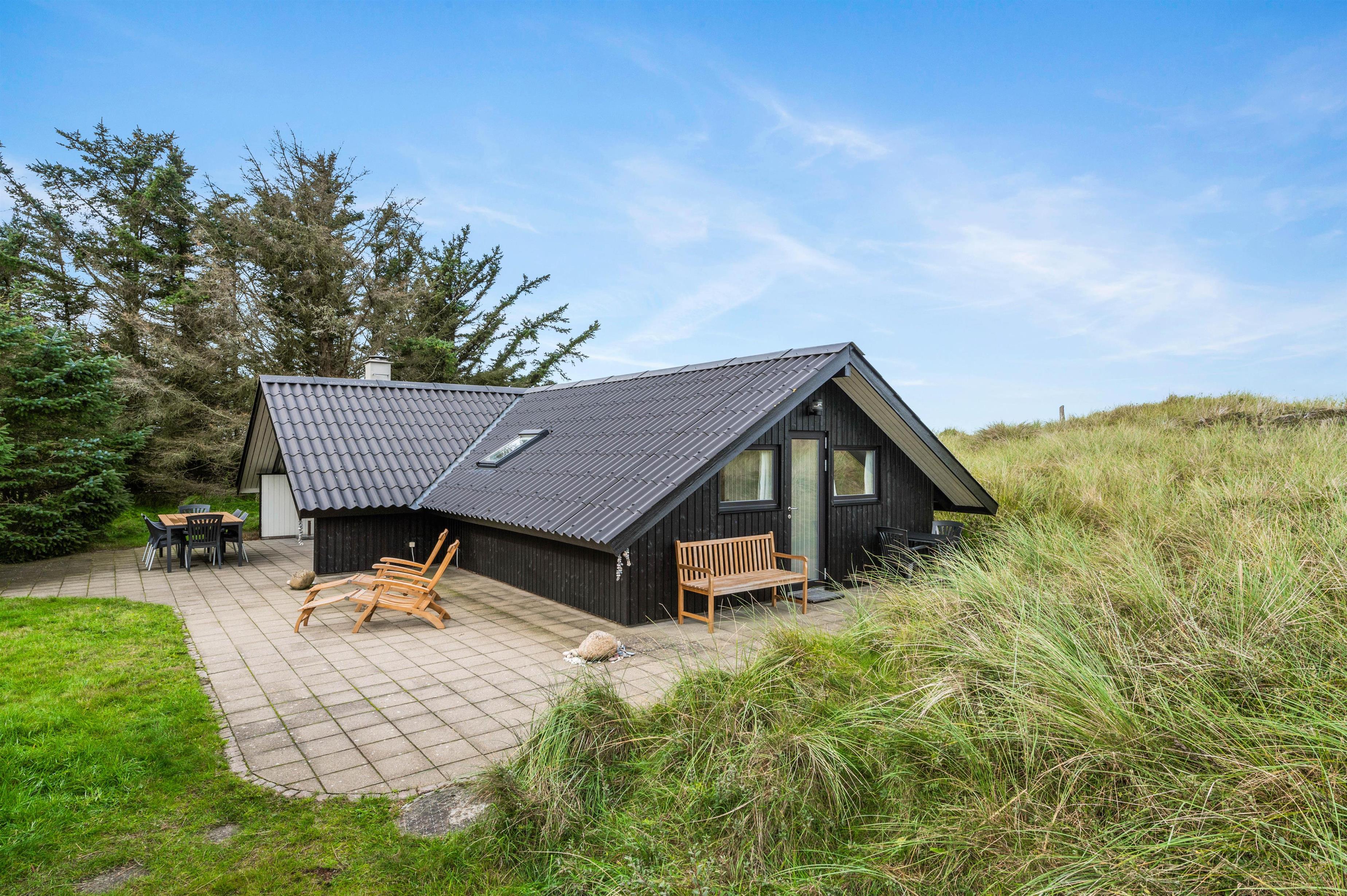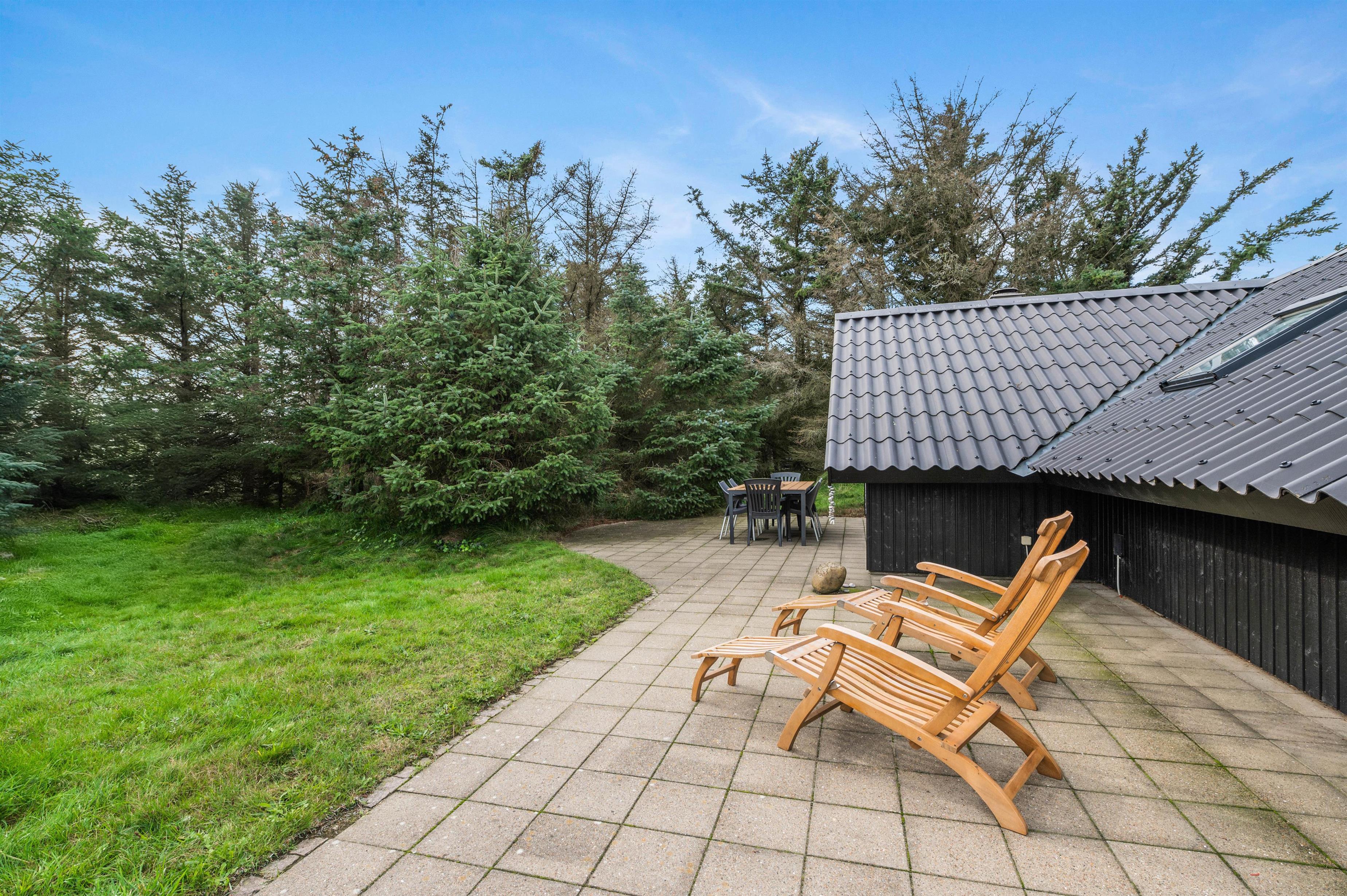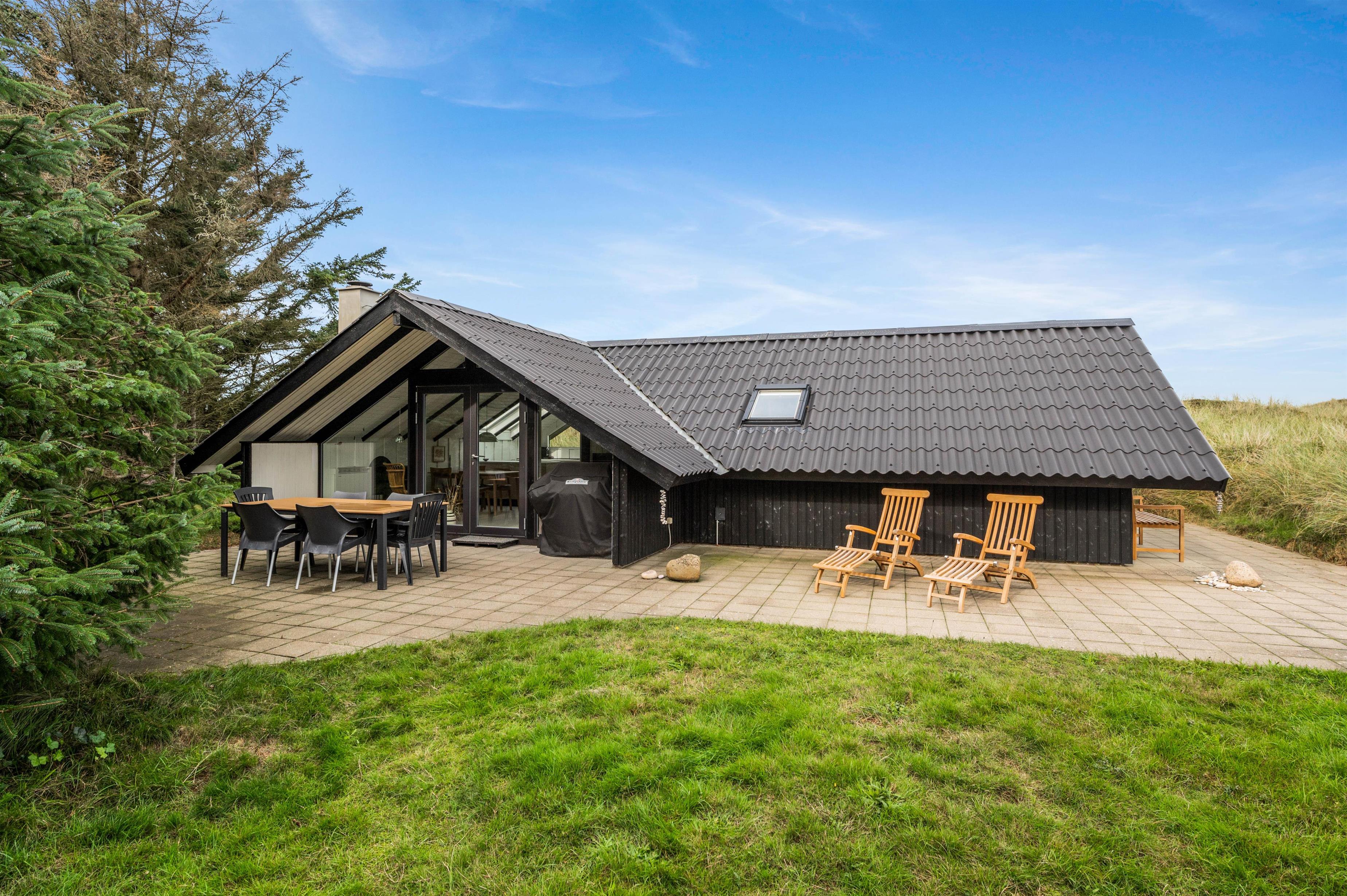 Der er en stor terrasse rundt langs feriehuset med havemøbler og grill til fri afbenyttelse. Her kan I sidde og hygge jer i solen med en kølig drink eller nyde en dejlig middag, mens I ser solen går ned over den jyske hede.