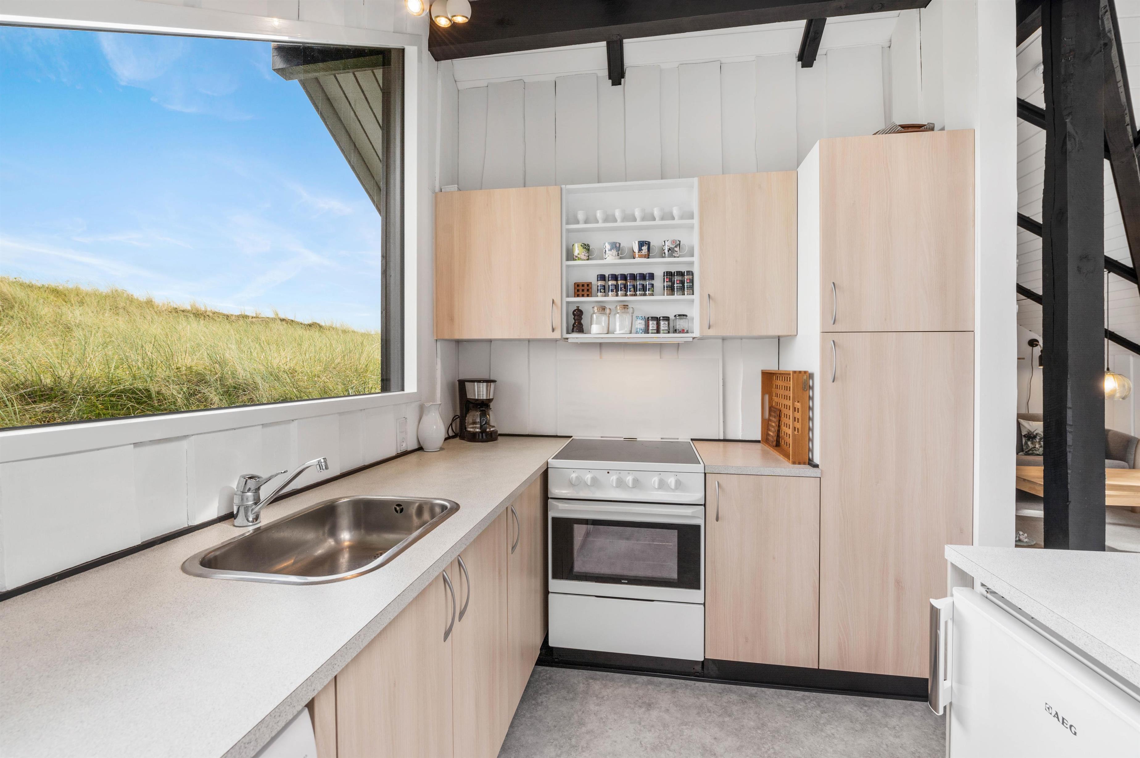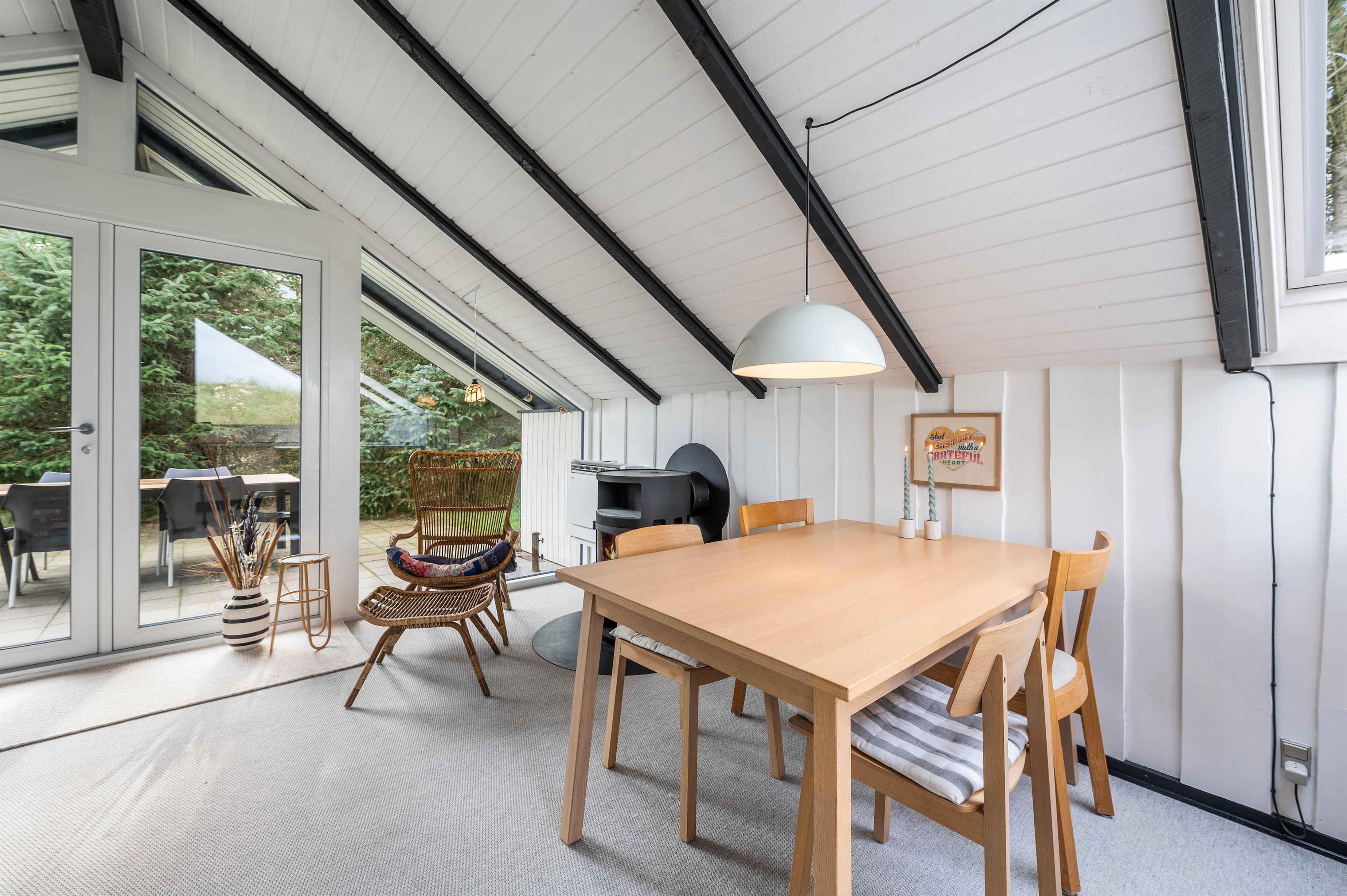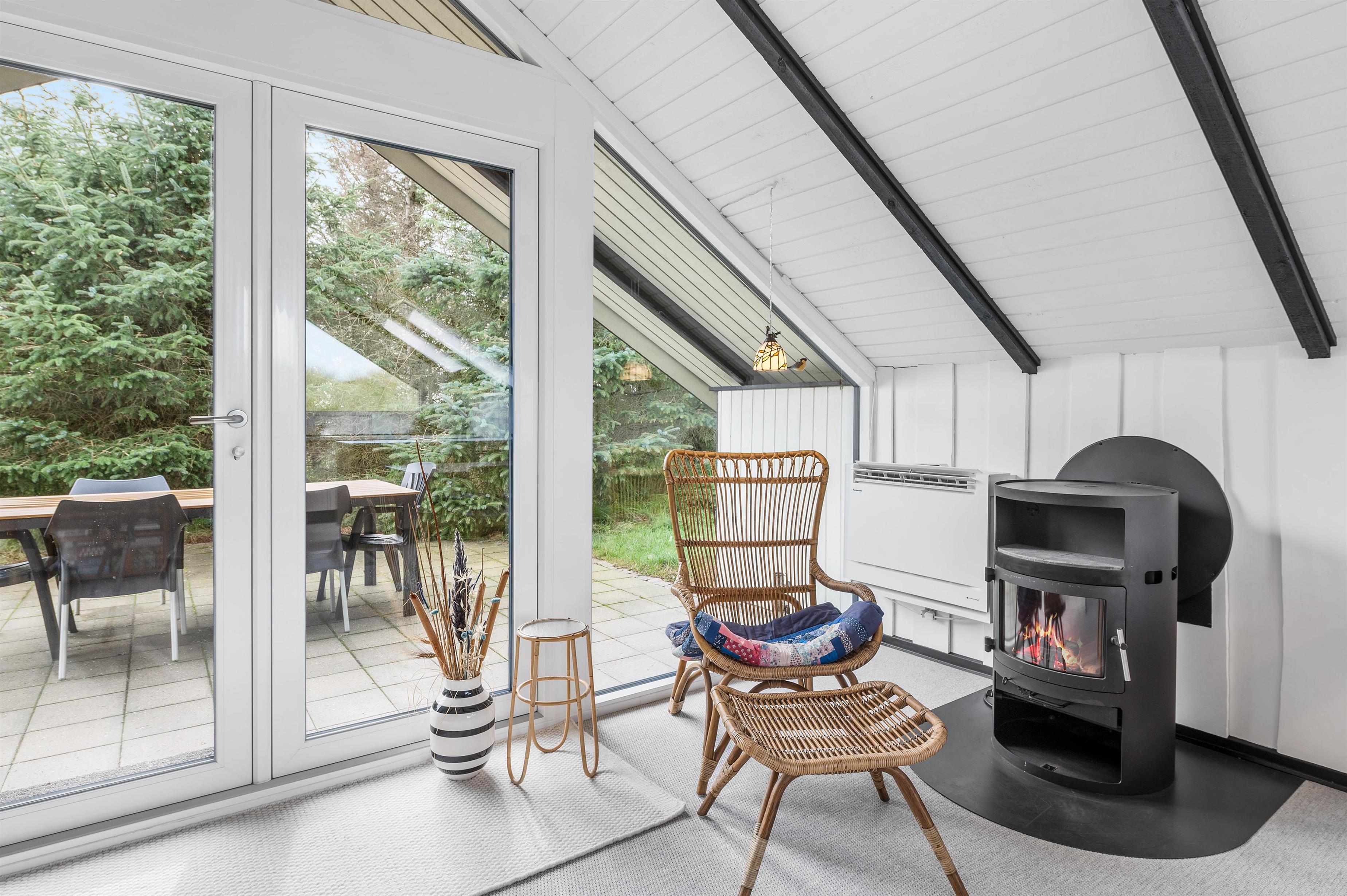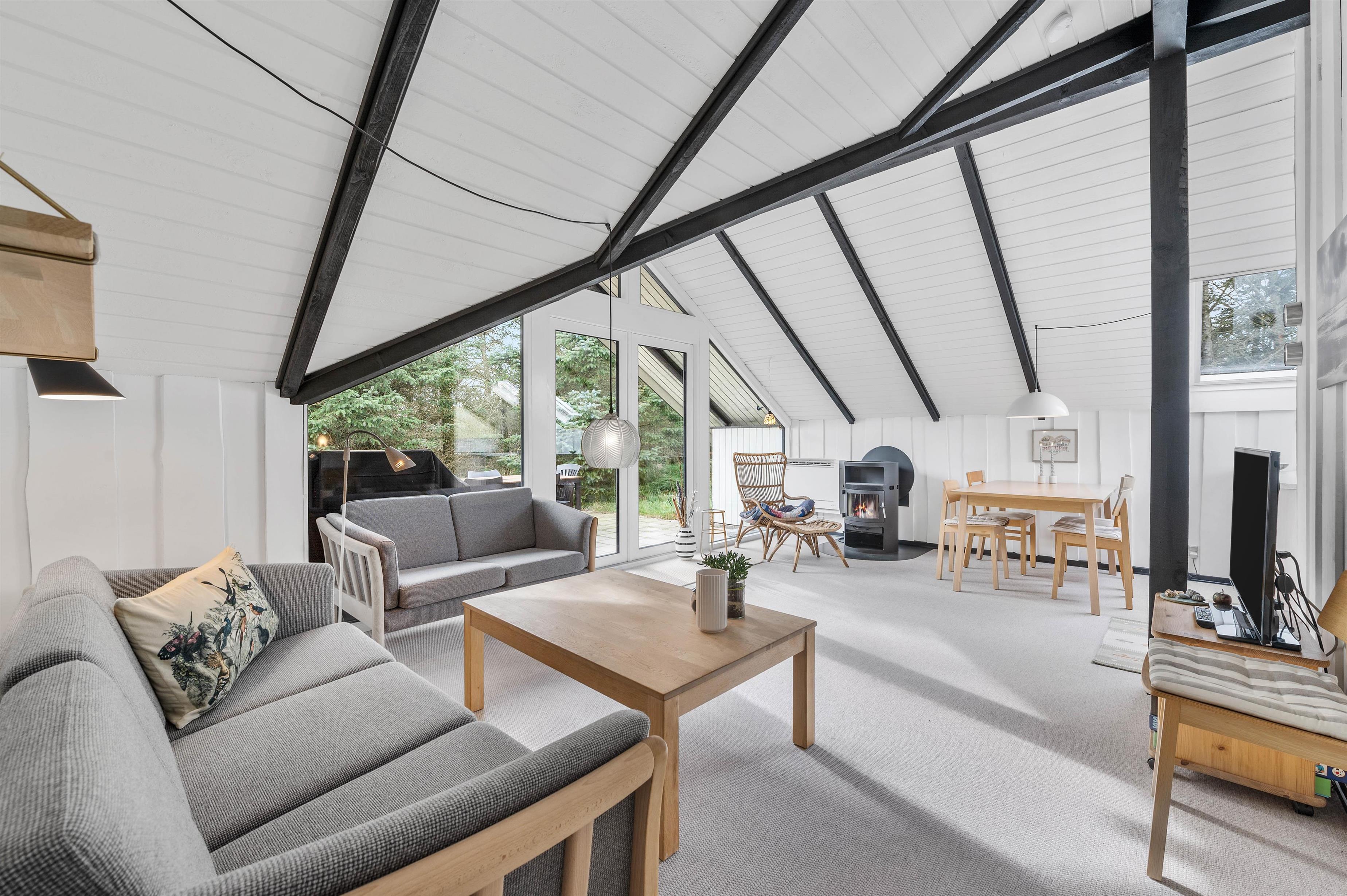 Brændeovnen i stuen sørger for den ægte sommerhusstemning. Her kan I sidde i sofaen, mens I kigger på de knitrende flammer og planlægger feriens aktiviteter, mens madlavningen foregår. Sommerhuset er fordelt på 3 soverum, hvoraf de 2 rum har dobbeltsenge. Fra stuen er der direkte adgang ud til den dejlige, store terrasse udenfor.