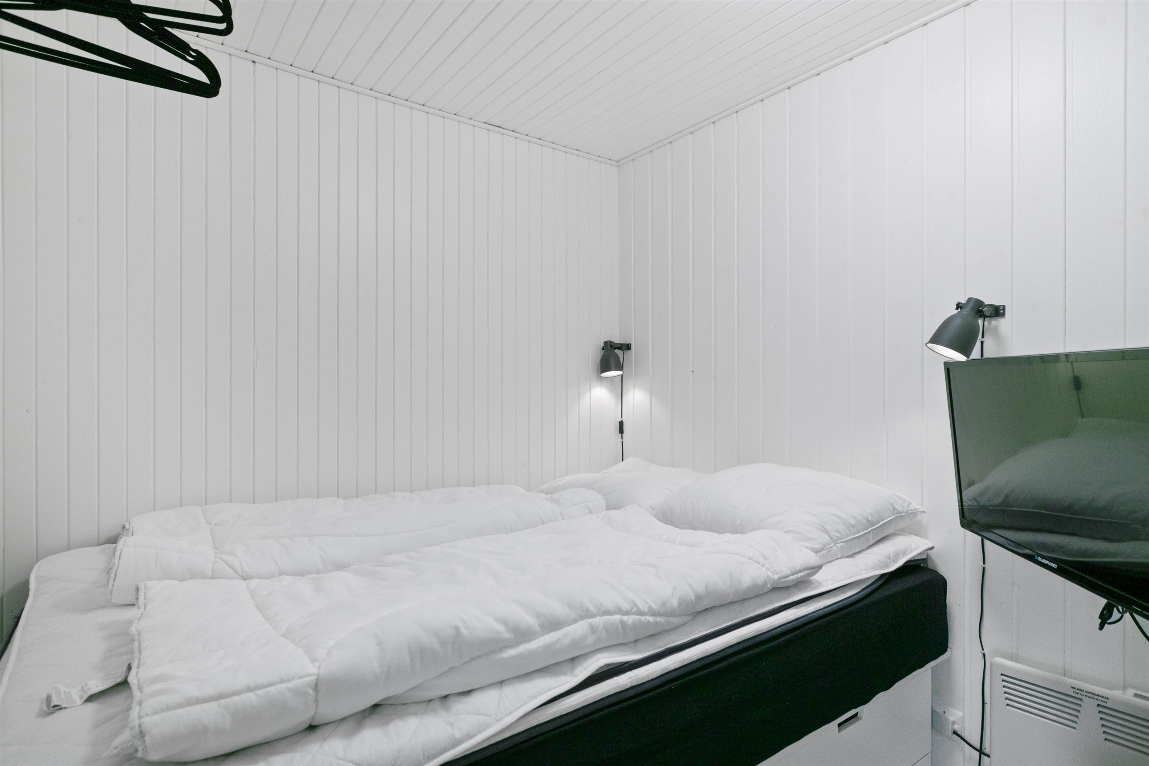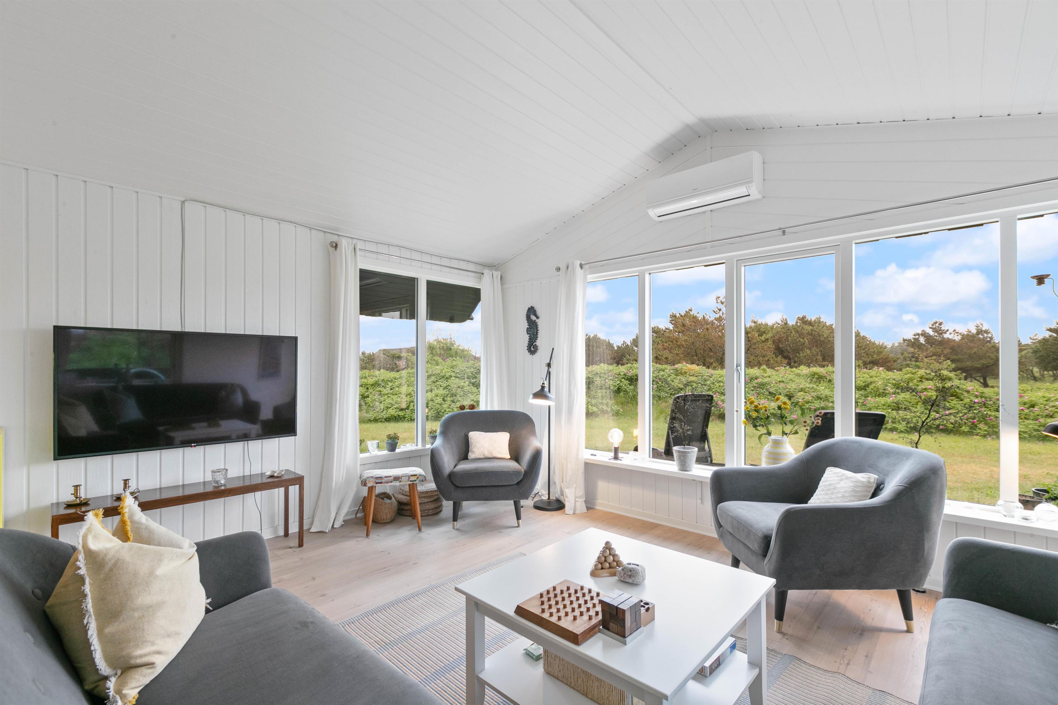 I vil straks falde til i den lyse og venlige indretning med hvide trælofter og nye trægulve. Samtidig lader de store vinduespartier en masse sollys slippe ind i feriehuset.