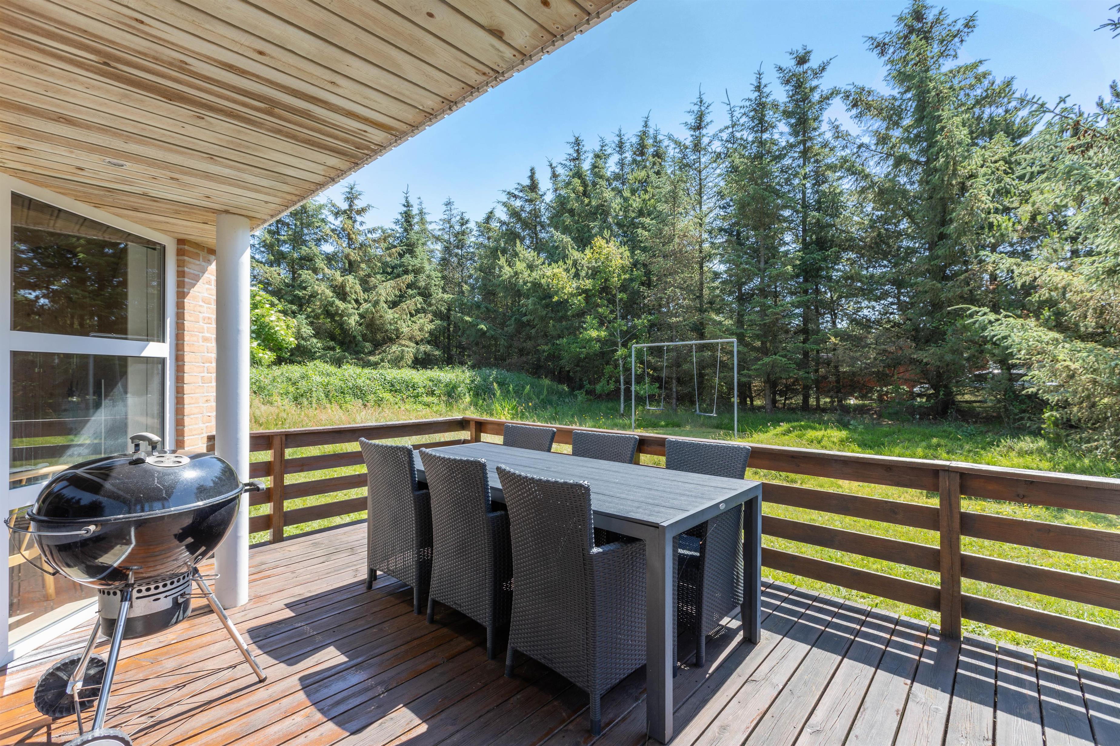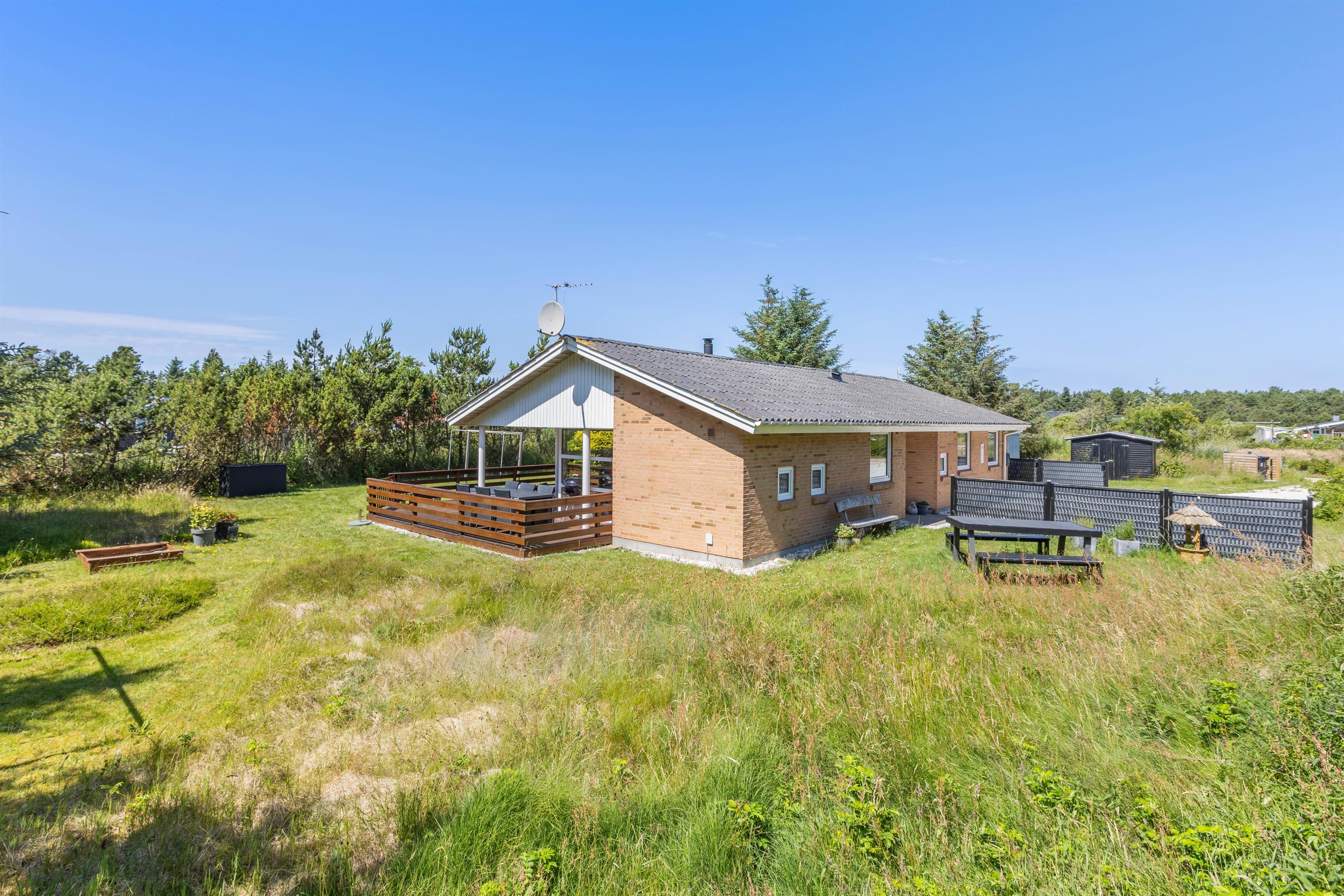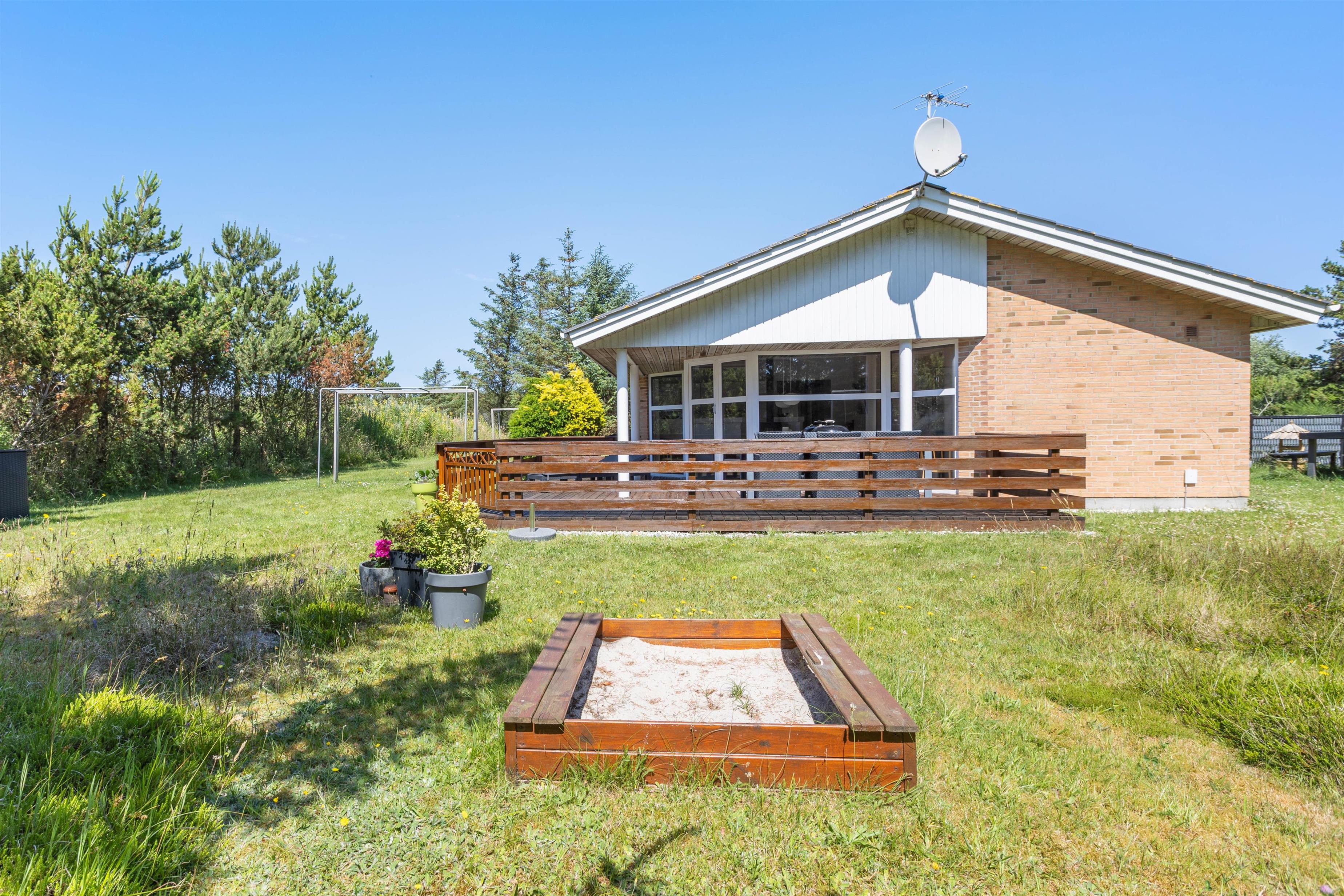 Feriehuset har en rigtig god beliggenhed på en skøn plænegrund for enden af en lille stikvej. Fra sommerhusets stue er der udgang til en dejlig terrasse. På varme sommerdage er det oplagt af spise dagens måltider her. Her kan morgenmaden nydes med en kop varm kaffe, mens du lytter til fuglene, der kvidrer. Sommerhuset har desuden gyngestativ og sandkasse til familiens mindste.