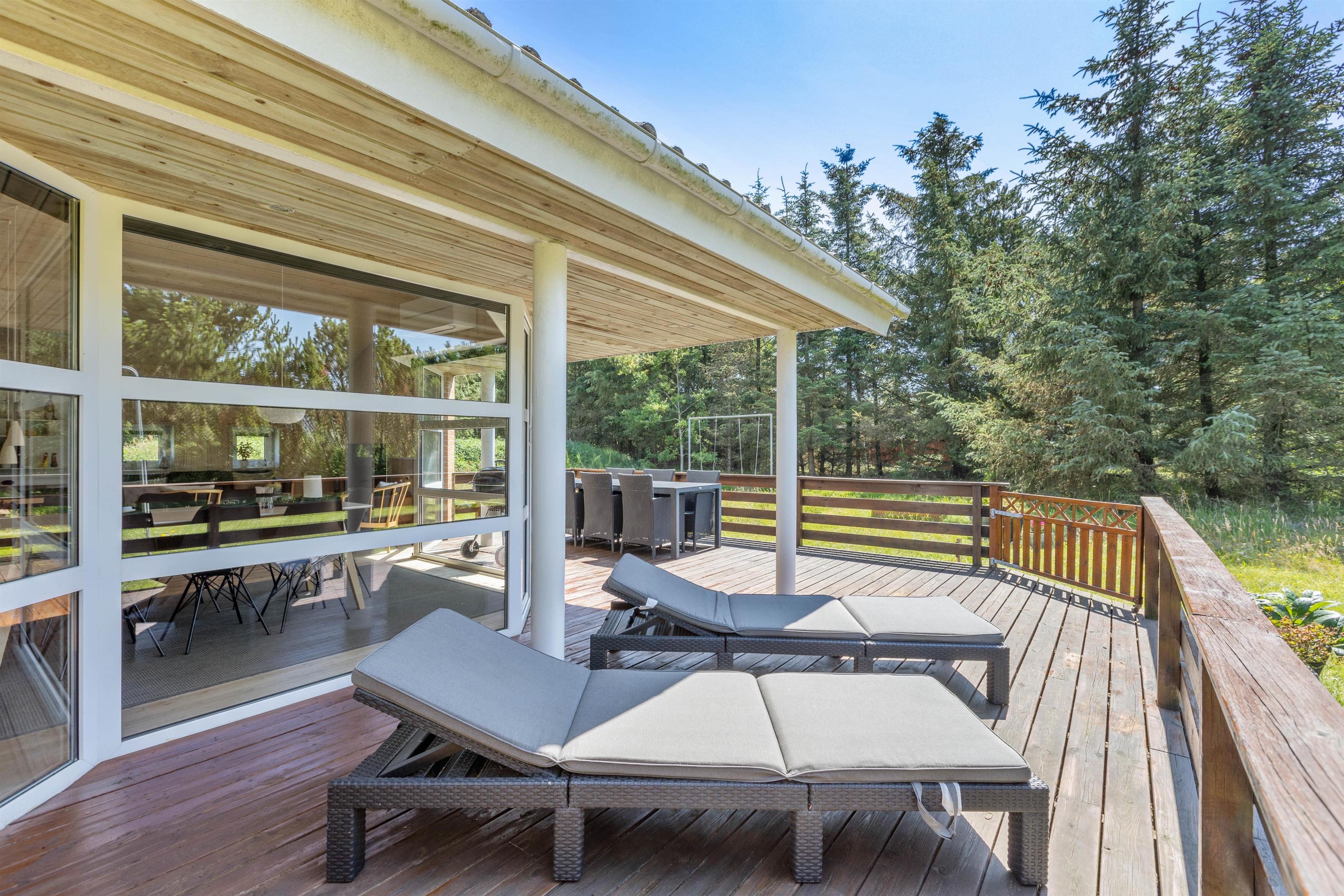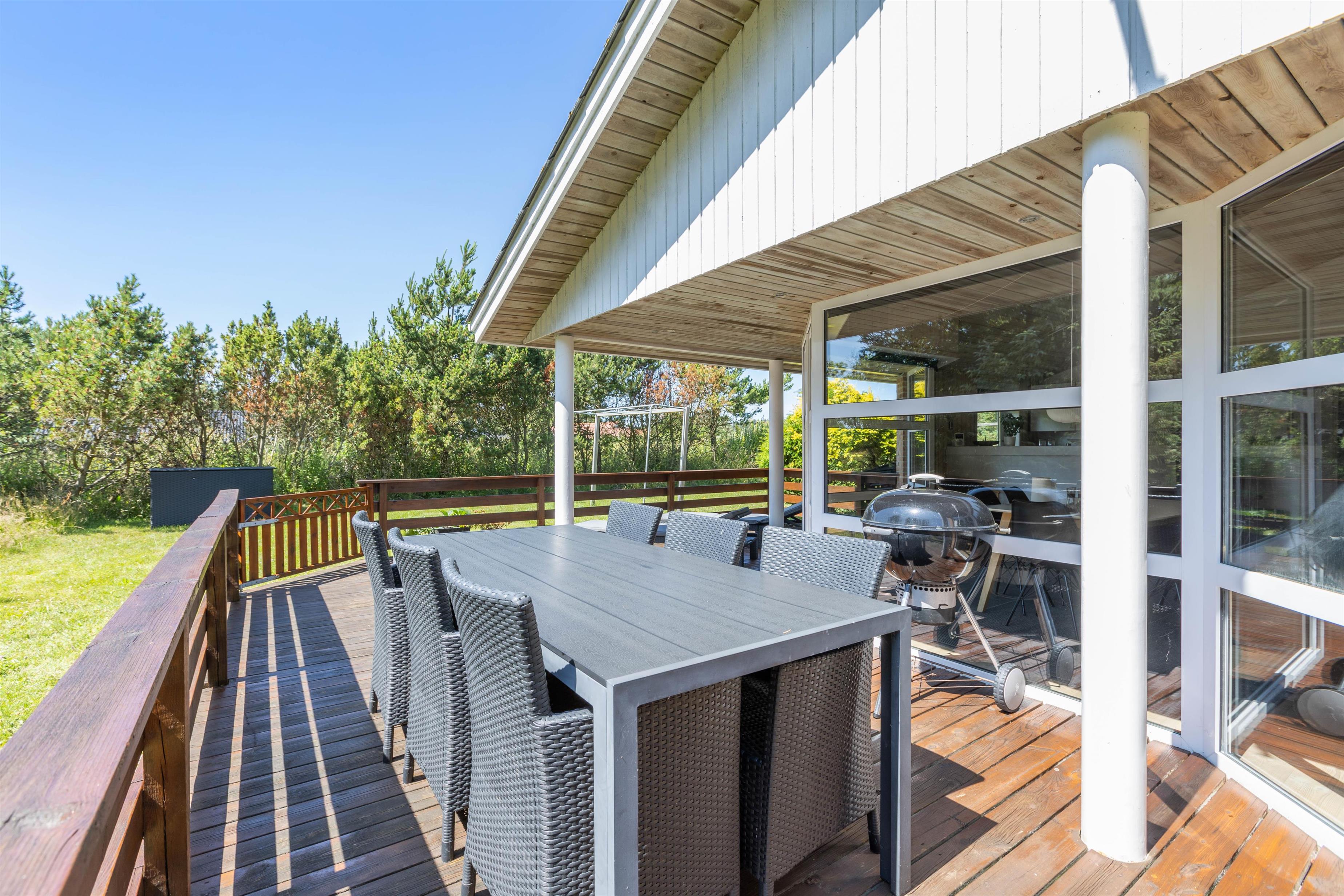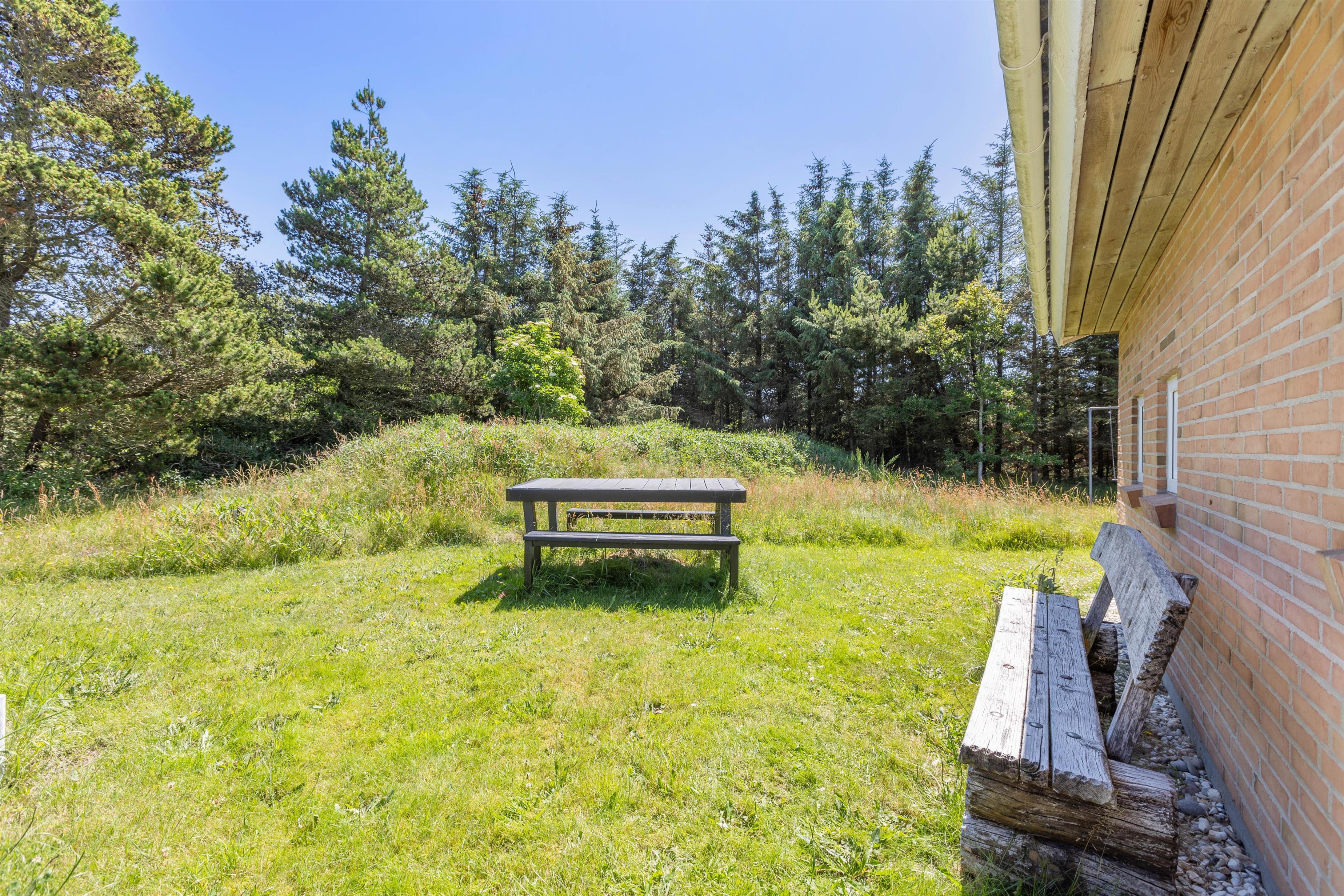 Feriehuset har en rigtig god beliggenhed på en skøn plænegrund for enden af en lille stikvej. Fra sommerhusets stue er der udgang til en dejlig terrasse. På varme sommerdage er det oplagt af spise dagens måltider her. Her kan morgenmaden nydes med en kop varm kaffe, mens du lytter til fuglene, der kvidrer. Sommerhuset har desuden gyngestativ og sandkasse til familiens mindste.