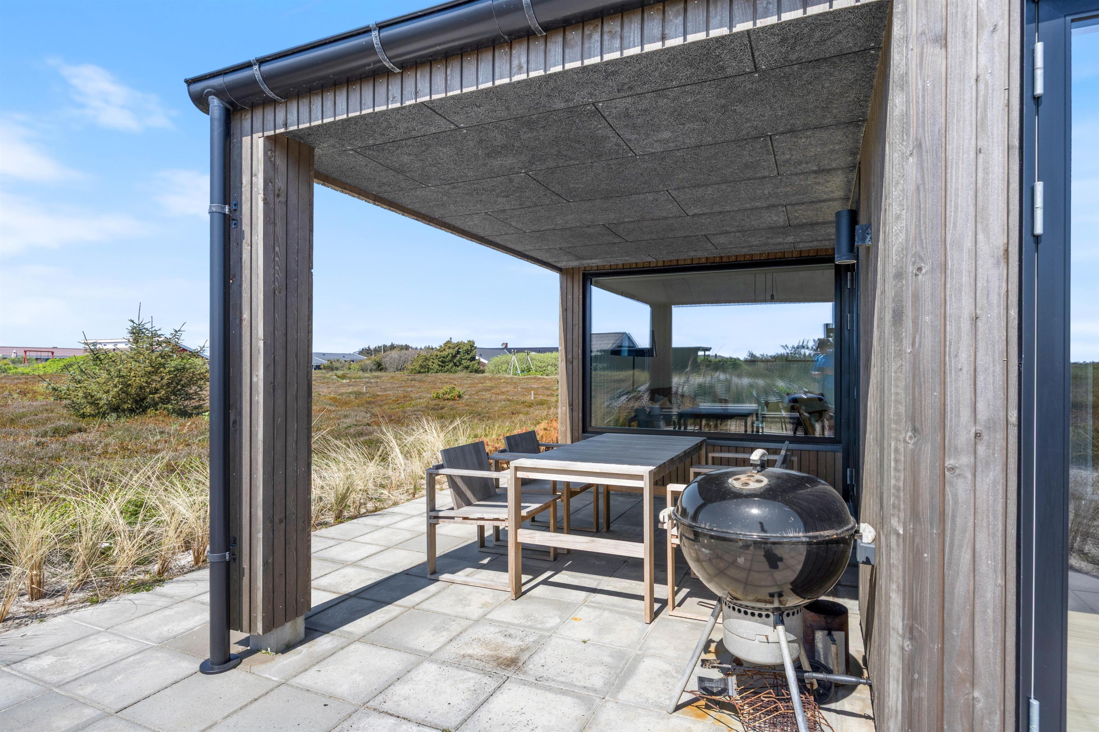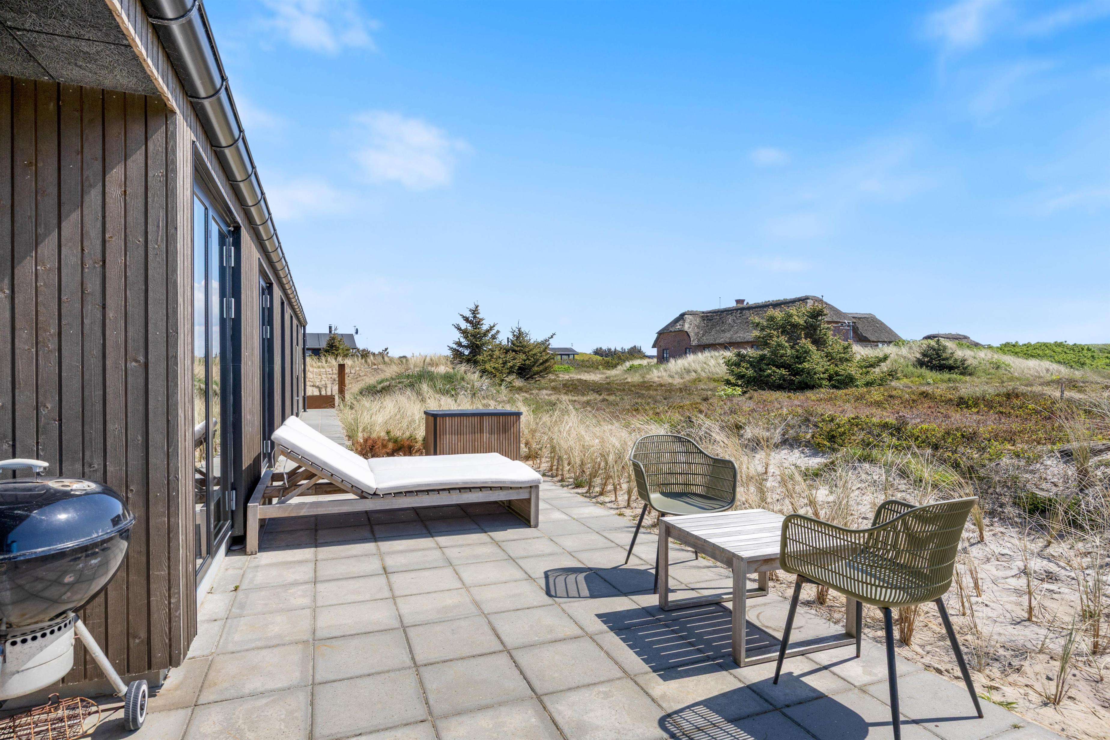 Fra både stue, værelser og badeværelser er der udgang til terrassen, som omringer feriehuset. På den store terrasse kan I både sidde i læ og overdækket på samme tid, så uanset vejrudsigten, kan I altid sidde på terrassen. Tag et hvil på feriehusets liggestole eller find grillen frem, som er en elektrisk grill fra Morsø og tilbered en lækker middag derpå, som I kan nyde på terrassen i de behagelige havemøbler.