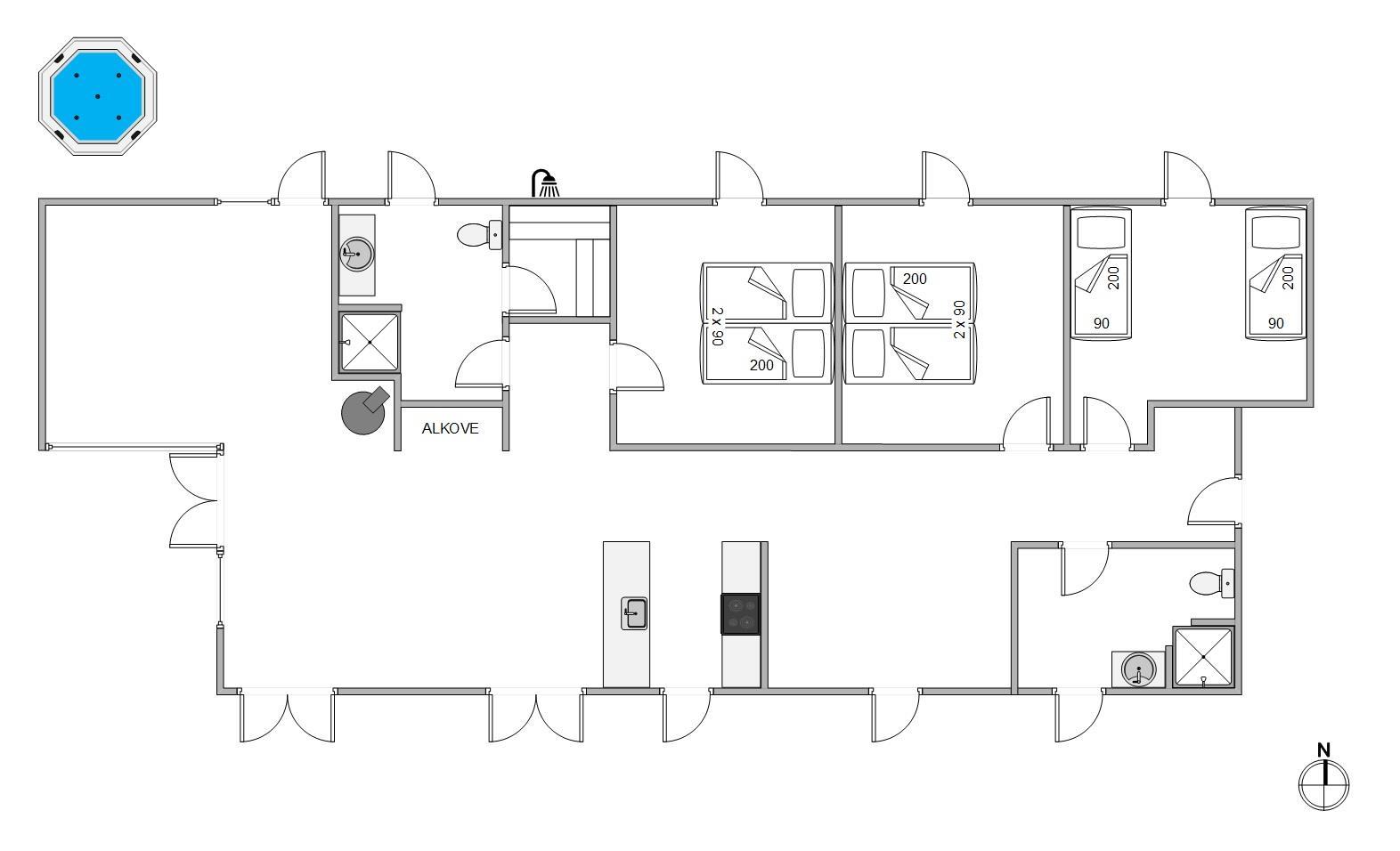 Hop en tur i den varme udespa og nyd de grønne omgivelser omkring jer. Fra april til november kan I også tage et skyl under udebruseren på den nordlige side af feriehuset.