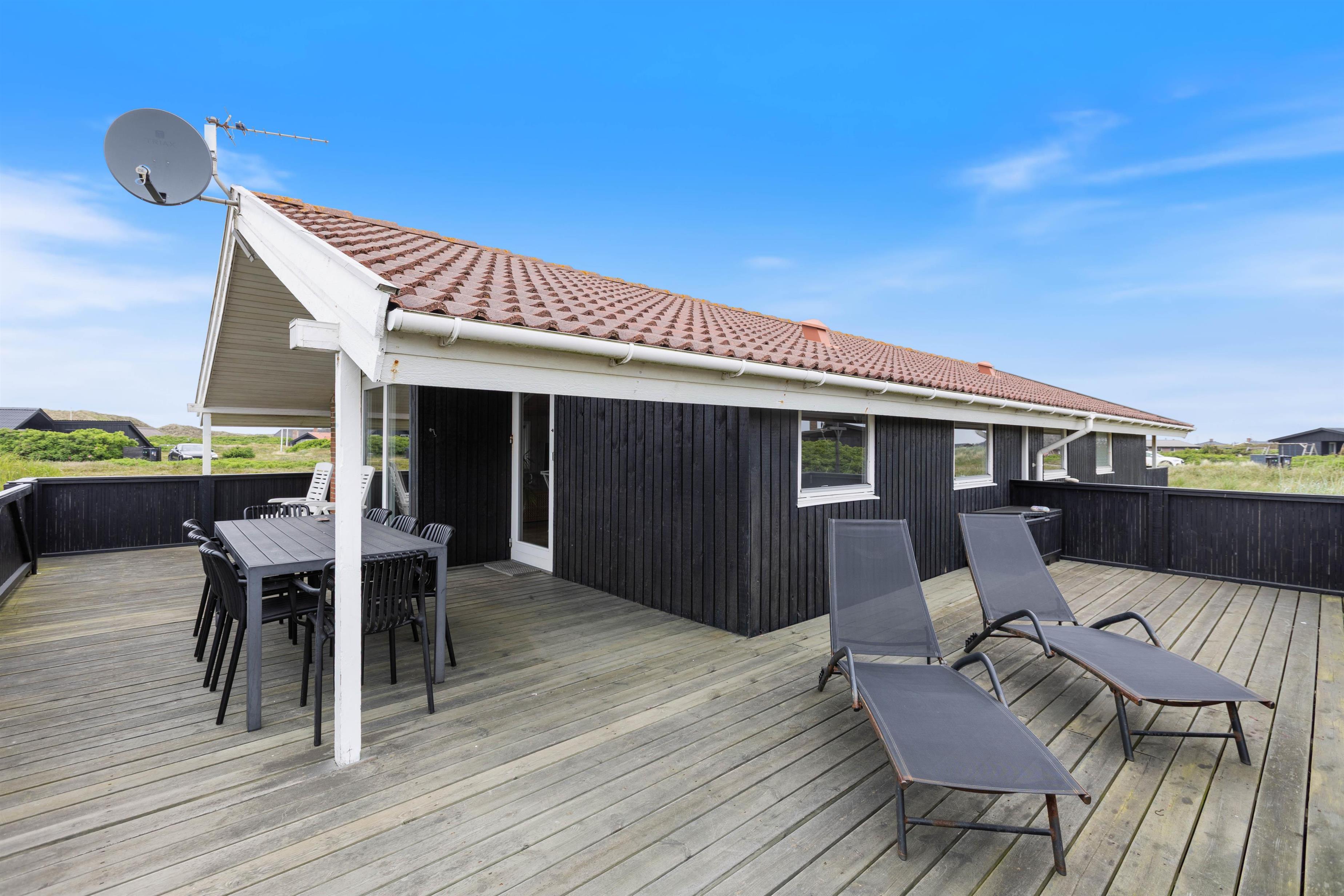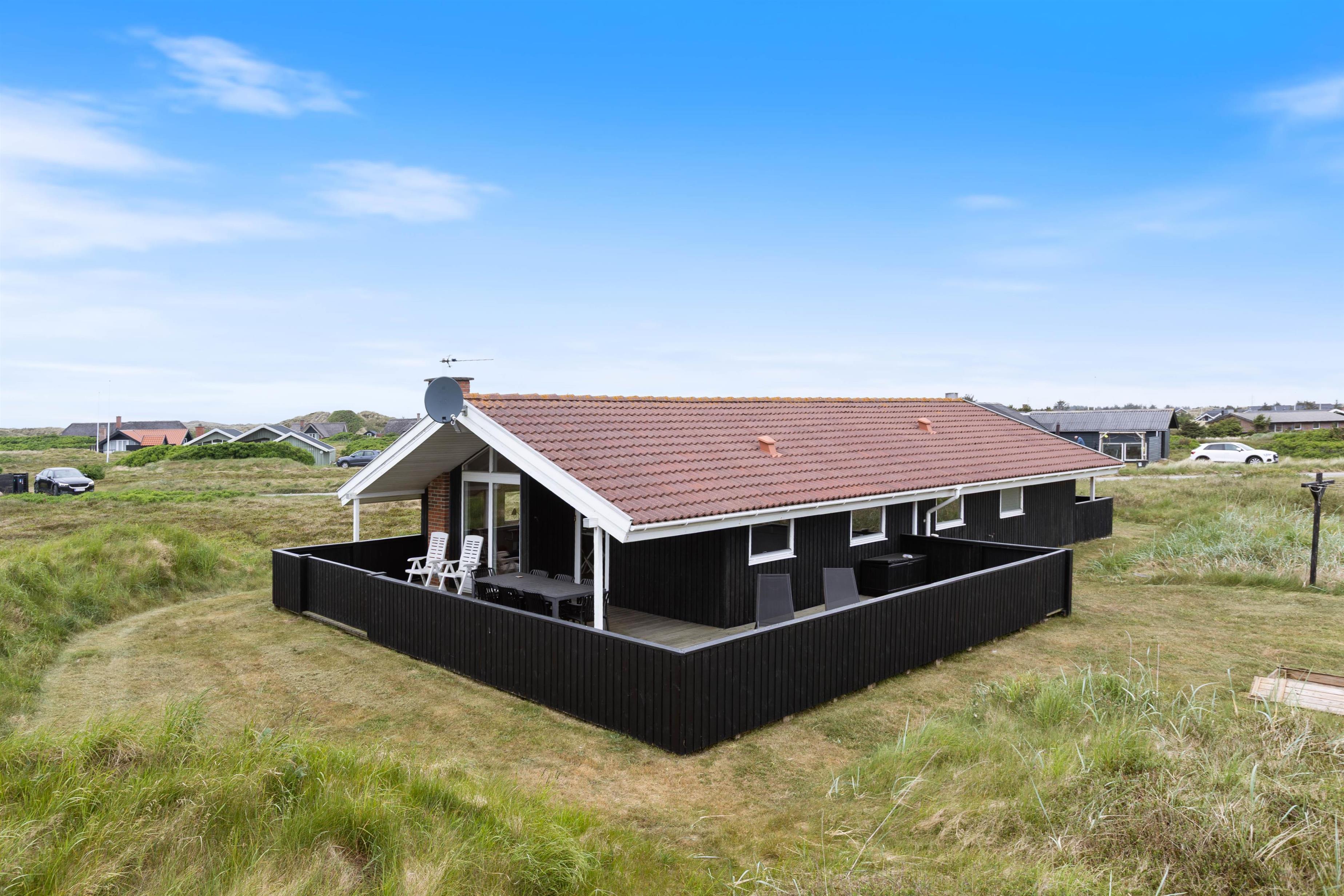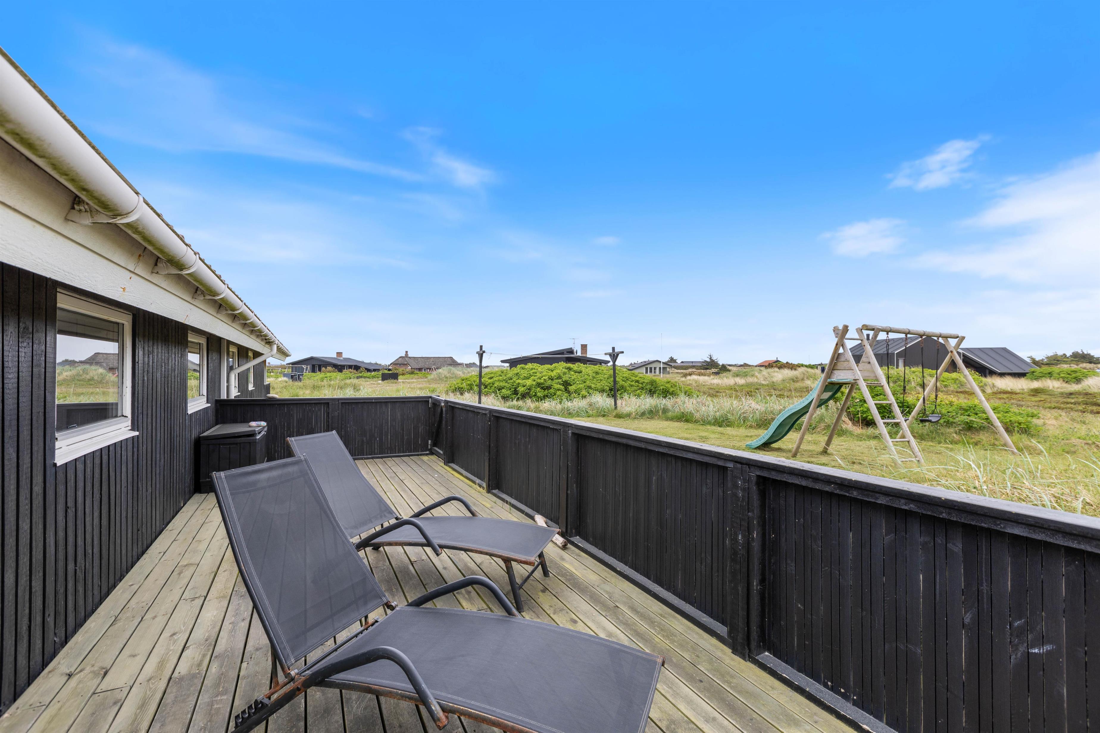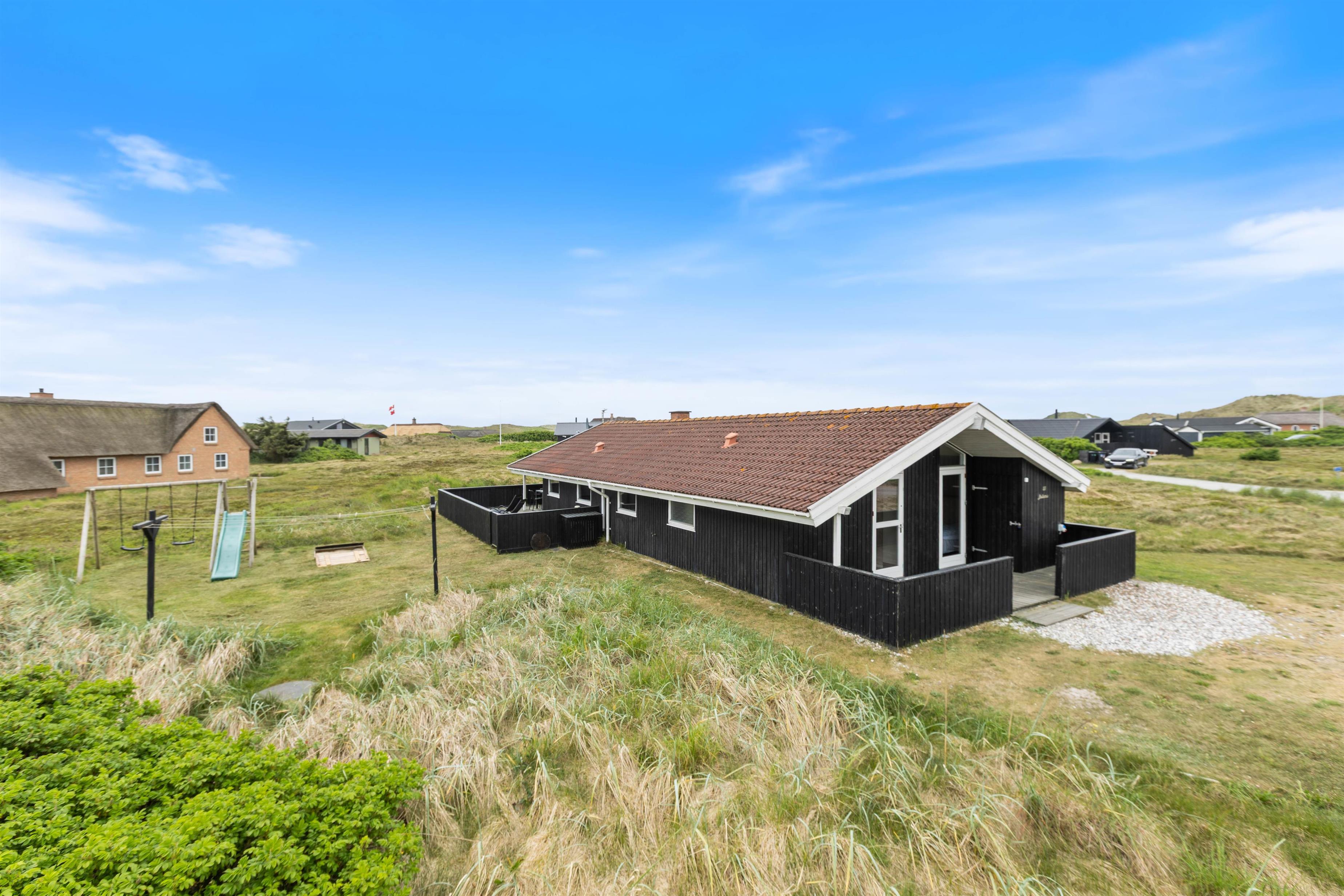 Sommerhuset ligger på en skøn naturgrund i lyngbakkerne og har en dejlig solrig træterrasse, som er lukket og delvis overdækket, med en skøn udsigt til klitterne. Her kan I tilbringe mange gode timer med afslapning. På den store naturgrund kan børnene lege i sandkassen eller gyngestativet, mens de voksne nyder udsigten ud over den jyske natur. Om aftenen kan I tænde op i grillen og tilberede en lækker middag i den lune aftensol.