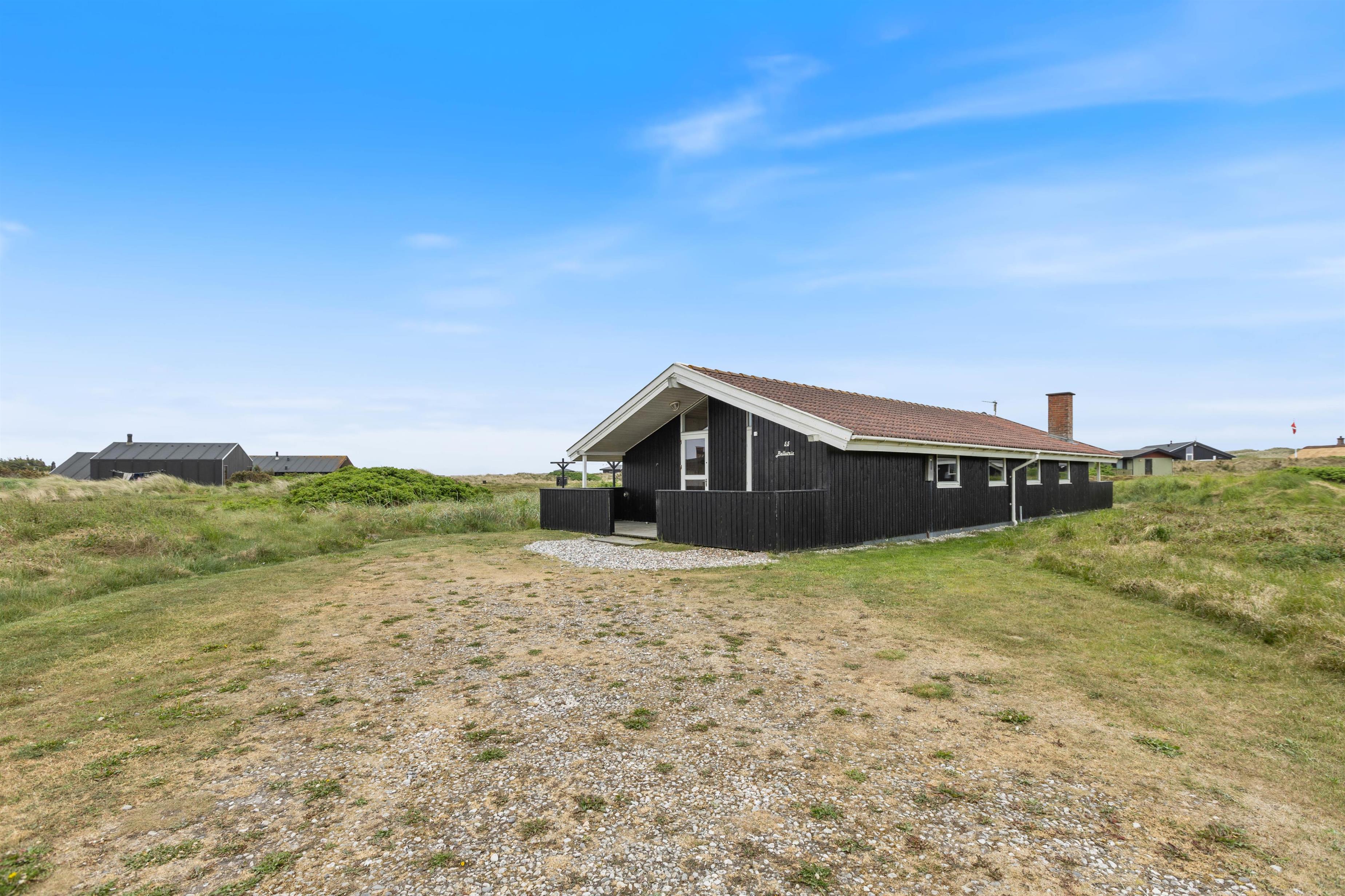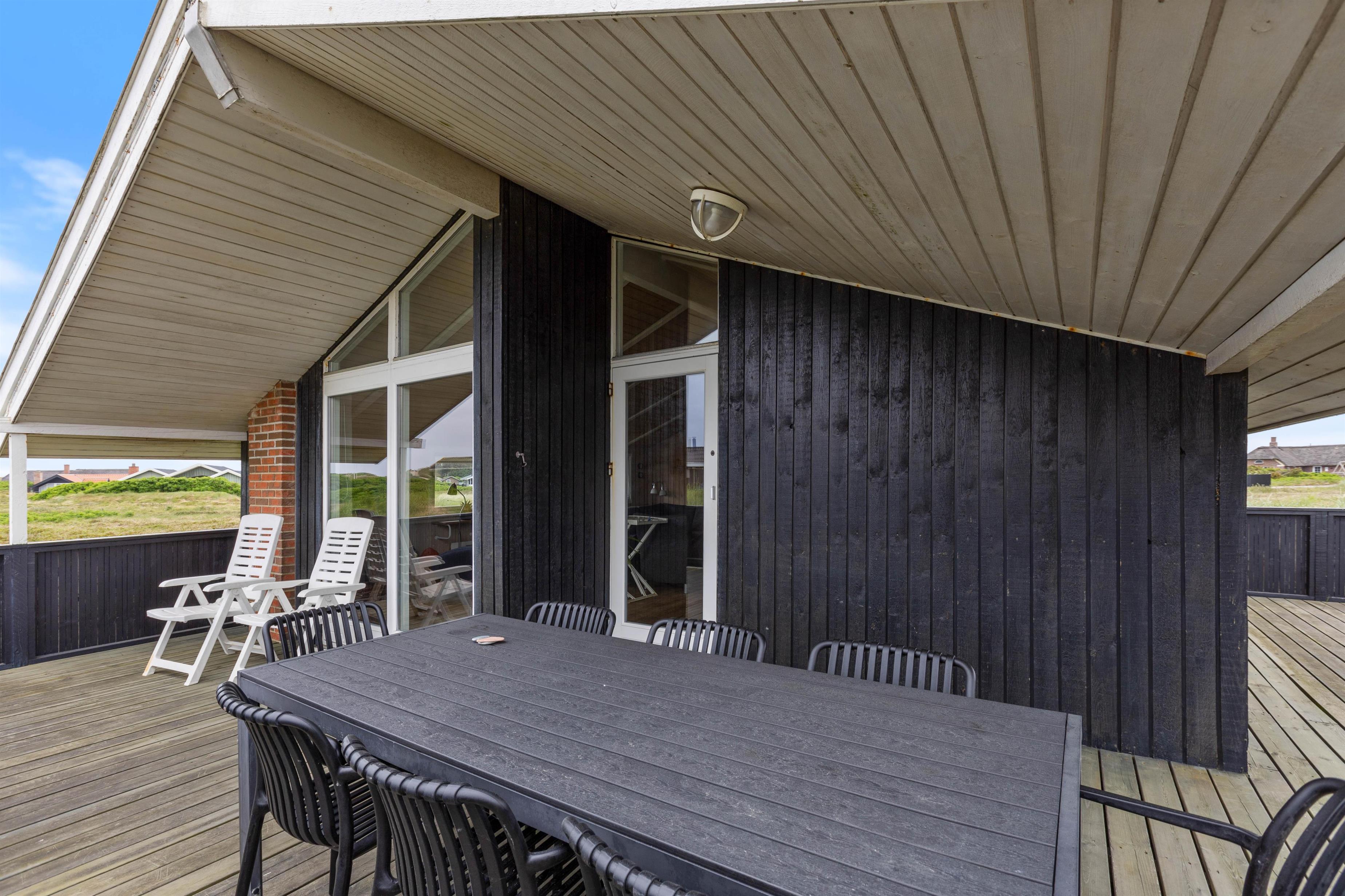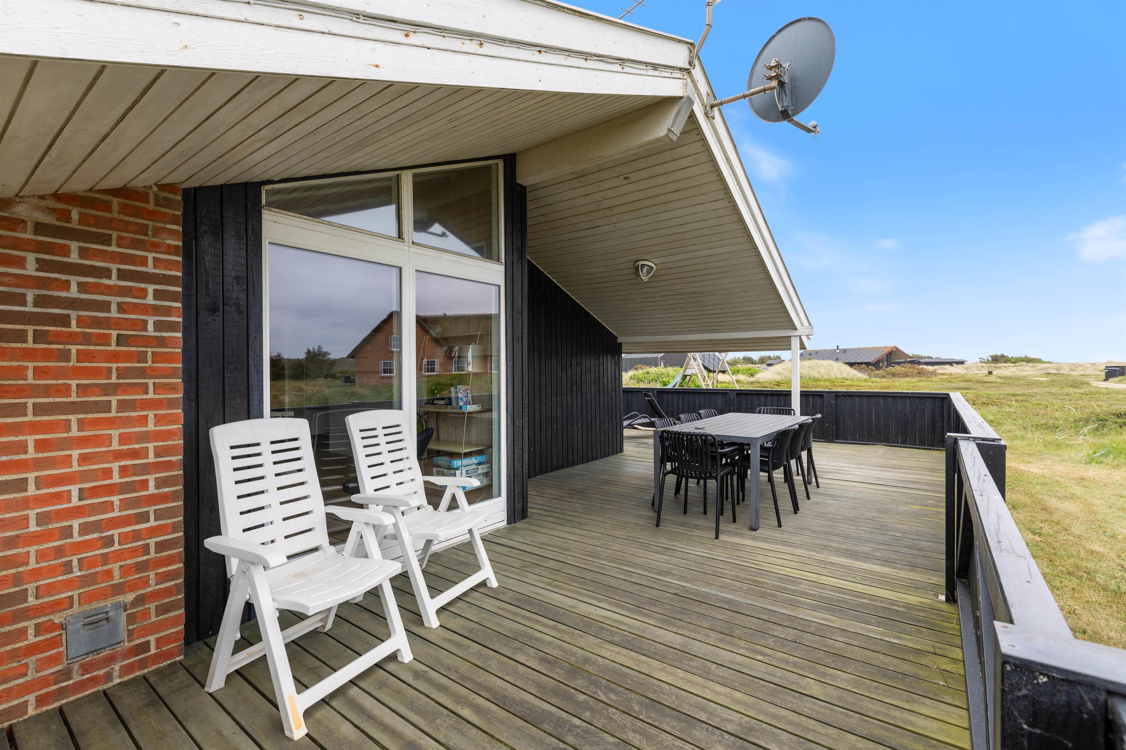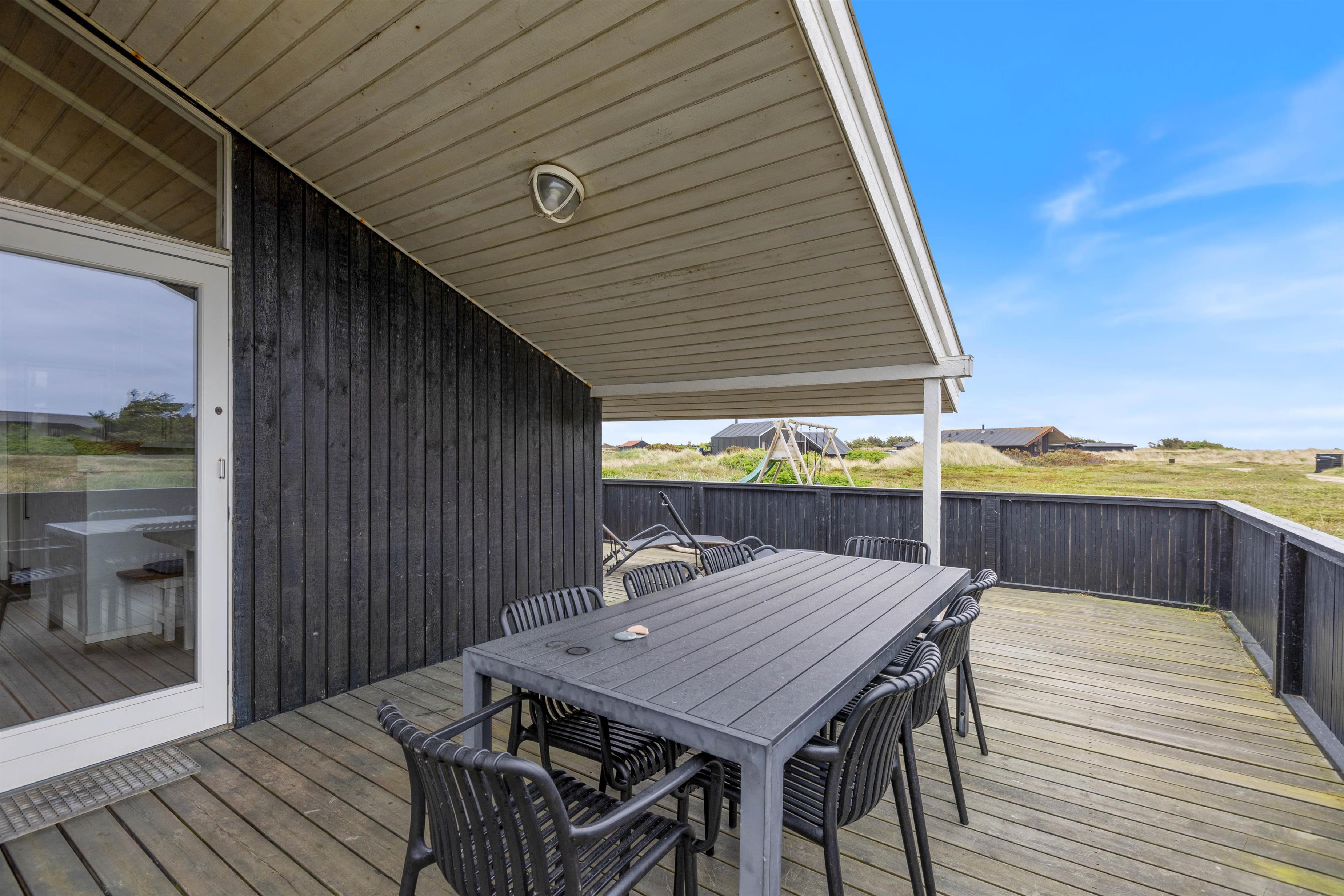 Sommerhuset ligger på en skøn naturgrund i lyngbakkerne og har en dejlig solrig træterrasse, som er lukket og delvis overdækket, med en skøn udsigt til klitterne. Her kan I tilbringe mange gode timer med afslapning. På den store naturgrund kan børnene lege i sandkassen eller gyngestativet, mens de voksne nyder udsigten ud over den jyske natur. Om aftenen kan I tænde op i grillen og tilberede en lækker middag i den lune aftensol.