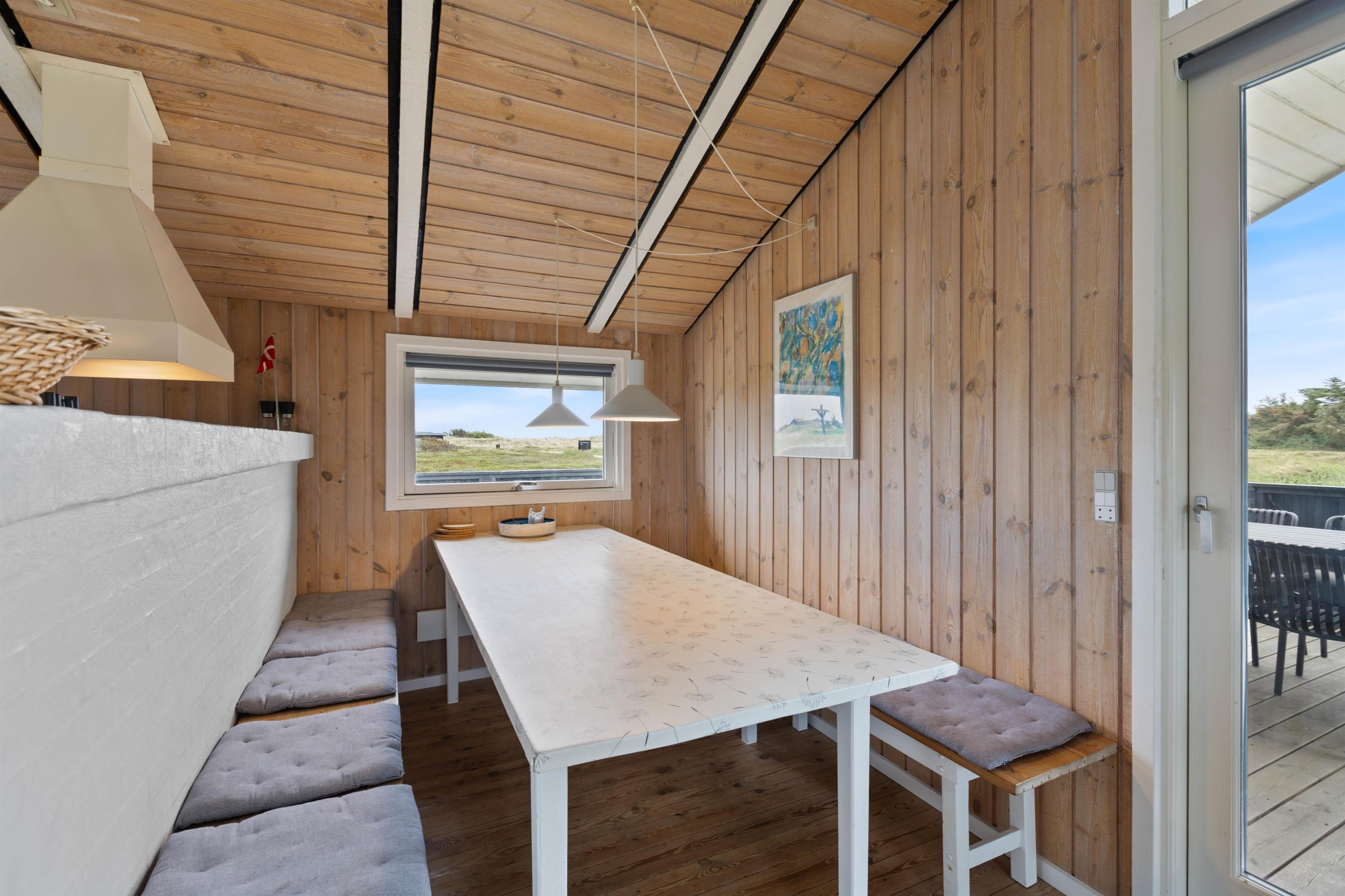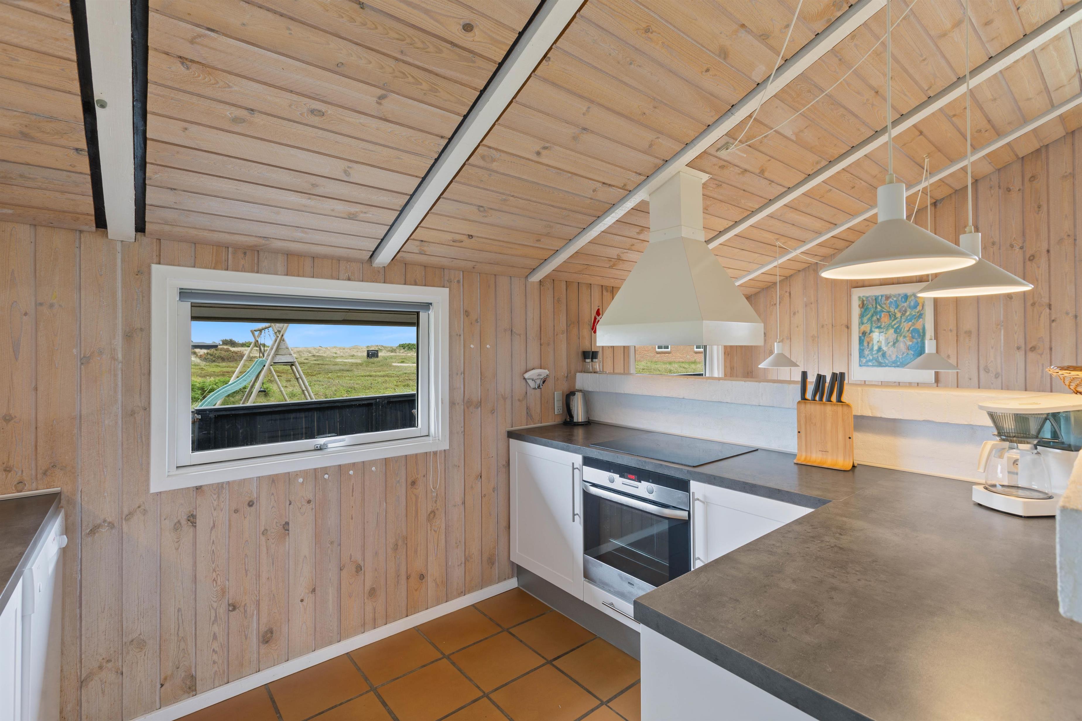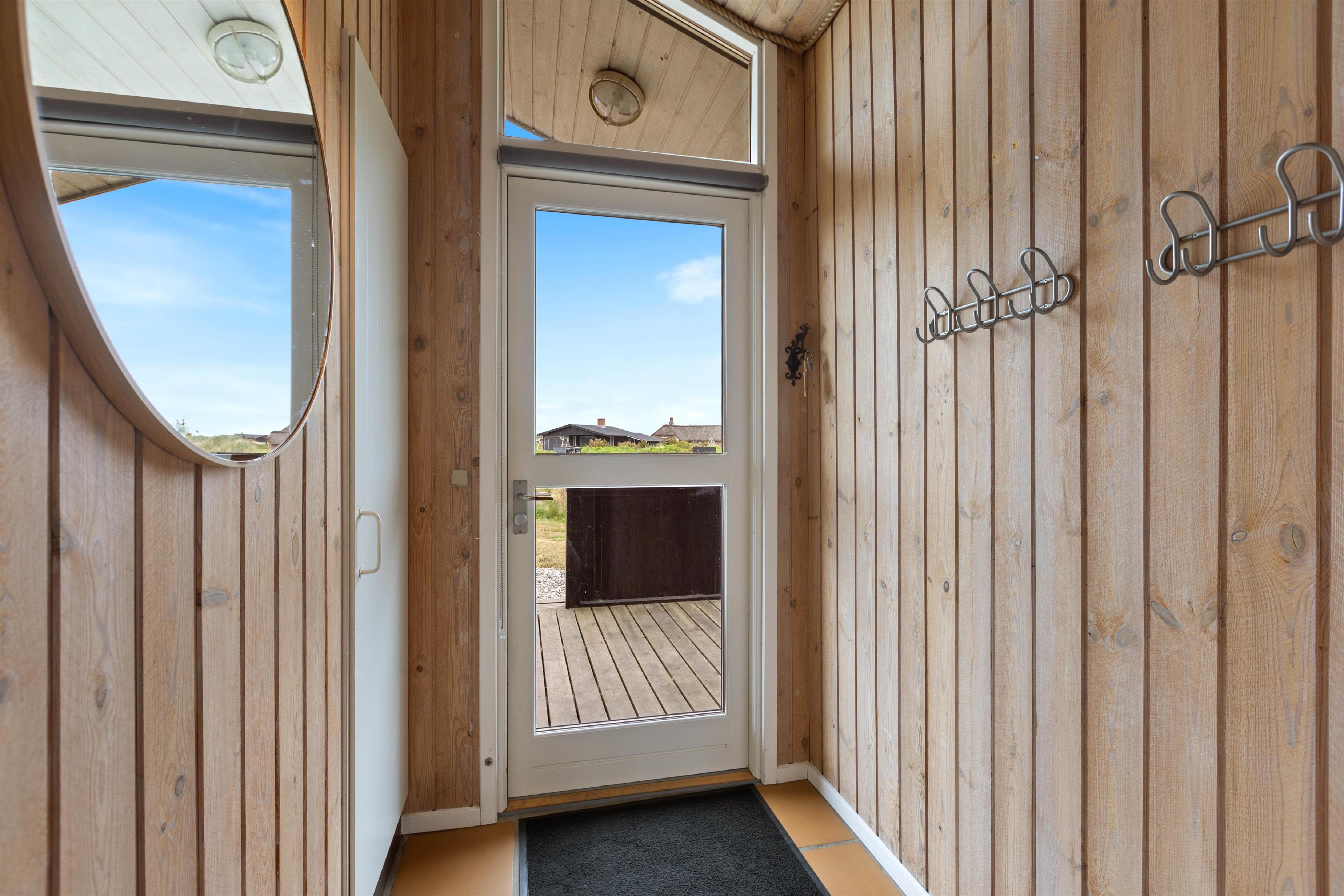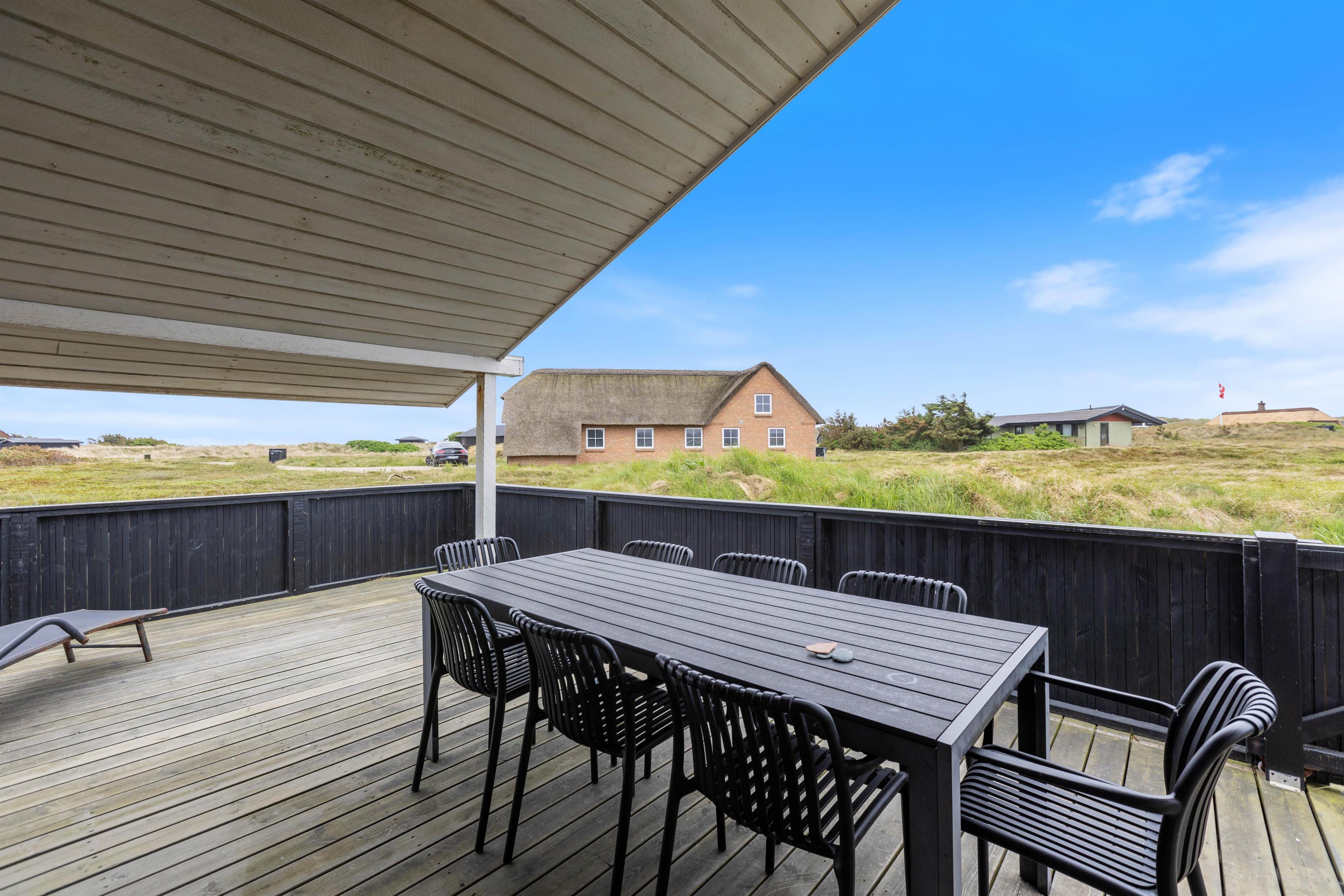 Sommerhuset ligger på en skøn naturgrund i lyngbakkerne og har en dejlig solrig træterrasse, som er lukket og delvis overdækket, med en skøn udsigt til klitterne. Her kan I tilbringe mange gode timer med afslapning. På den store naturgrund kan børnene lege i sandkassen eller gyngestativet, mens de voksne nyder udsigten ud over den jyske natur. Om aftenen kan I tænde op i grillen og tilberede en lækker middag i den lune aftensol.
