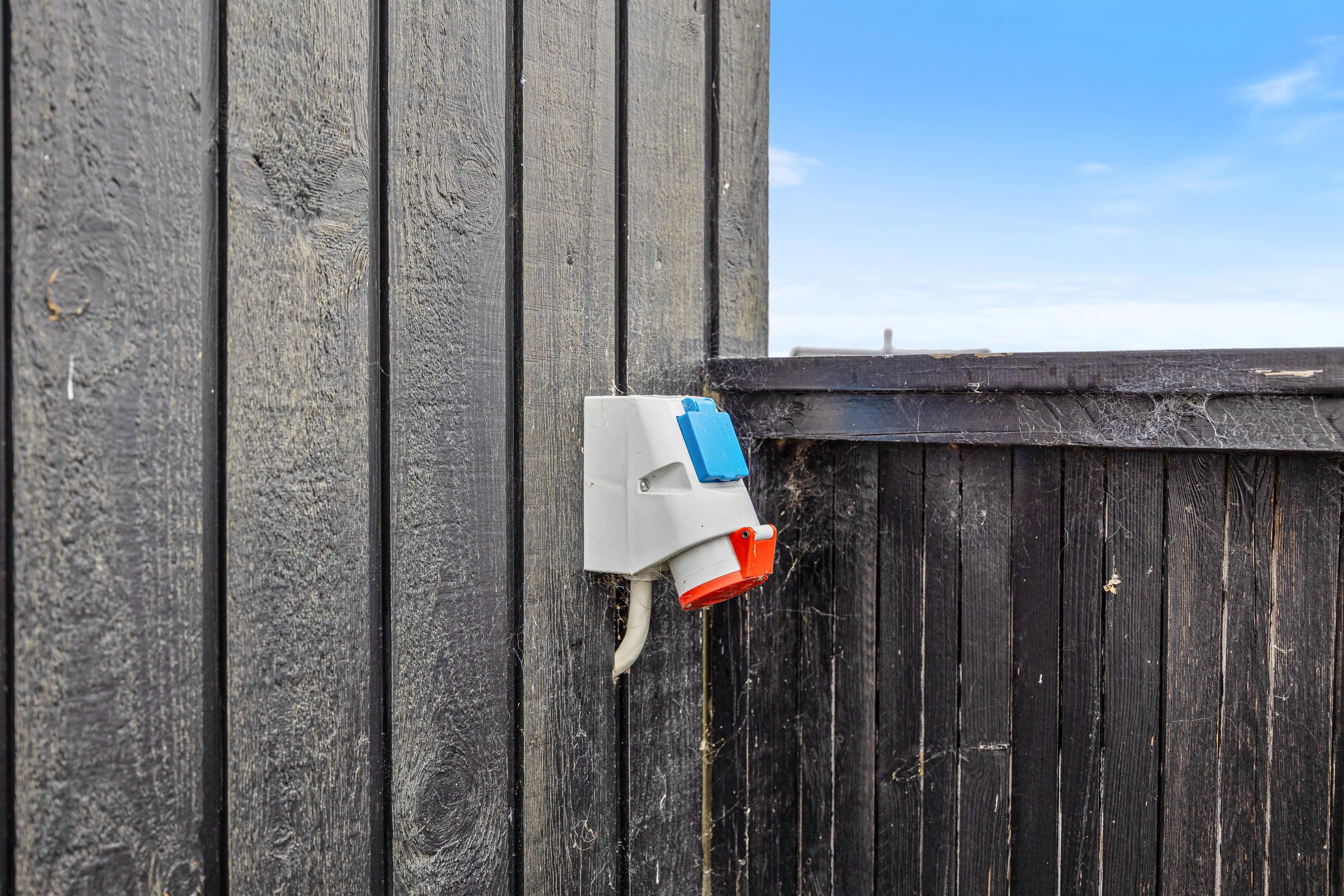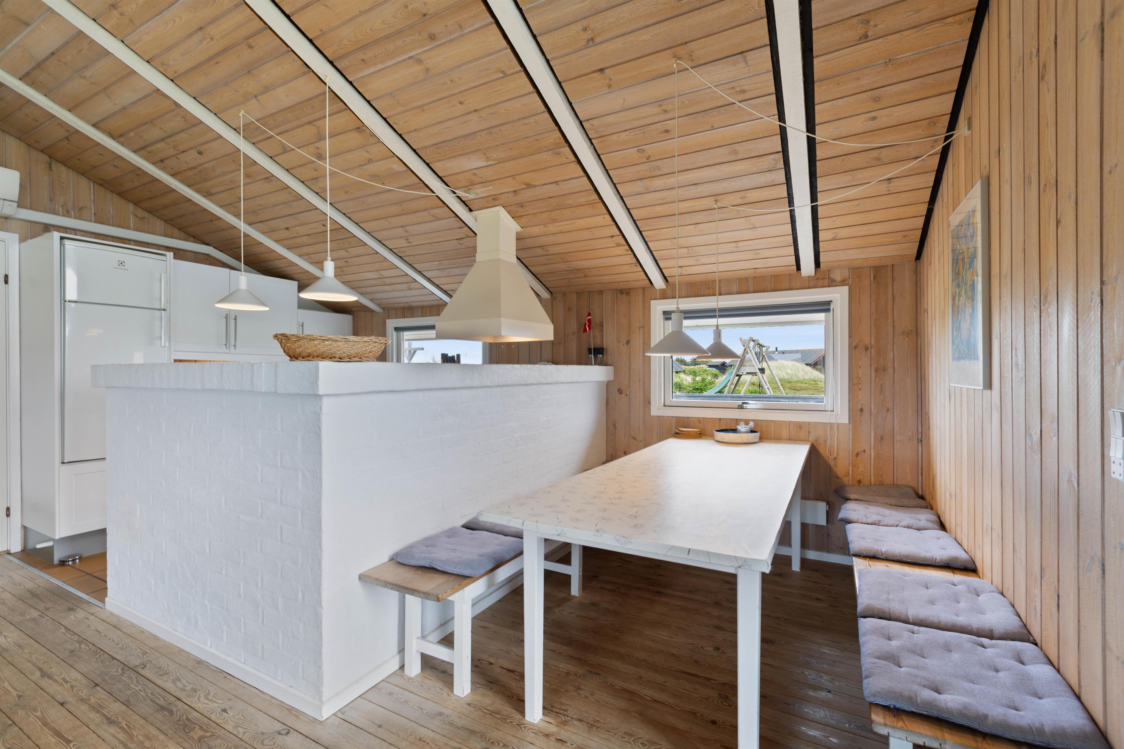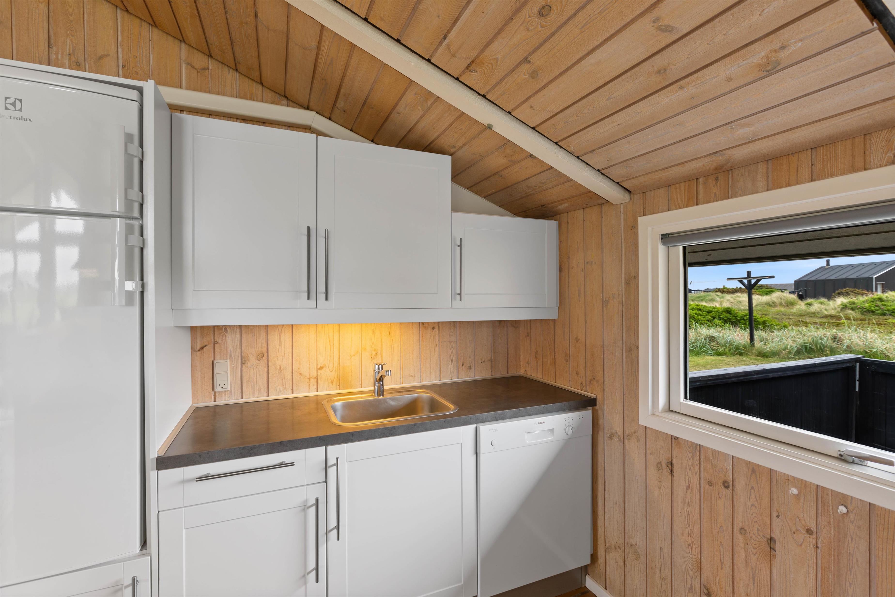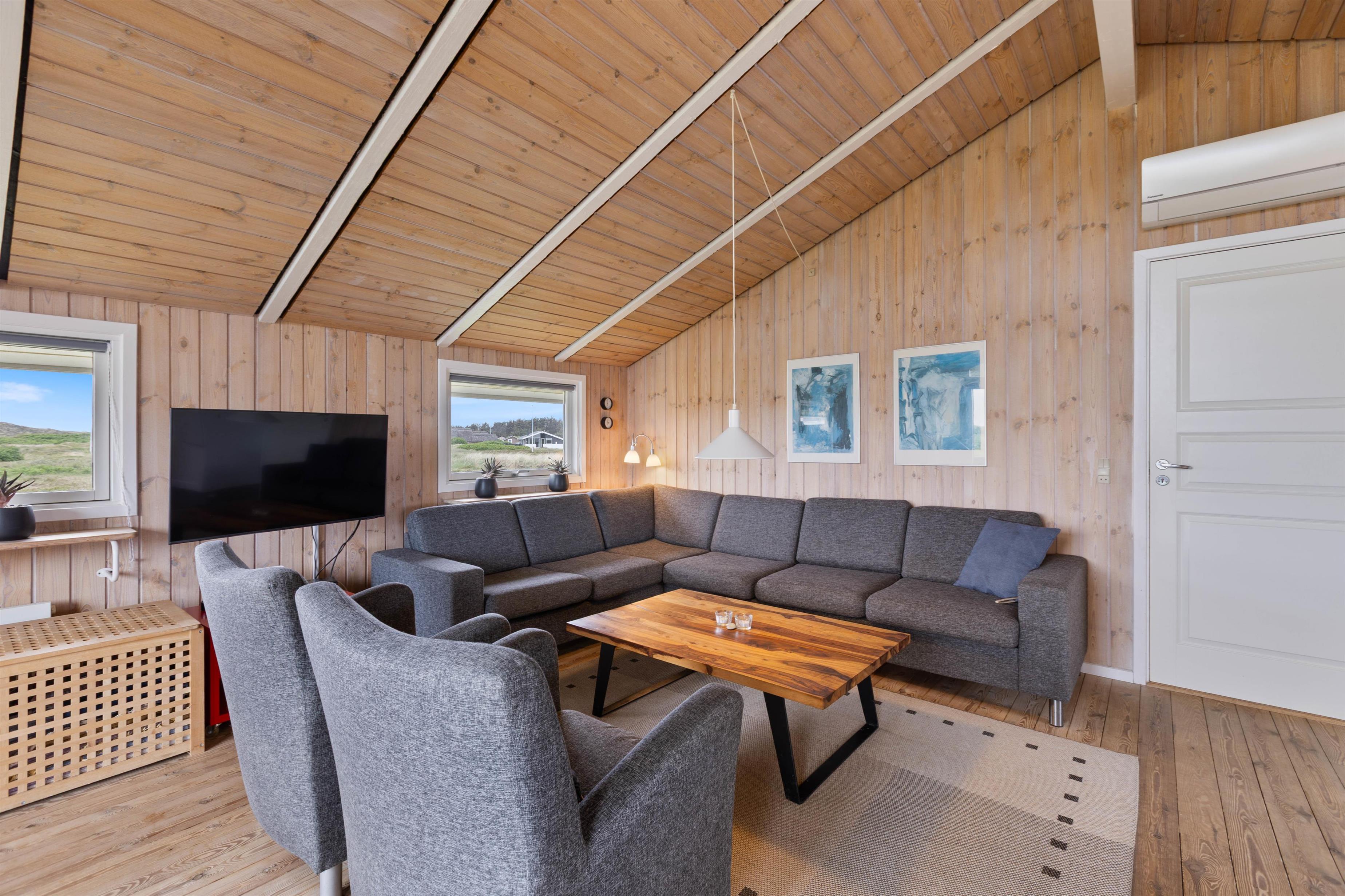 Sommerhuset ligger på en skøn naturgrund i lyngbakkerne og har en dejlig solrig træterrasse, som er lukket og delvis overdækket, med en skøn udsigt til klitterne. Her kan I tilbringe mange gode timer med afslapning. På den store naturgrund kan børnene lege i sandkassen eller gyngestativet, mens de voksne nyder udsigten ud over den jyske natur. Om aftenen kan I tænde op i grillen og tilberede en lækker middag i den lune aftensol.