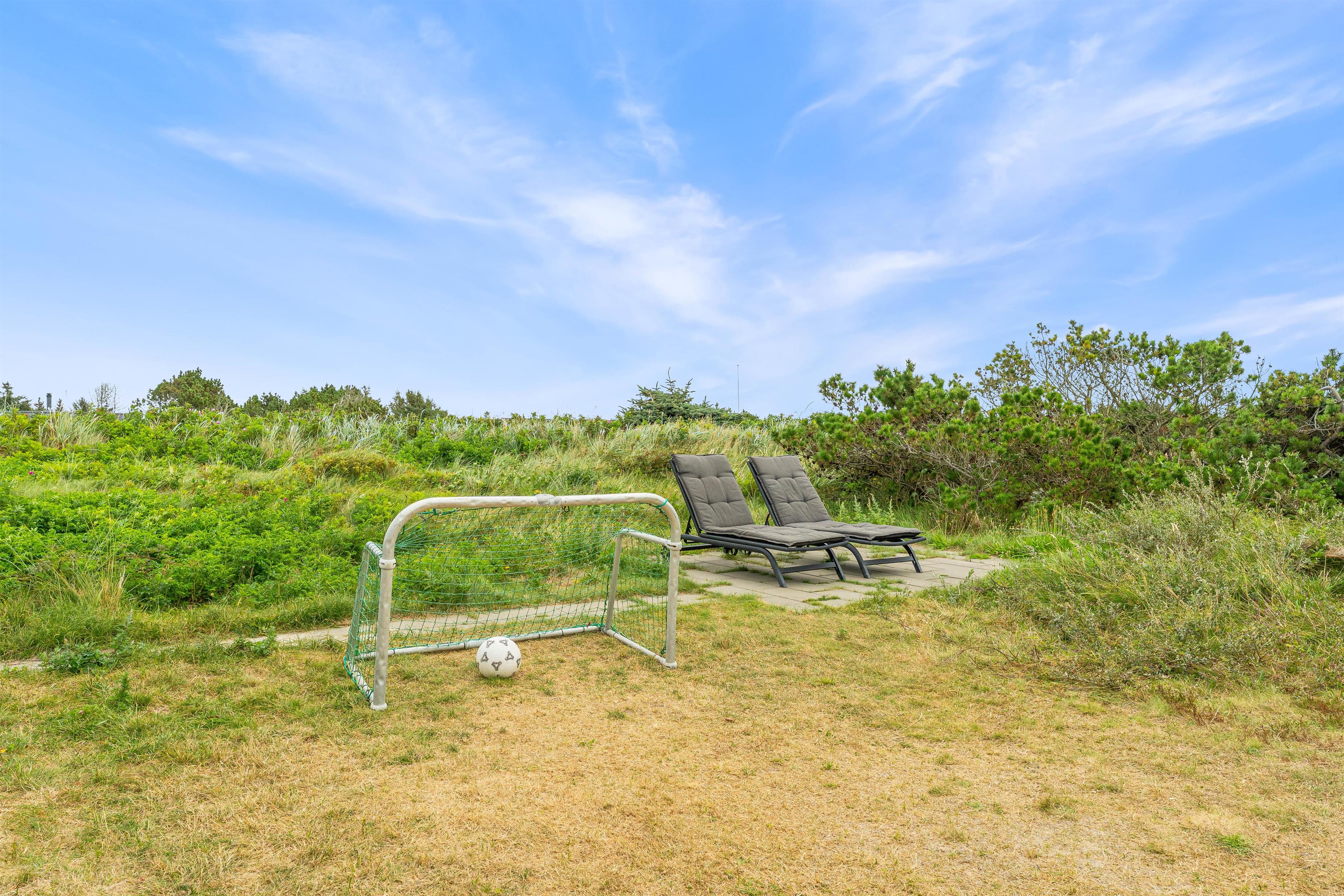 Udenfor finder I en god terrasse med flere mulige siddekroge og en overdækket del. Der er sørget for både havemøbler, liggestole og grill til de varme sommerdage, og til de yngste feriegæster er der lavet en sandkasse og et gyngestativ.