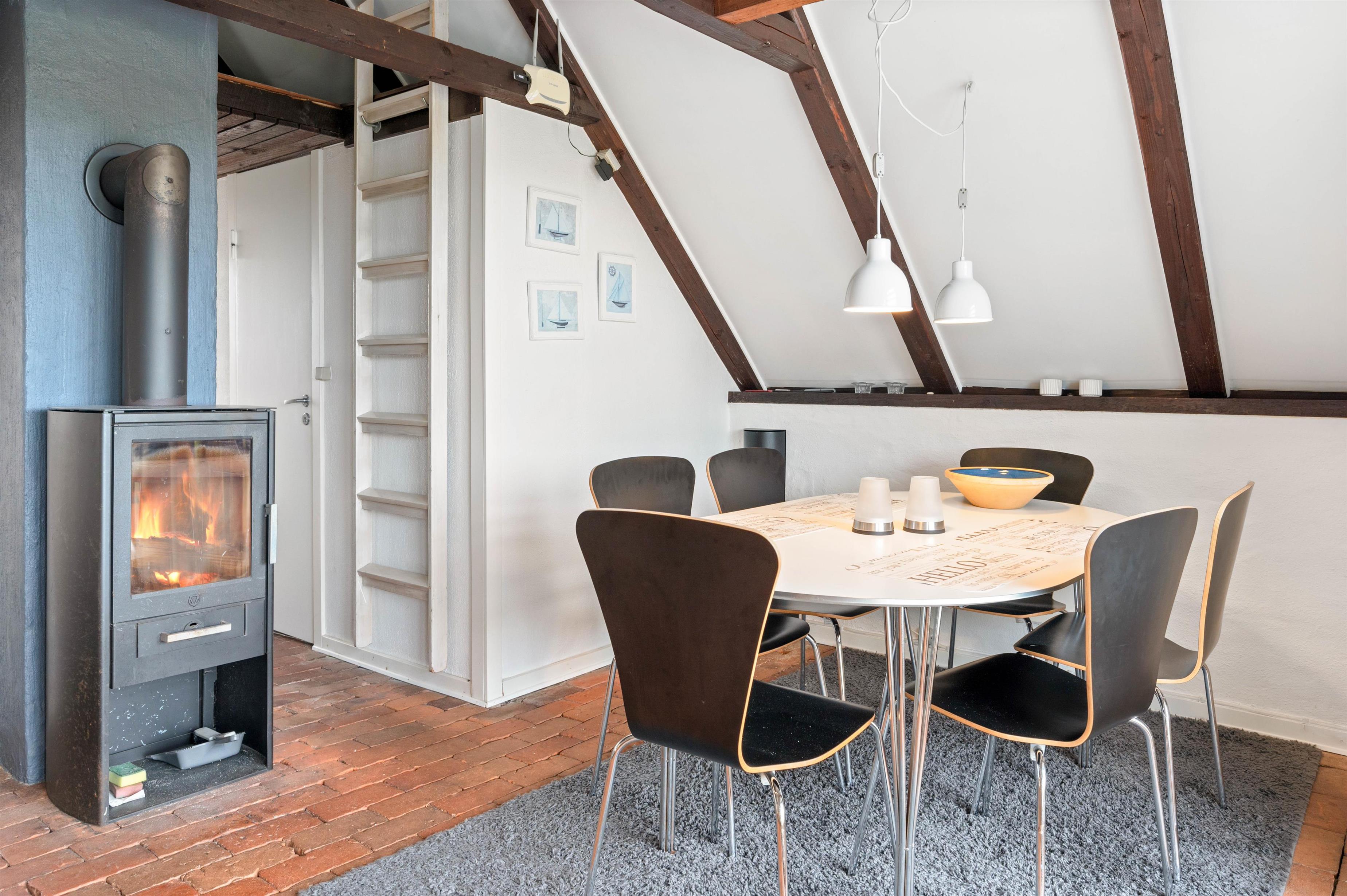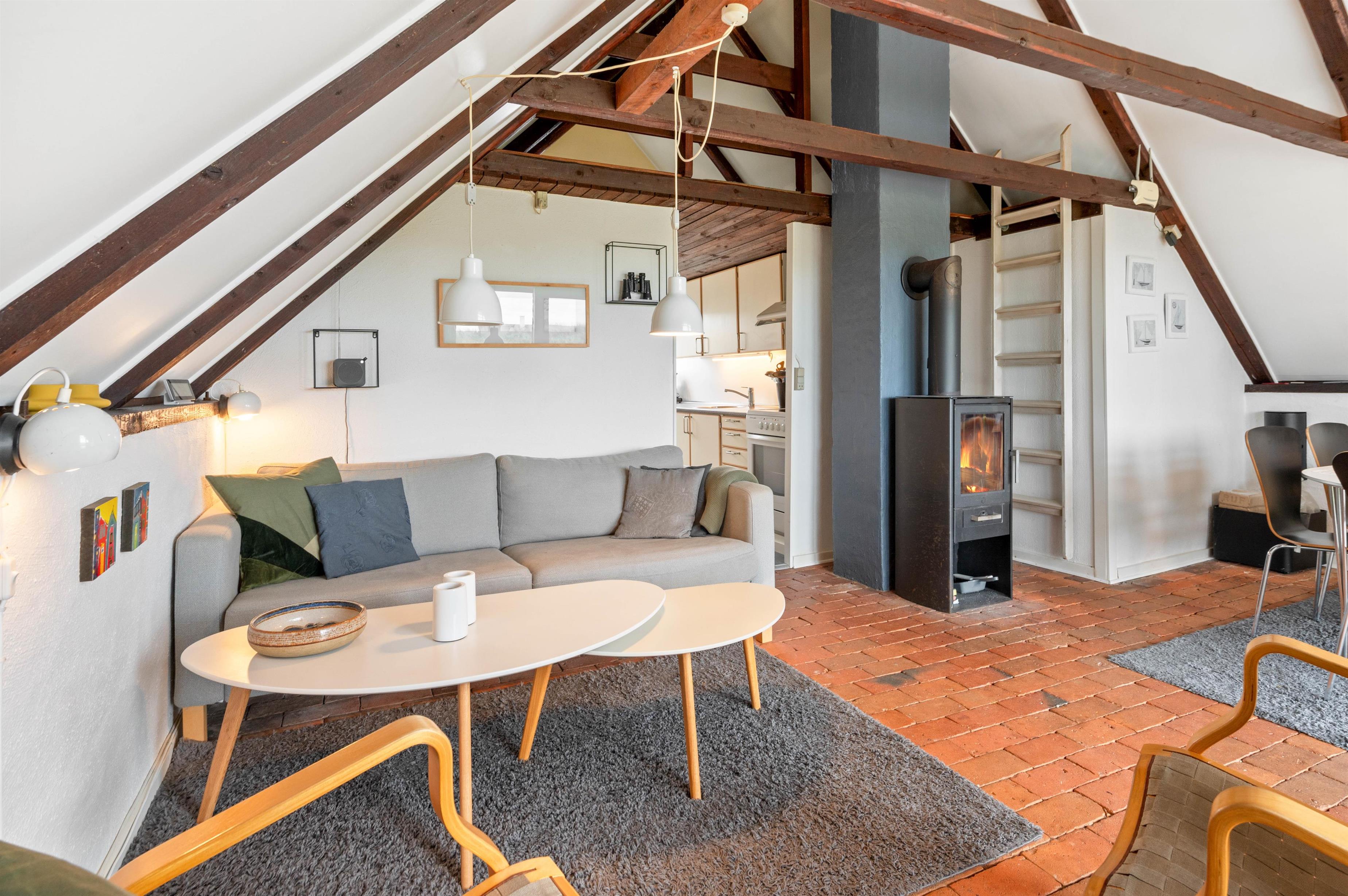 Feriehuset hjerte er opholds- og spiseområdet det er åbent og let tilgængeligt fra køkkenområdet. Her er et råt stengulv og komfortable møbler i rolige nuancer. Her er plads til afslapning og hygge med familien. Her kan I spille brætspil eller slappe af med en god bog på sofaen, imens brændeovnen hyggeligt knitrer i baggrunden.