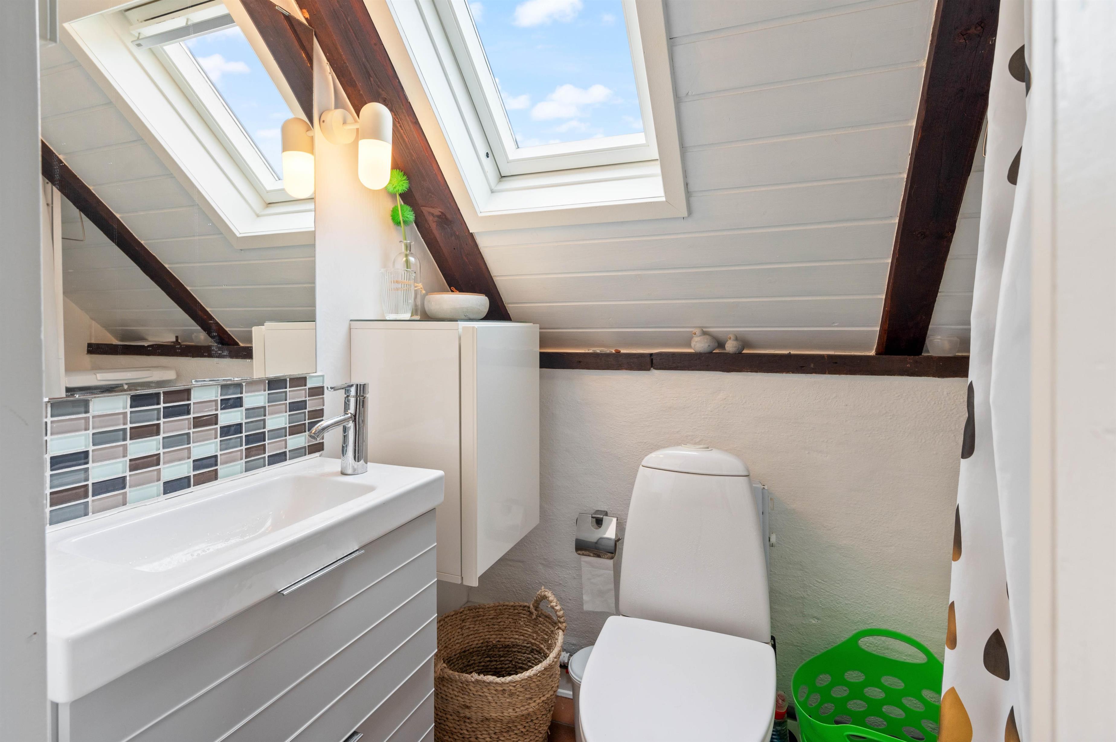 Feriehuset har 2 soveværelser – begge udstyret med ¾ senge, 140x200. Det ene soveværelse ligger ved siden af køkkenet, mens det andet ligger bag spisepladsen og kun er adskilt af et gardin. Feriehuset har et mindre badeværelse med bruseniche og vaskemaskine.