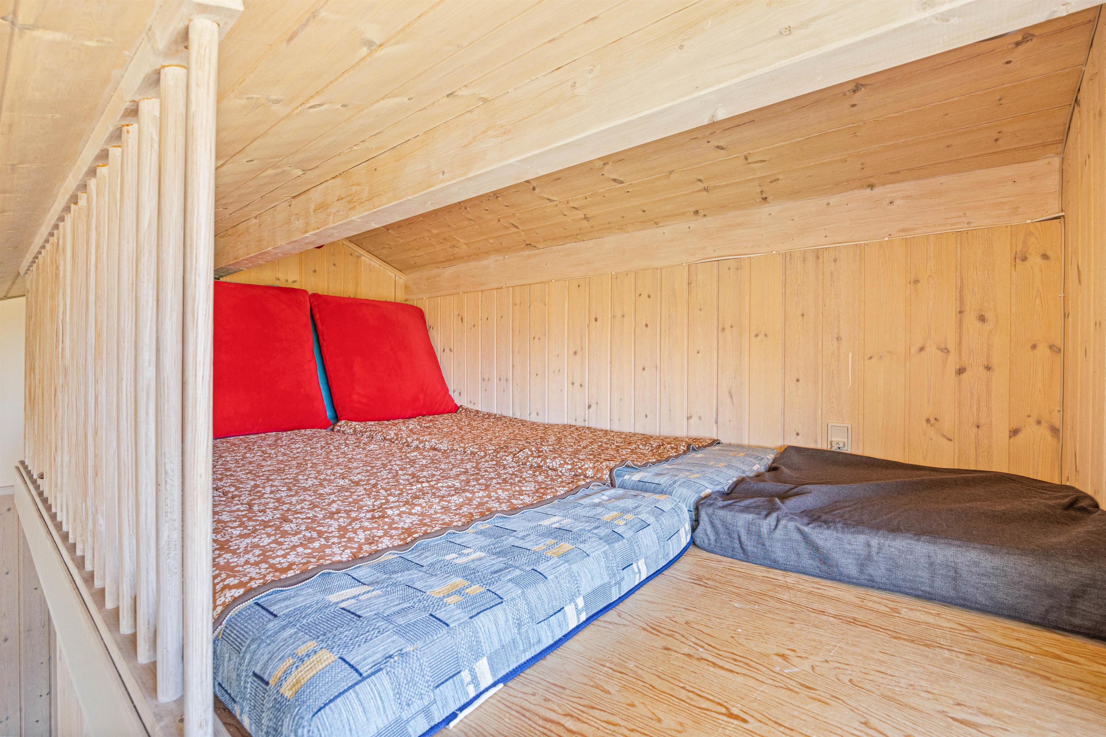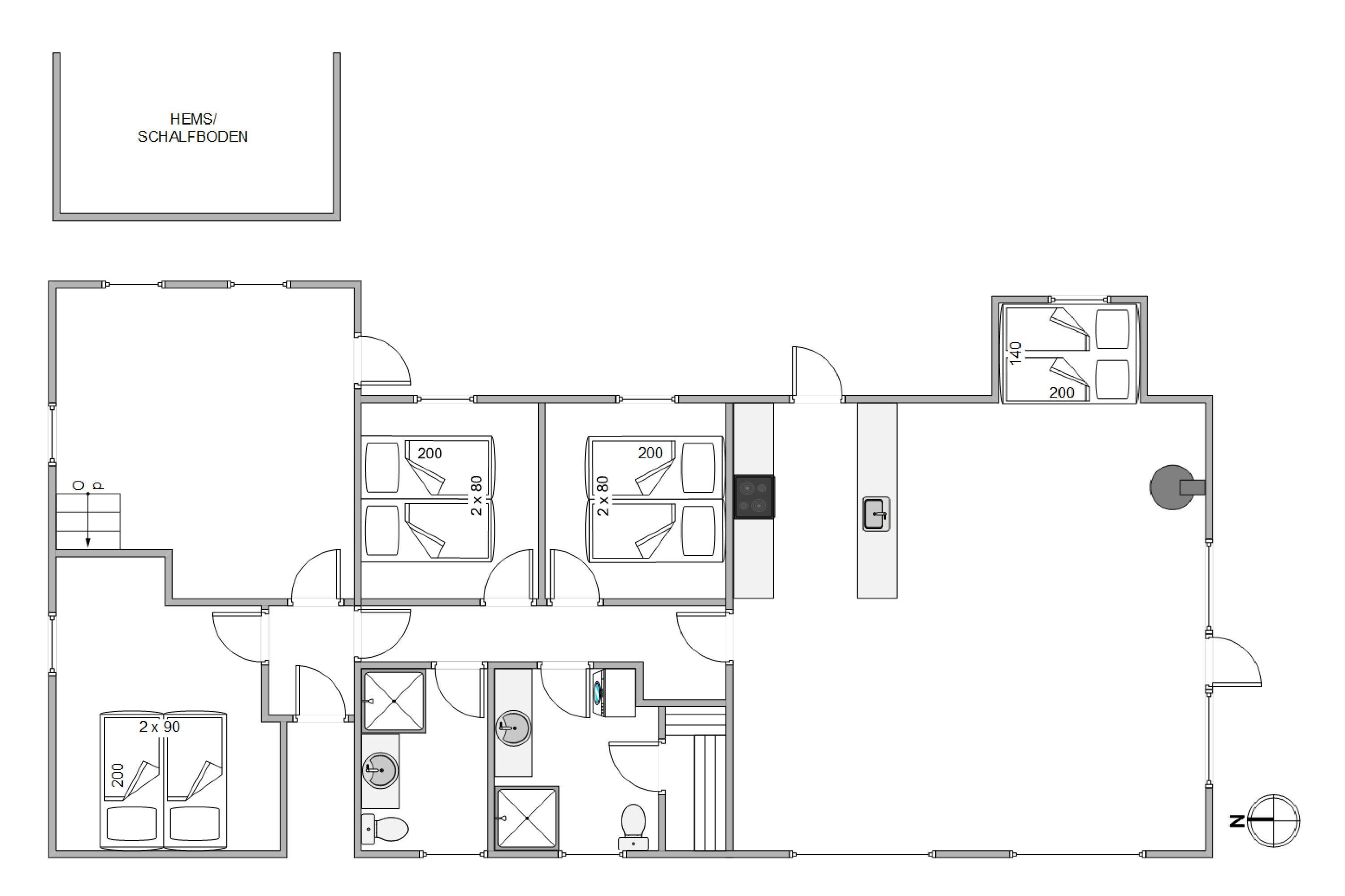 Med 3 soveværelser, en alkove og hems samt 2 badeværelser tilbyder huset god plads til 8 personer. I skal være opmærksomme på, at der kun er gulvvarme på ét af badeværelserne. Sommerhusets sauna finder I på det ene badeværelse, hvor I kan sætte jer ind og nyde roen.