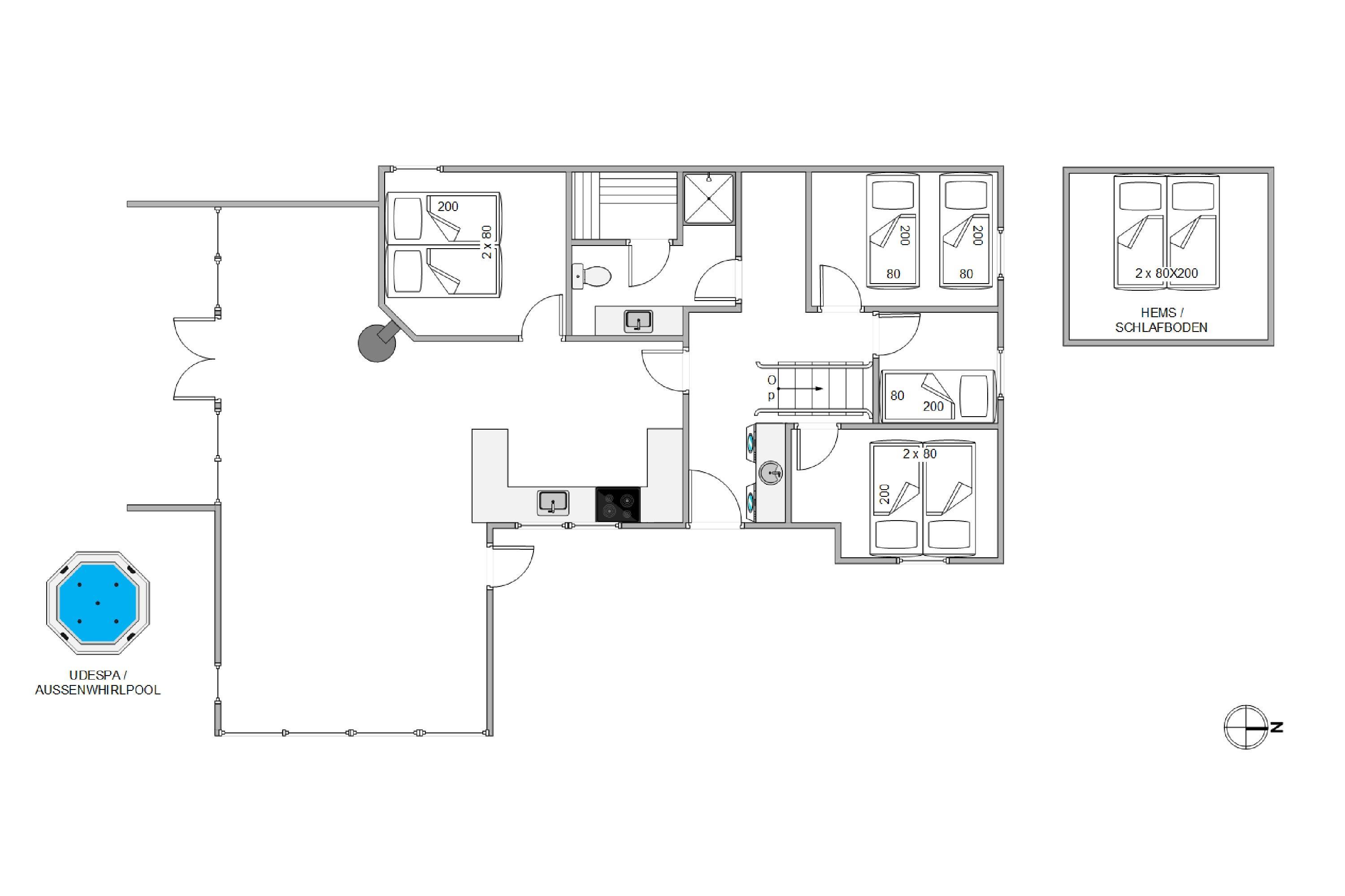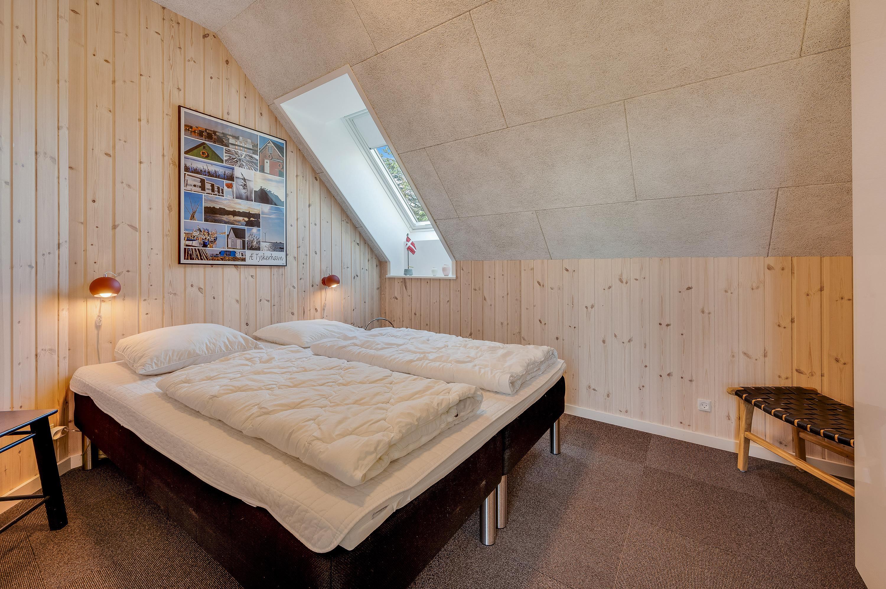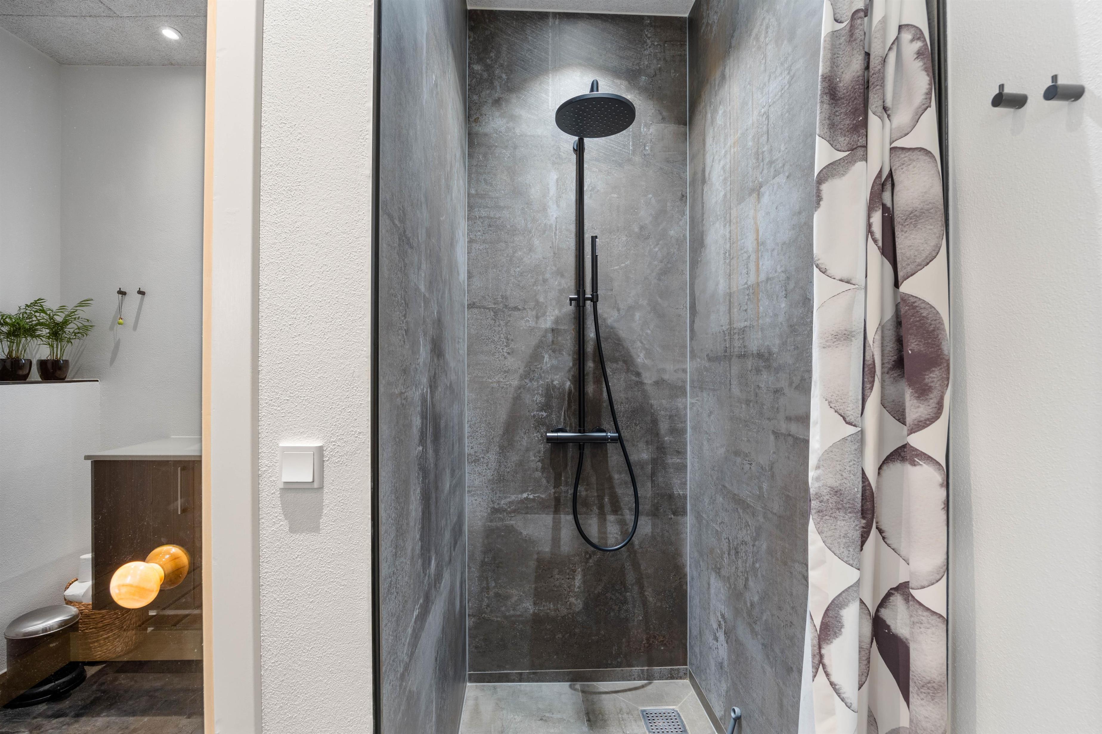 Feriehuset råder over 1 badeværelse med gulvvarme og adgang til saunaen. Børnene kan trække sig tilbage på hemsen, hvor der ligger ekstra madrasser.
