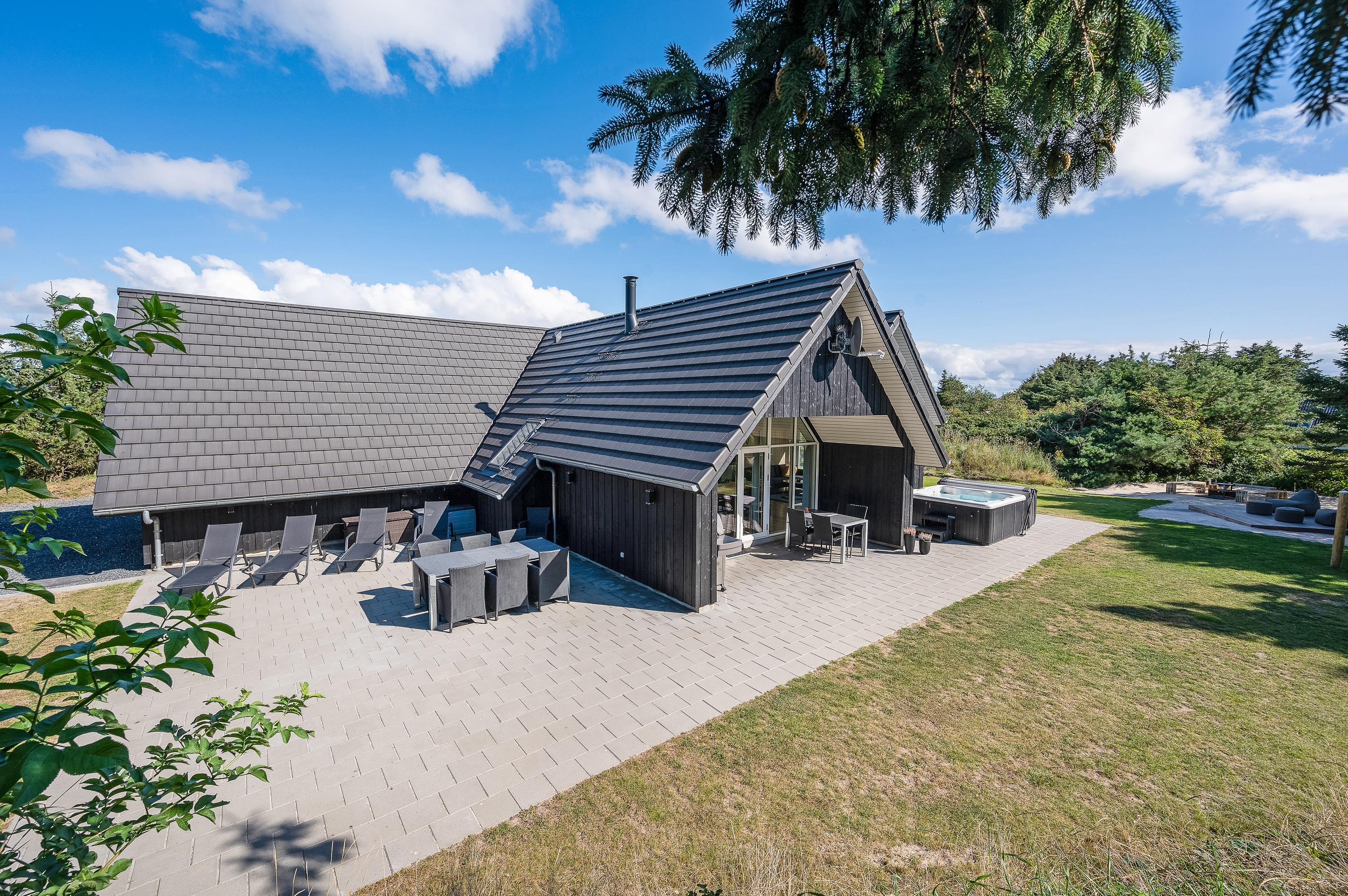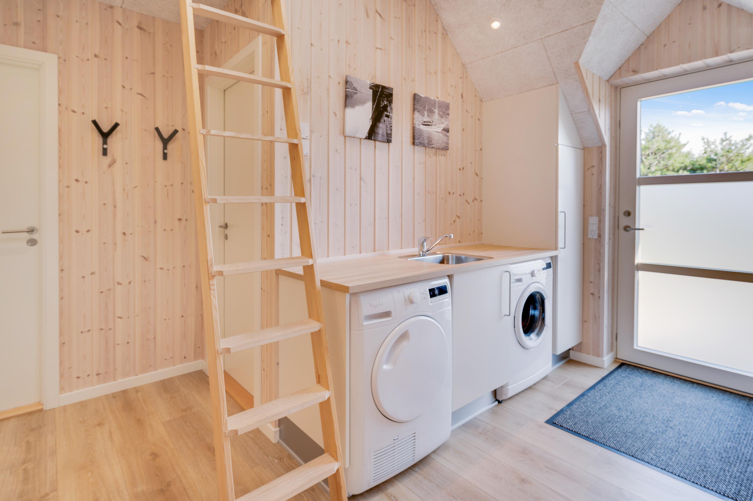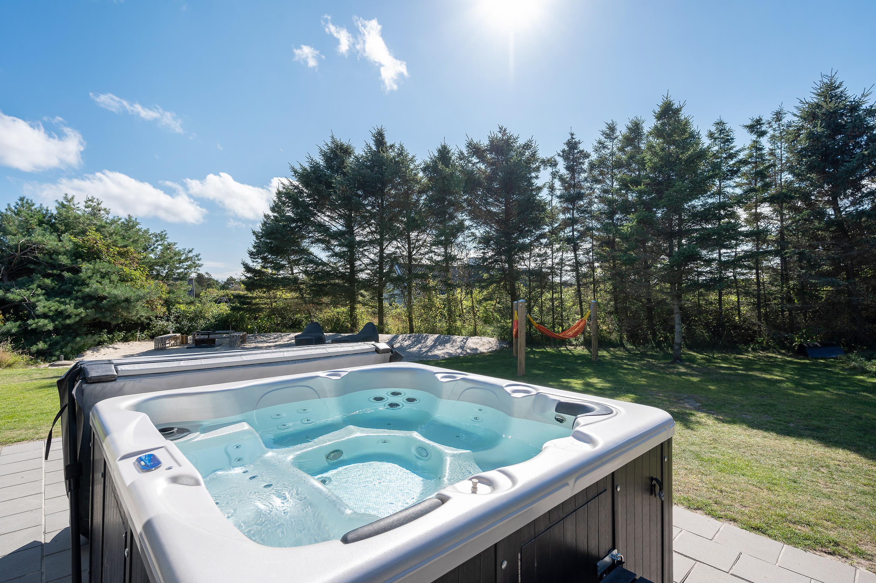 På den afskærmede terrasse finder I det luksus-udendørs-spabad. En tur i udespaen kan kombineres med nogle timer i saunaen for at få kroppen helt ned i gear. Ved feriehuset ligger også en lukket terrasse – perfekt til familiens børn. Hvis tøjet bliver beskidt, klarer vaskemaskinen og tørretumbleren nemt tøjvasken.