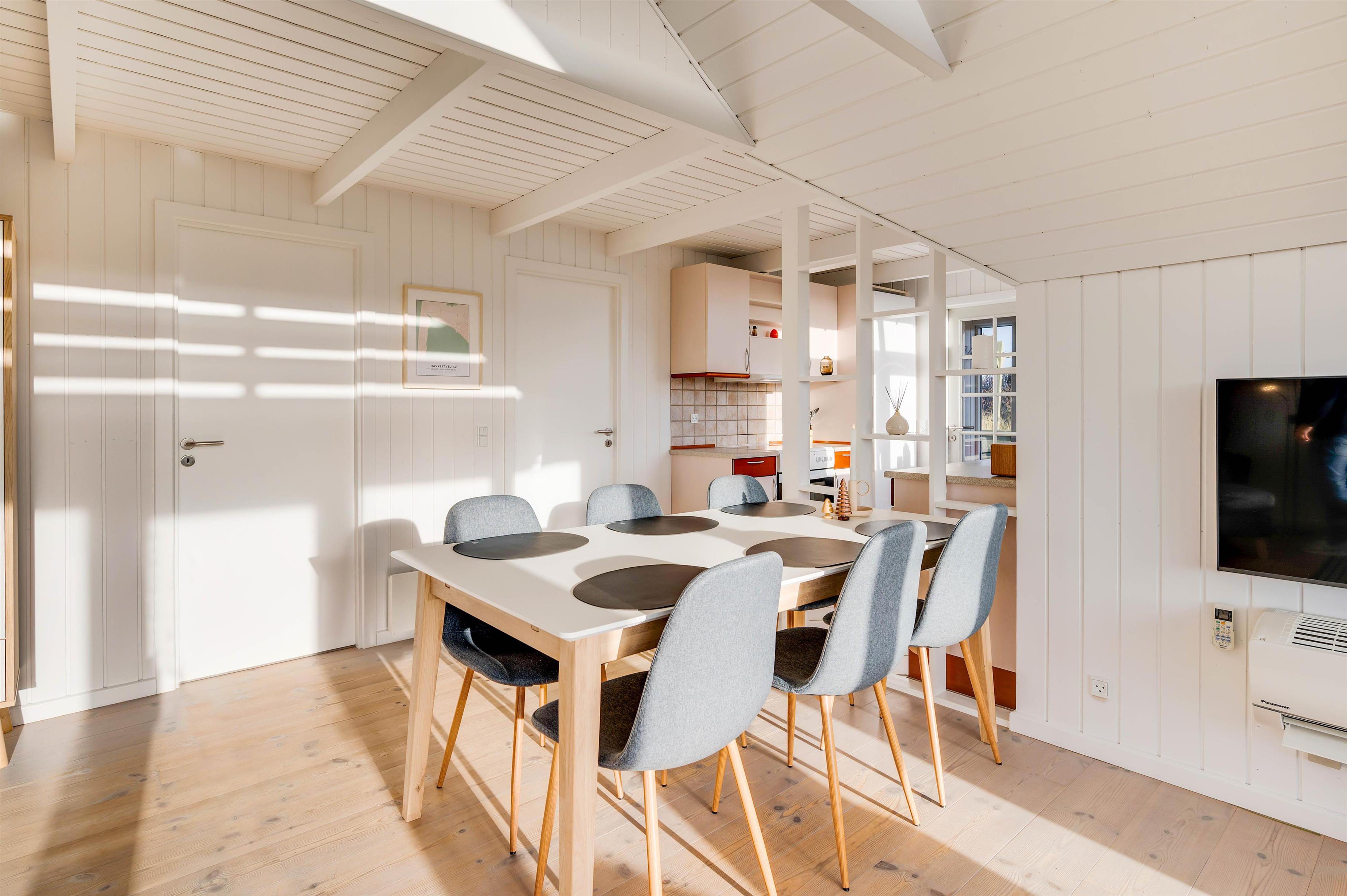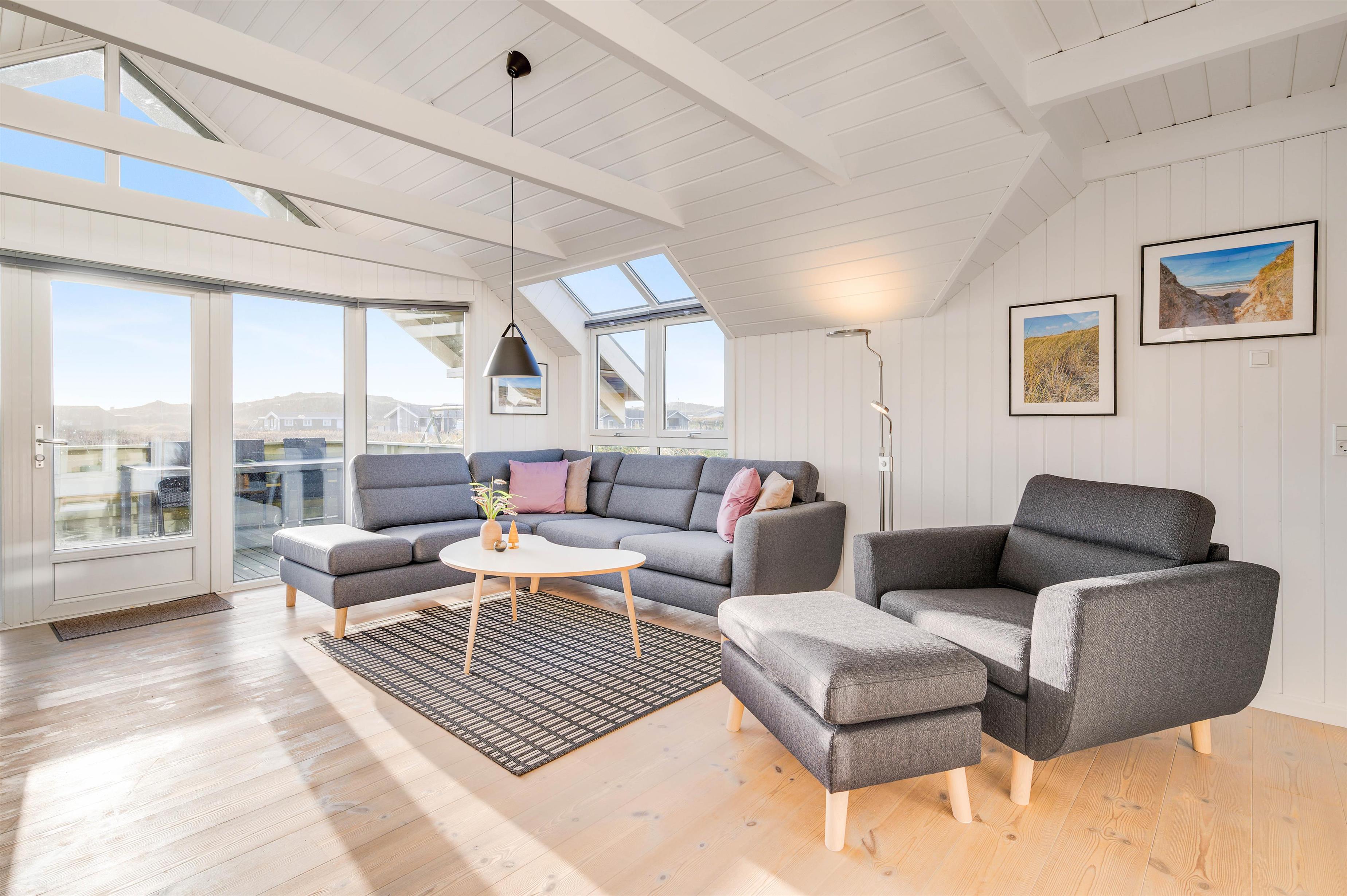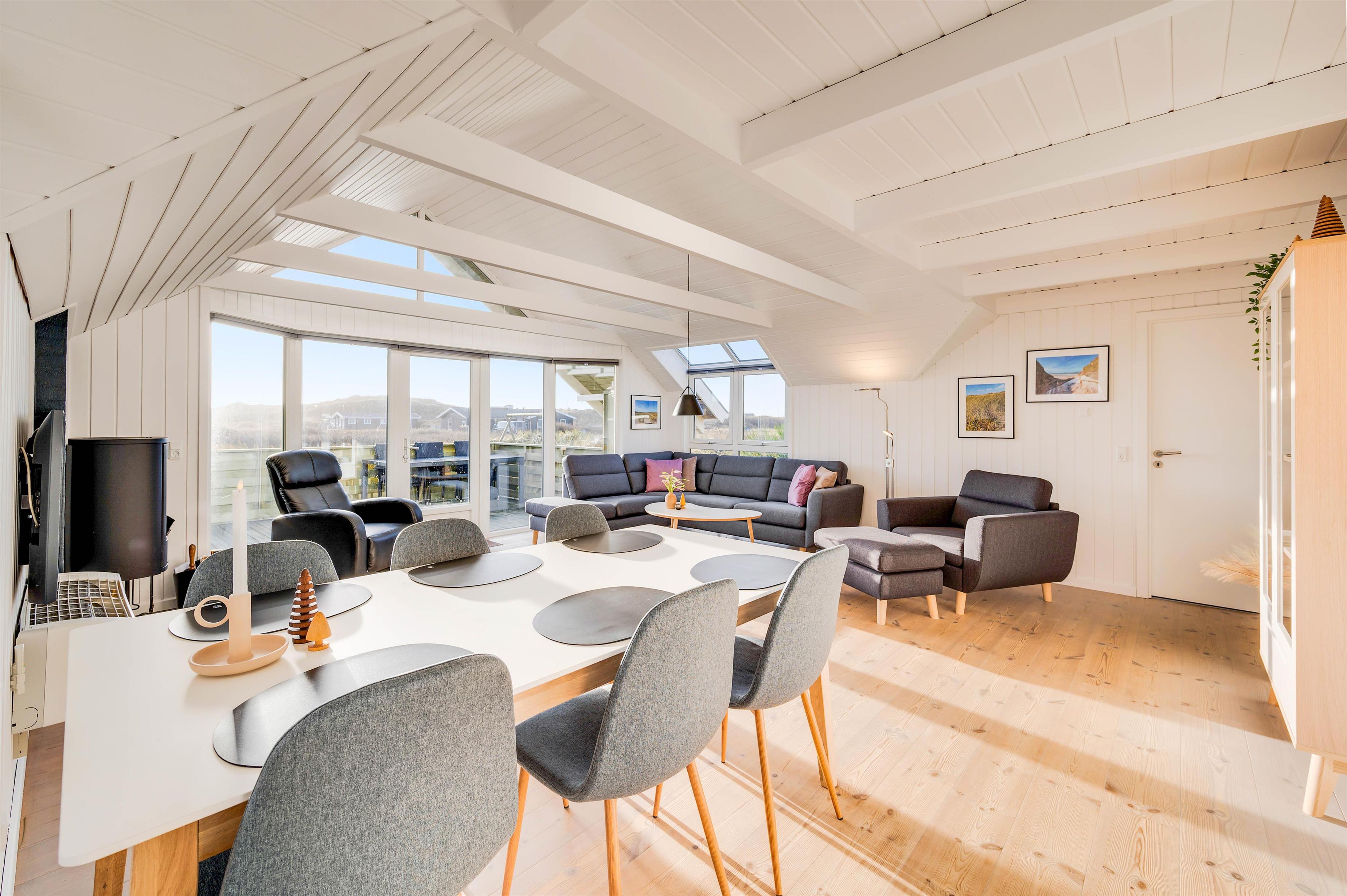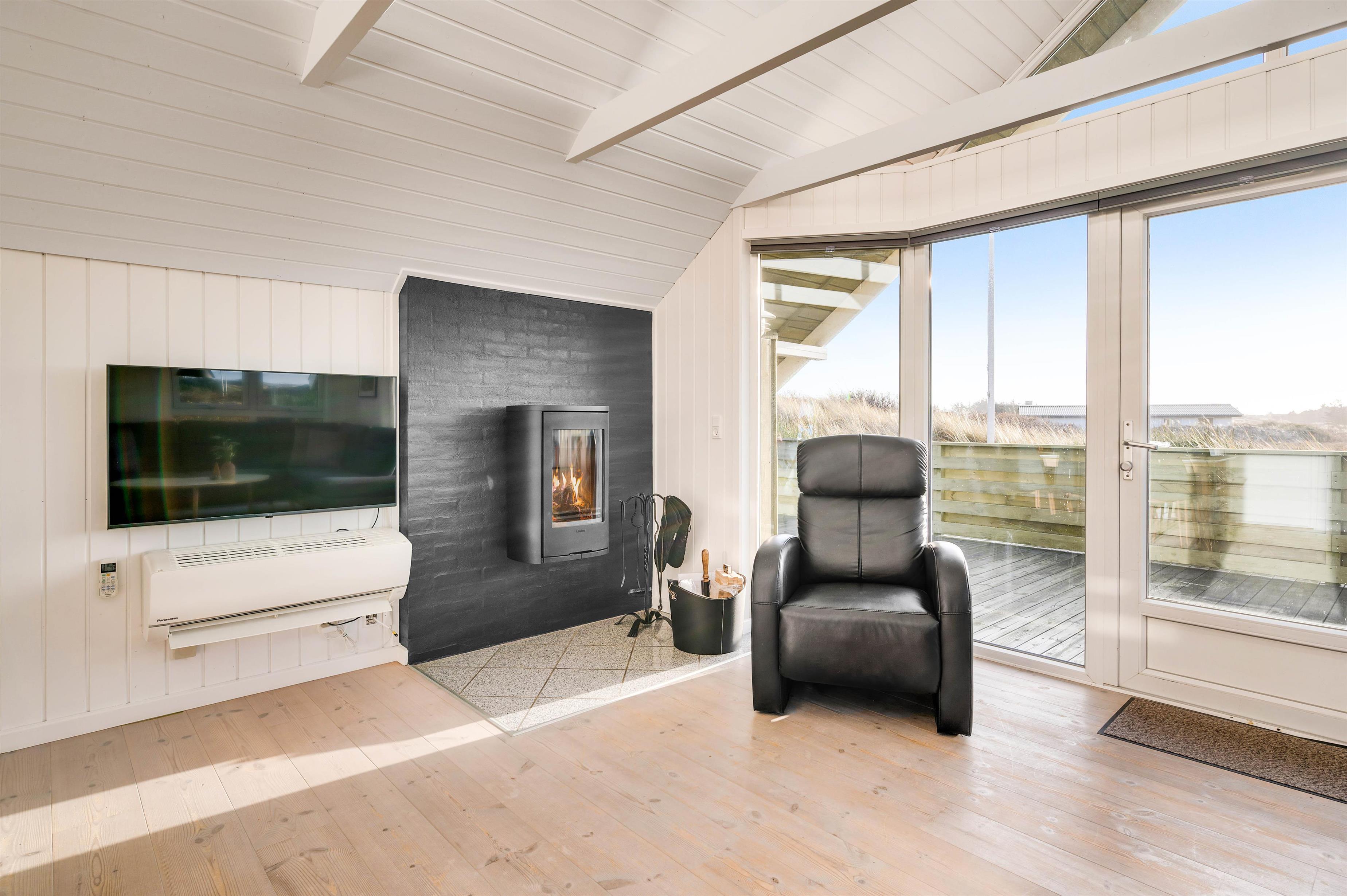 Stuen med brændeovn og det store vinduesparti er rummelig og hyggelig. Især de synlige træbjælker og vinduer i kip skaber ekstra hygge, mens I sidder og slapper af efter en god dag i det vestjyske klitlandskab.