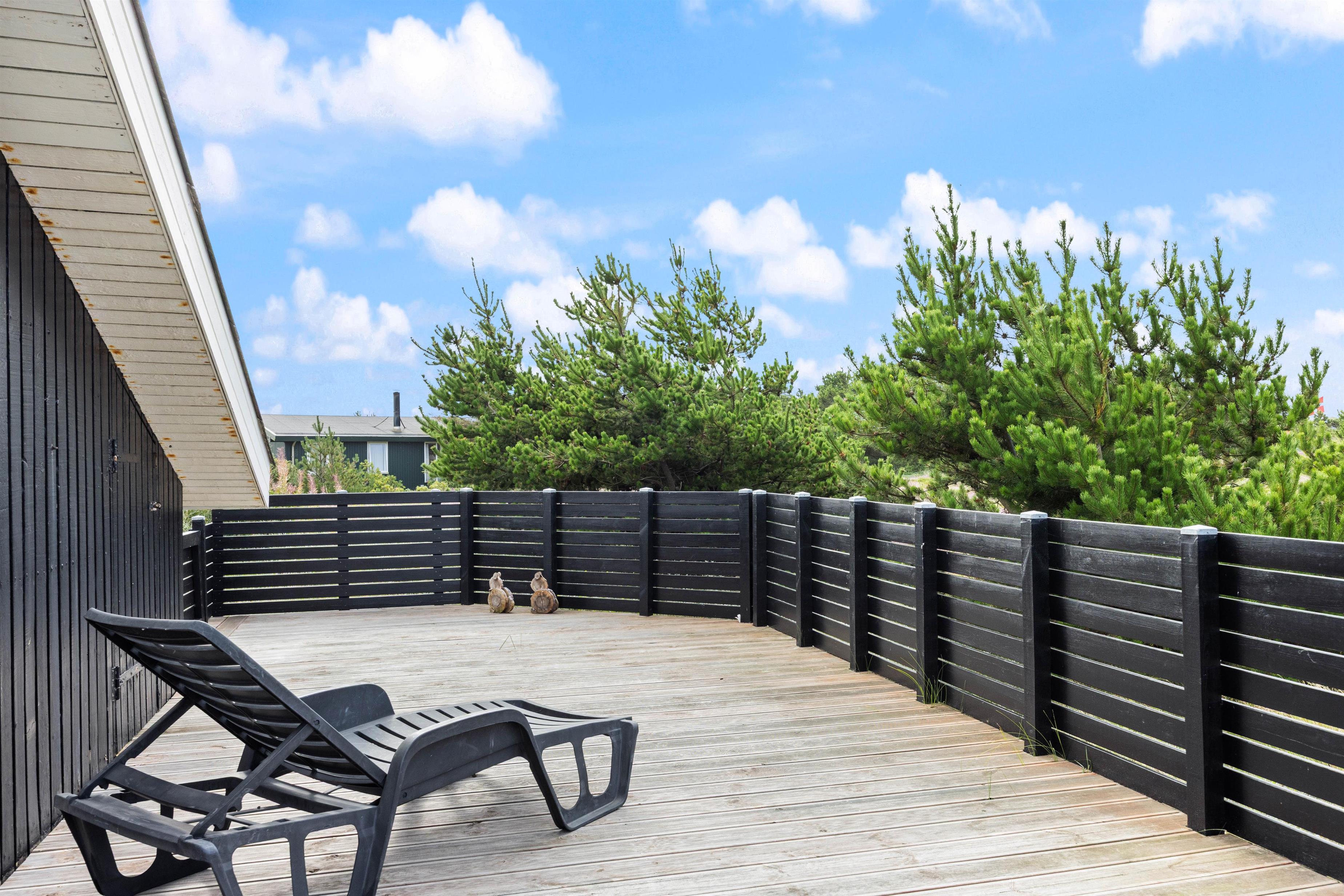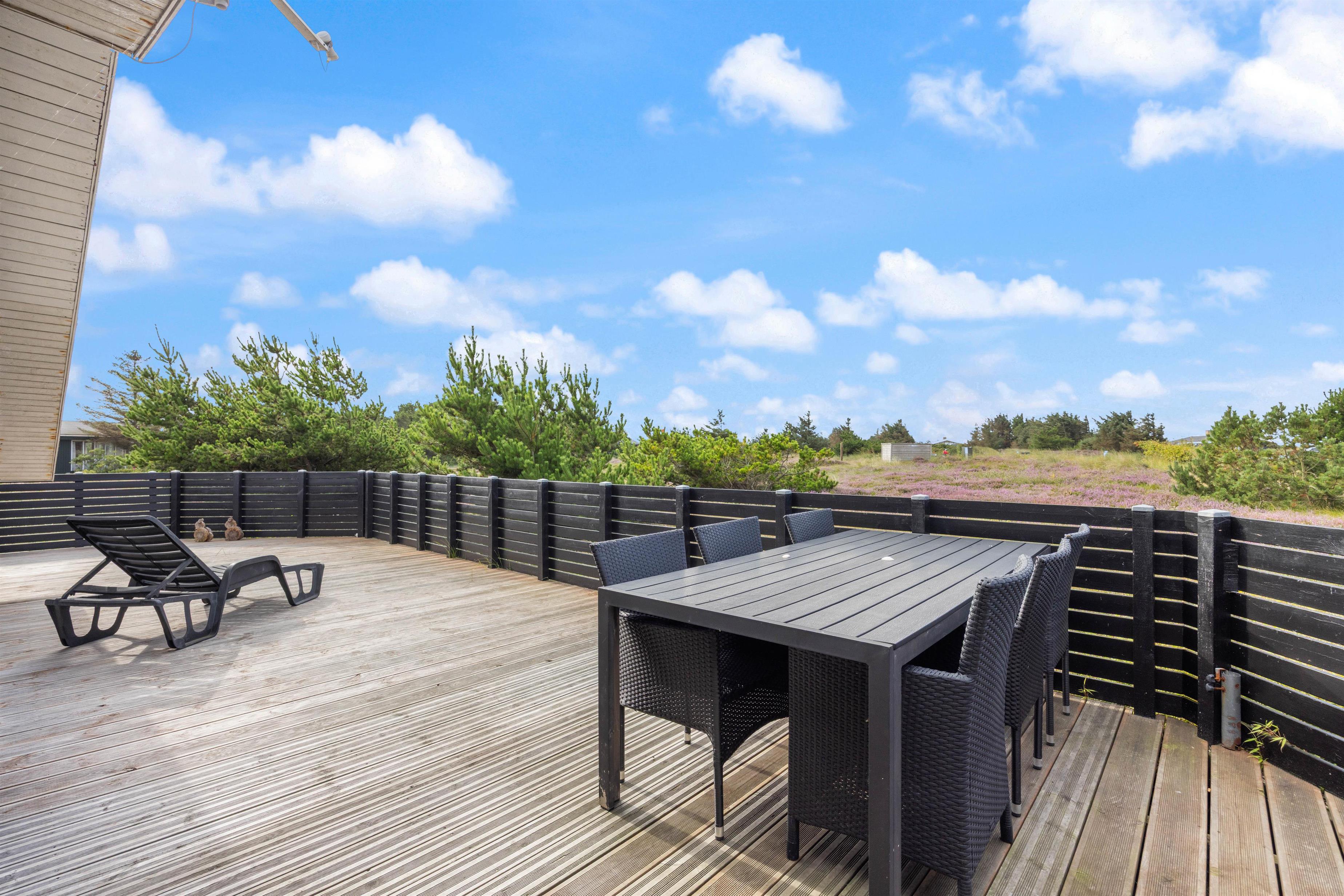 Sommerhusets dejlige lukkede terrasse er over 100 kvadratmeter stort og vender mod syd og øst. Den er derfor særdeles anvendelig allerede fra morgenstunden. Terrassen er delvist overdækket og afskærmet og giver derfor læ for vinden og er ideel til lange grillaftener. Fra terrassen er der adgang til både gynge og sandkasse, som begge er placeret på naturgrunden. Et godt valg, hvis I har små børn eller hund(e) med på ferie.