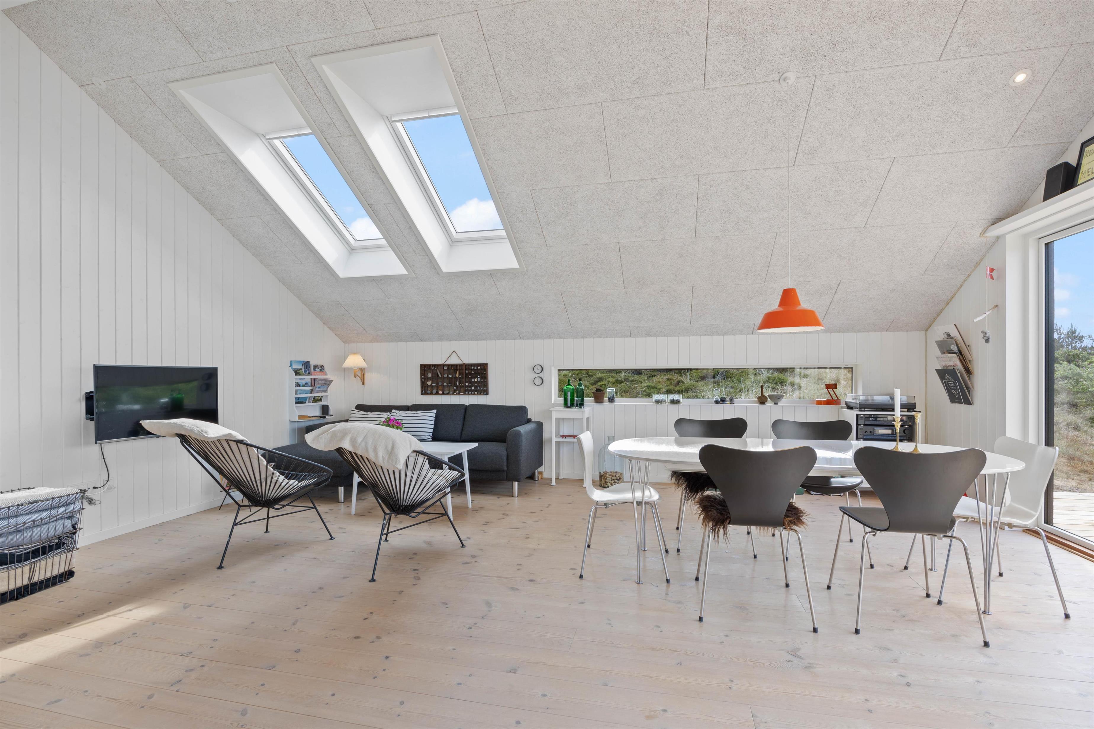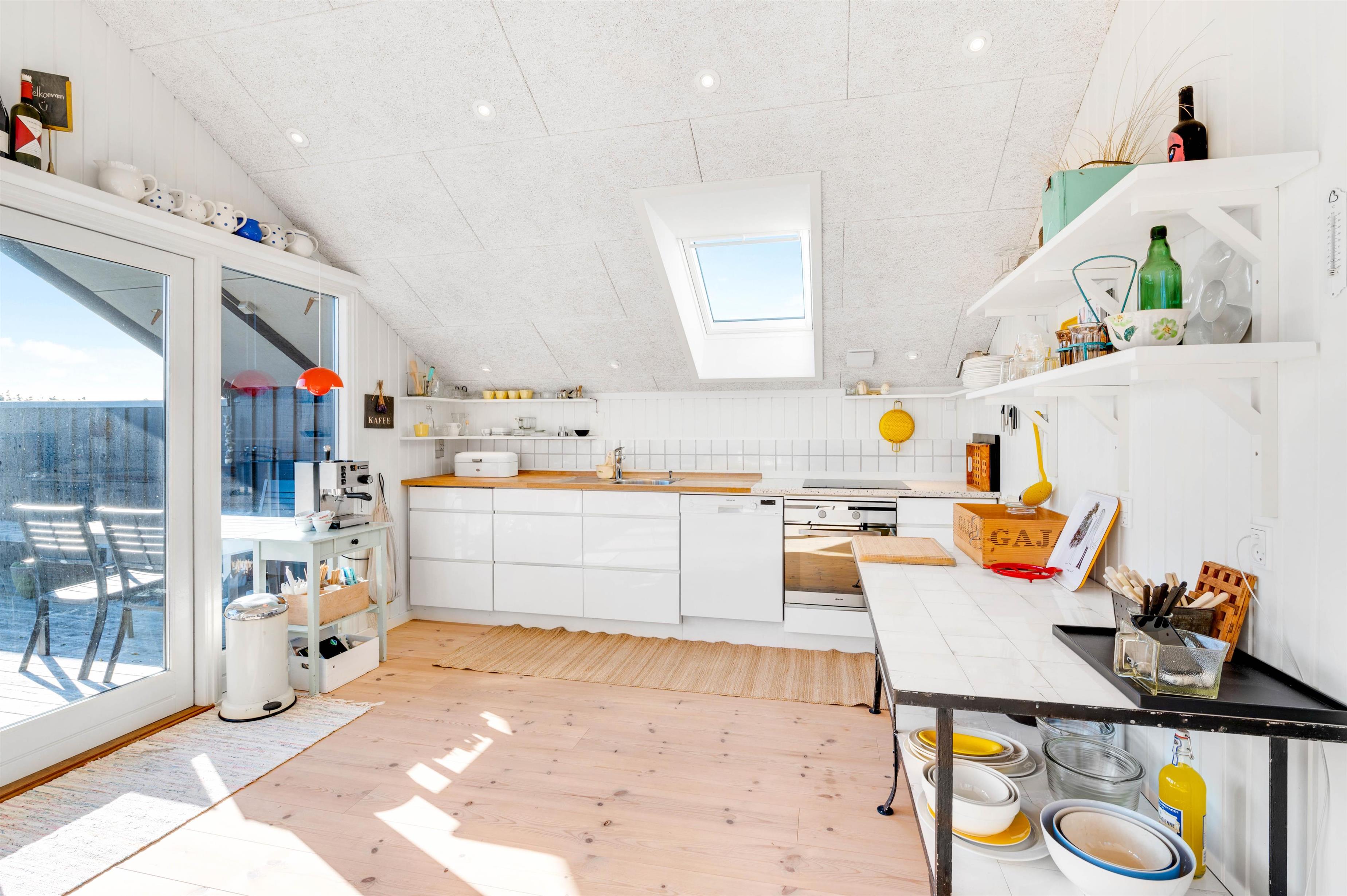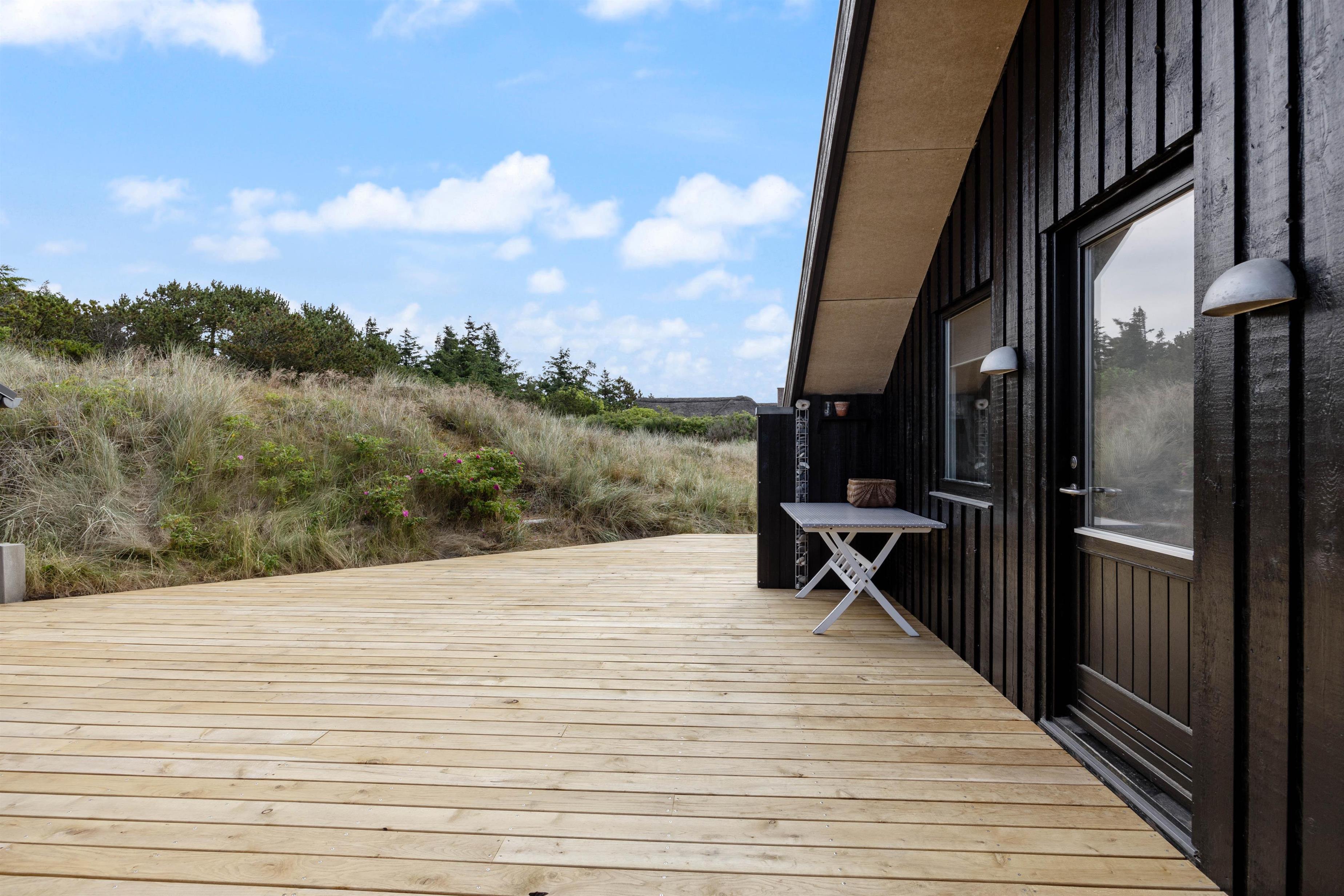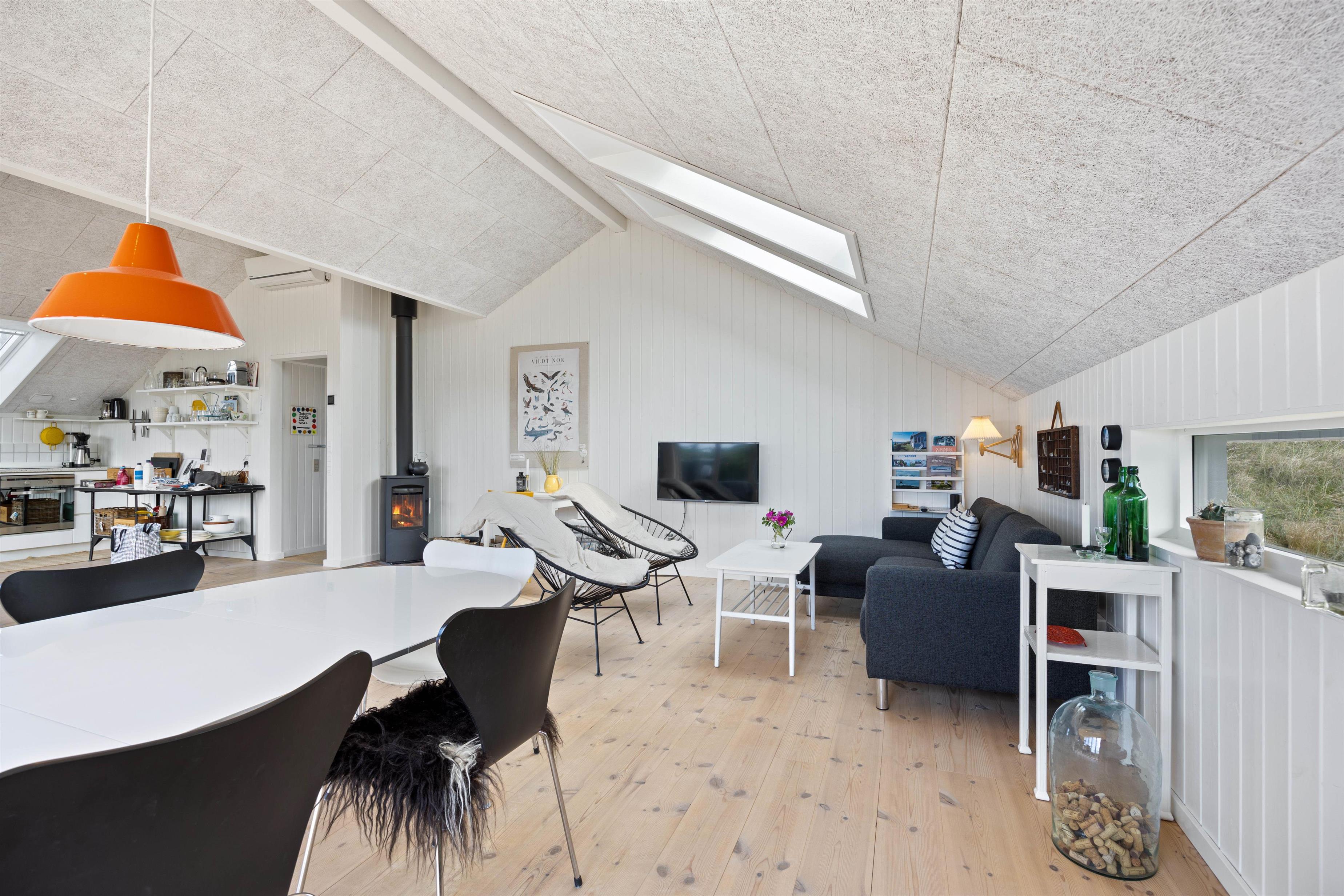 Fra opholdsstuen, som ligger i direkte forbindelse med køkkenet, kigger man lige ud i klitterne gennem sidevinduerne. I køkkenet finder I opvaskemaskine, og der er fladskærms-tv samt gratis fibernet, så I er sikret en hurtig internetforbindelse på ferien. Der er udgang fra stuen via en skydedør ud til den skønne terrasse. Fra sommerhusets nye badeværelse er der direkte adgang til en nedsænket sauna, hvor I kan sidde og slappe af og blive varmet godt igennem efter en begivenhedsrig feriedag.