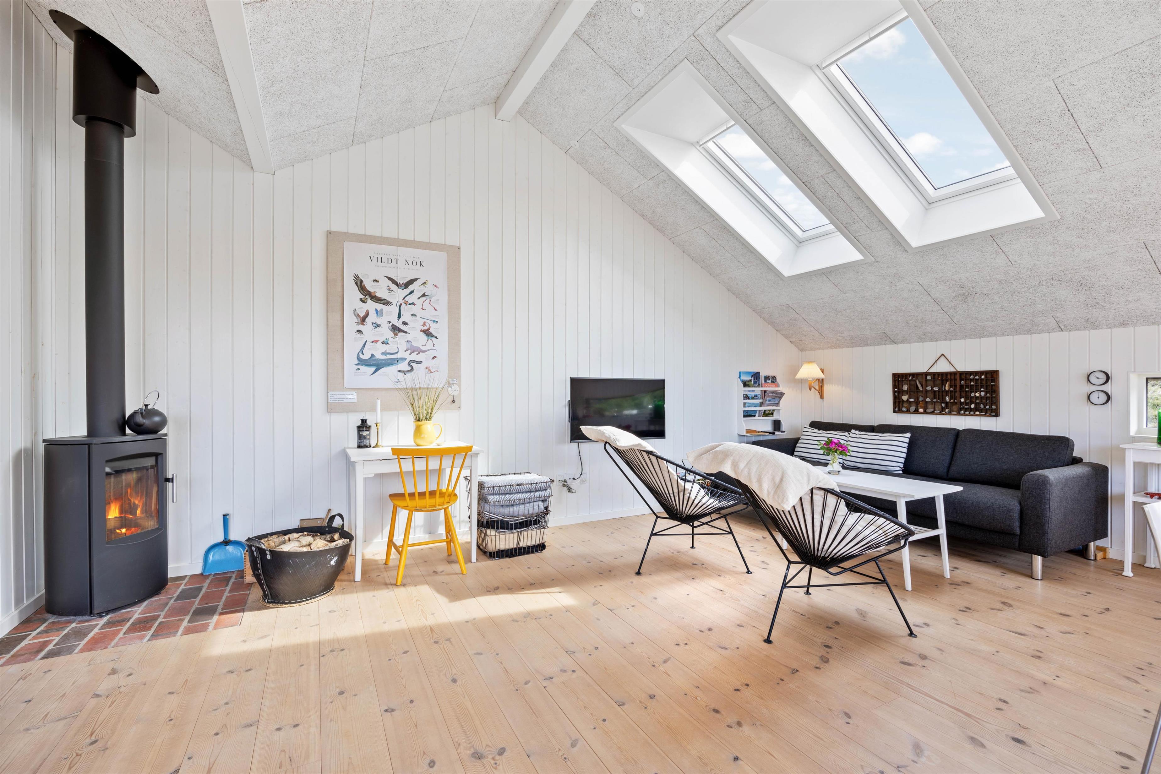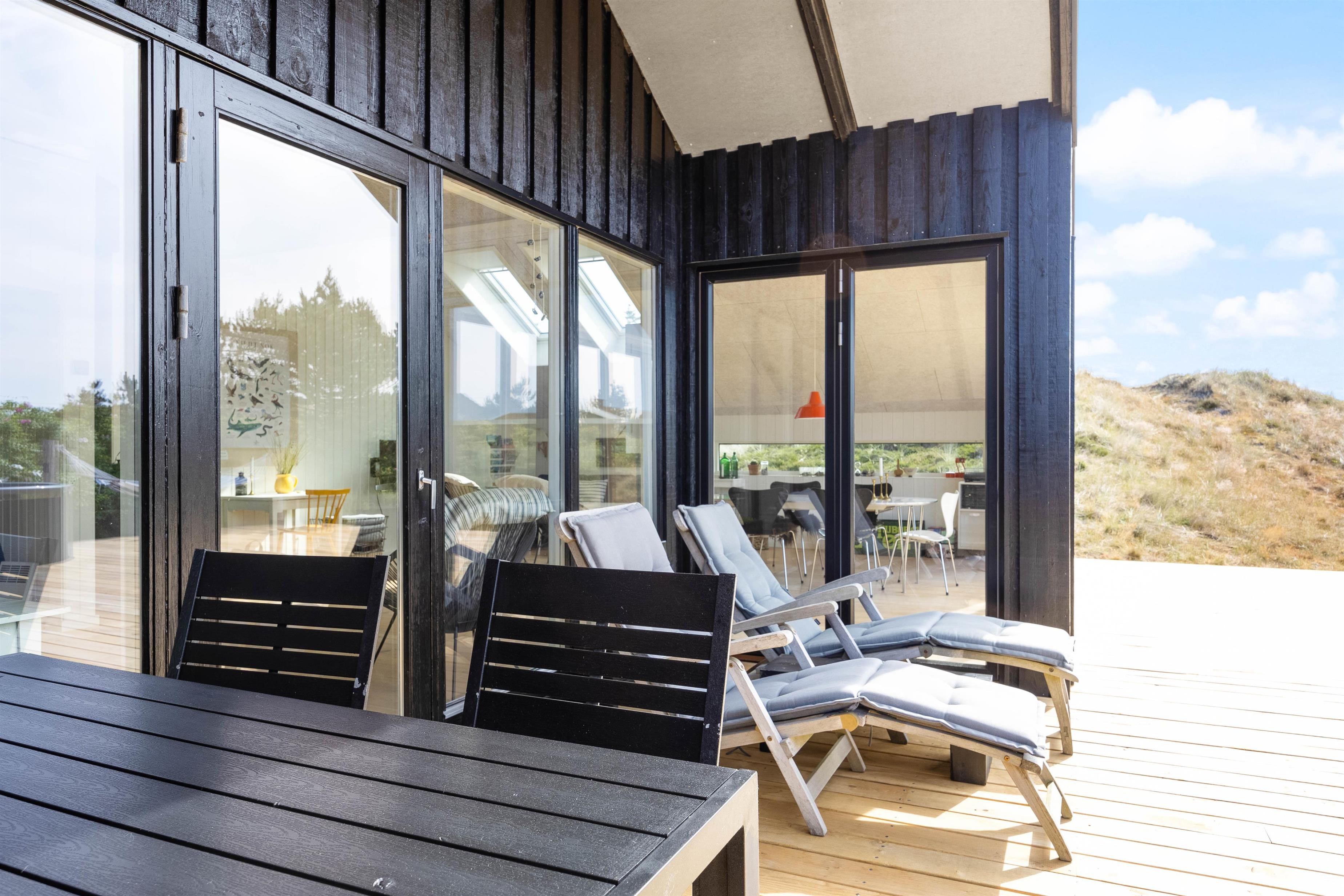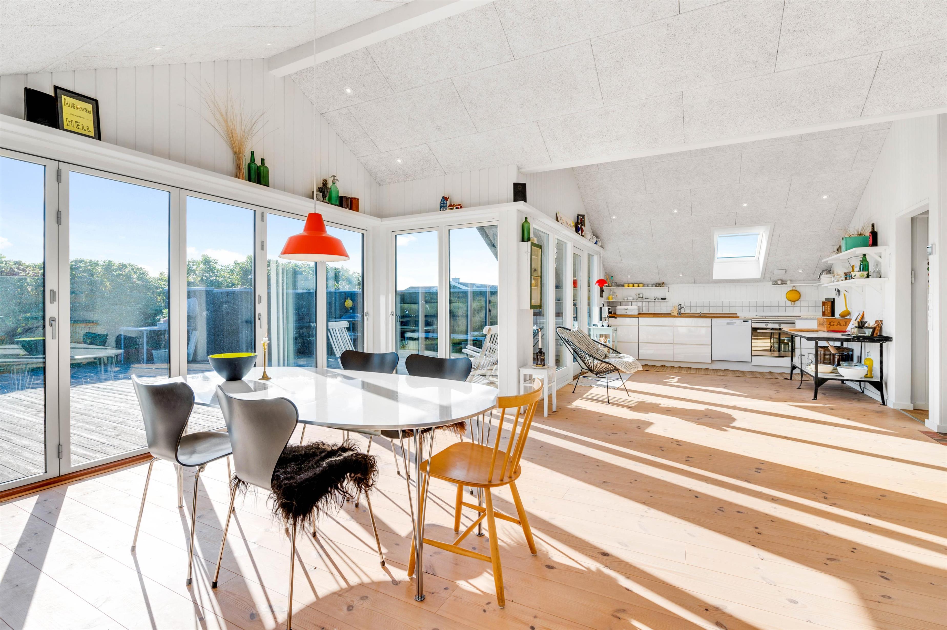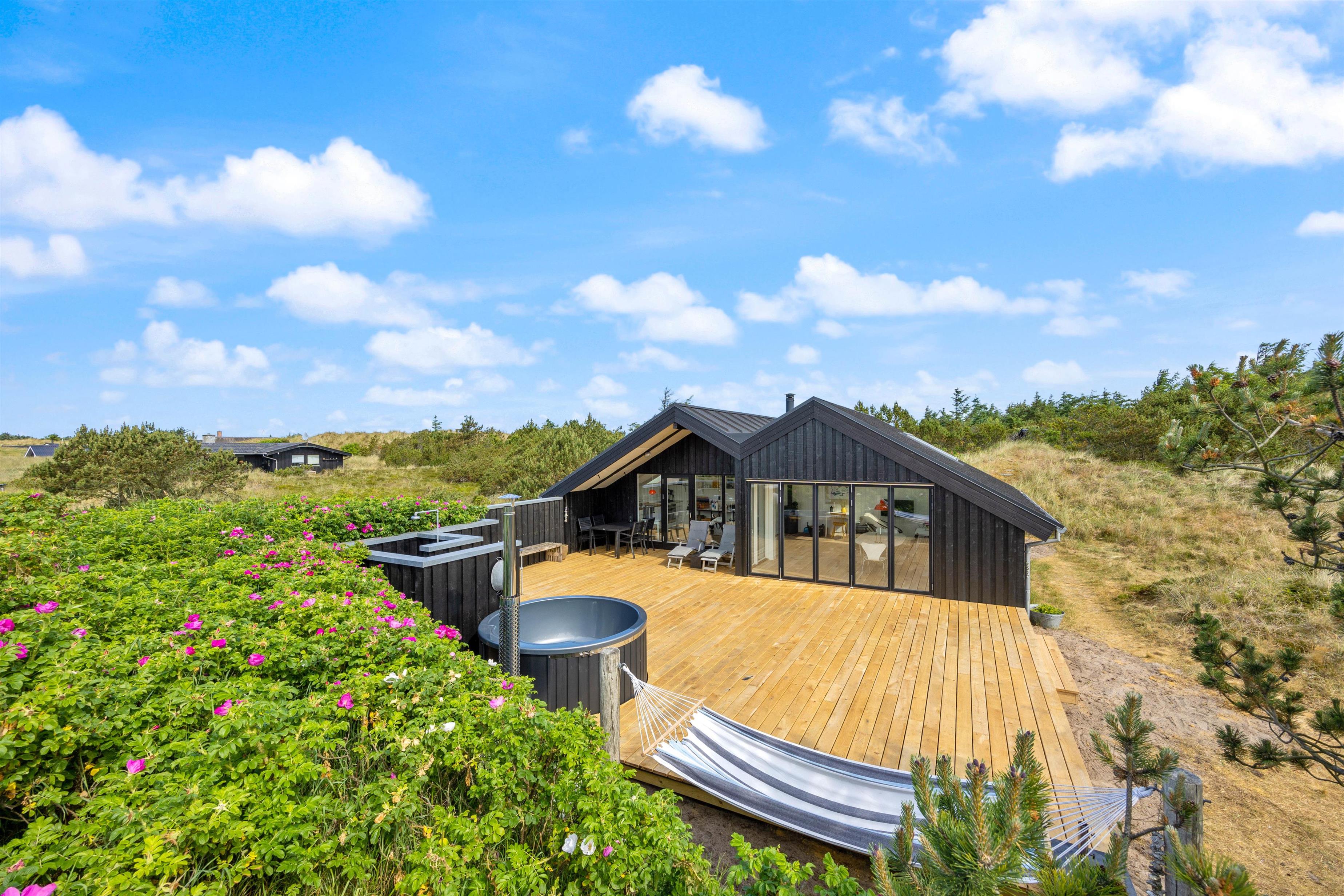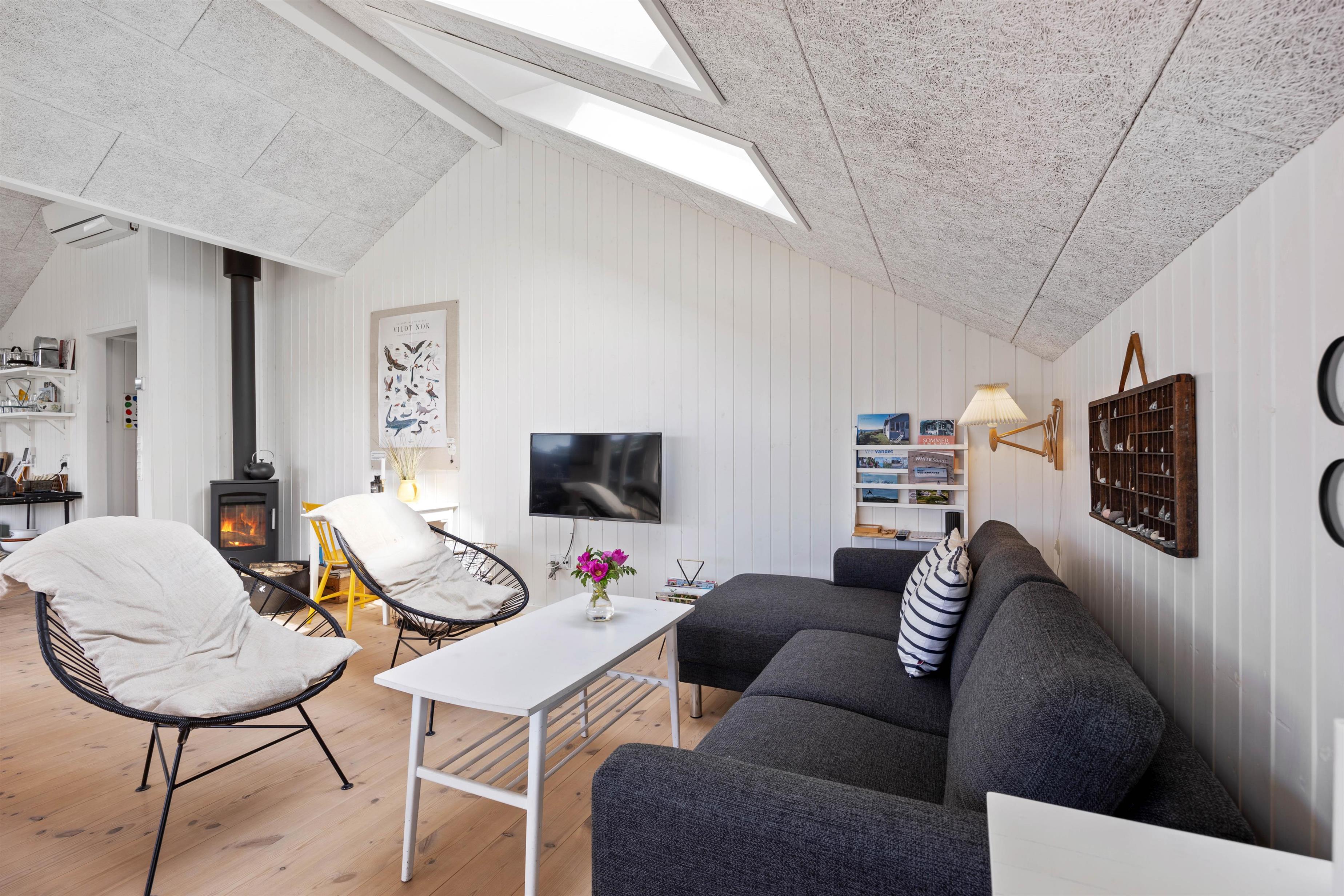 Fra opholdsstuen, som ligger i direkte forbindelse med køkkenet, kigger man lige ud i klitterne gennem sidevinduerne. I køkkenet finder I opvaskemaskine, og der er fladskærms-tv samt gratis fibernet, så I er sikret en hurtig internetforbindelse på ferien. Der er udgang fra stuen via en skydedør ud til den skønne terrasse. Fra sommerhusets nye badeværelse er der direkte adgang til en nedsænket sauna, hvor I kan sidde og slappe af og blive varmet godt igennem efter en begivenhedsrig feriedag.