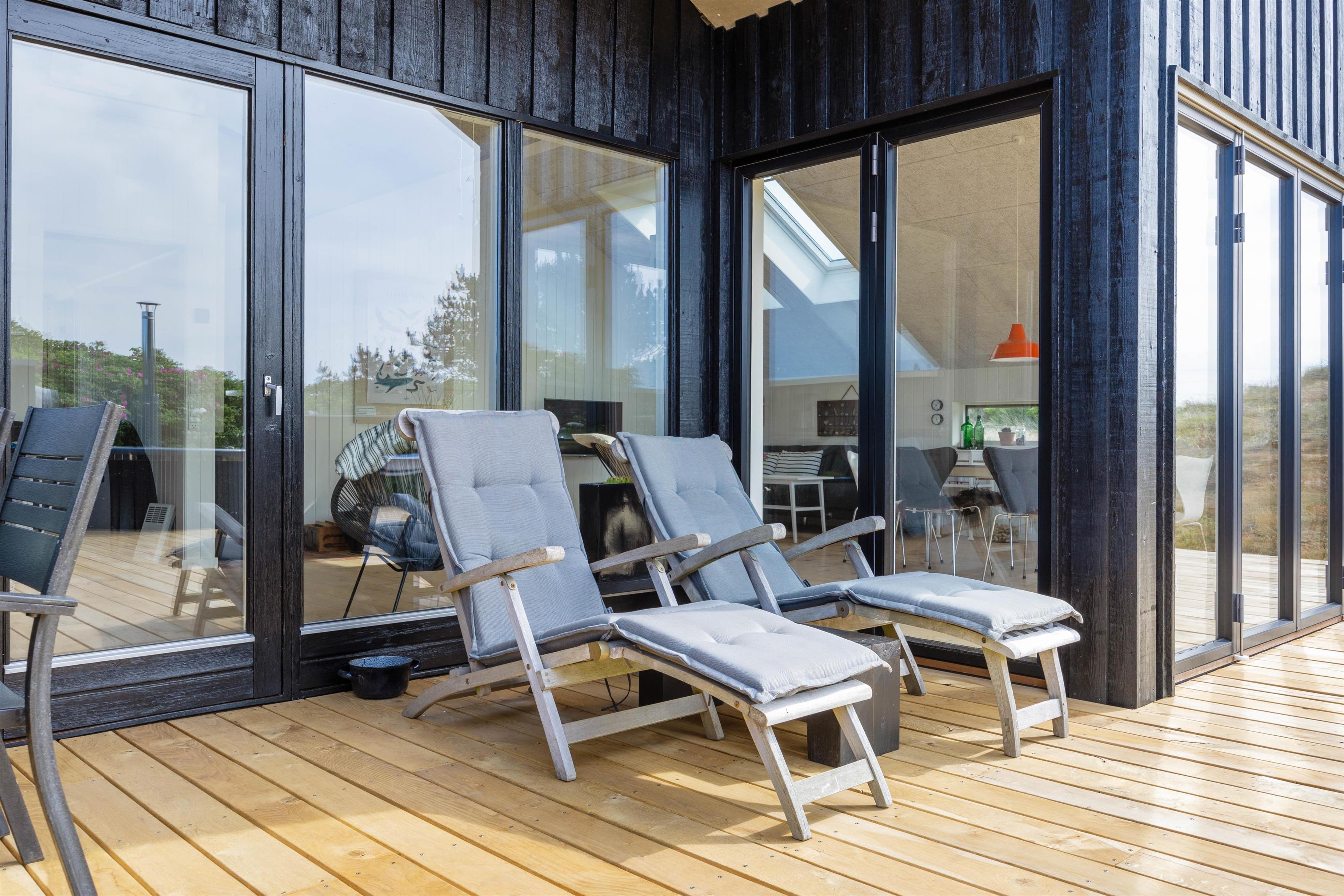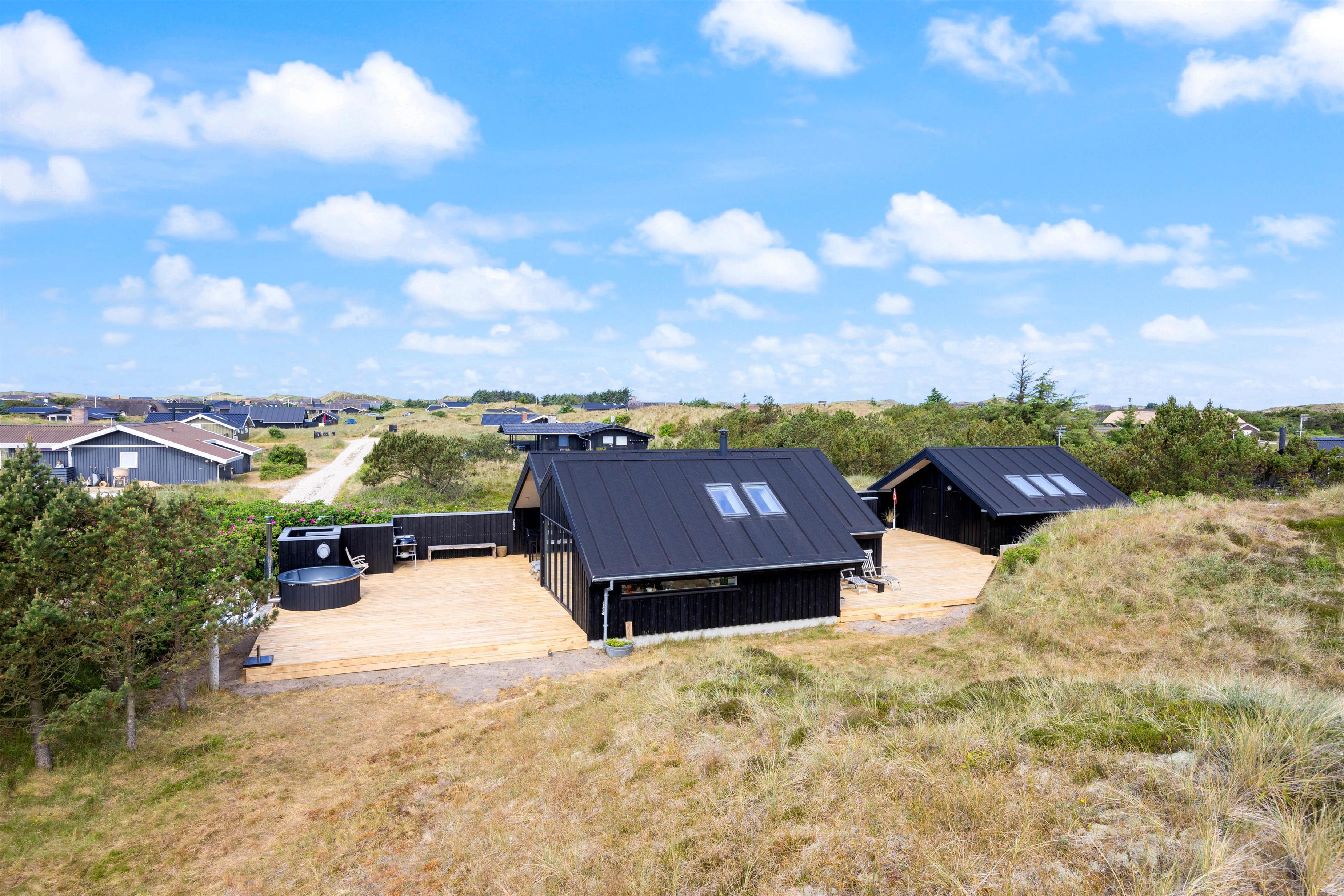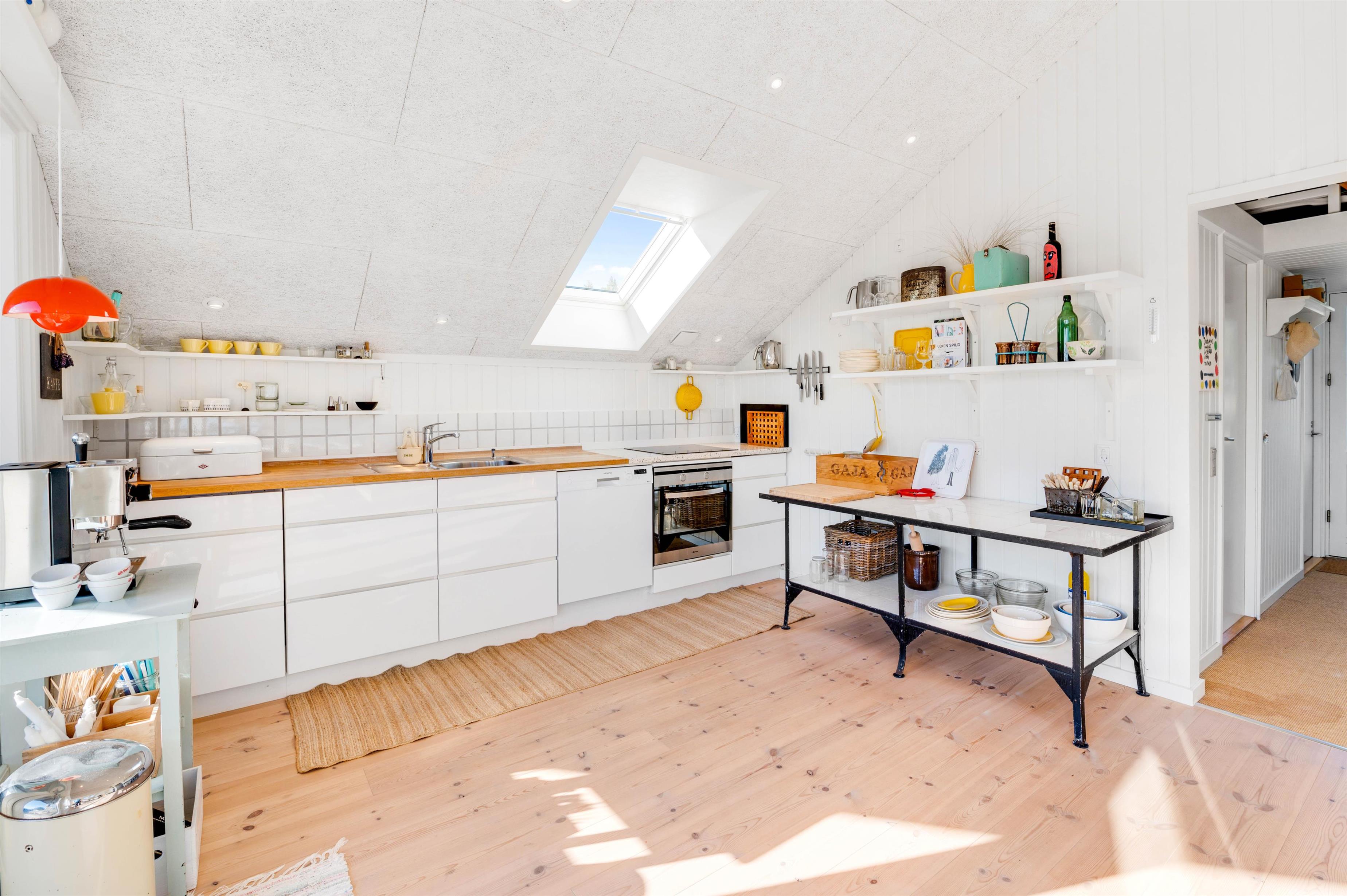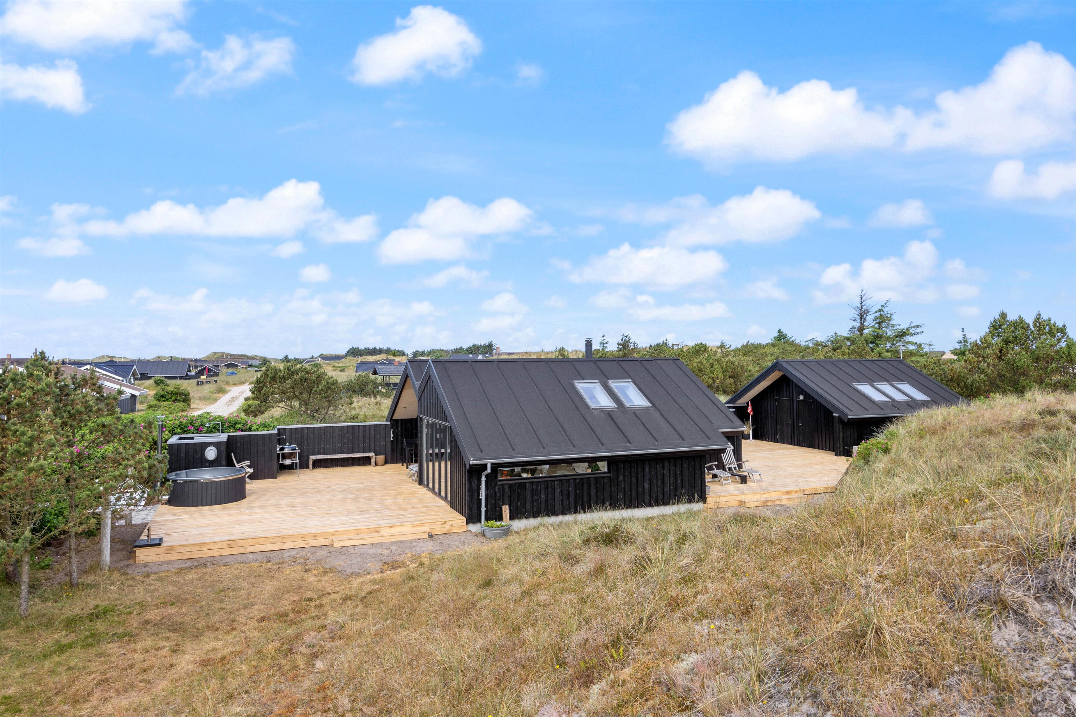 Fra opholdsstuen, som ligger i direkte forbindelse med køkkenet, kigger man lige ud i klitterne gennem sidevinduerne. I køkkenet finder I opvaskemaskine, og der er fladskærms-tv samt gratis fibernet, så I er sikret en hurtig internetforbindelse på ferien. Der er udgang fra stuen via en skydedør ud til den skønne terrasse. Fra sommerhusets nye badeværelse er der direkte adgang til en nedsænket sauna, hvor I kan sidde og slappe af og blive varmet godt igennem efter en begivenhedsrig feriedag.